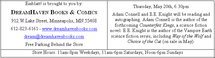 - Thurs, May 20, 6:30PM. Adam Connell & E.E. Knight read & autograph at Dreamhaven. FFI: dream@dreamhavenbooks.com