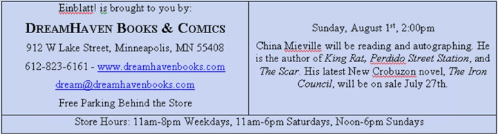 - Sun, Aug 1, 2:00PM. China Mieville reads & autographs. Author of King Rat, Perdido Street Station, The Scar, and the New Crobuzon novel, The Iron Council, (on sale July 27th). DreamHaven Books, 912 W Lake St, Mpls. FFI: 612-823-6161