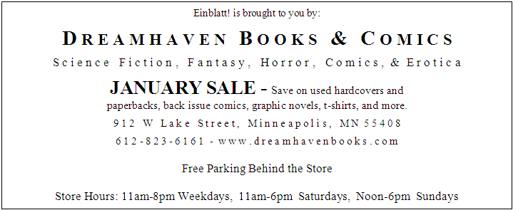 Einblatt is a monthly publication of the Minnesota Science Fiction Society, devoted to news of the local SF community. E-mail same to einblatt@mnstf.org, or send to Scott Raun, 3928 11th Ave. S., Minneapolis, MN 55407; or call him at 612-822-0451. Email submissions most preferred, no phone calls after 10pm. // Next Einblatt! Deadline: 11:59PM January 27th, 2005 sharp!