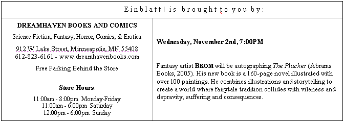 Einblatt is a monthly publication of the Minnesota Science Fiction Society, devoted to news of the local SF community. E-mail same to einblatt@mnstf.org, or send to Scott Raun, 3928 11th Ave. S., Minneapolis, MN 55407; or call him at 612-822-0451. Email submissions most preferred, no phone calls after 10pm. // Next Einblatt! Deadline: 11:59PM November 24th, 2005 sharp!