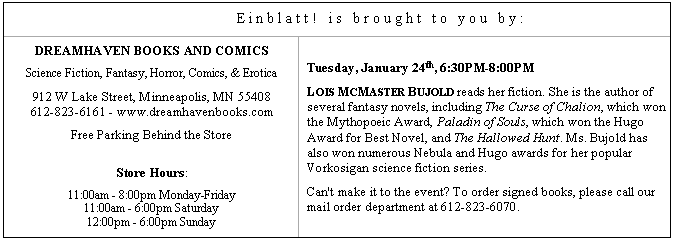 - Tues, Jan 24, 6:30PM. Speculations Reading Series sponsors Lois McMaster Bujold. Dreamhaven, 912 W Lake St, Mpls. FFI: 612-721-5959, eheideman@dhzone.com