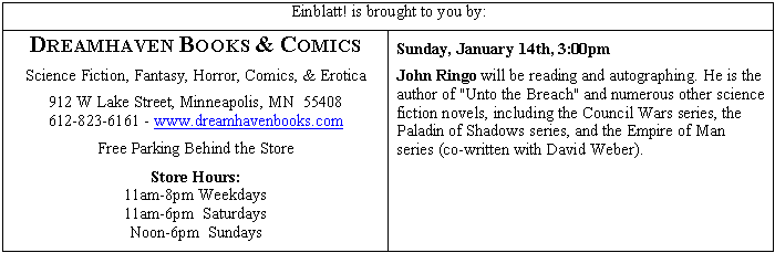 - Sun, Jan 14, 3PM. John Ringo reads & signs at Dreamhaven. FFI: the ad.