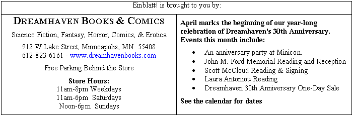 - Sat, Apr 28, 11AM-6PM. DreamHaven 30th Anniversary One-Day Sale: 30% Off Everything in the Store (in-stock items only, discount does not apply to the purchase of gift certificates). Dreamhaven Books, 912 W Lake St, Mpls. FFI: 612-823-6161, dream@dreamhavenbooks.com