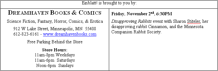 - Fri, Nov 2, 6:30-8:00PM. Disapproving Rabbits event with Sharon Stiteler and the Minnesota House Rabbit Society. Dreamhaven Books, 912 W Lake St, Mpls. FFI: 612-823-6161