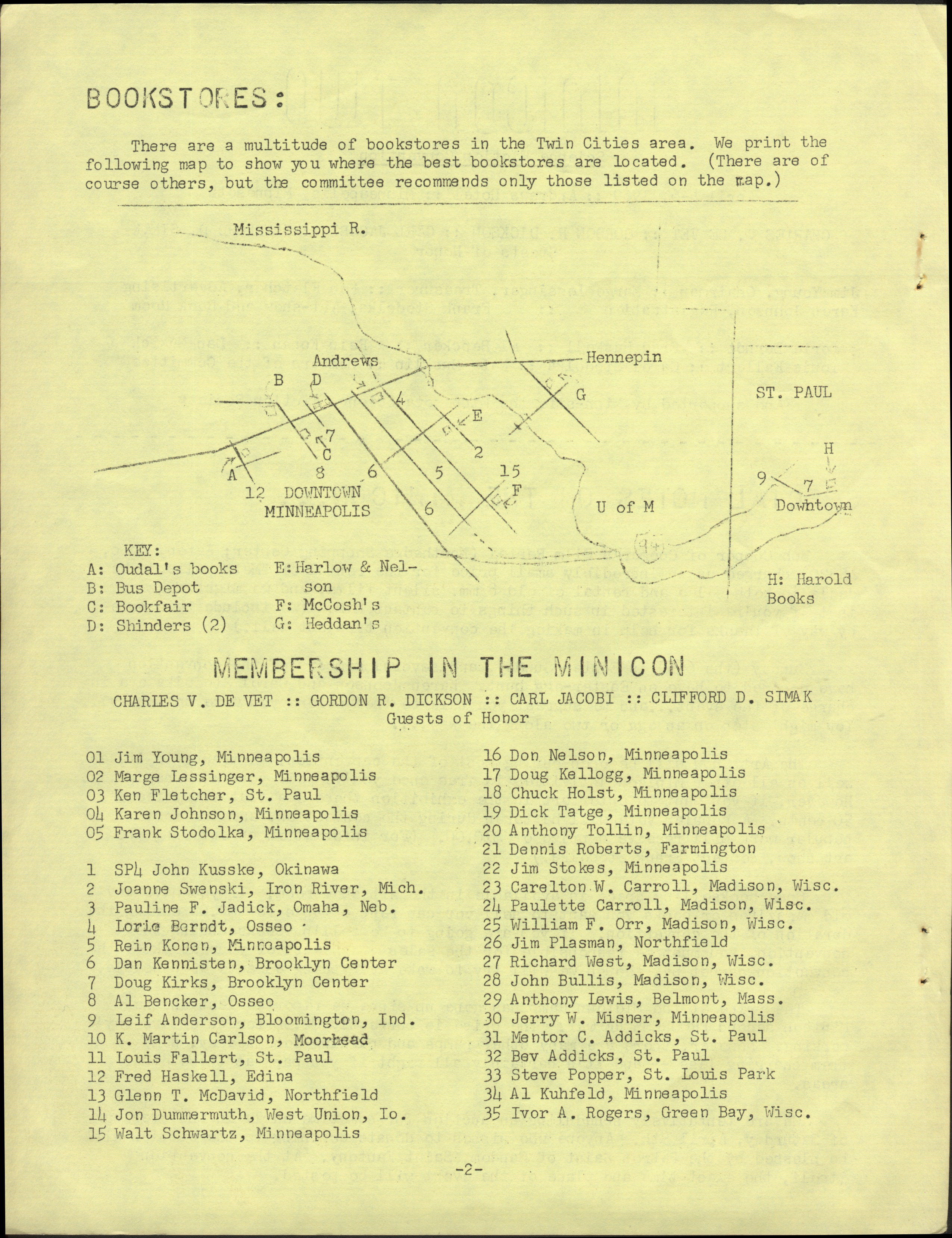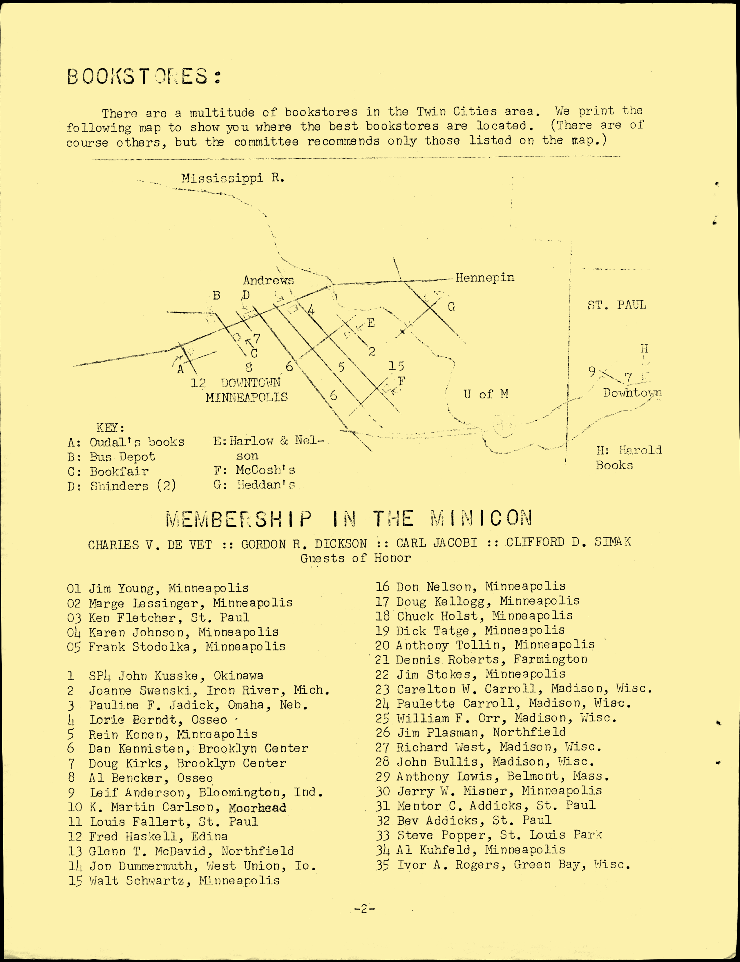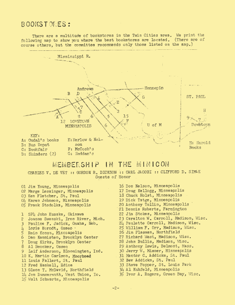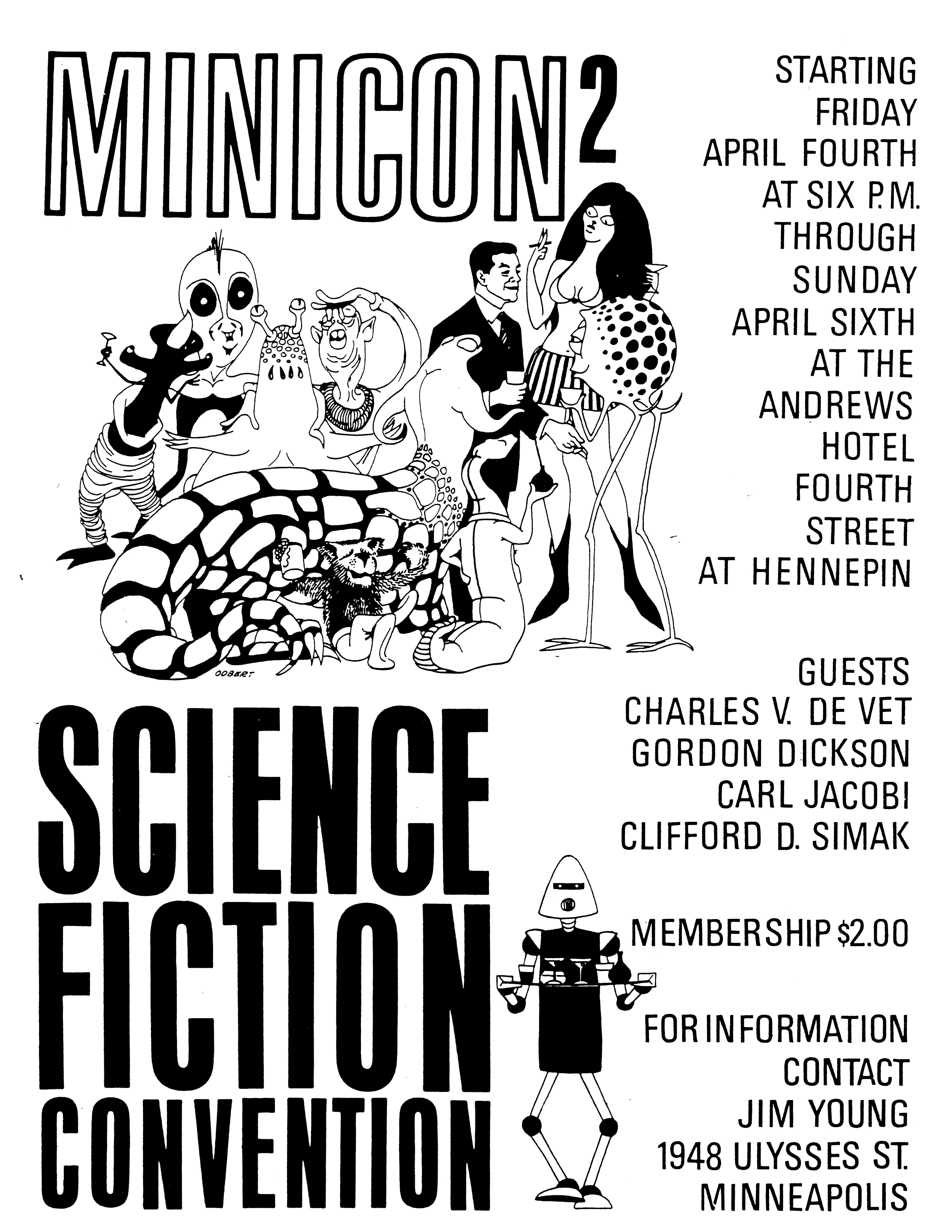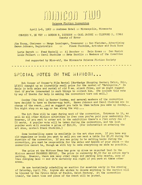Minicon 2 was held 4–6 April 1969 at the Andrews Hotel (Minneapolis). It was chaired by Jim Young and had a membership of 102, with 40 pre-registered. Gordon R. Dickson, Charles De Vet, Clifford Simak were the guests of honor. Carl Jacobi was invited and is listed in the program book, but didn't make it.