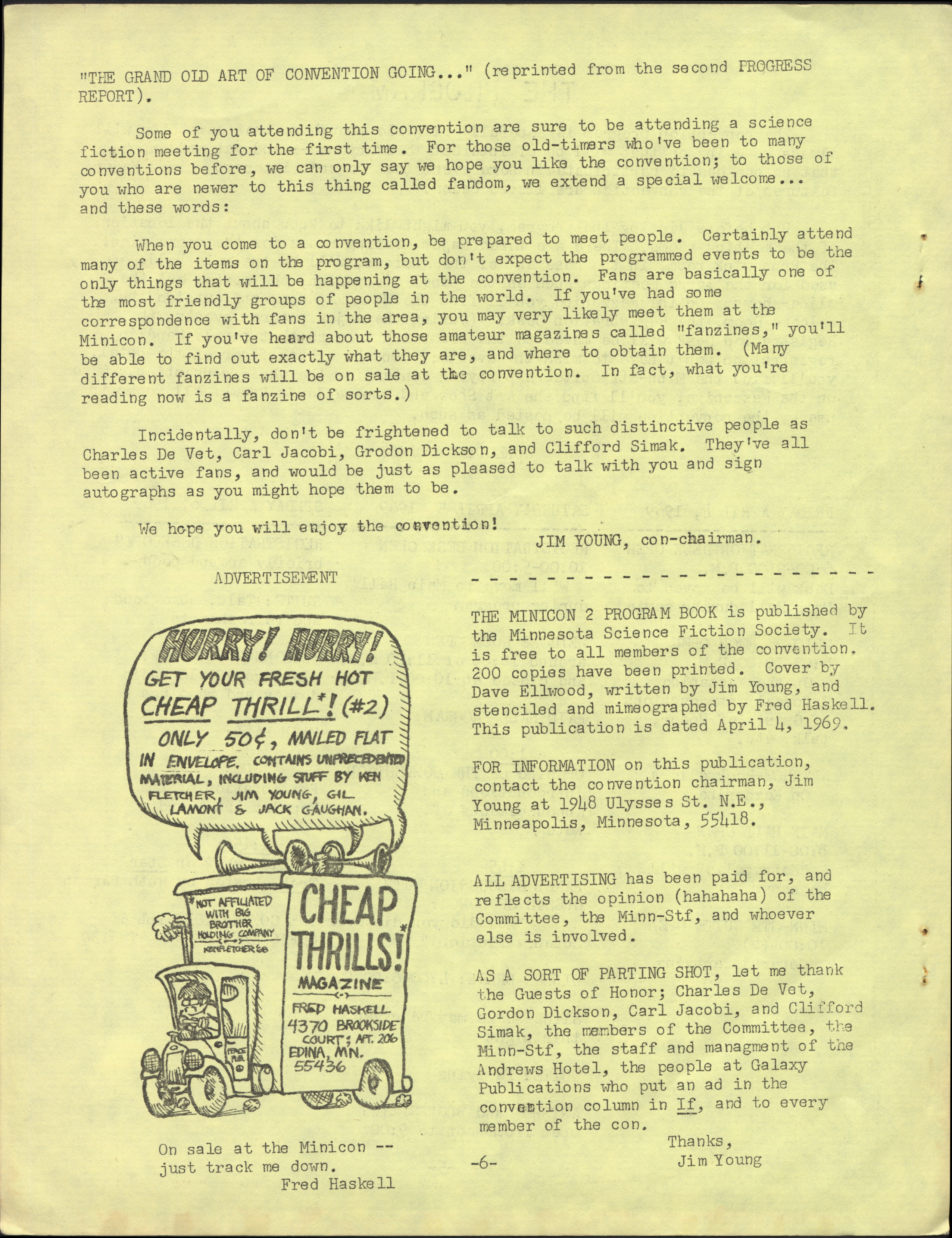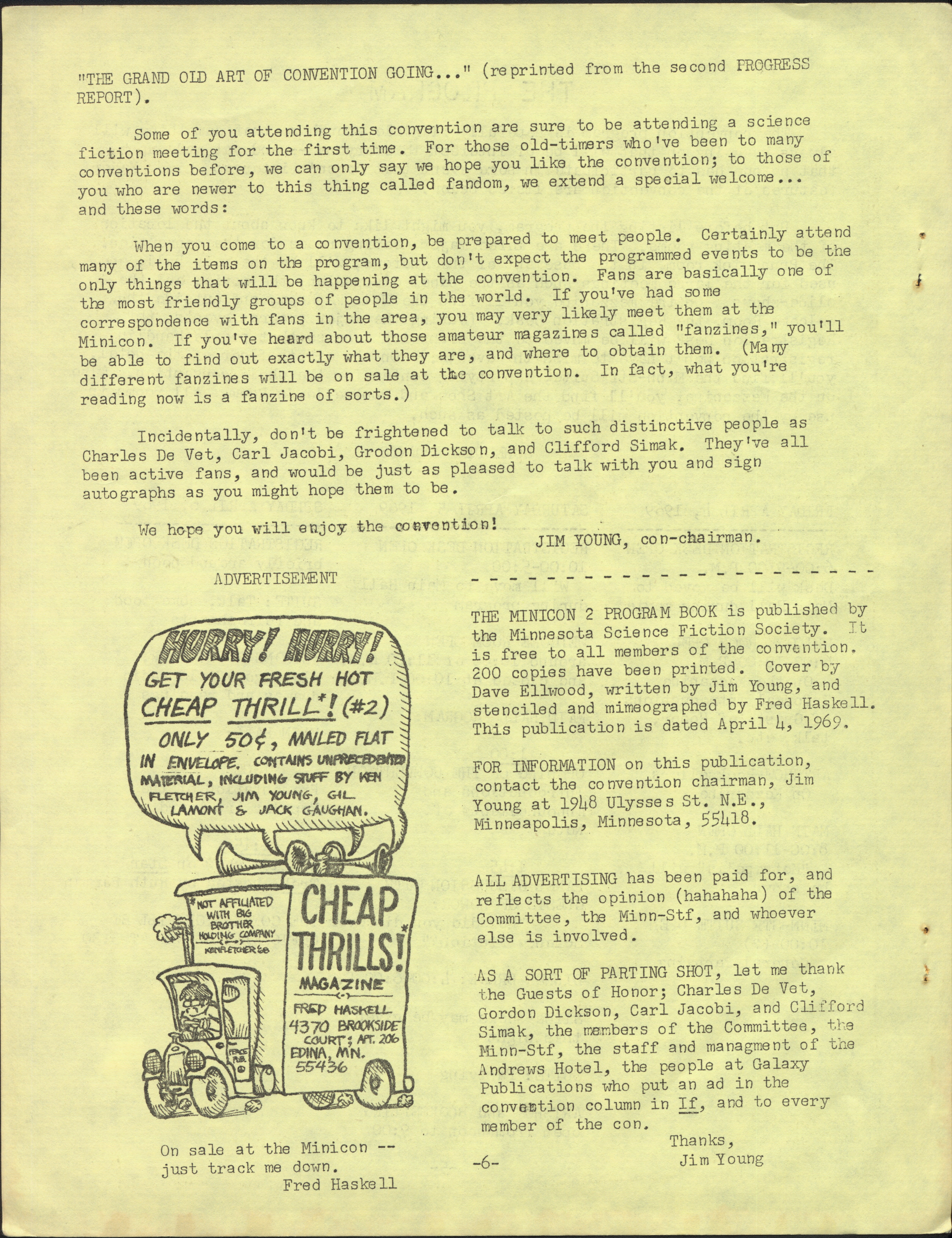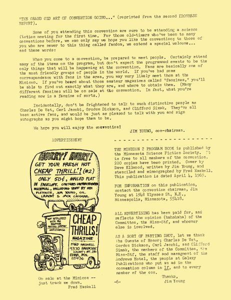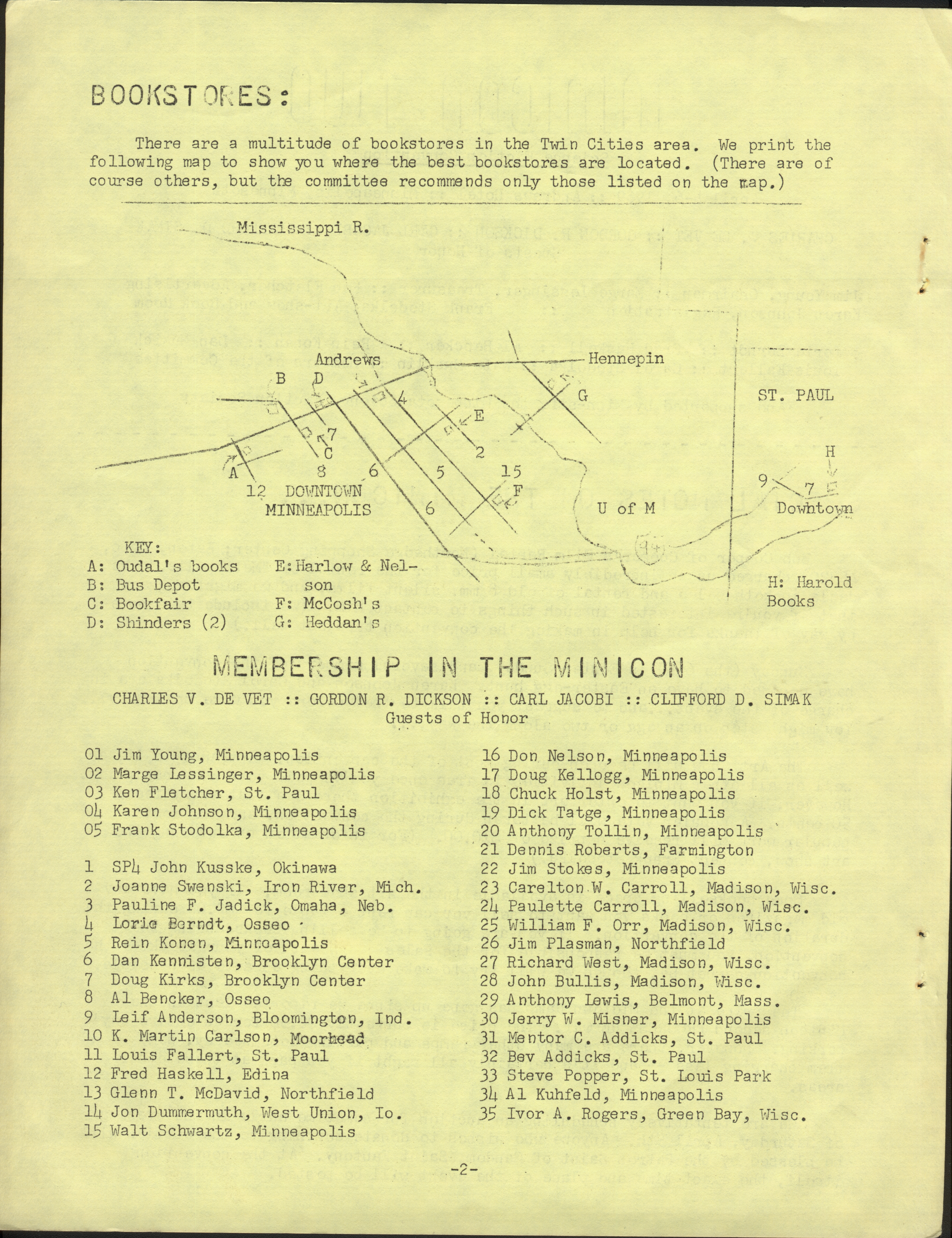 Minicon 2 was held 4–6 April 1969 at the Andrews Hotel (Minneapolis). It was chaired by Jim Young and had a membership of 102, with 40 pre-registered. Gordon R. Dickson, Charles De Vet, Clifford Simak were the guests of honor. Carl Jacobi was invited and is listed in the program book, but didn't make it.