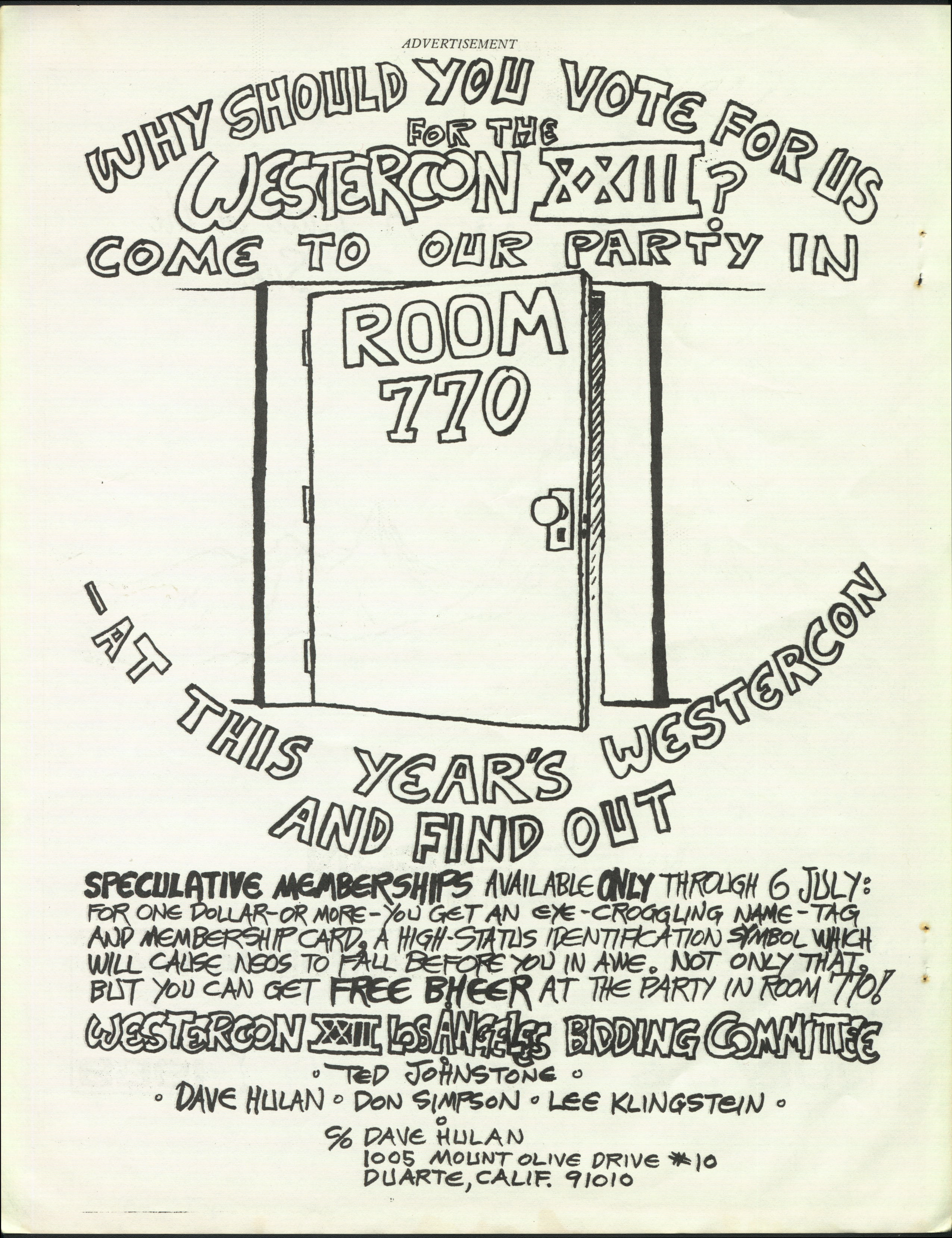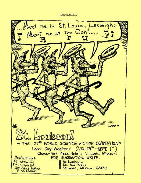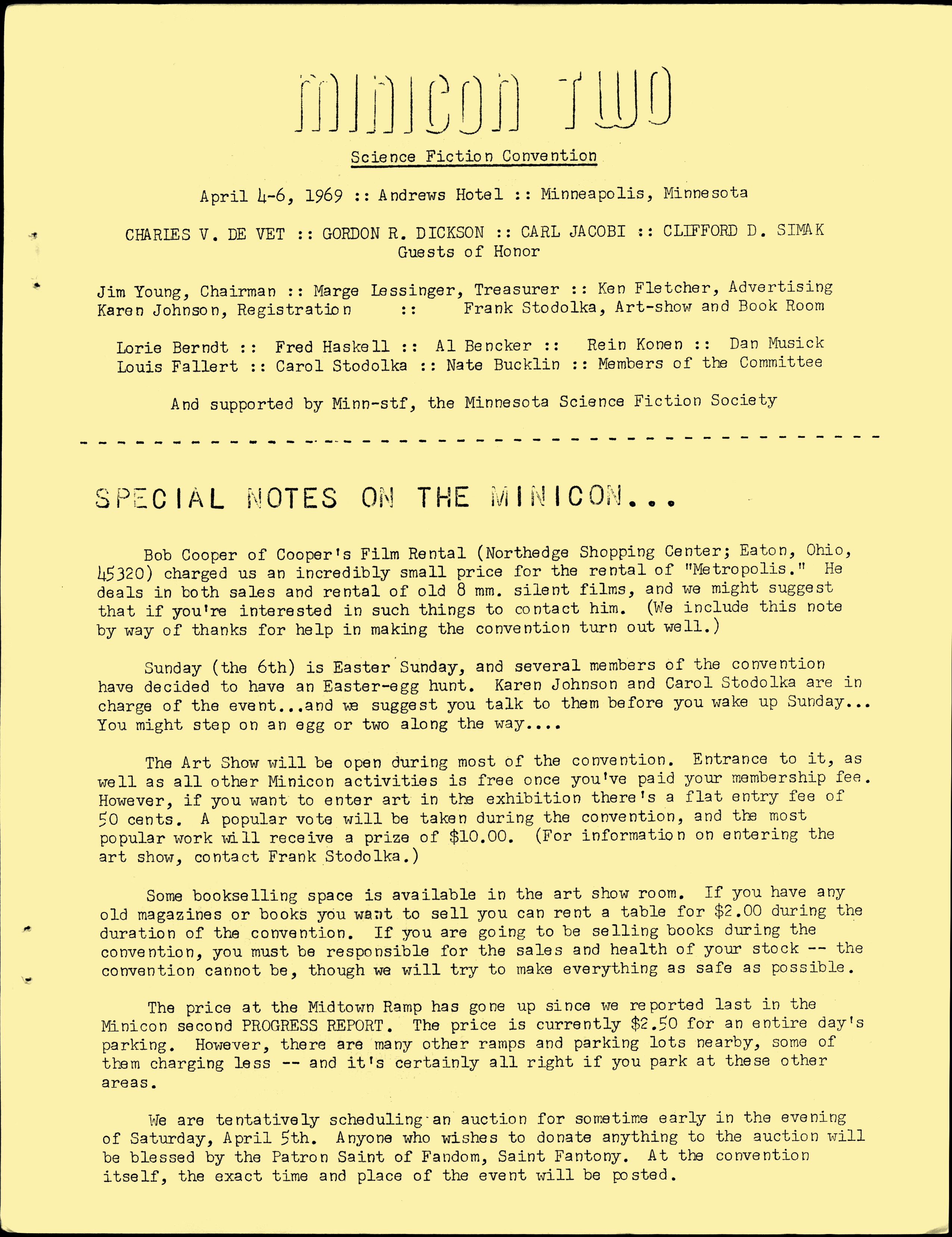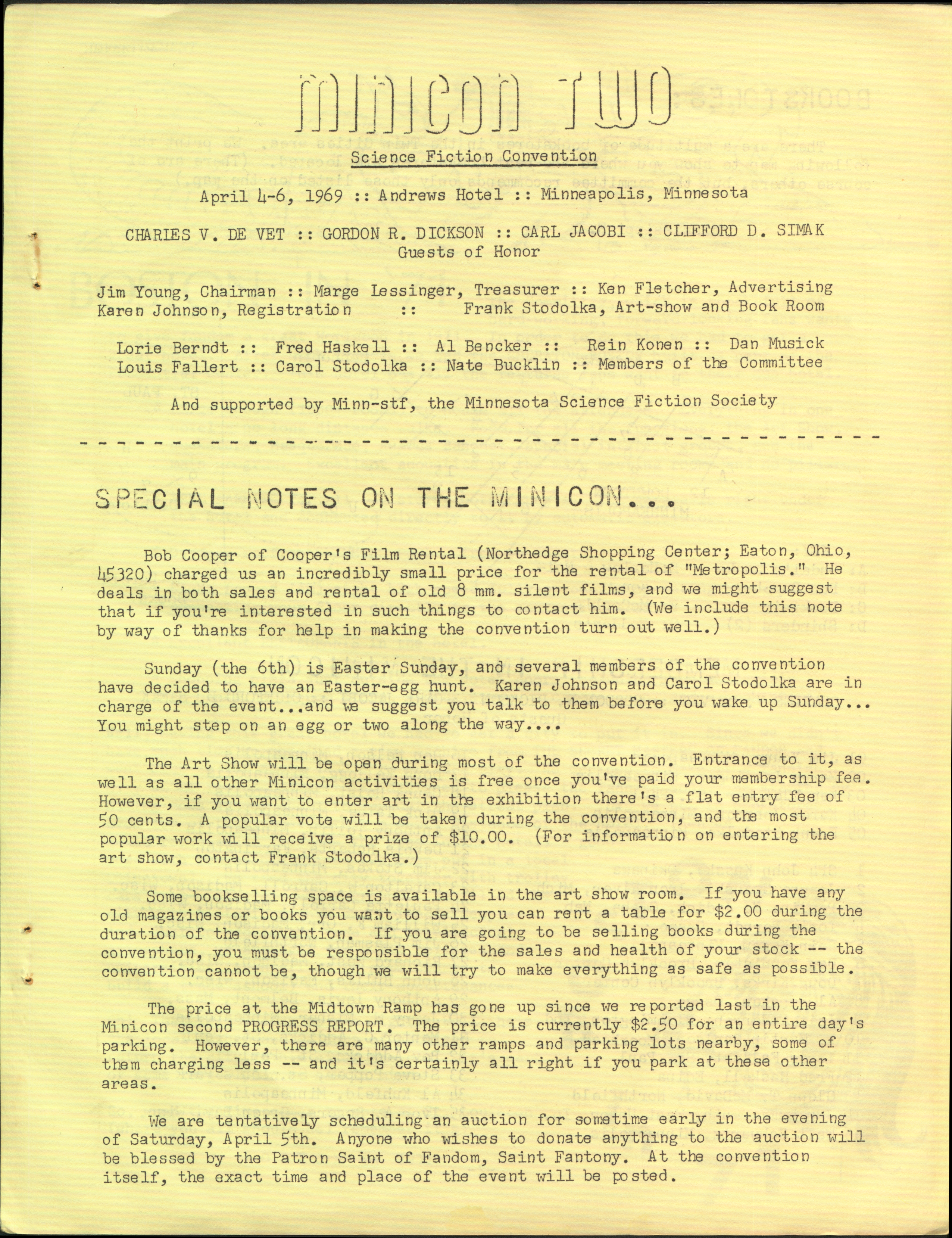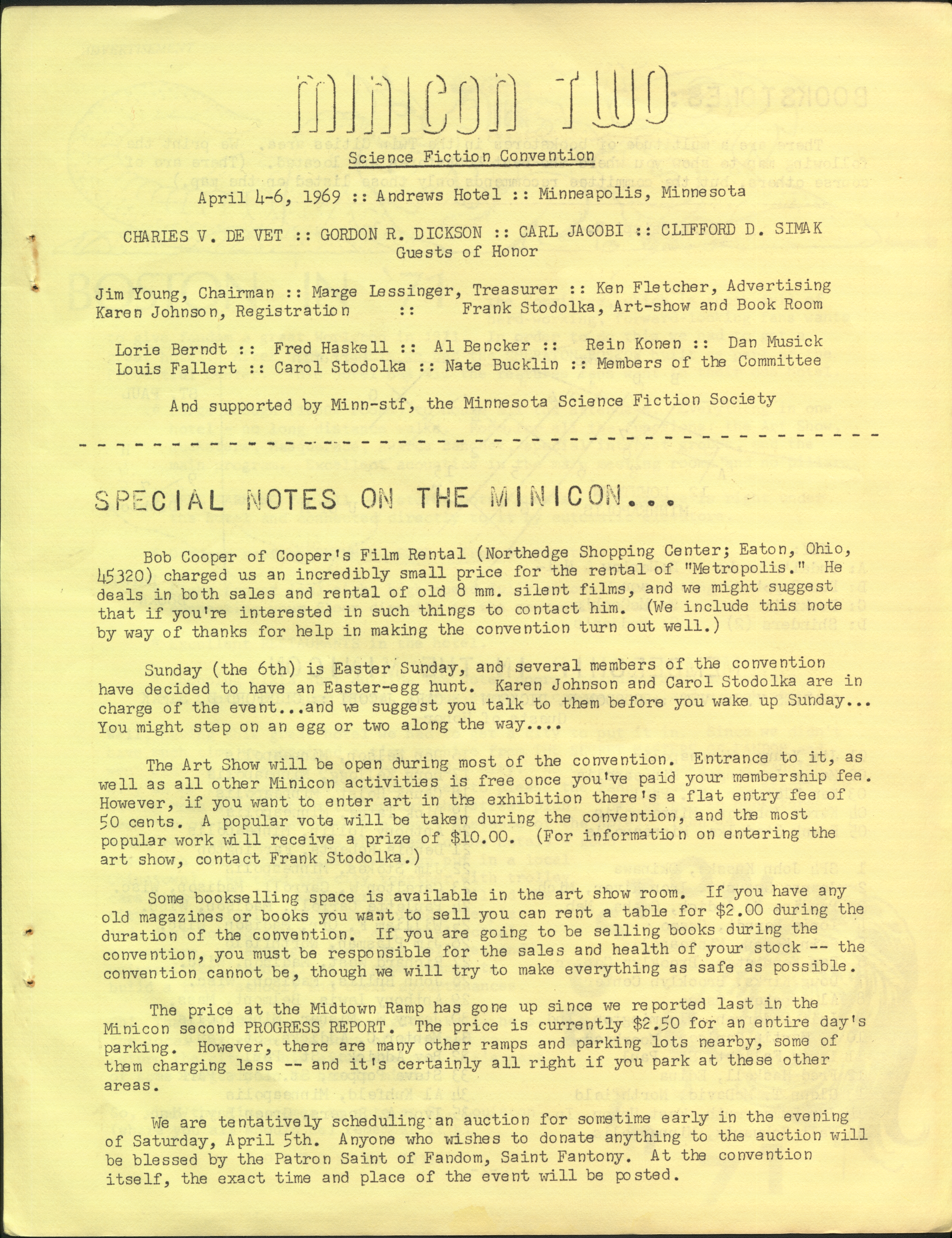 Marge Lessigner, Treasurer Ken Fletcher, Advertising Karen Johnson, Registration Frank Stodolka, Art-show and Book Room Lorie Berndt, Fred Haskell, Al Bencker, Rein Konen, Dan Musick Louis Fallert, Carol Stodolka, Nate Bucklin, Members of the Committee