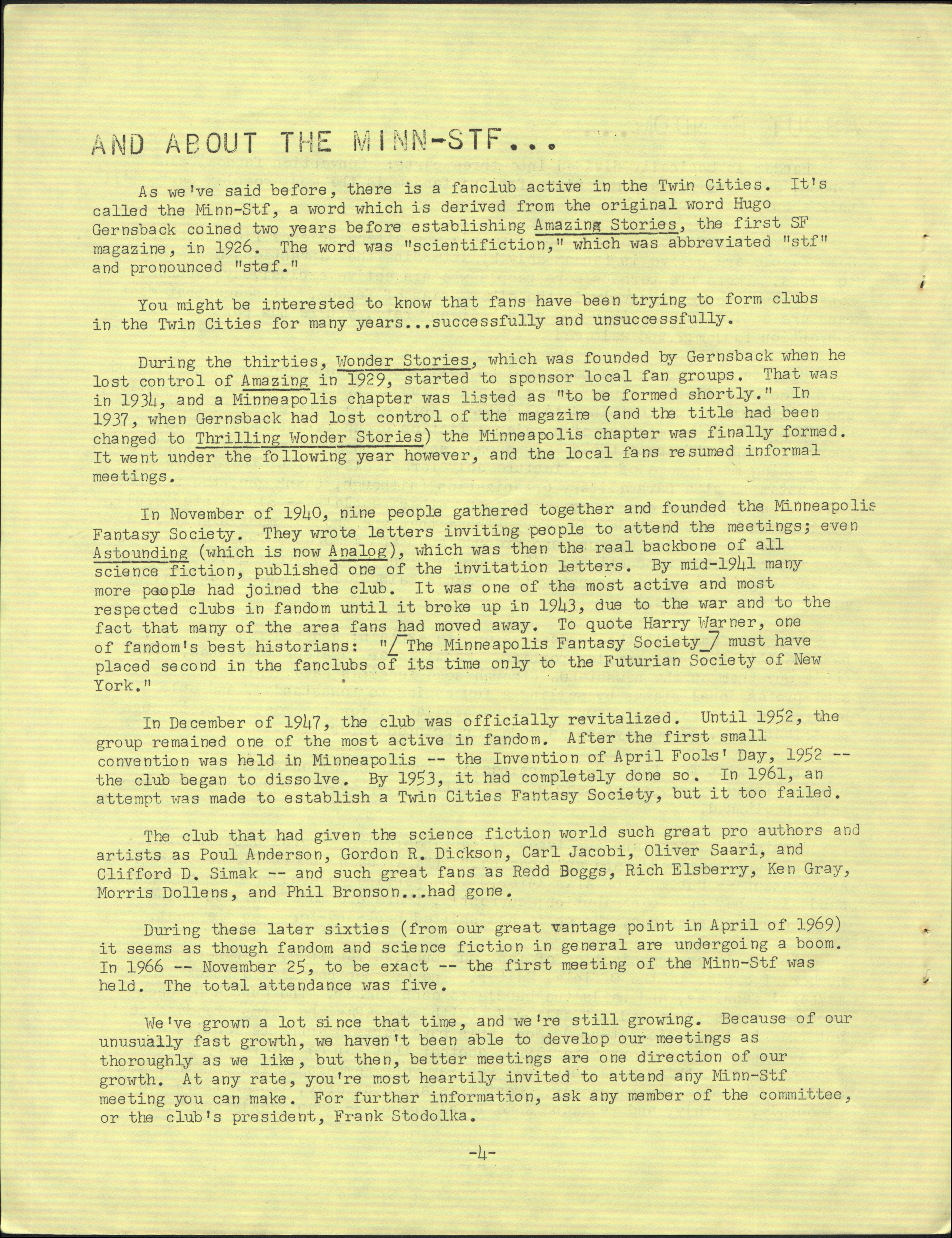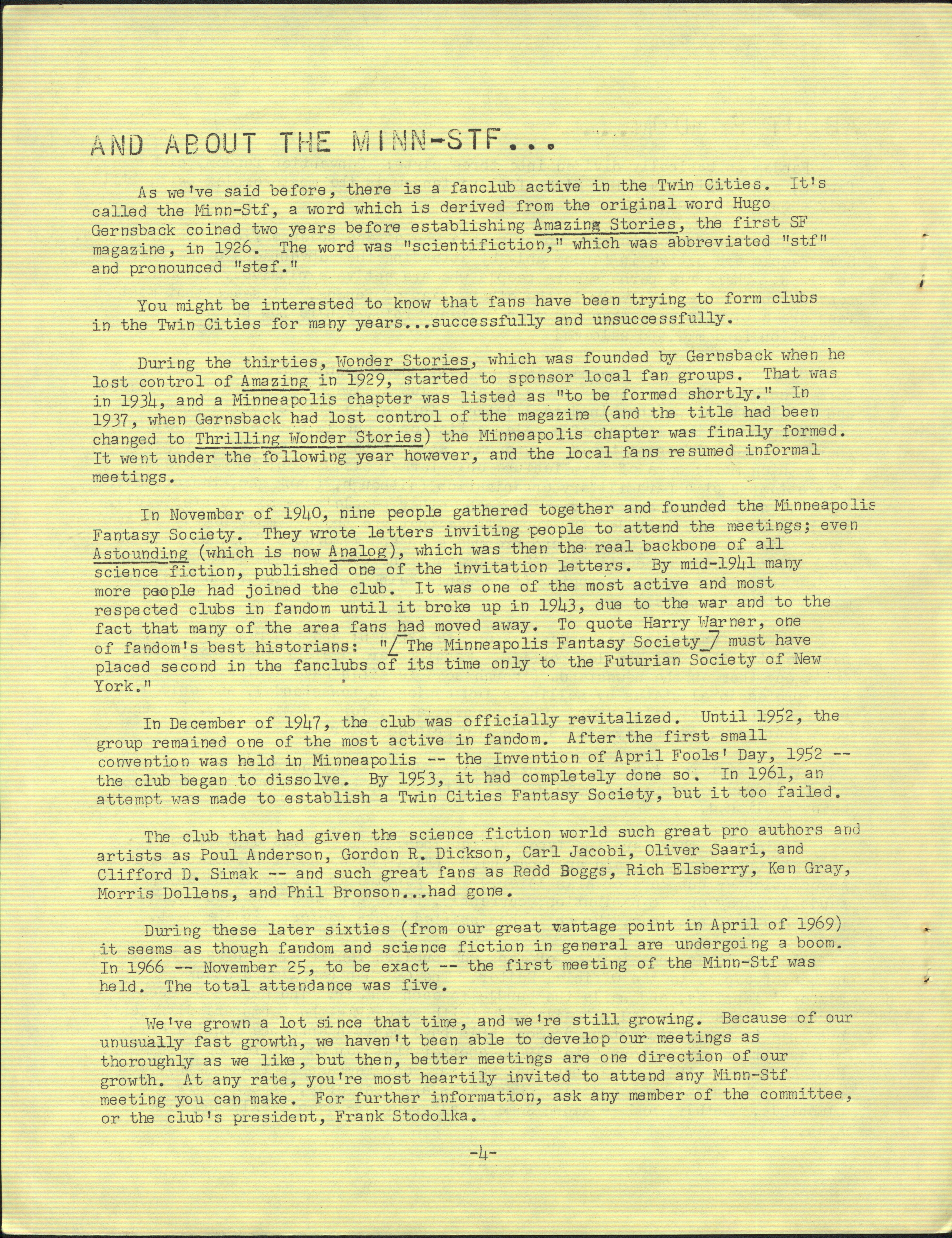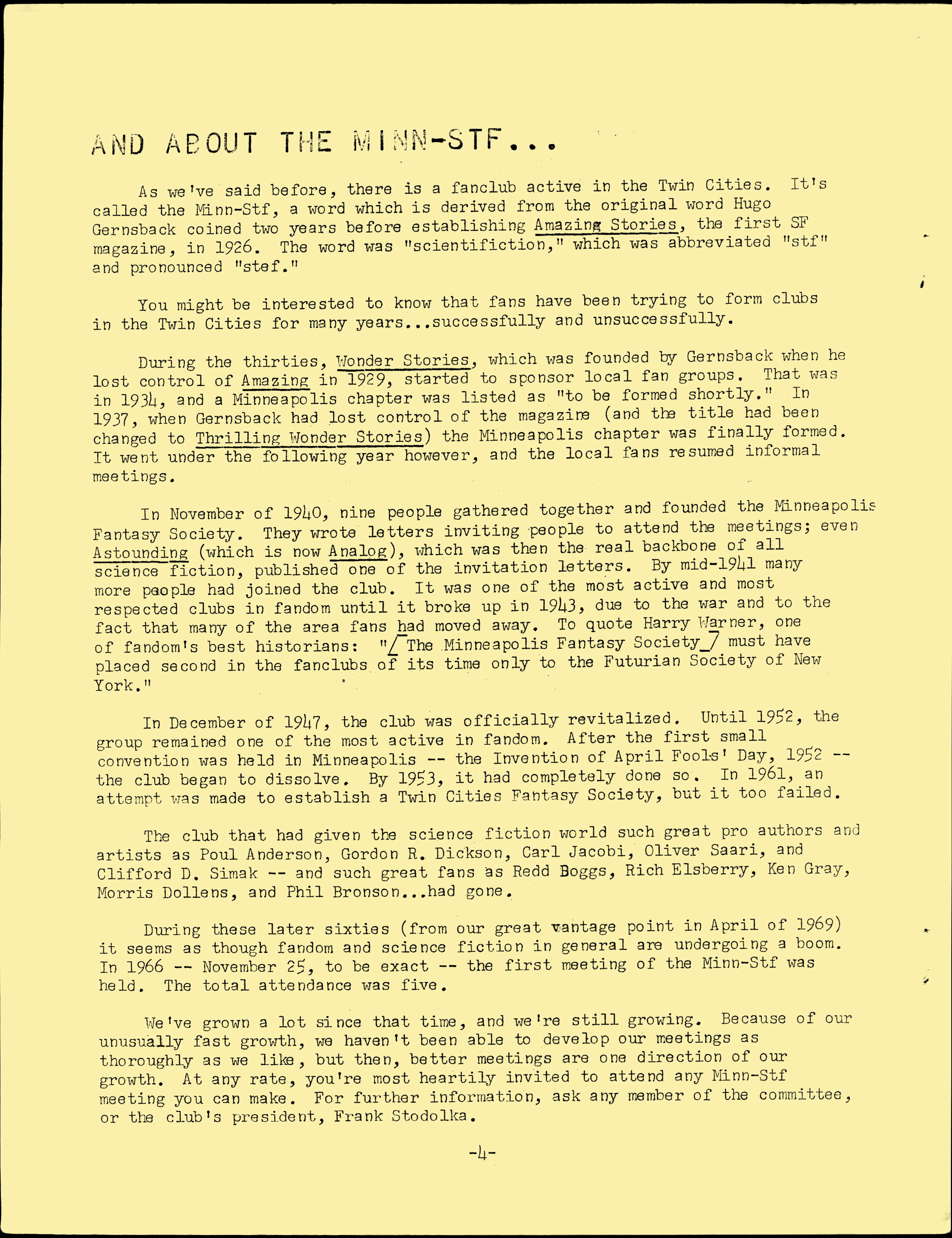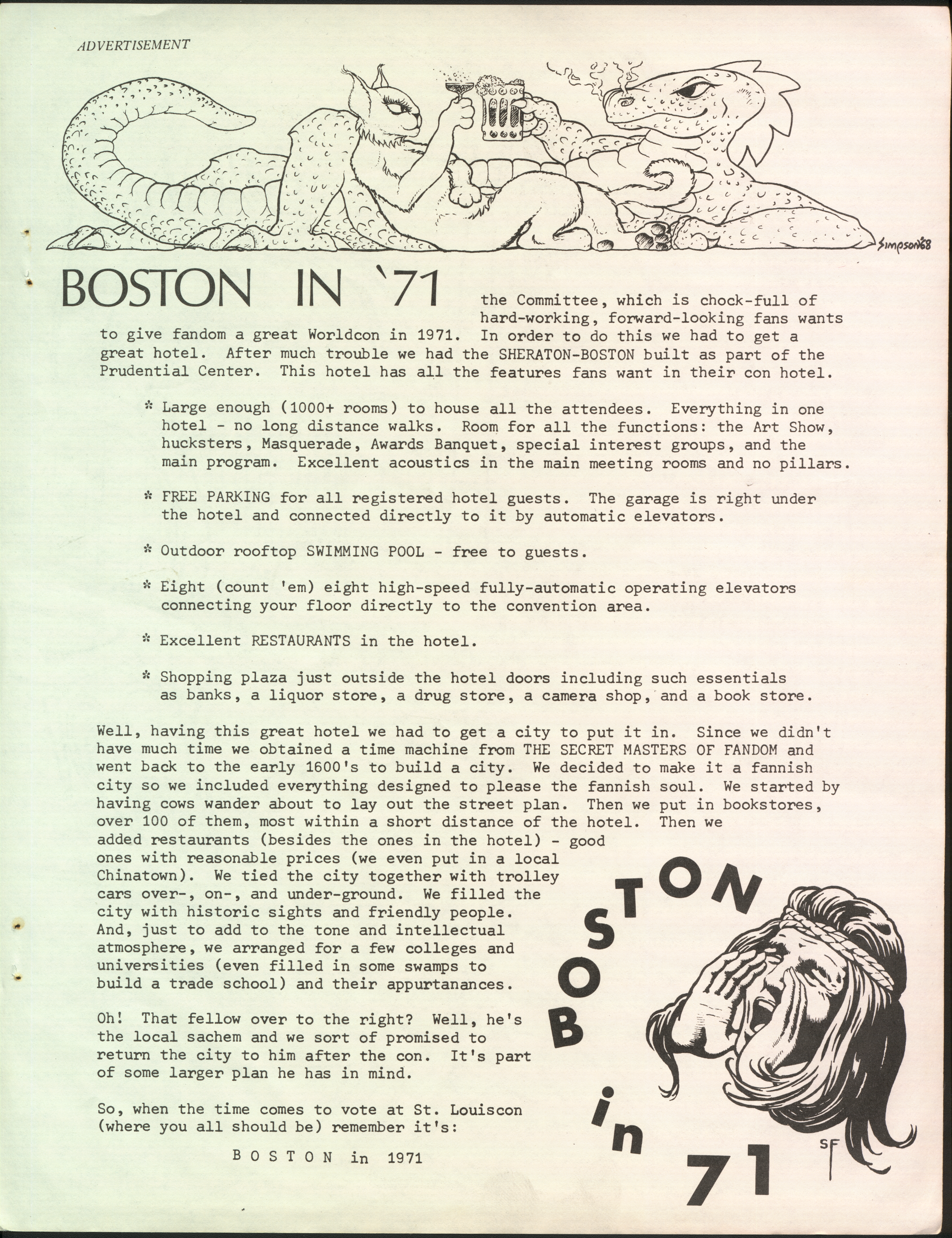 Marge Lessigner, Treasurer Ken Fletcher, Advertising Karen Johnson, Registration Frank Stodolka, Art-show and Book Room Lorie Berndt, Fred Haskell, Al Bencker, Rein Konen, Dan Musick Louis Fallert, Carol Stodolka, Nate Bucklin, Members of the Committee