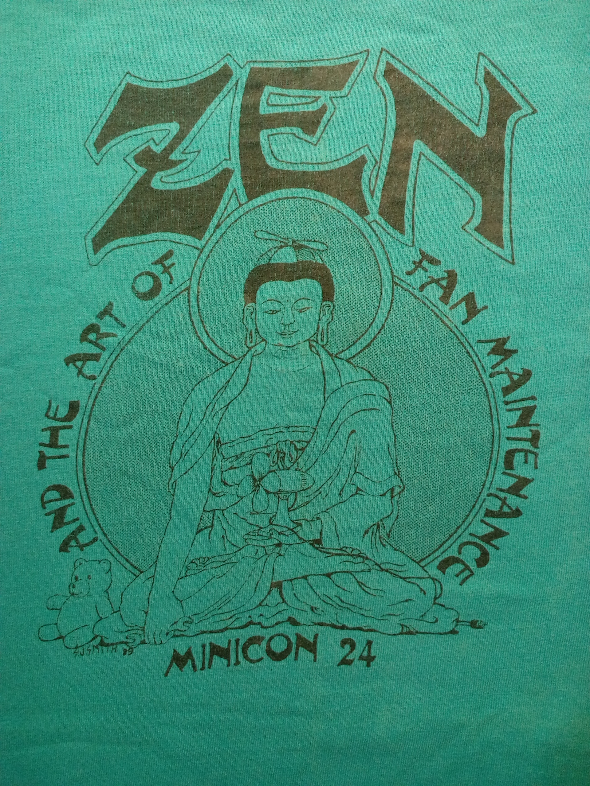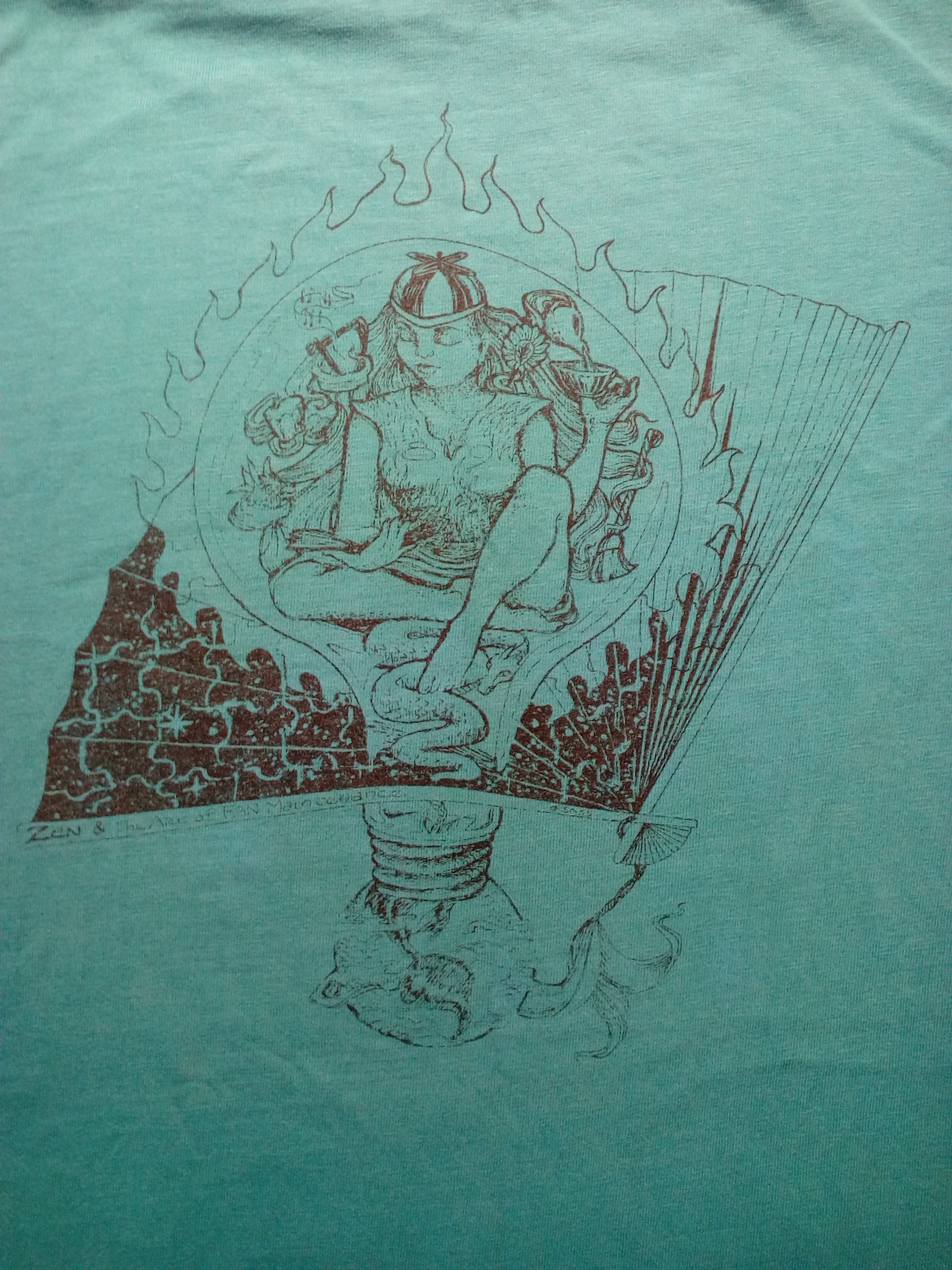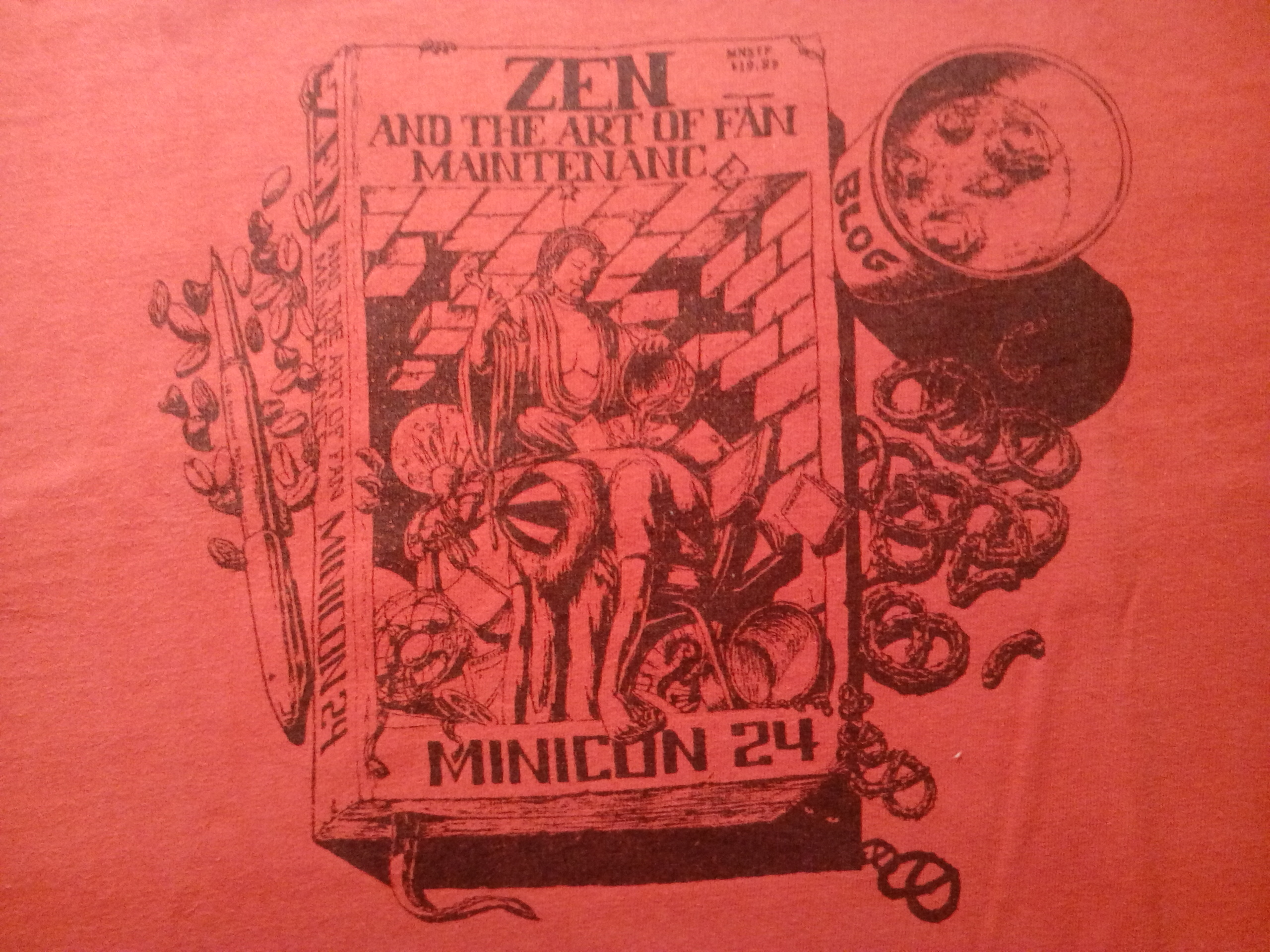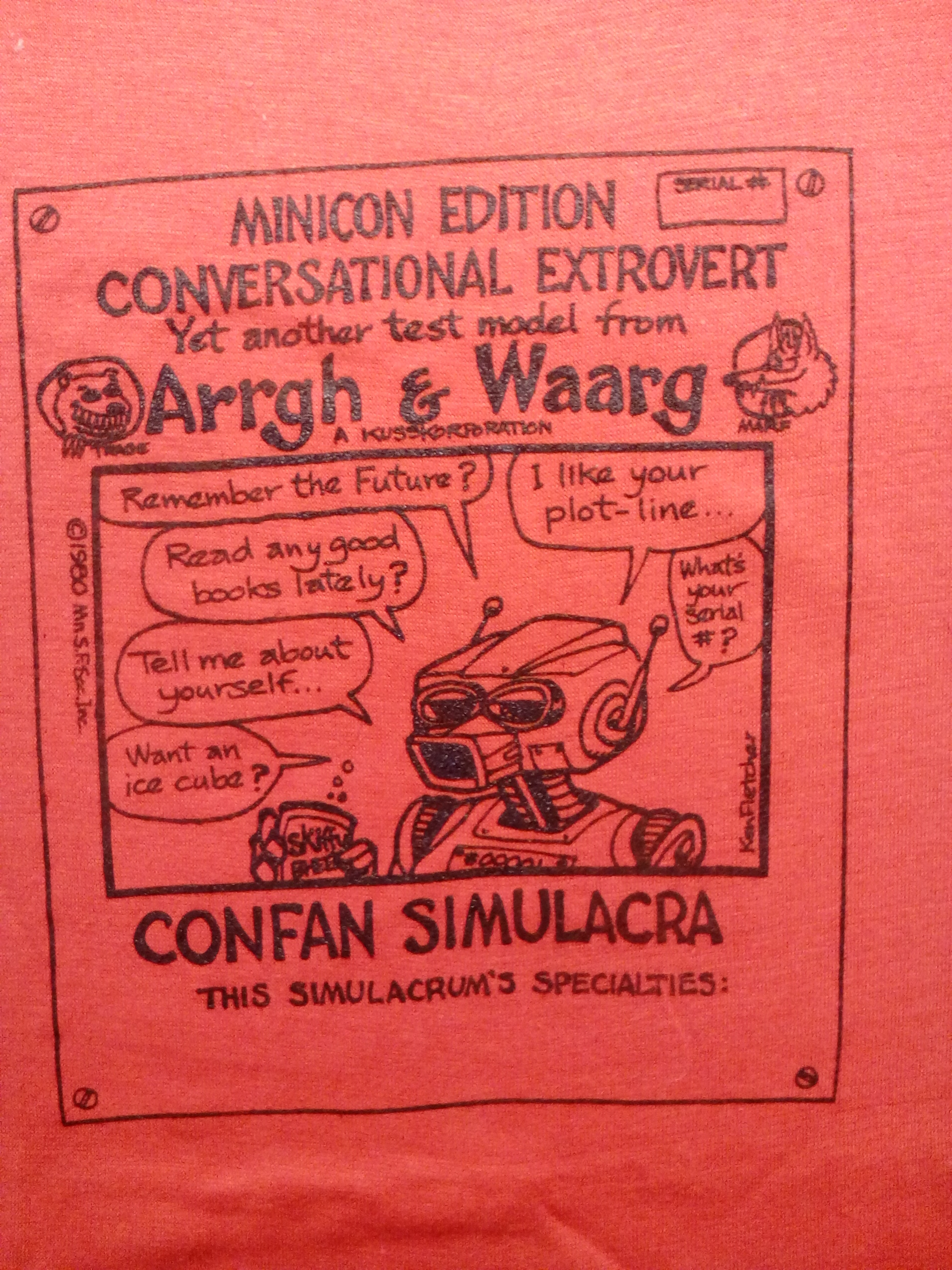 There were at least two t-shirt designs. For each here are the front and back, respectively. The first was also available in blue (and maybe other colors). The back is by Ken Fletcher: