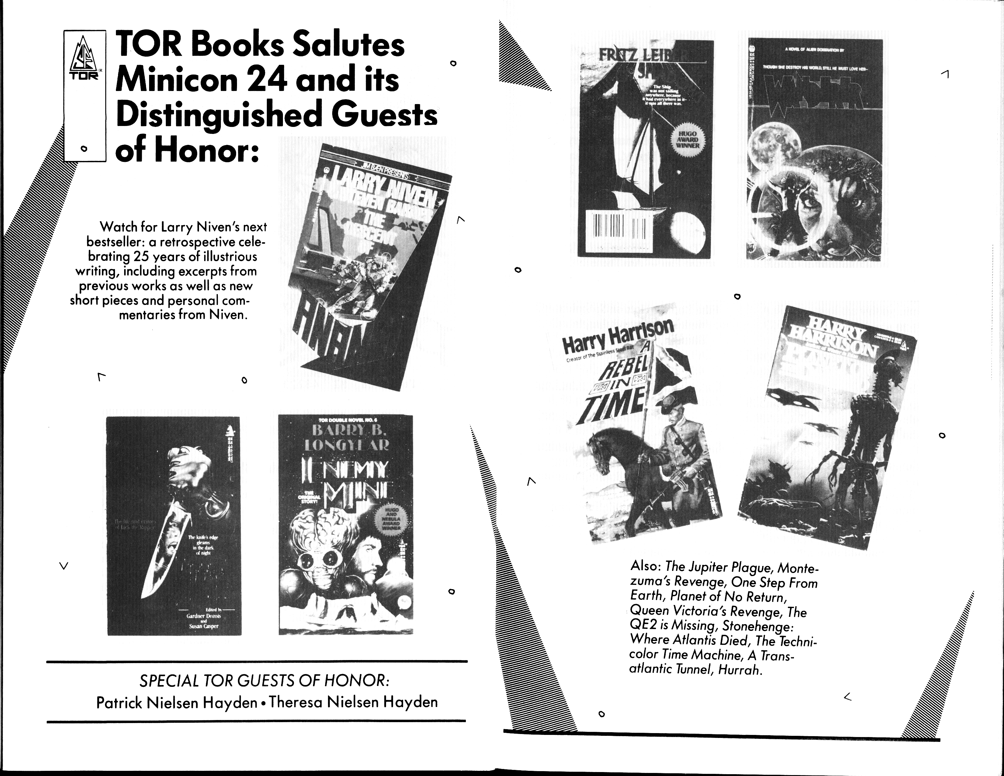Minicon 24 was held 24–26 March 1989 at the Radisson Hotel South (Bloomington). The guests of honor were Harry Harrison, George "Lan" Laskowski, Fritz Leiber, and Barry B. Longyear. Honored guests were Patrick Nielsen Hayden, Teresa Nielsen Hayden, P. C. Hodgell, Larry Niven, and John Sladek. The executive committee was Susan K. Grandys, Jerry Stearns, Geof Stone, and Martin Schafer.