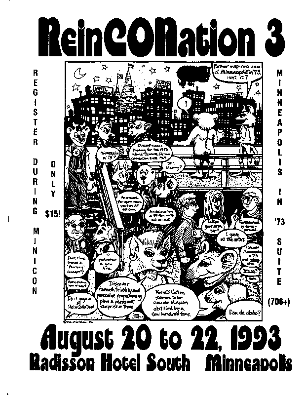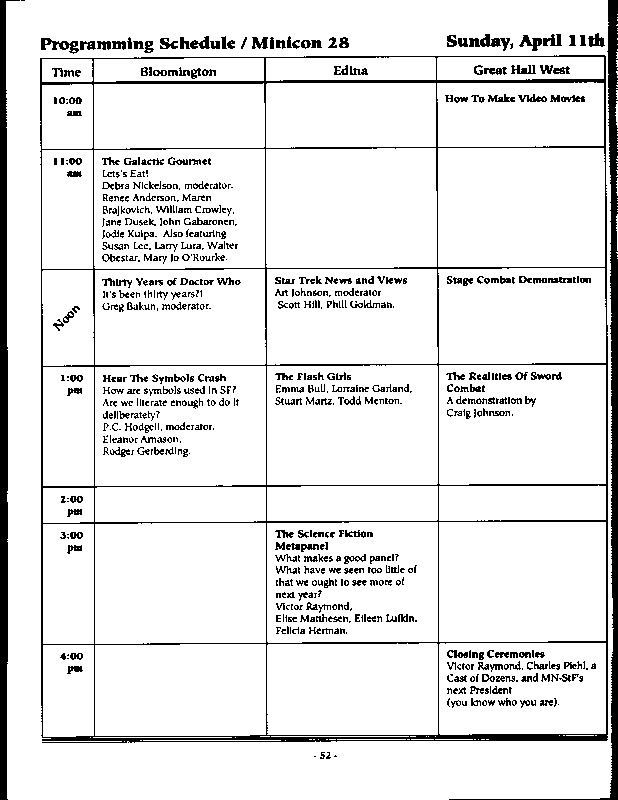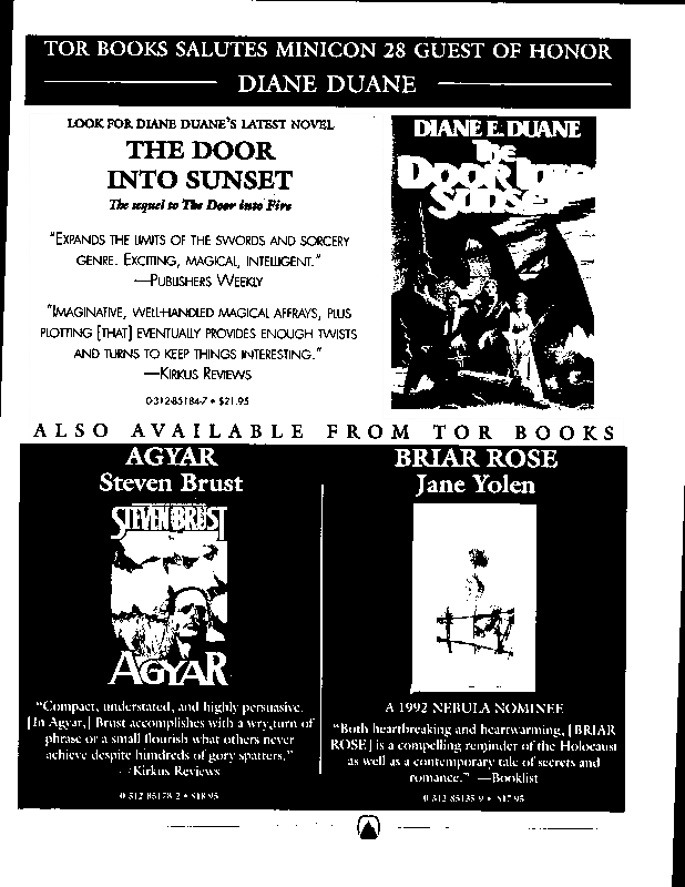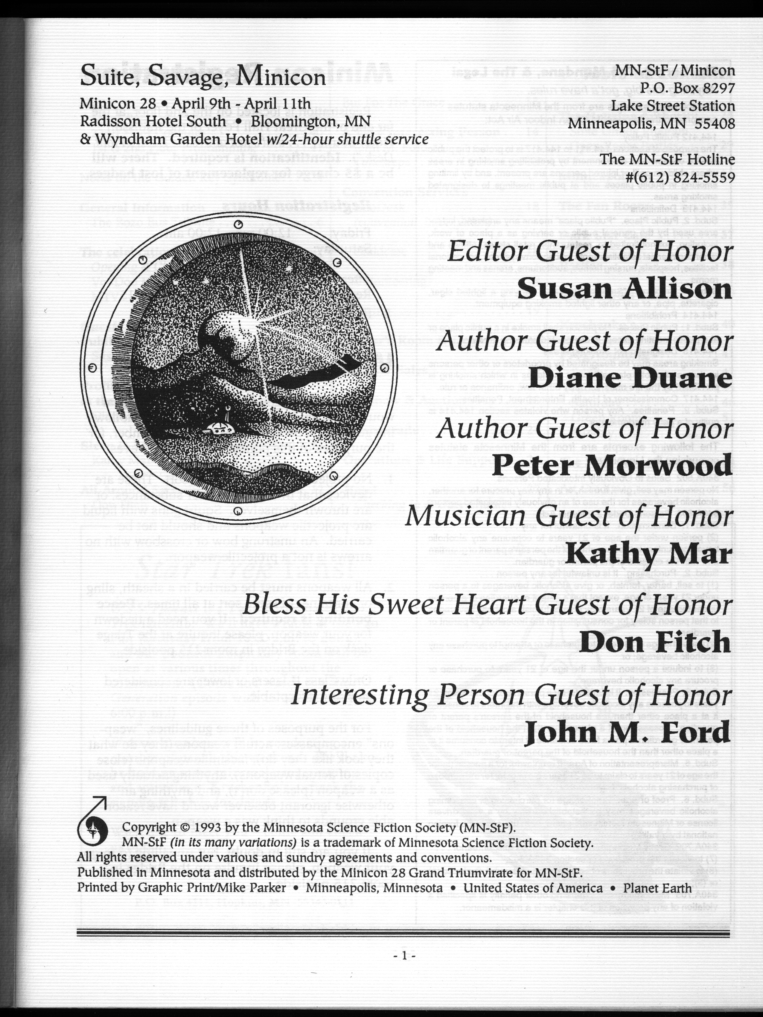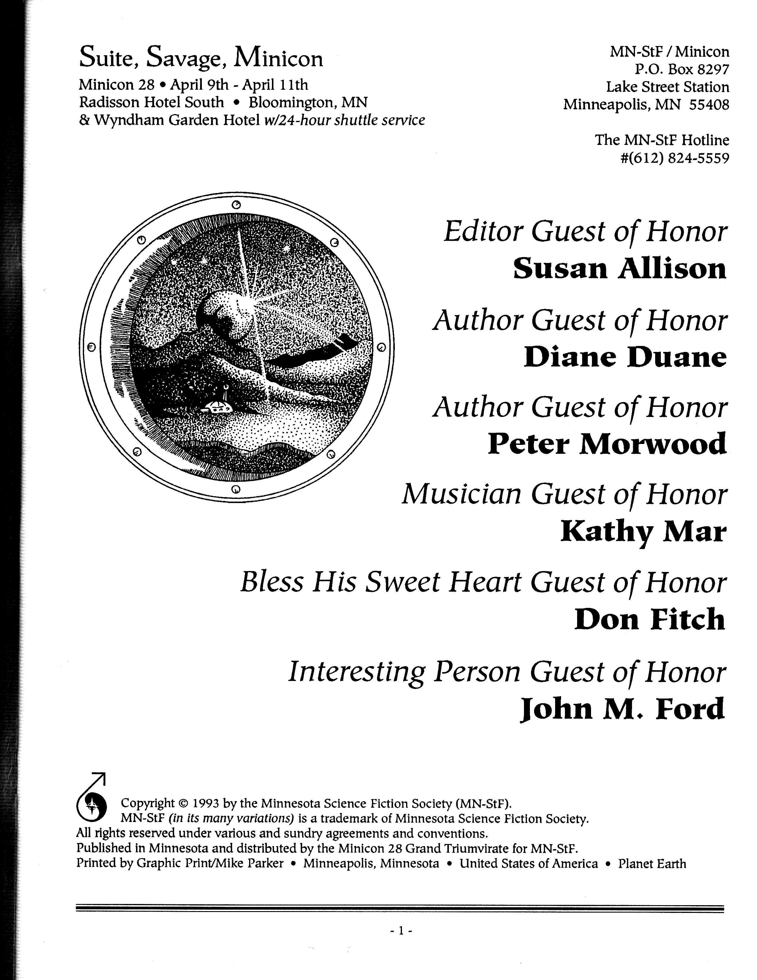 Minicon 28 was held 9–11 April 1993 at the Radisson Hotel South (Bloomington). Guests of honor were Susan Allison (editor), Diane Duane (author), Peter Morwood (author), Kathy Mar (music), Don Fitch (bless his sweet heart), and John M. Ford (interesting person). The membership totalled about 3100. The executive committe (styling themselves as The Grand Triumvirate), were Margo Bratton, Polly Peterson, and Victor Raymond.