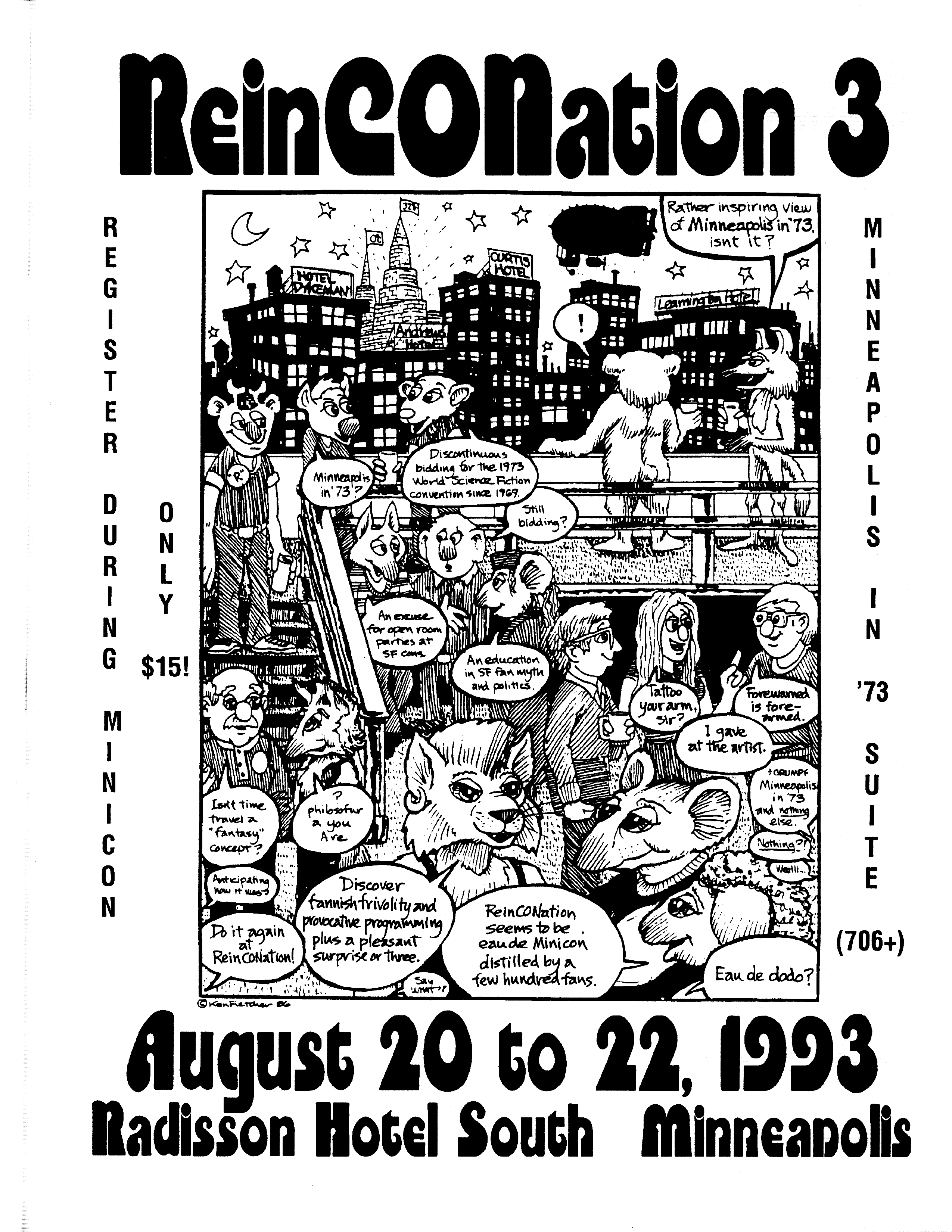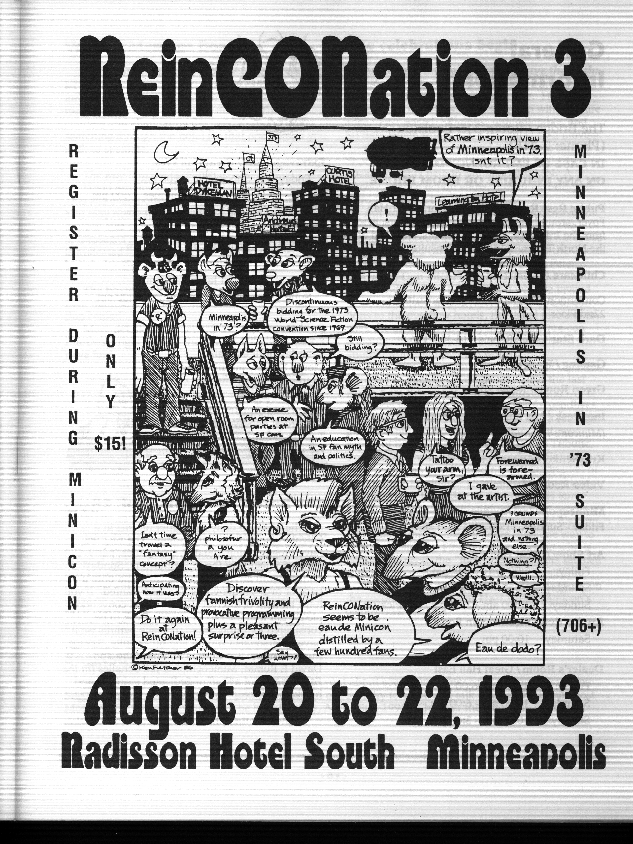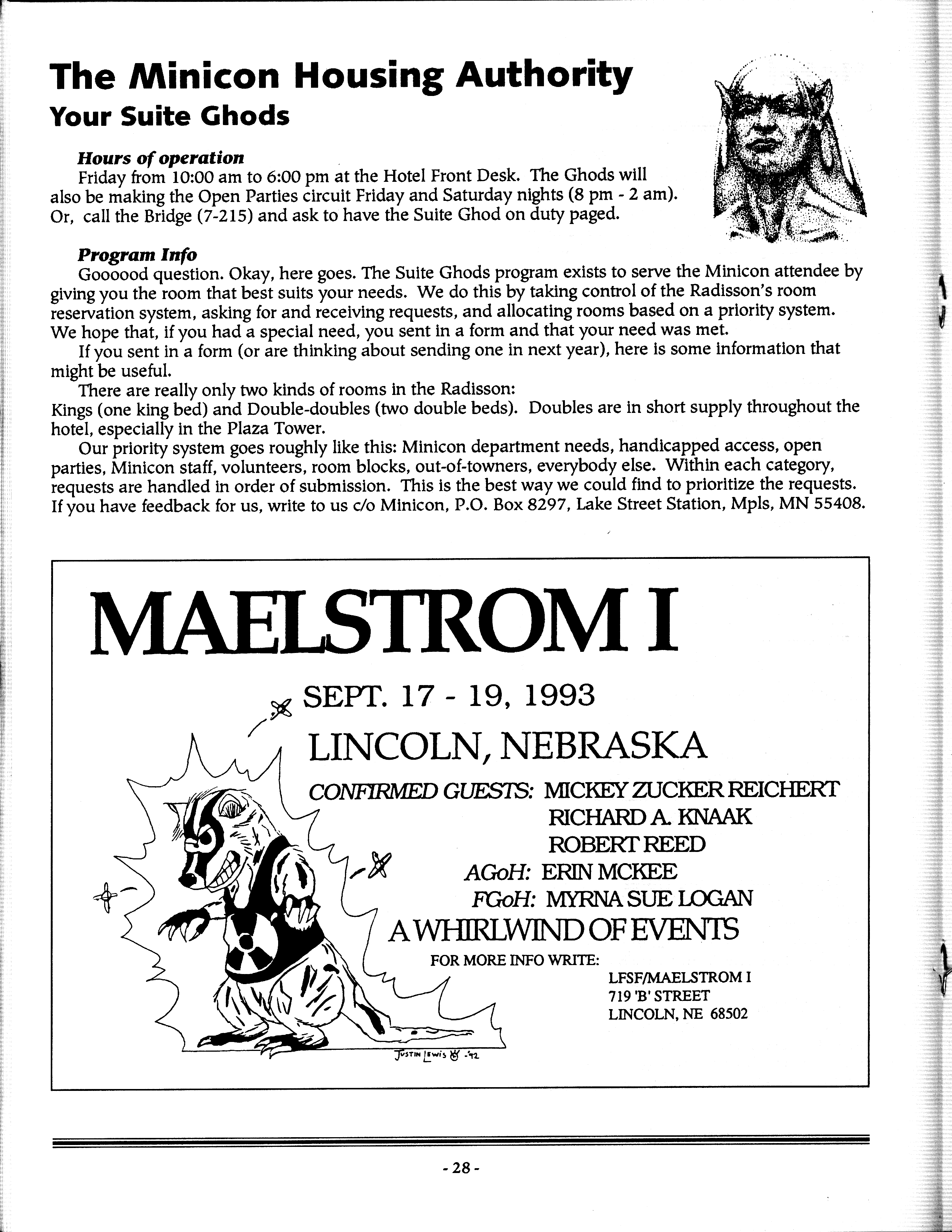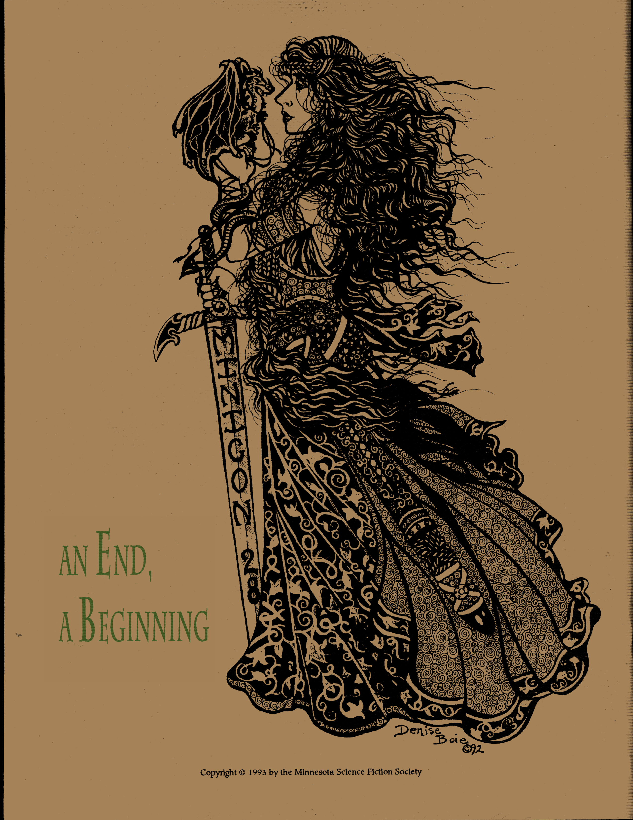 Minicon 28 was held 9–11 April 1993 at the Radisson Hotel South (Bloomington). Guests of honor were Susan Allison (editor), Diane Duane (author), Peter Morwood (author), Kathy Mar (music), Don Fitch (bless his sweet heart), and John M. Ford (interesting person). The membership totalled about 3100. The executive committe (styling themselves as The Grand Triumvirate), were Margo Bratton, Polly Peterson, and Victor Raymond.