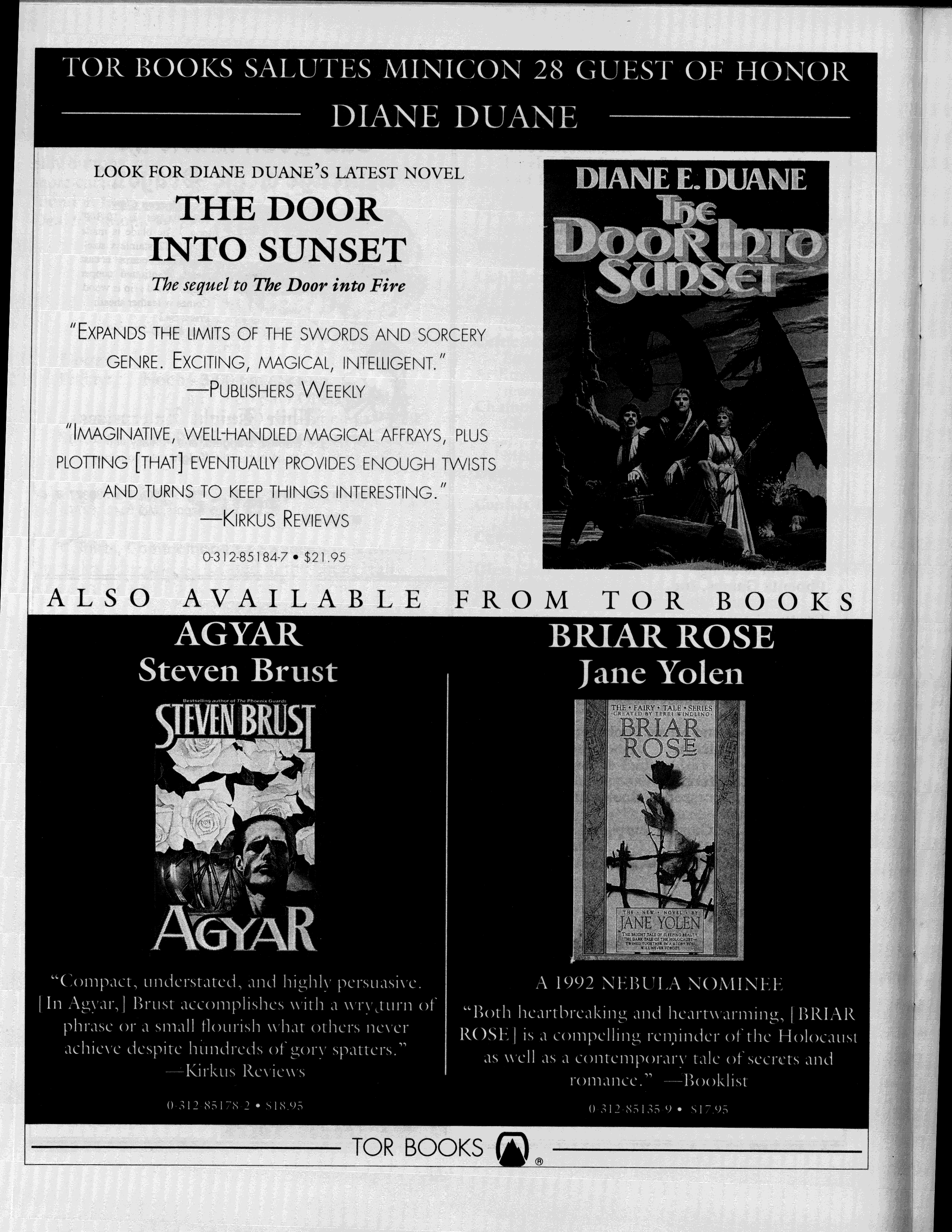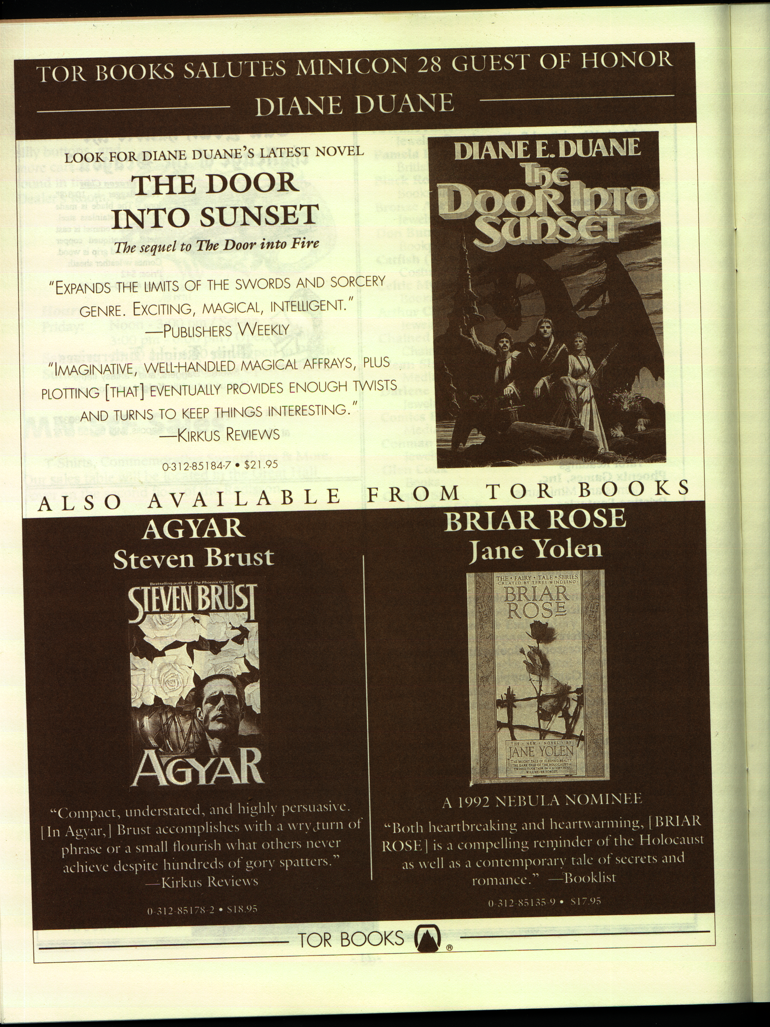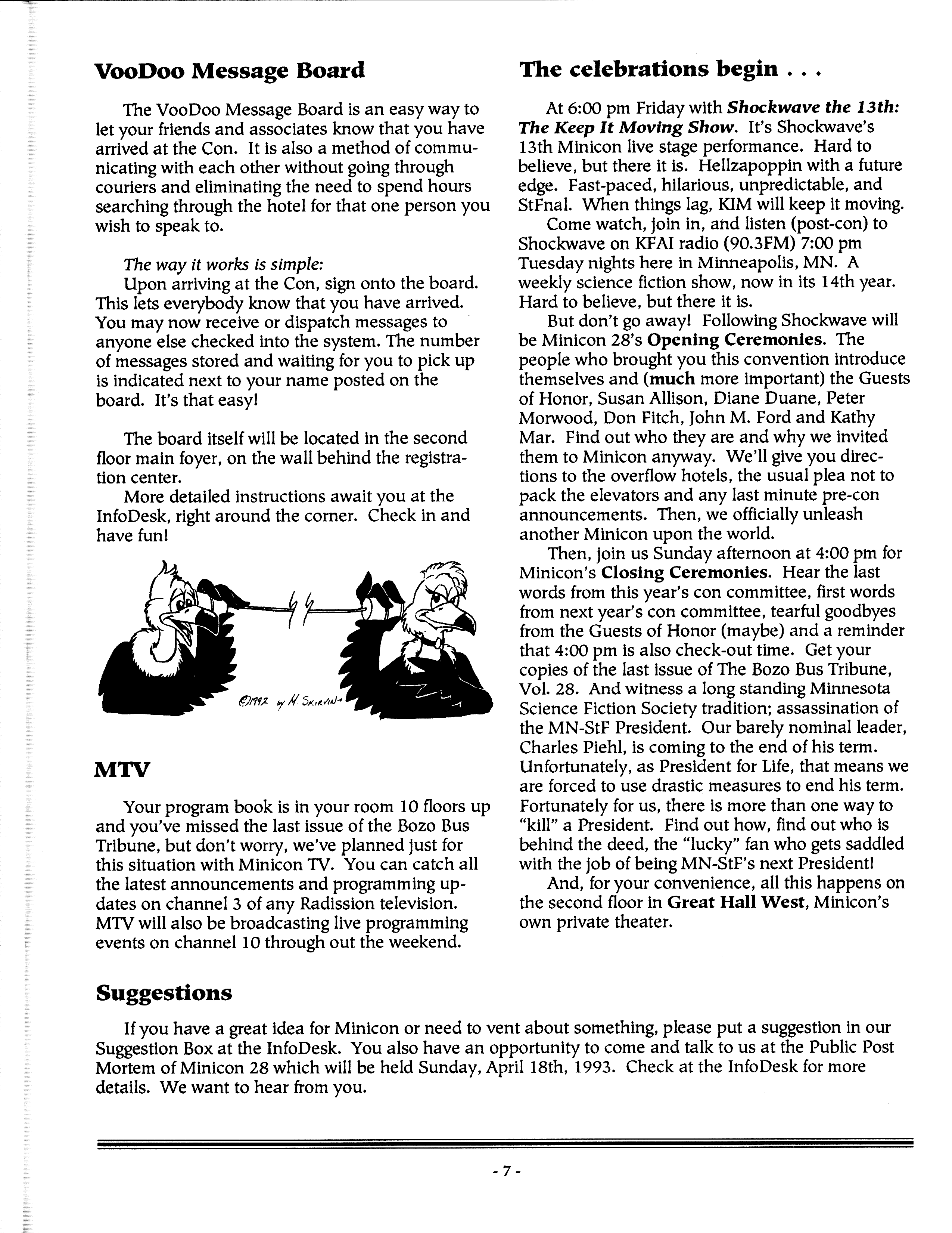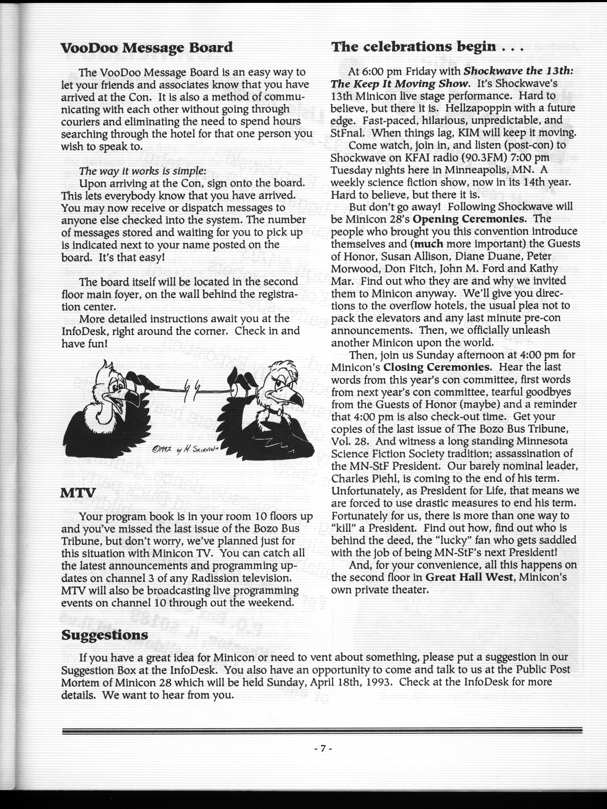 Minicon 28 was held 9–11 April 1993 at the Radisson Hotel South (Bloomington). Guests of honor were Susan Allison (editor), Diane Duane (author), Peter Morwood (author), Kathy Mar (music), Don Fitch (bless his sweet heart), and John M. Ford (interesting person). The membership totalled about 3100. The executive committe (styling themselves as The Grand Triumvirate), were Margo Bratton, Polly Peterson, and Victor Raymond.