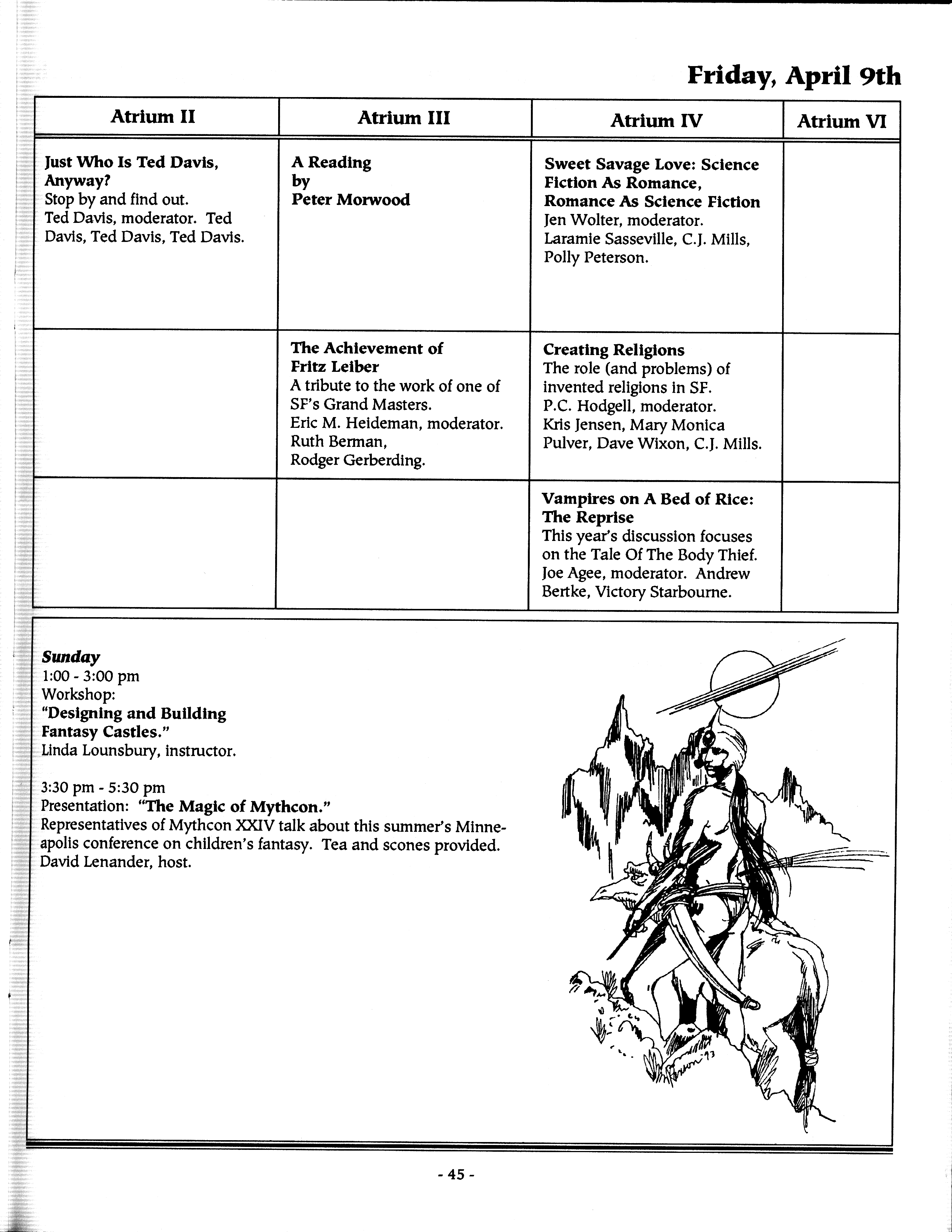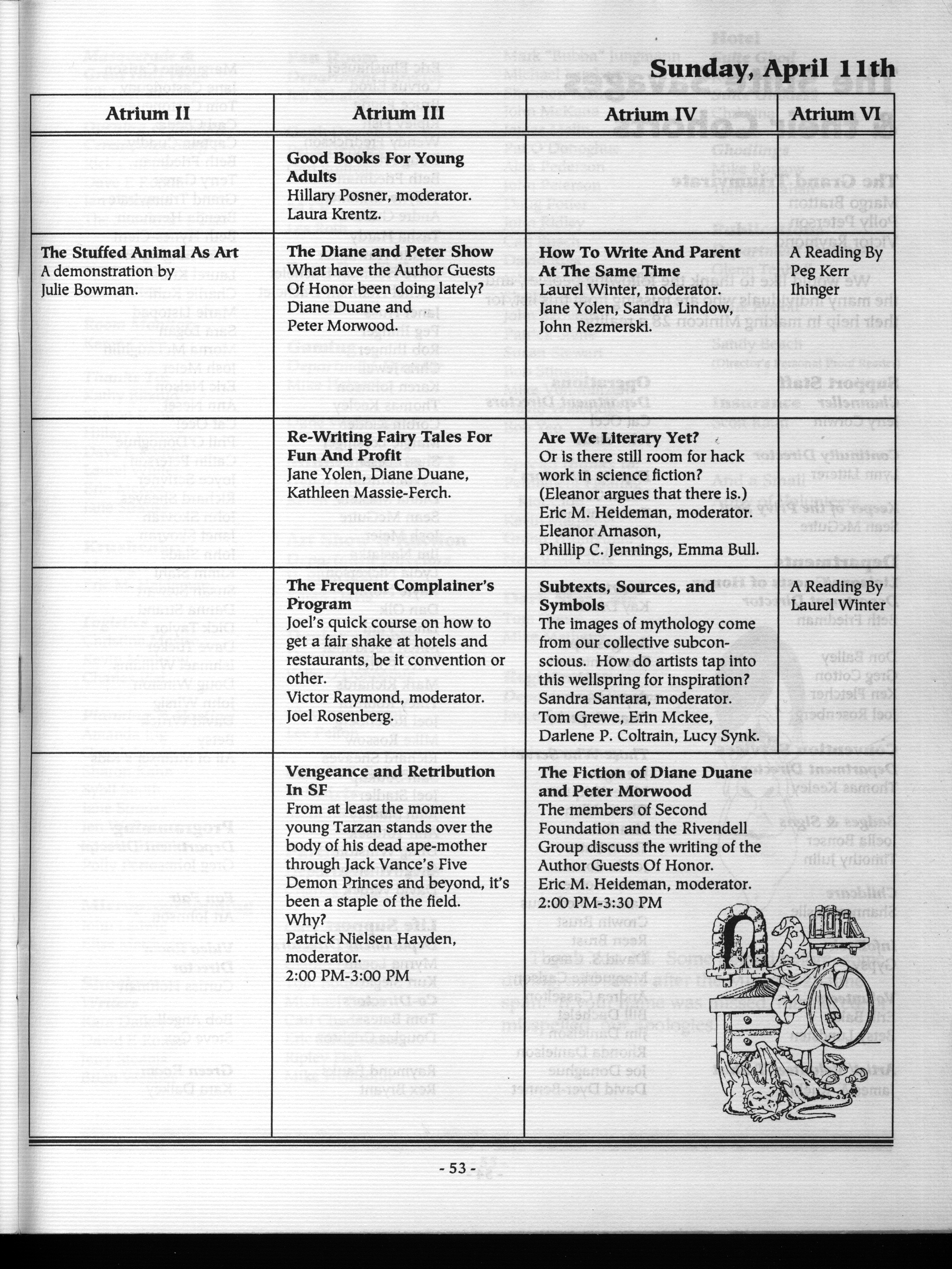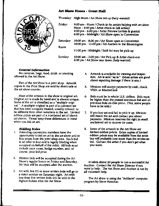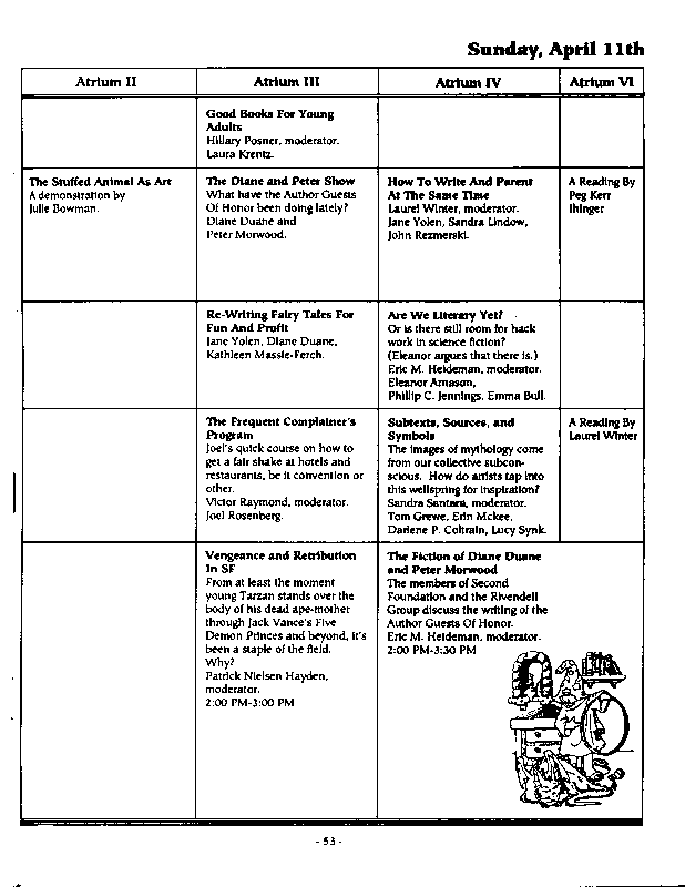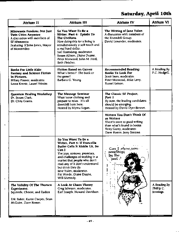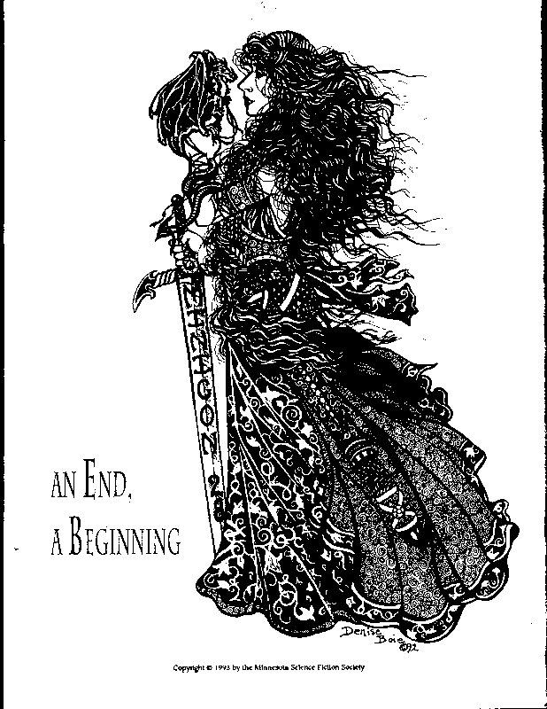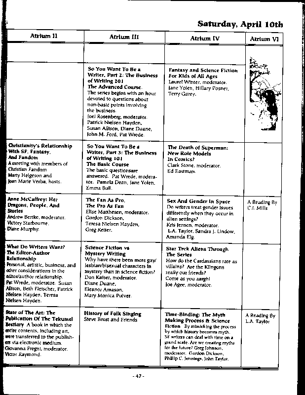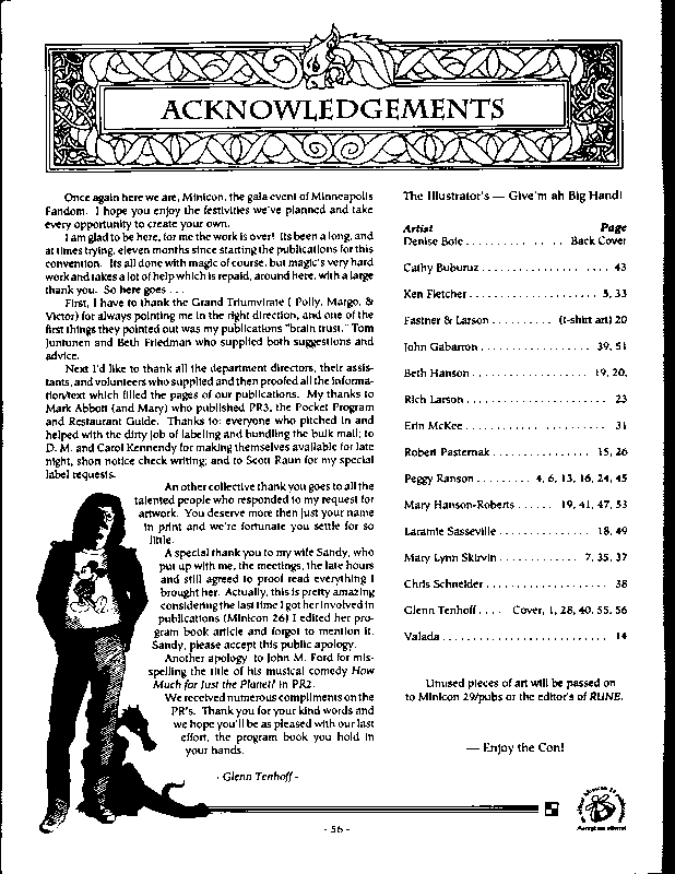 Art by Mary Hanson-Roberts, Cathy Buburuz, Chris Schneider, John Gabarron, Denise Boie, and Peggy Ranson is assumed to ok to reproduce here. The program book has an ambiguous copyright statement and we don't know how to contact them, or have received no reply to our inquries. Take it to be © each of them, all rights reserved.