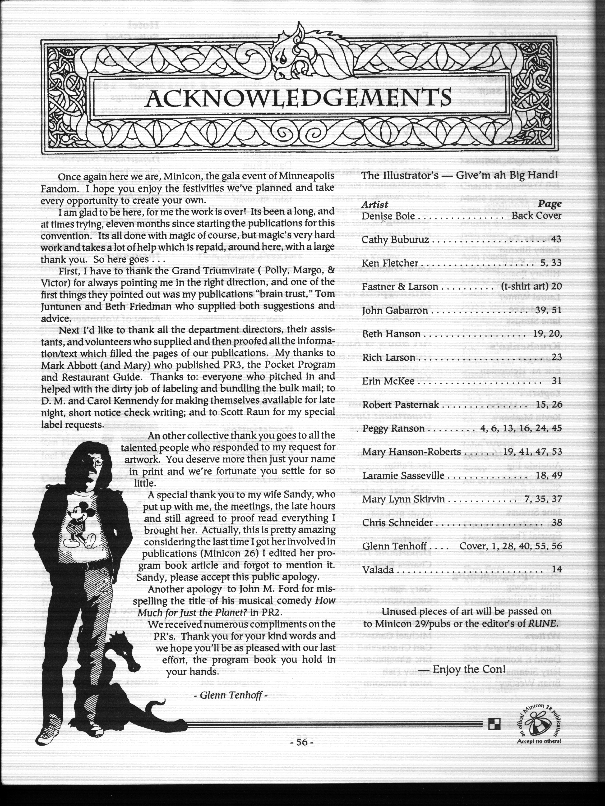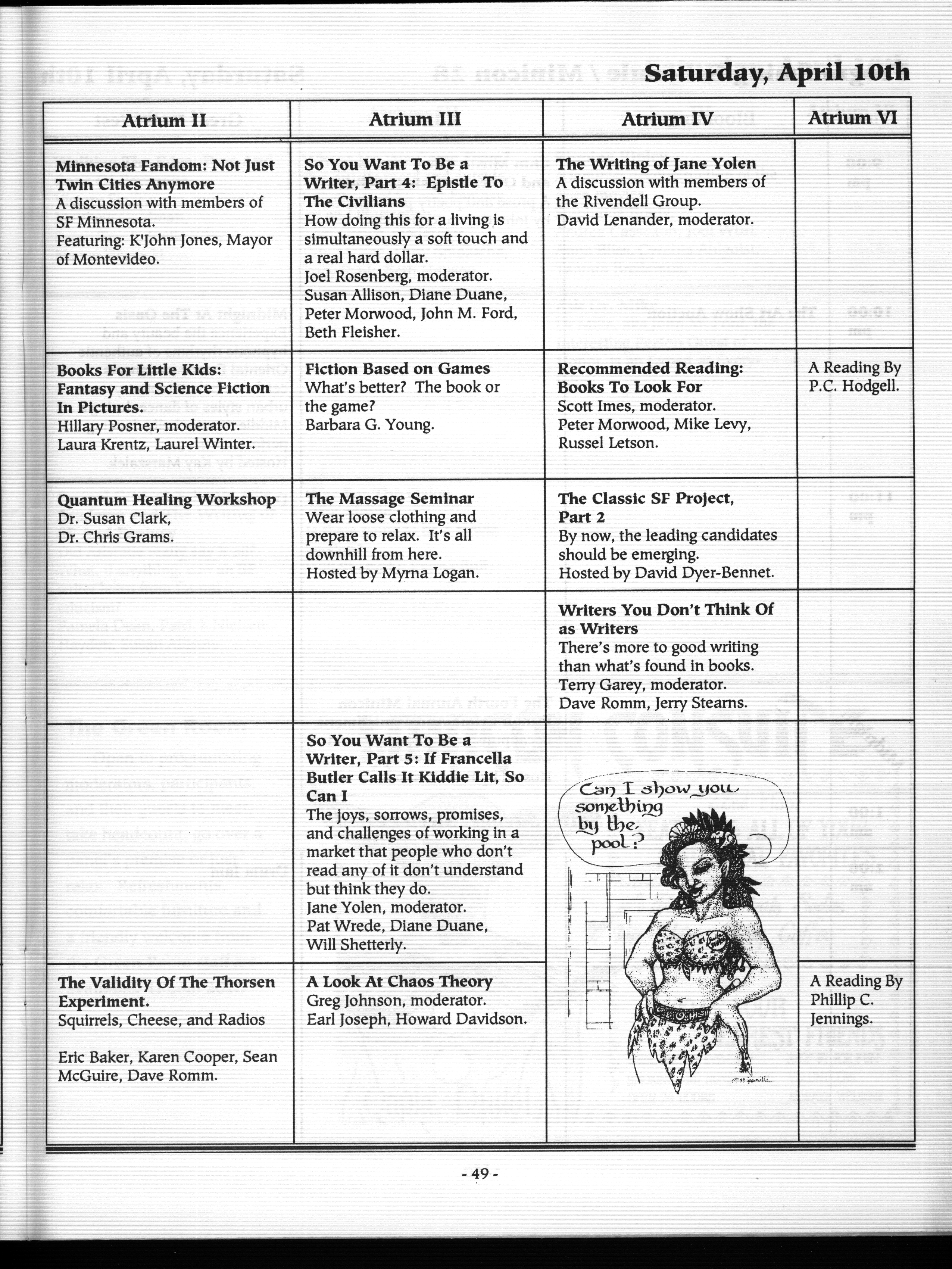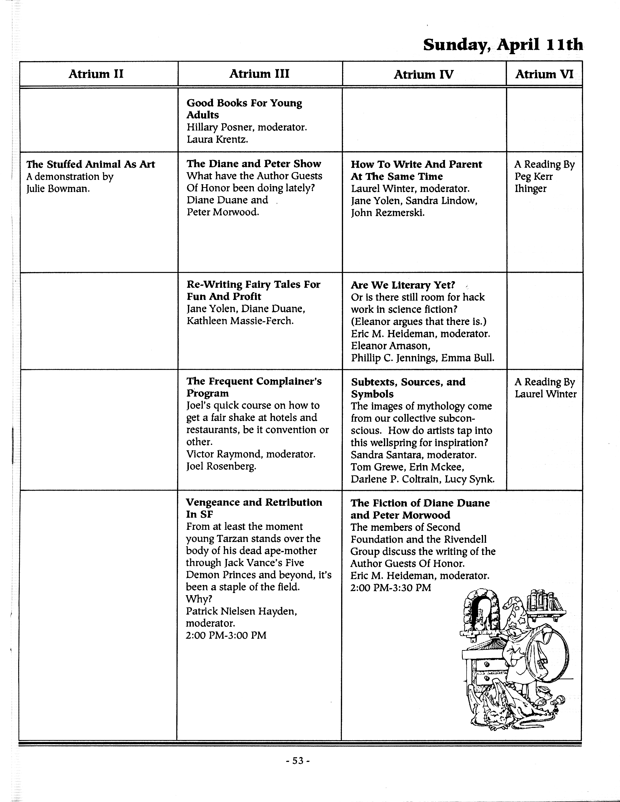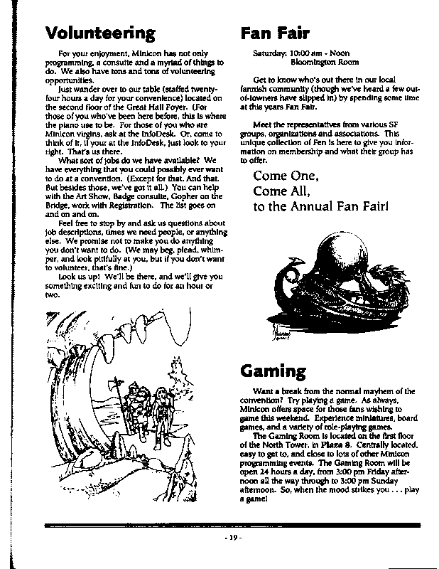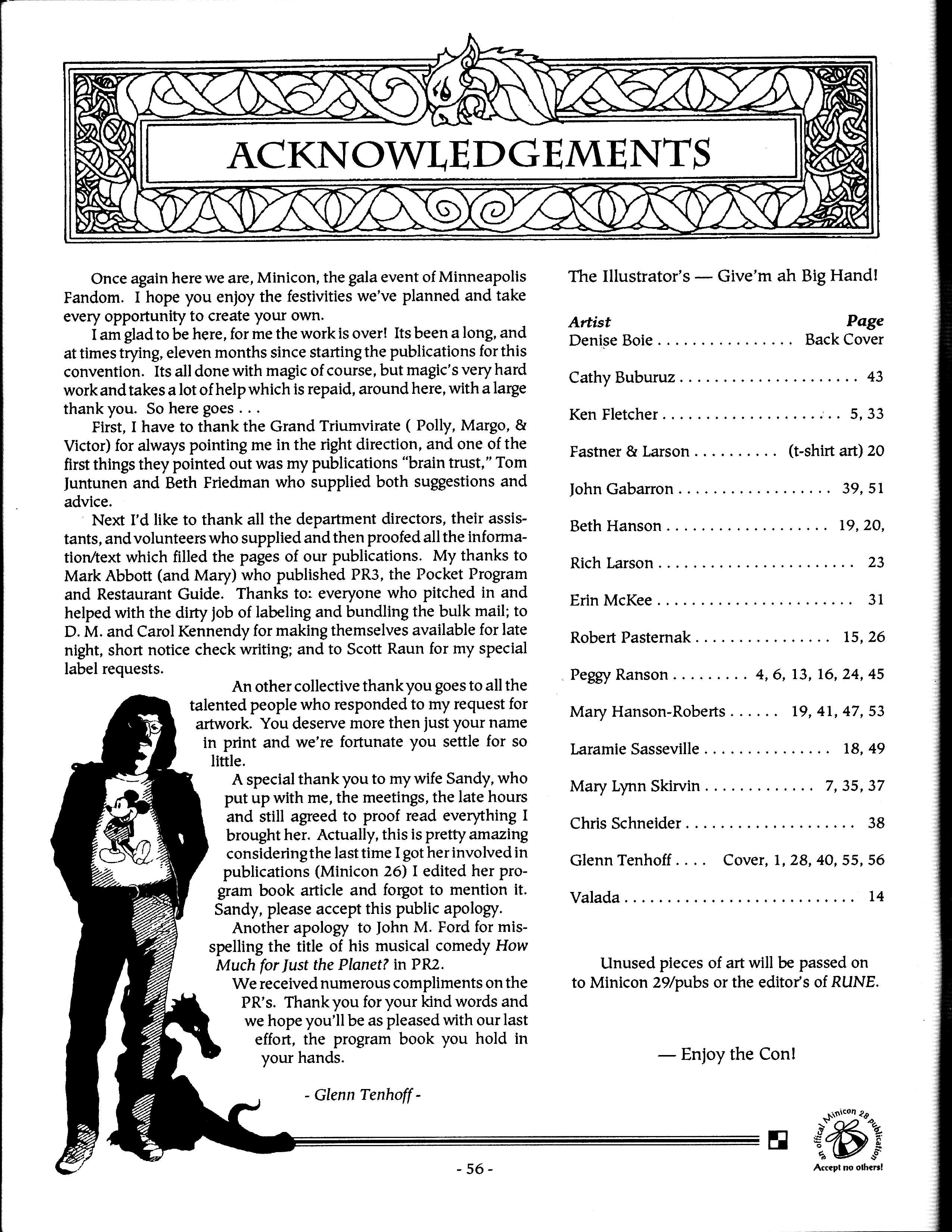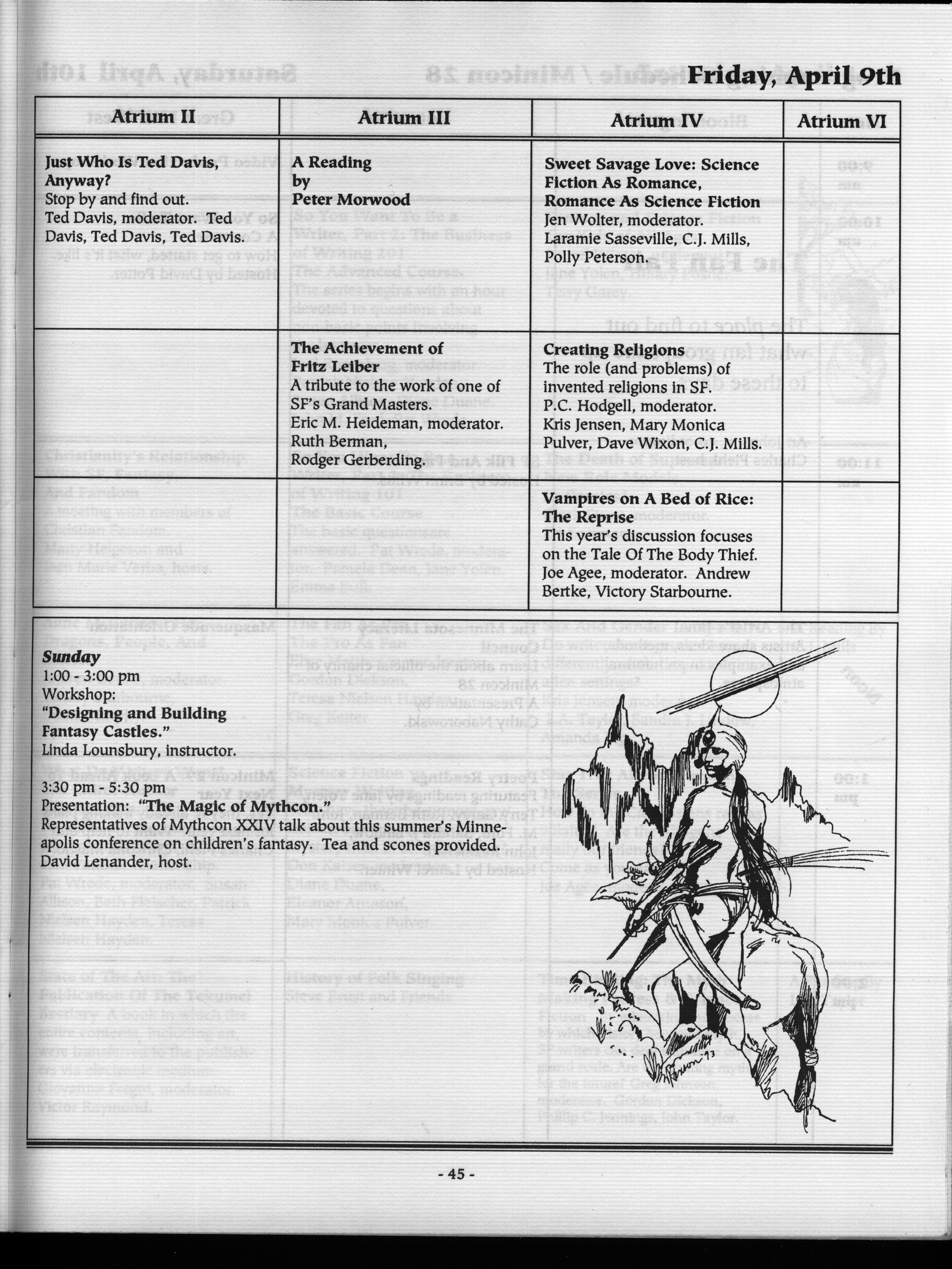Art by Mary Hanson-Roberts, Cathy Buburuz, Chris Schneider, John Gabarron, Denise Boie, and Peggy Ranson is assumed to ok to reproduce here. The program book has an ambiguous copyright statement and we don't know how to contact them, or have received no reply to our inquries. Take it to be © each of them, all rights reserved.