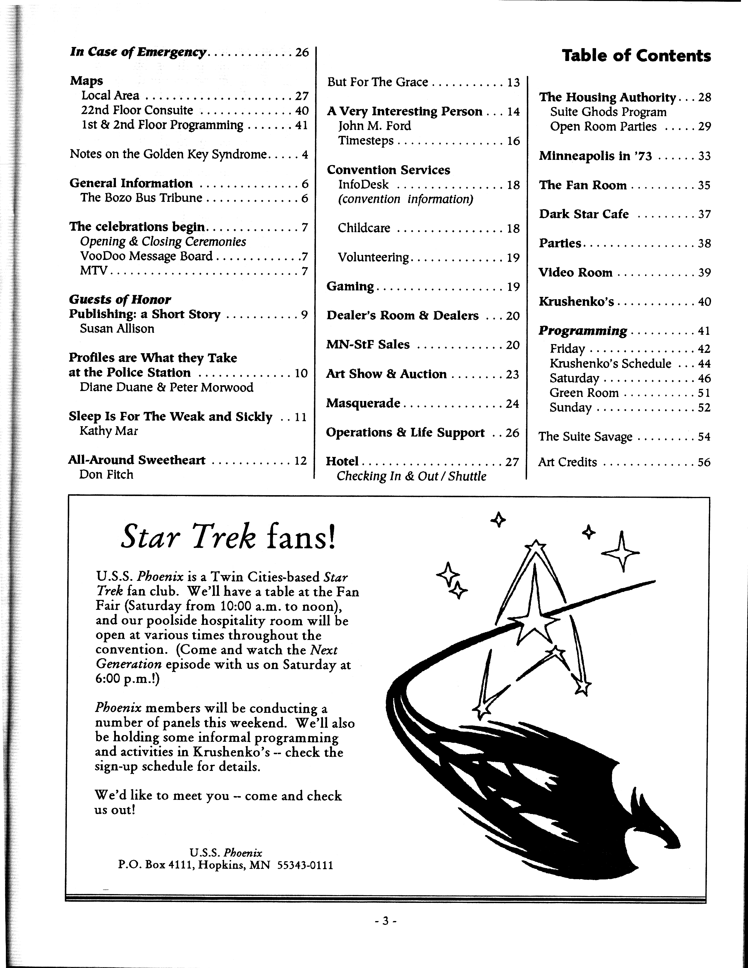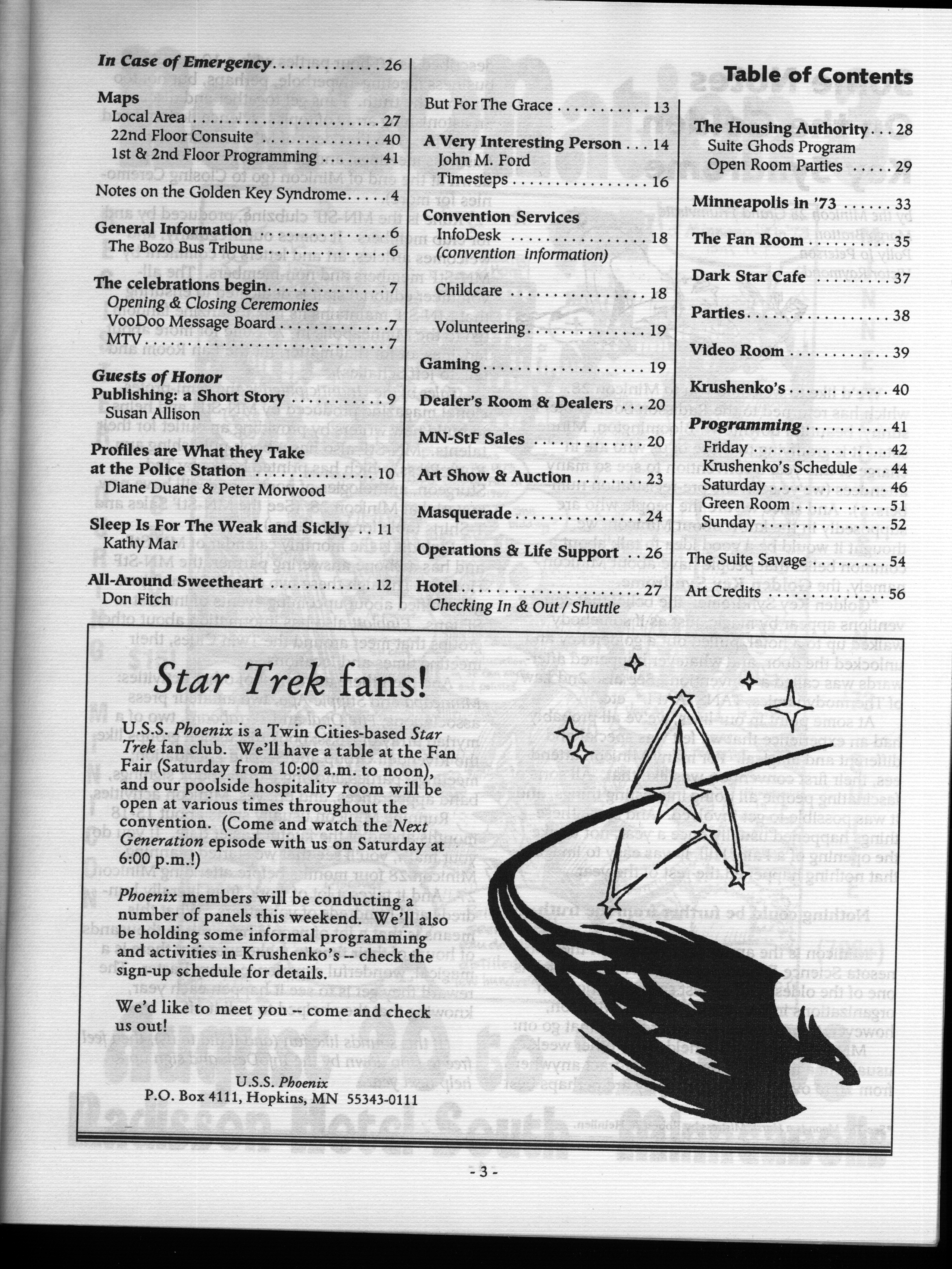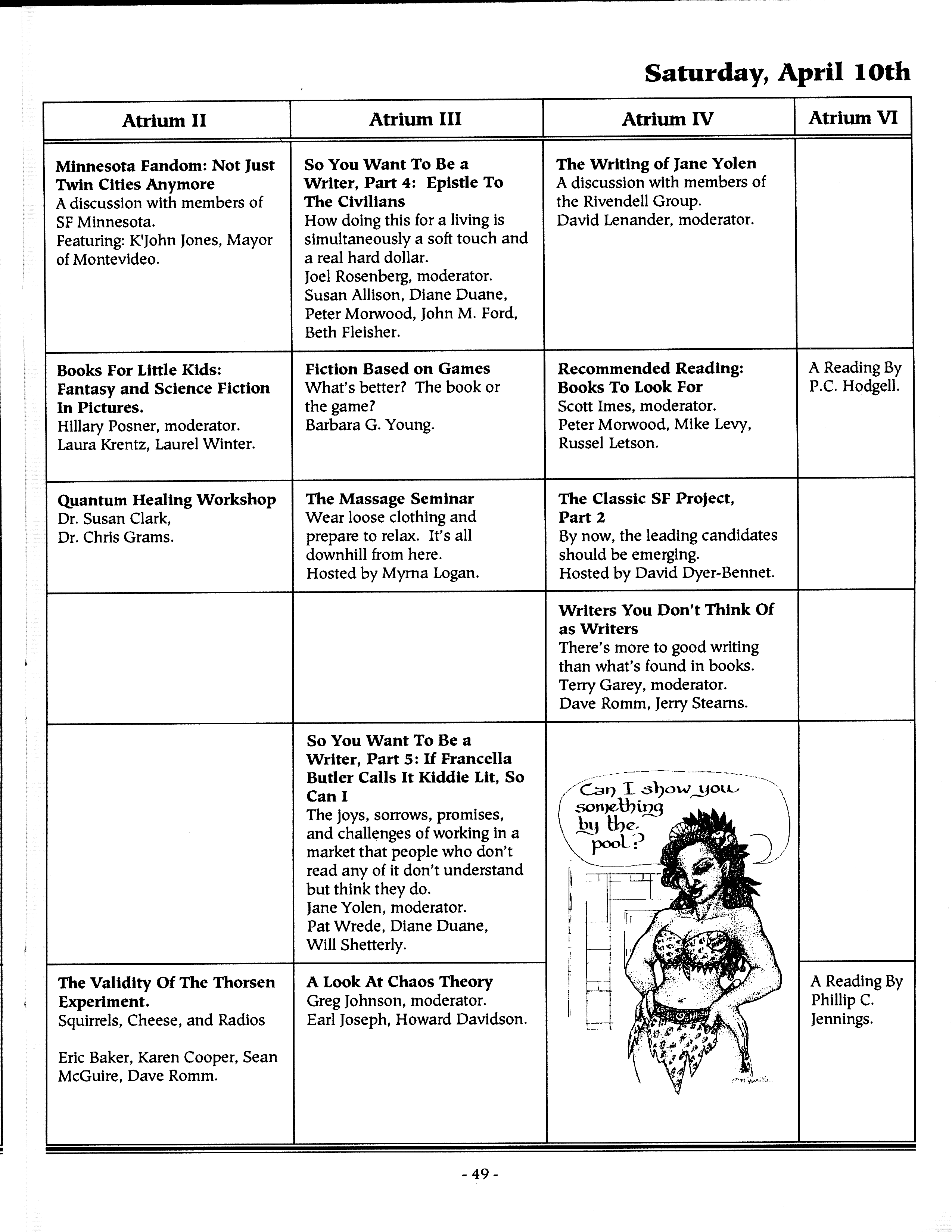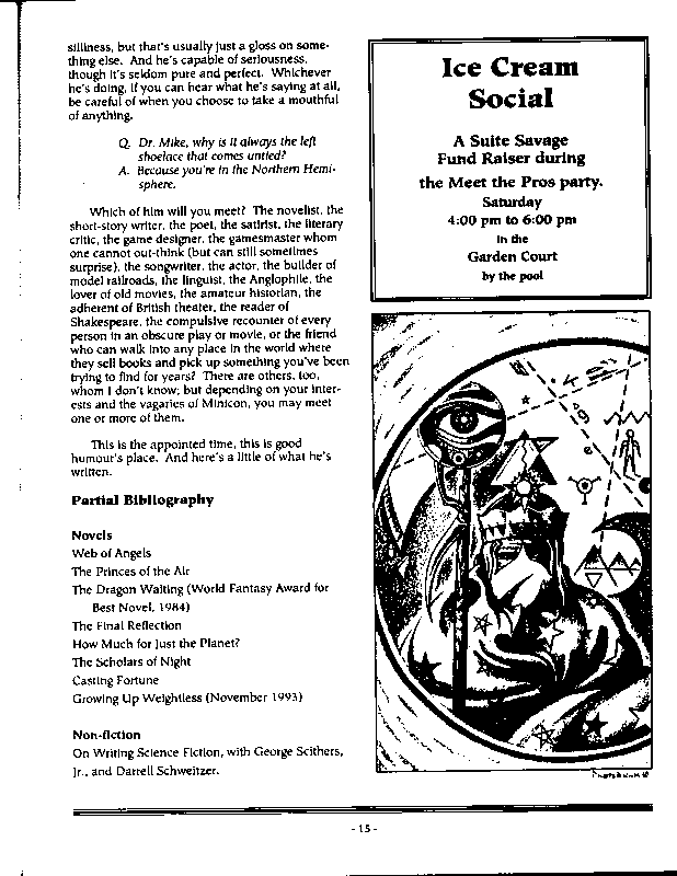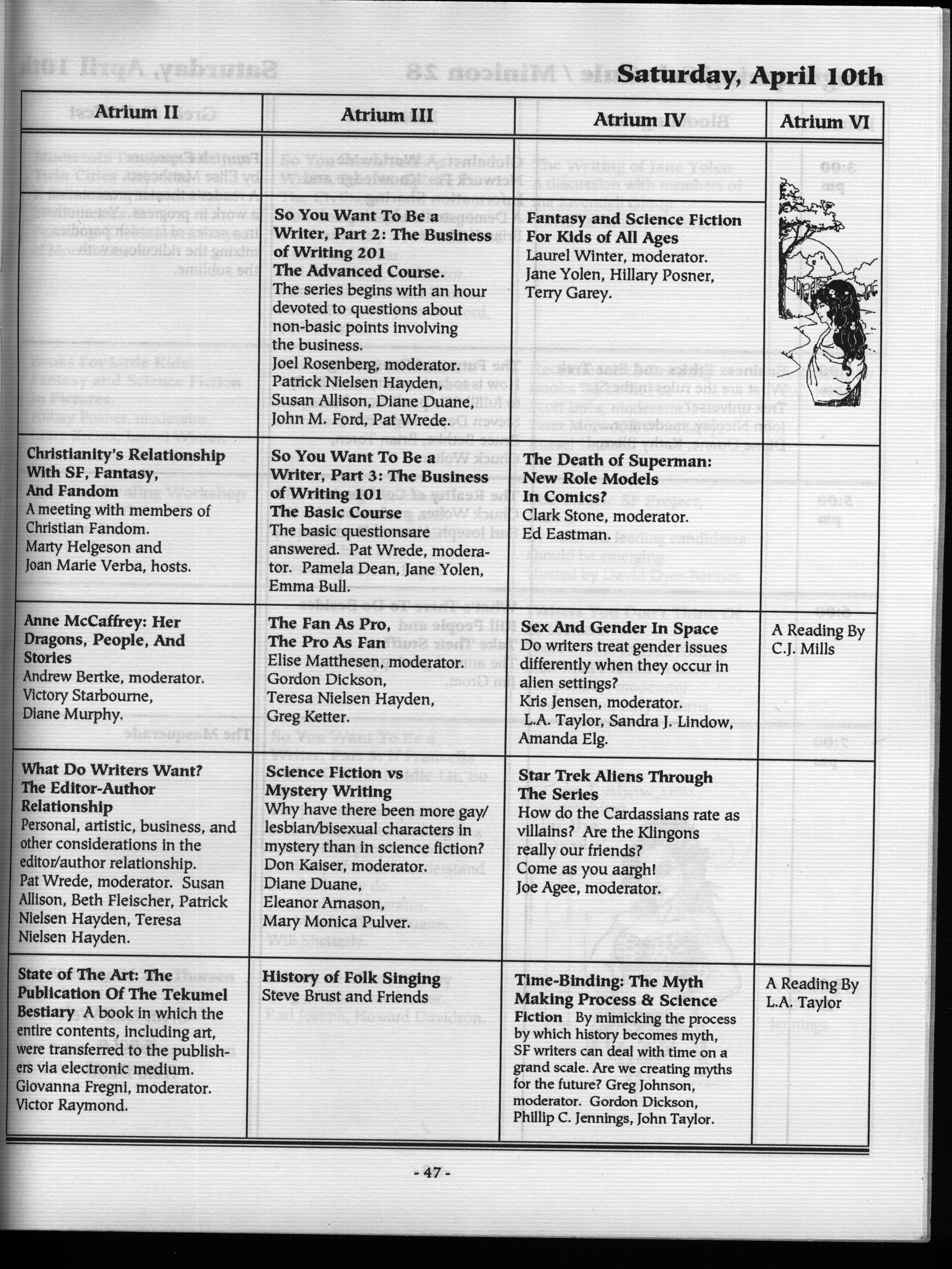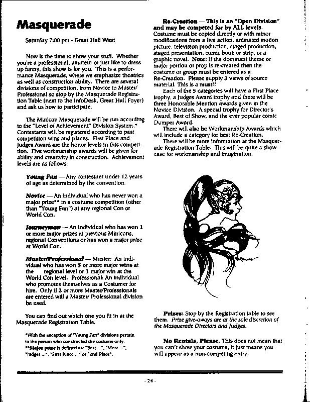 Art by Mary Hanson-Roberts, Cathy Buburuz, Chris Schneider, John Gabarron, Denise Boie, and Peggy Ranson is assumed to ok to reproduce here. The program book has an ambiguous copyright statement and we don't know how to contact them, or have received no reply to our inquries. Take it to be © each of them, all rights reserved.