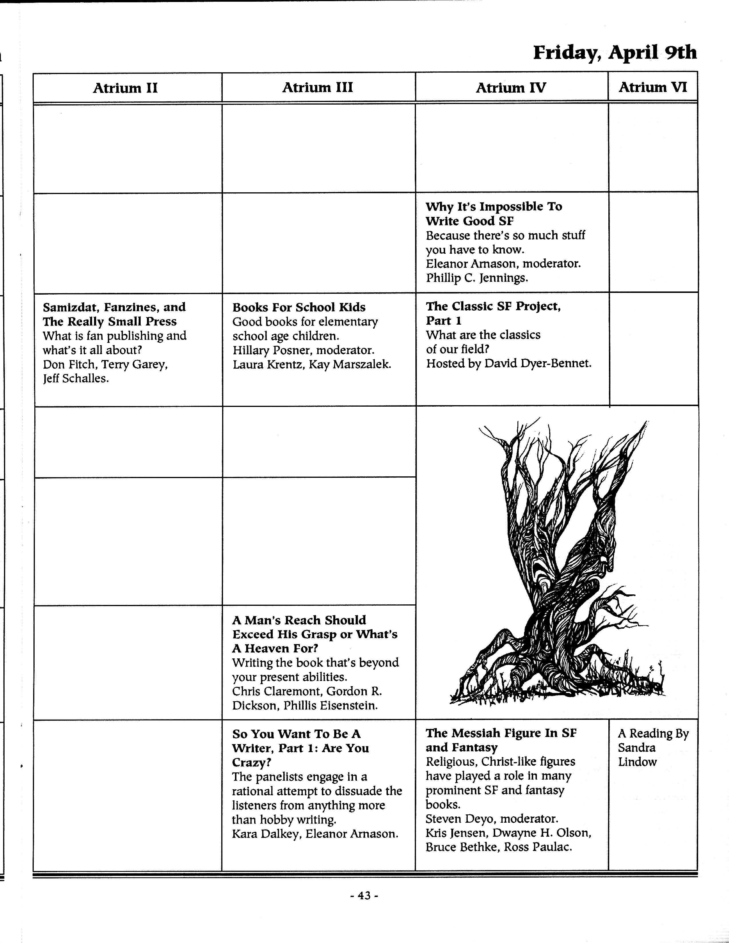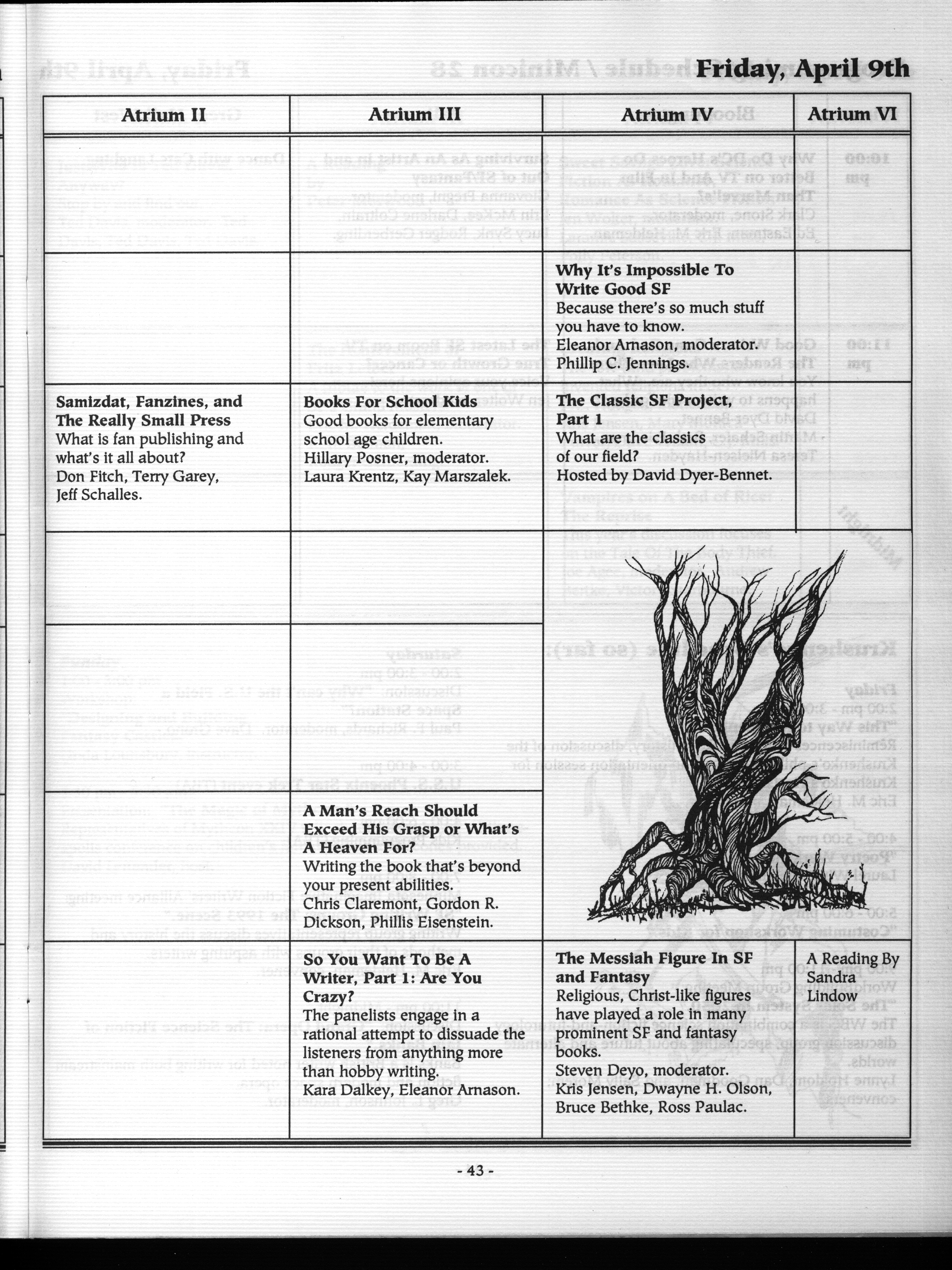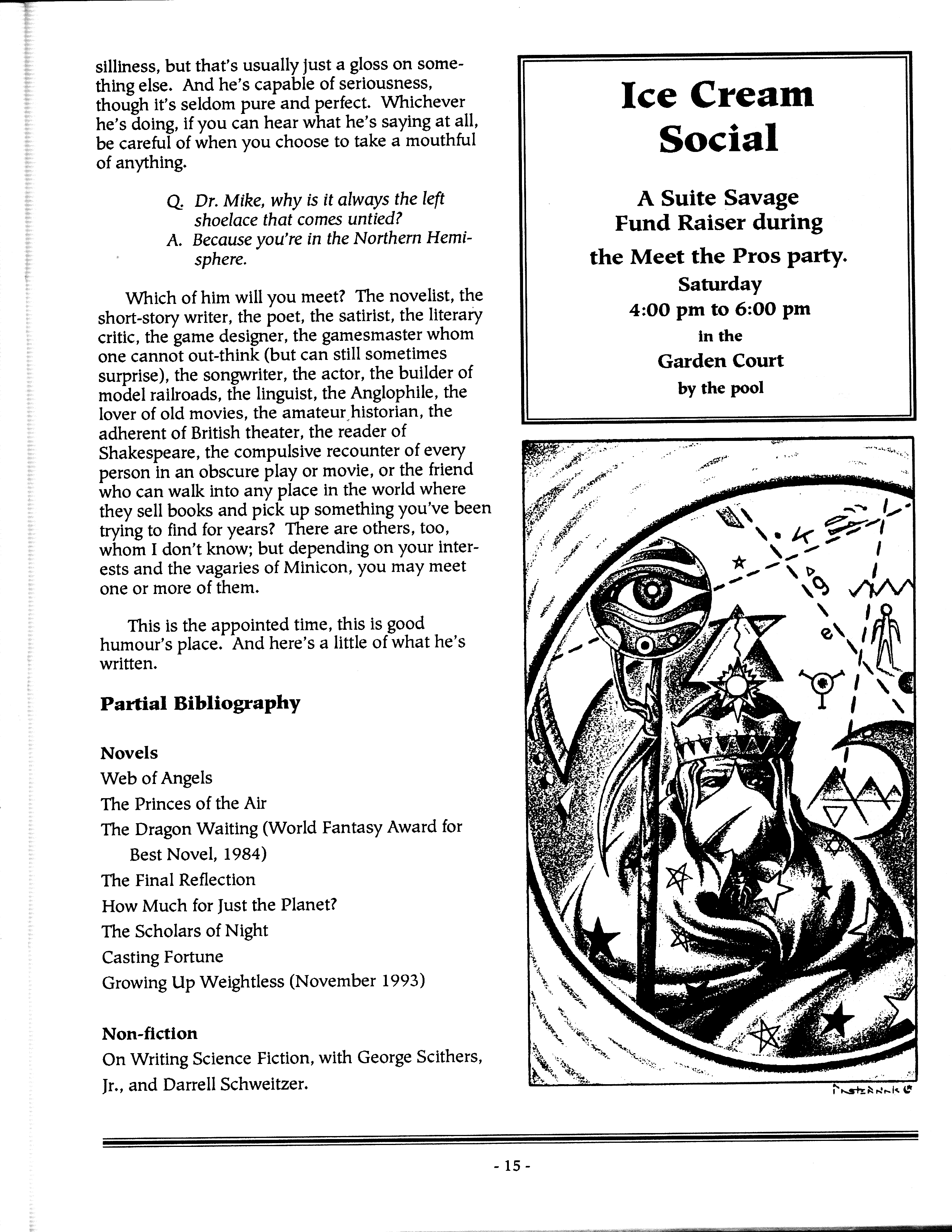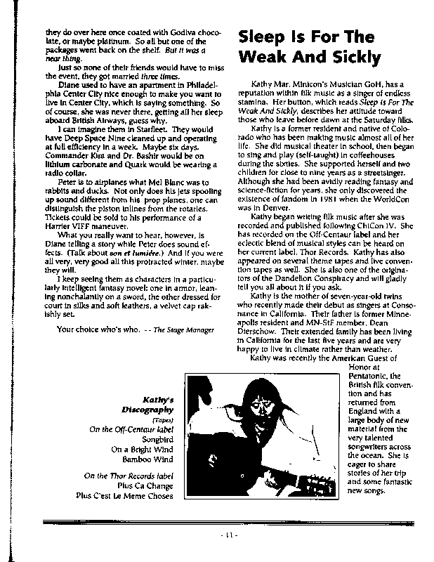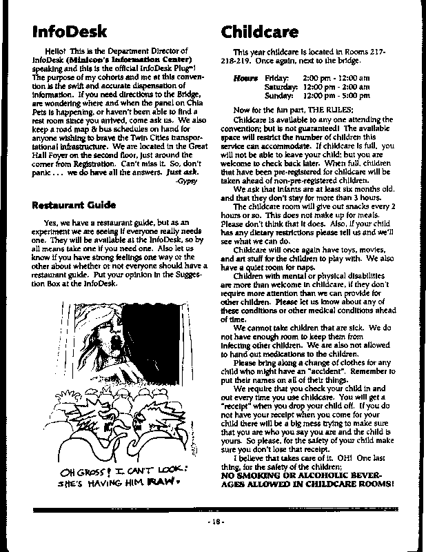 Art by Mary Hanson-Roberts, Cathy Buburuz, Chris Schneider, John Gabarron, Denise Boie, and Peggy Ranson is assumed to ok to reproduce here. The program book has an ambiguous copyright statement and we don't know how to contact them, or have received no reply to our inquries. Take it to be © each of them, all rights reserved.