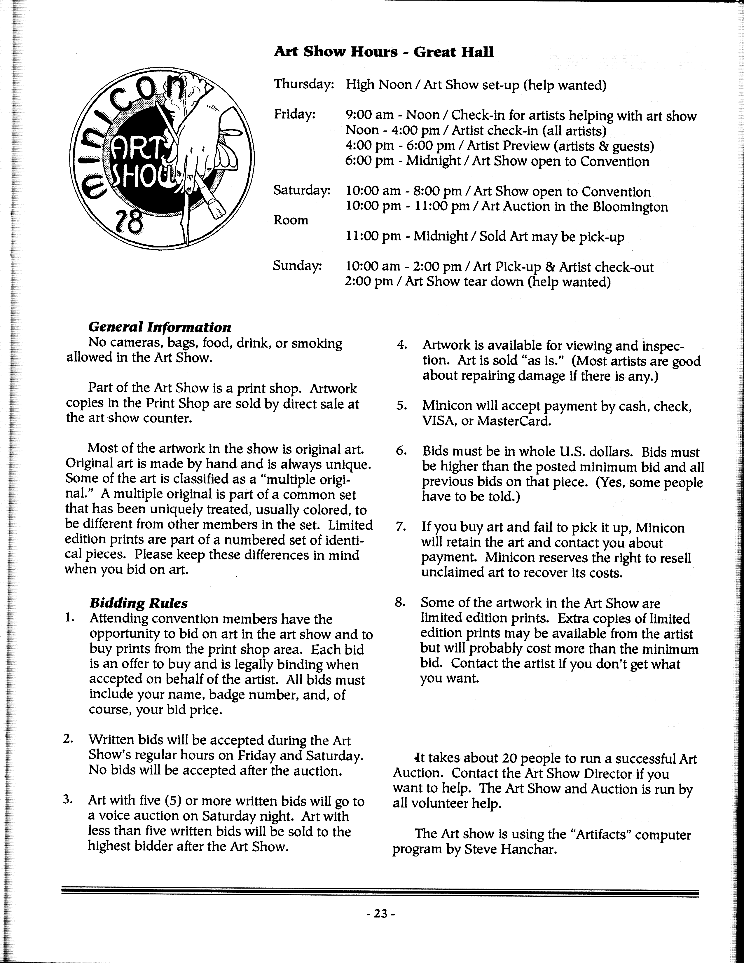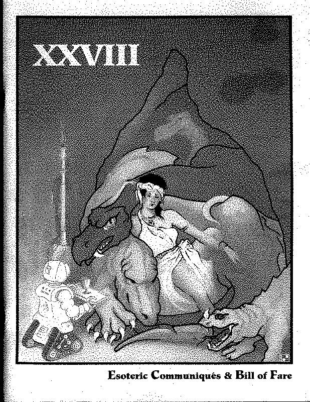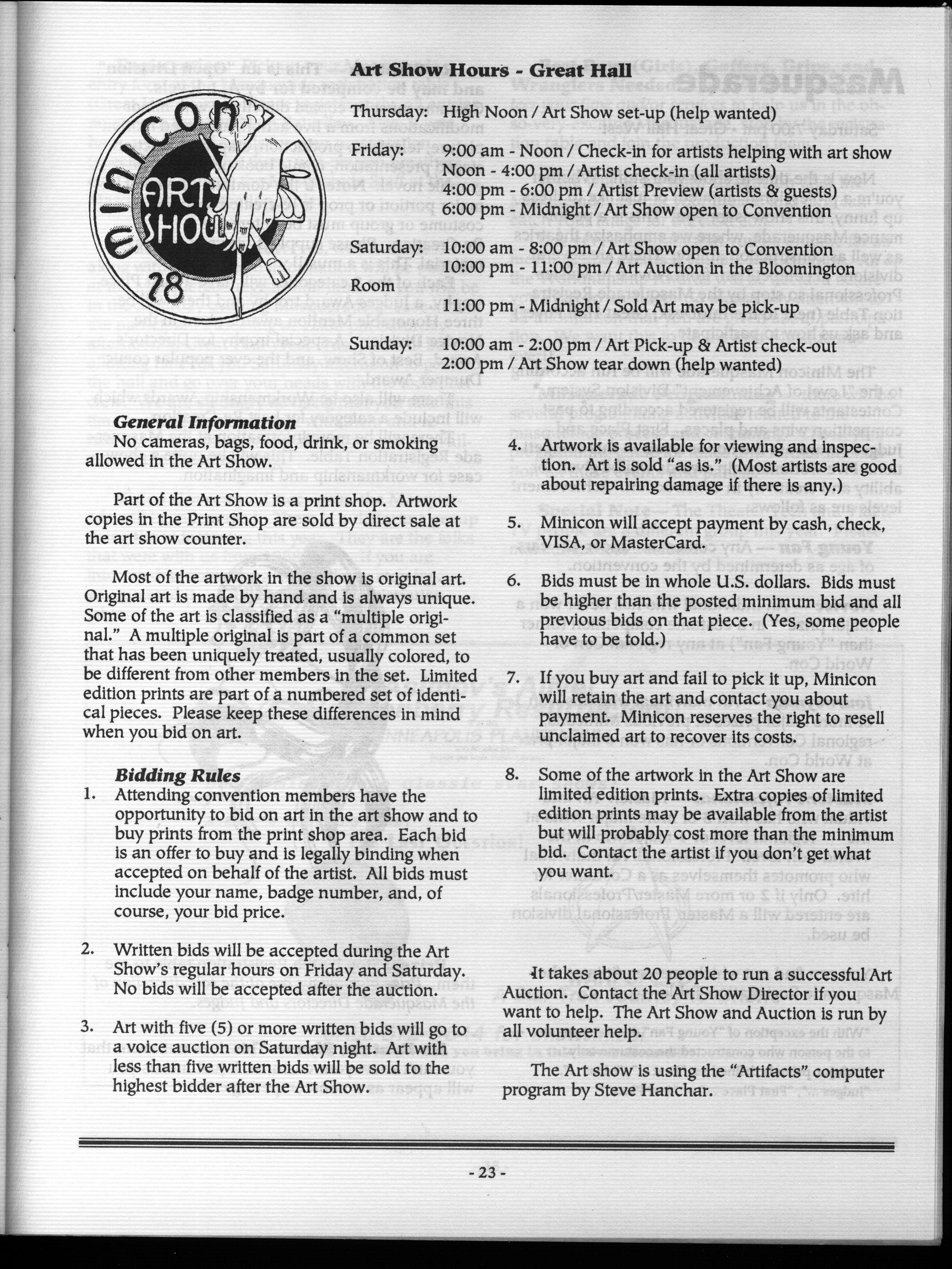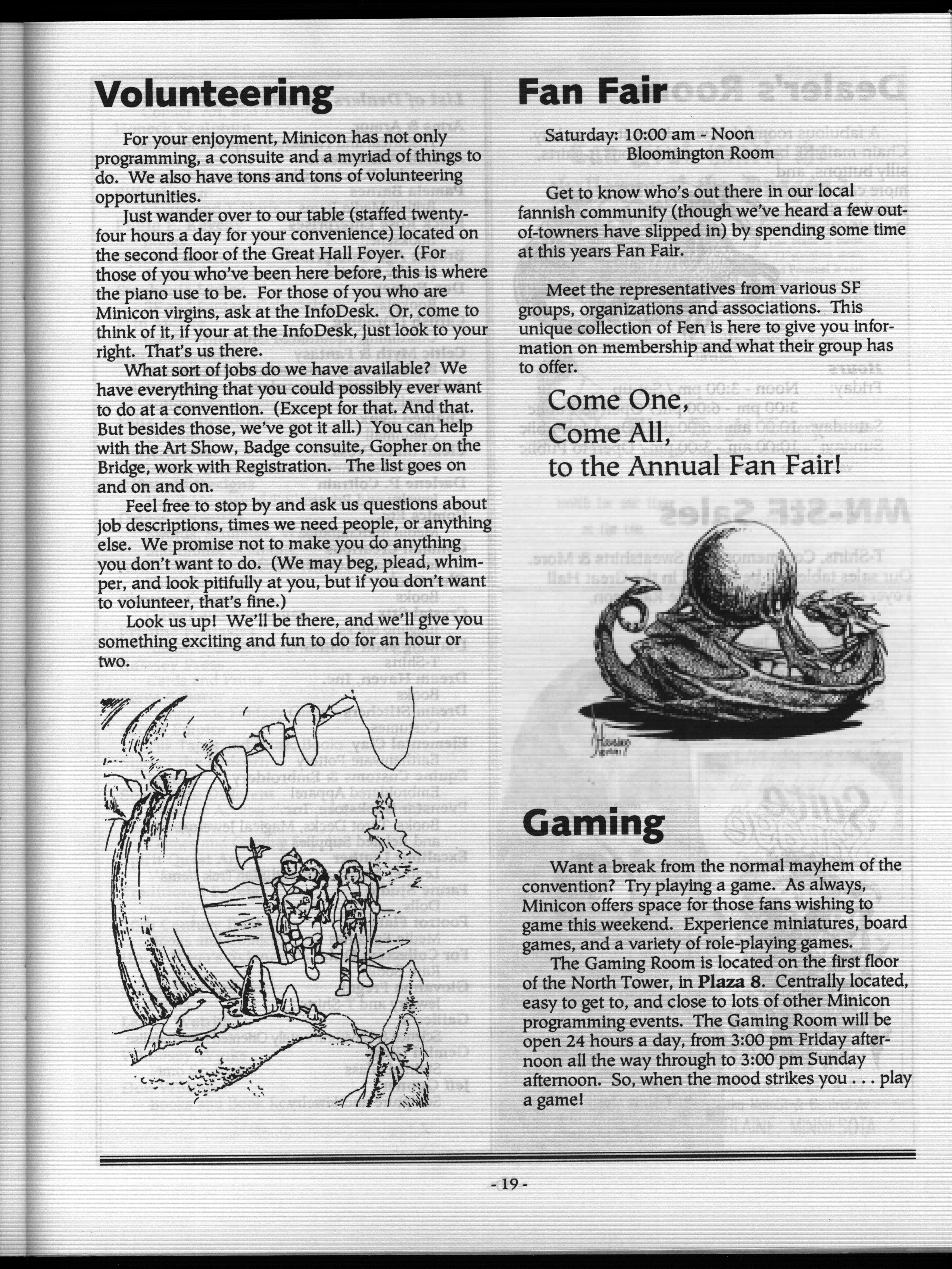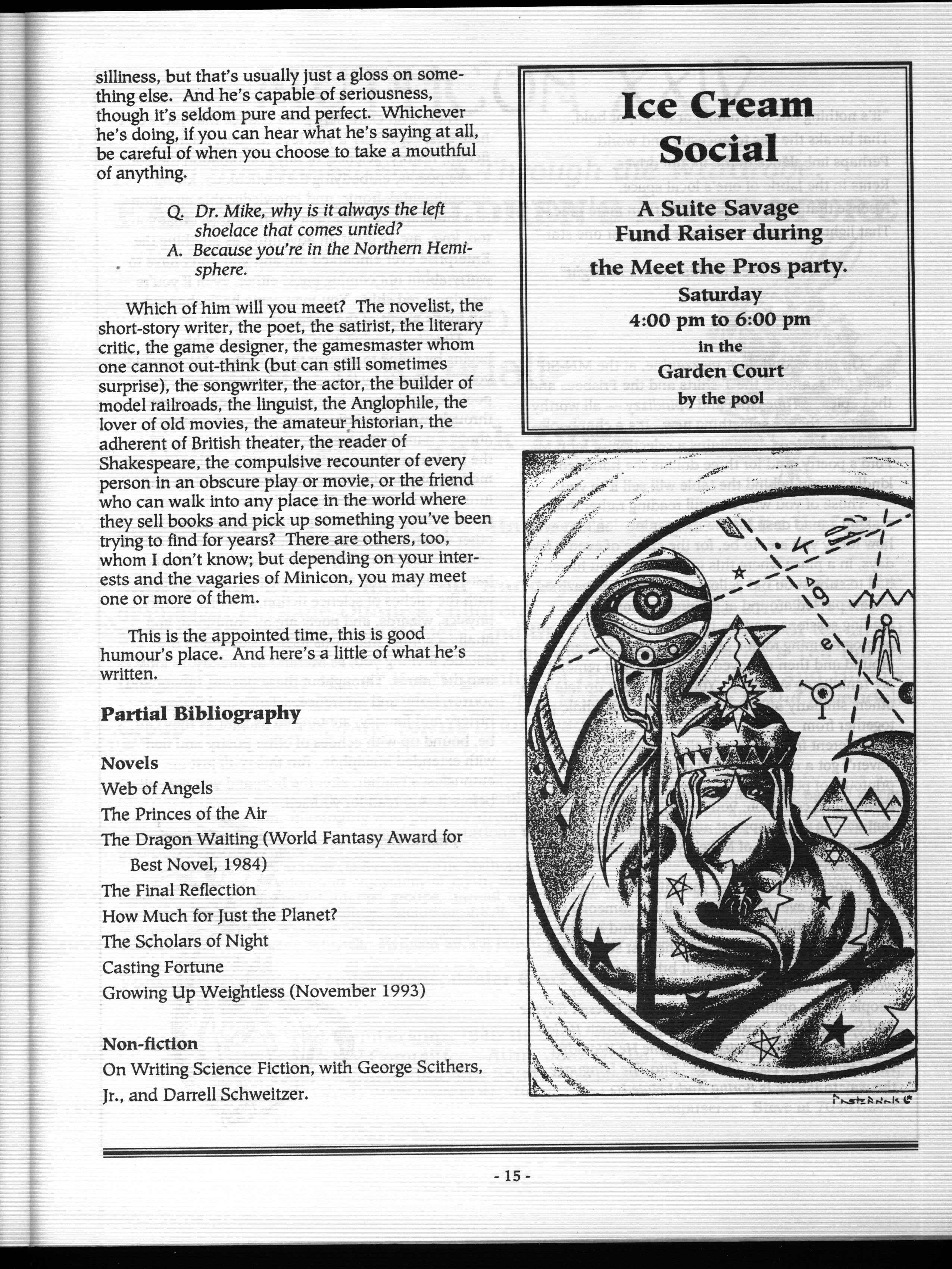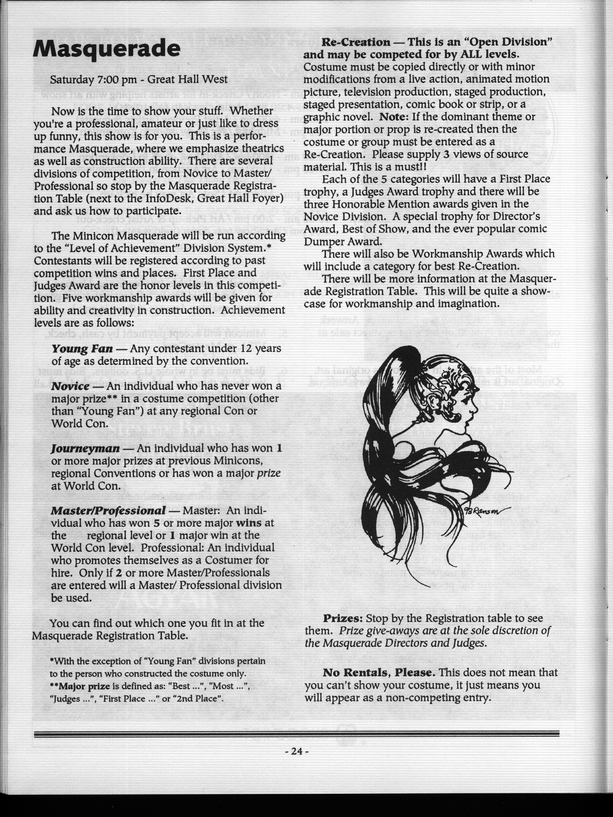 Art by Mary Hanson-Roberts, Cathy Buburuz, Chris Schneider, John Gabarron, Denise Boie, and Peggy Ranson is assumed to ok to reproduce here. The program book has an ambiguous copyright statement and we don't know how to contact them, or have received no reply to our inquries. Take it to be © each of them, all rights reserved.