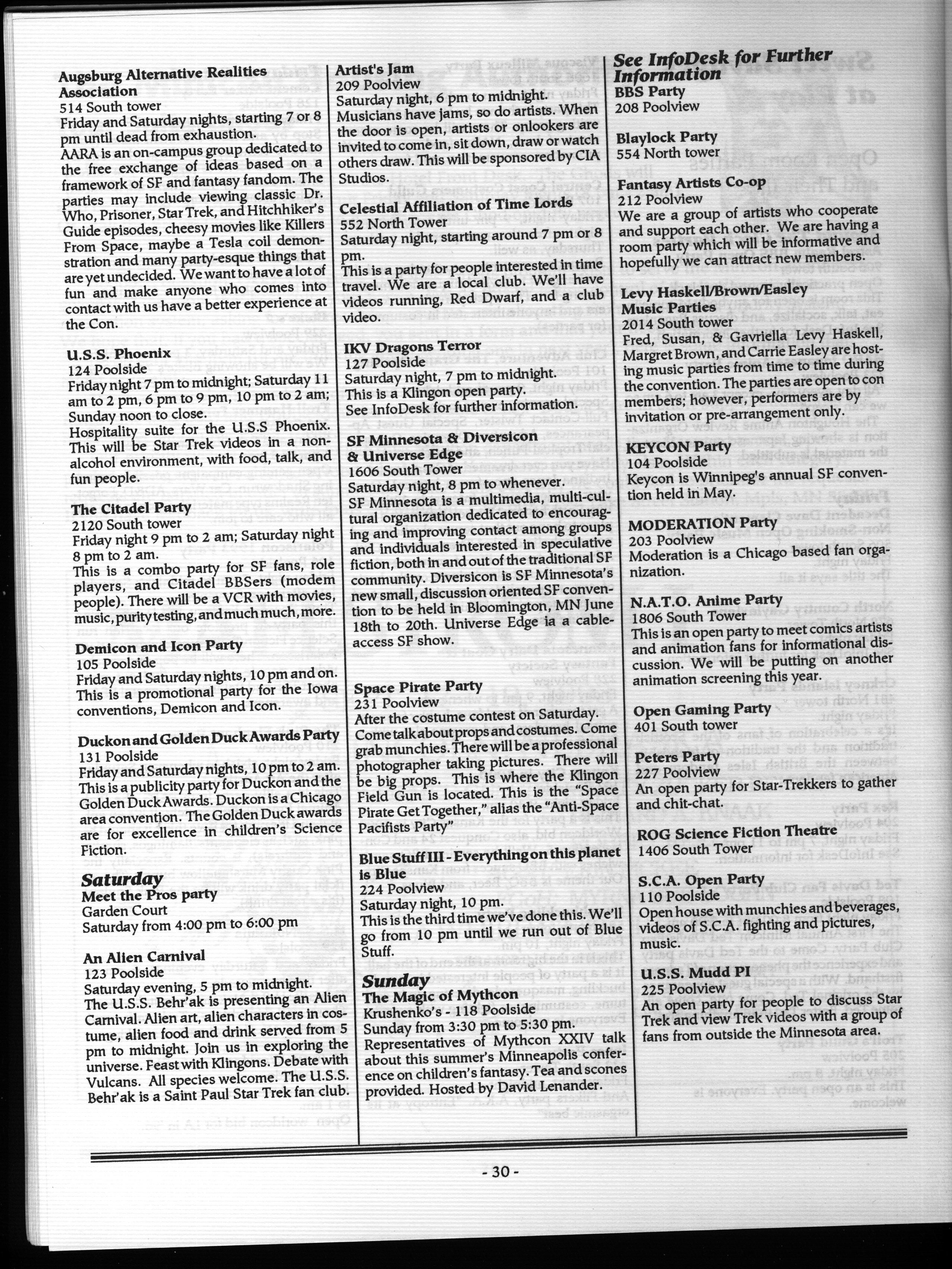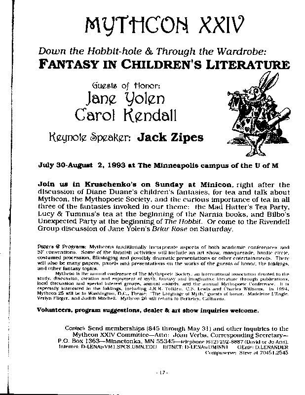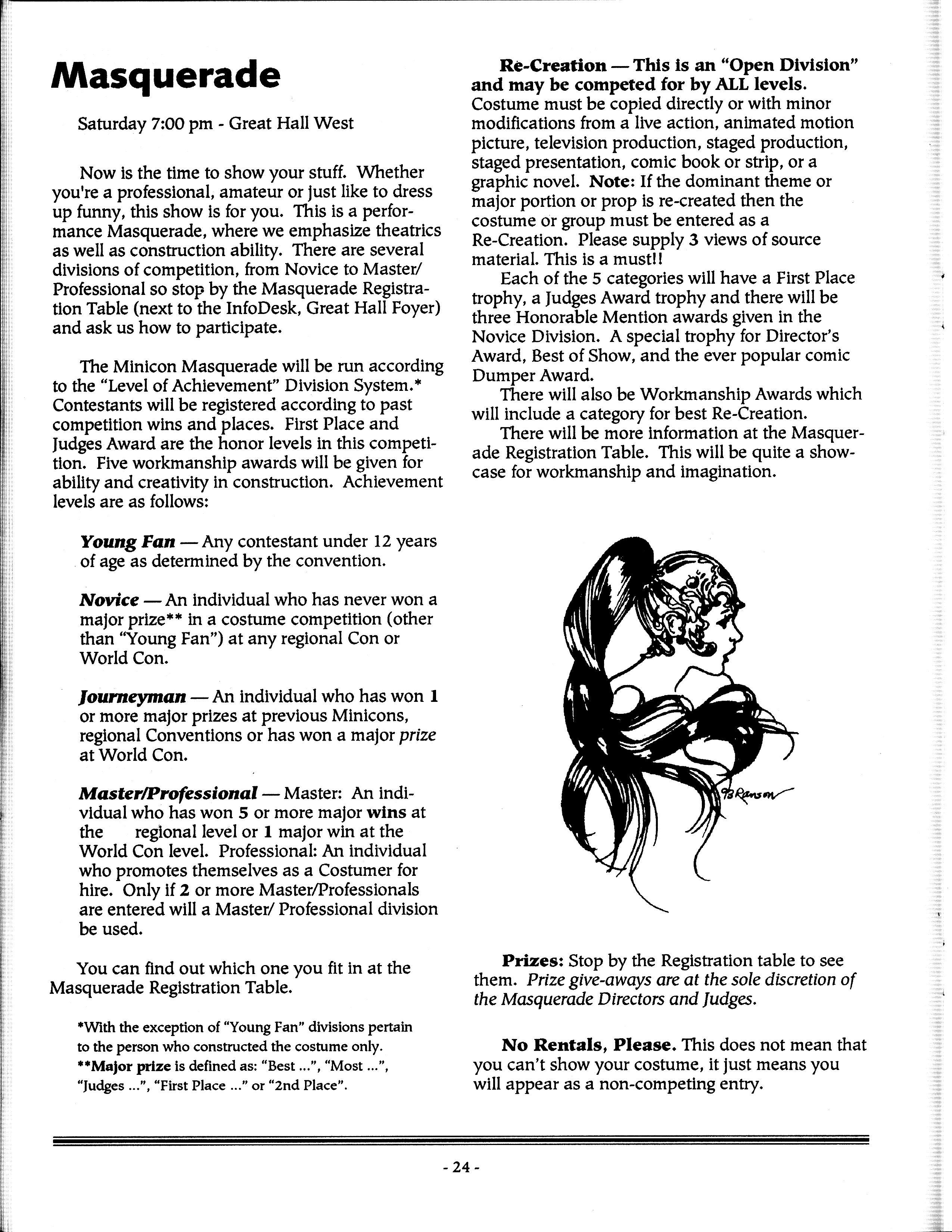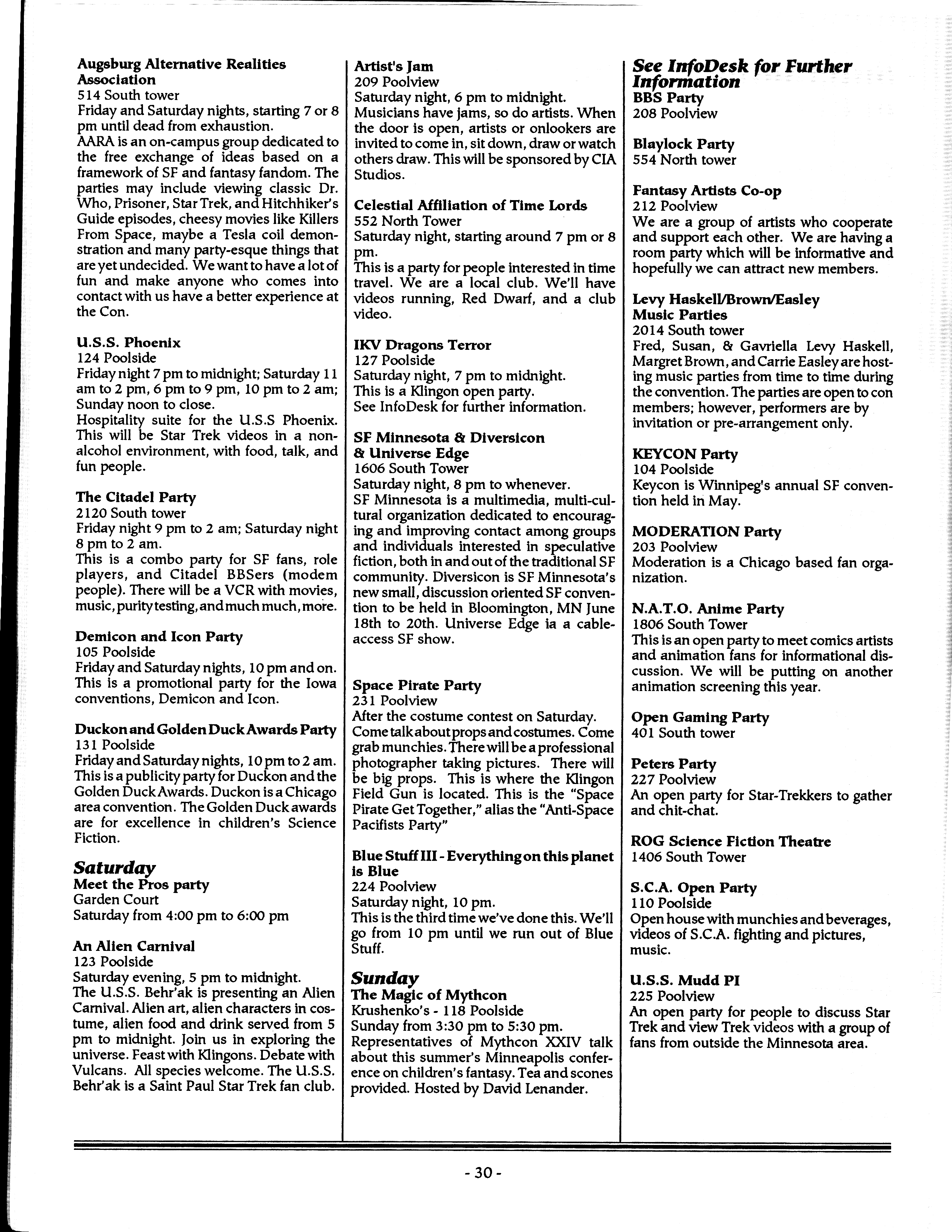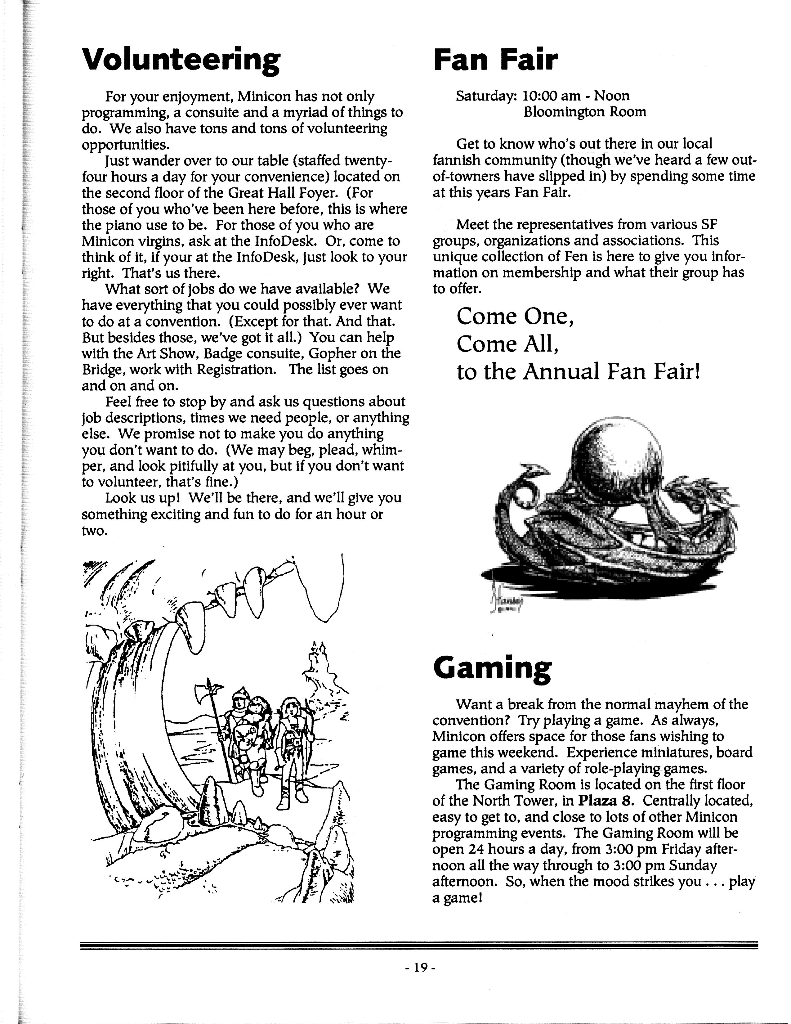 Art by Mary Hanson-Roberts, Cathy Buburuz, Chris Schneider, John Gabarron, Denise Boie, and Peggy Ranson is assumed to ok to reproduce here. The program book has an ambiguous copyright statement and we don't know how to contact them, or have received no reply to our inquries. Take it to be © each of them, all rights reserved.