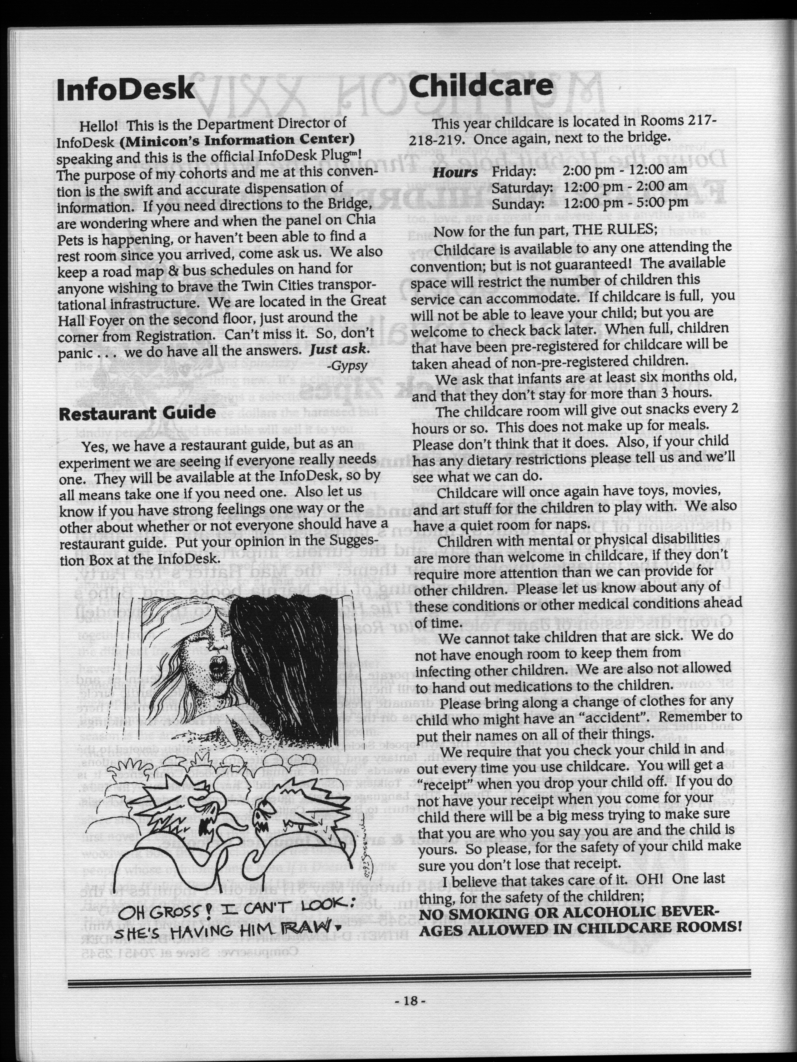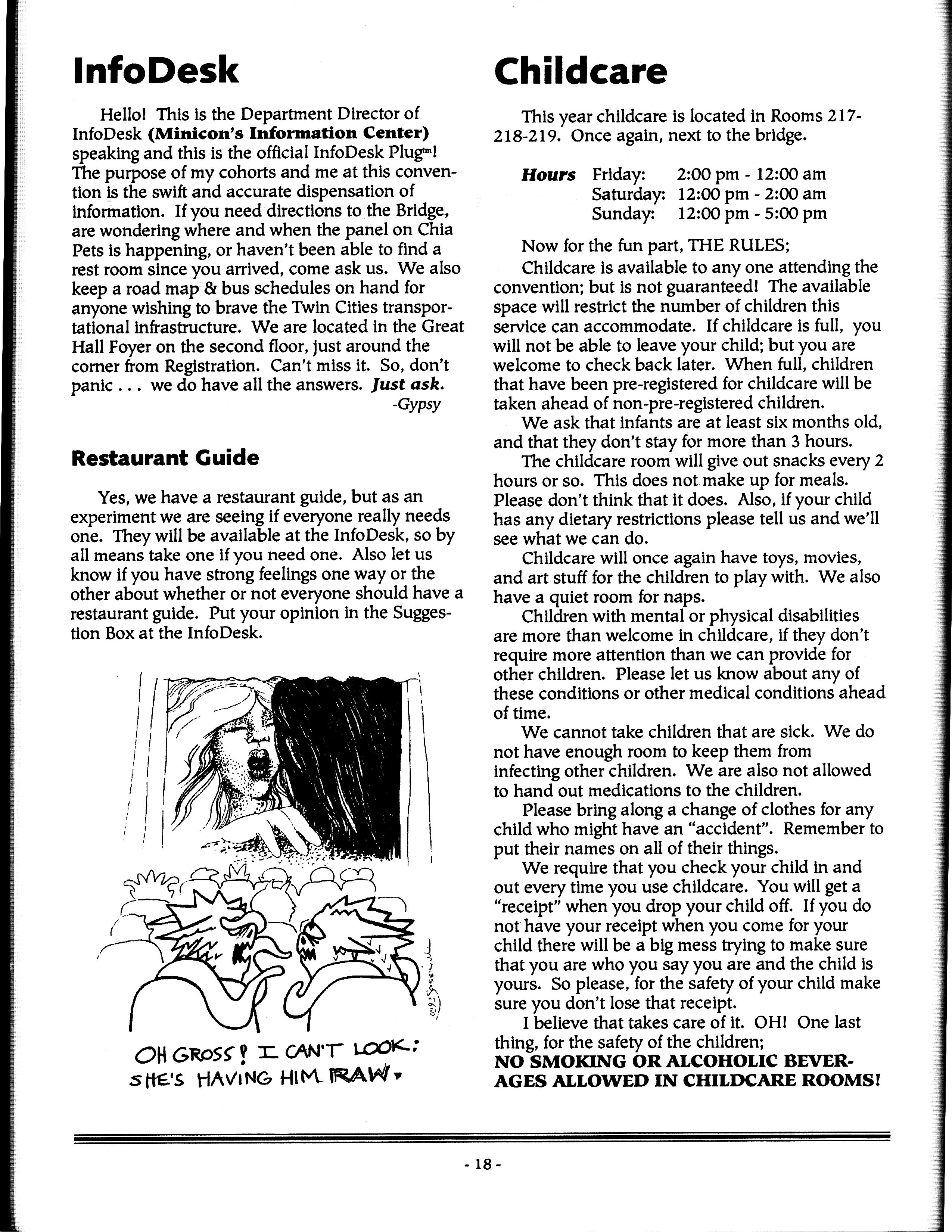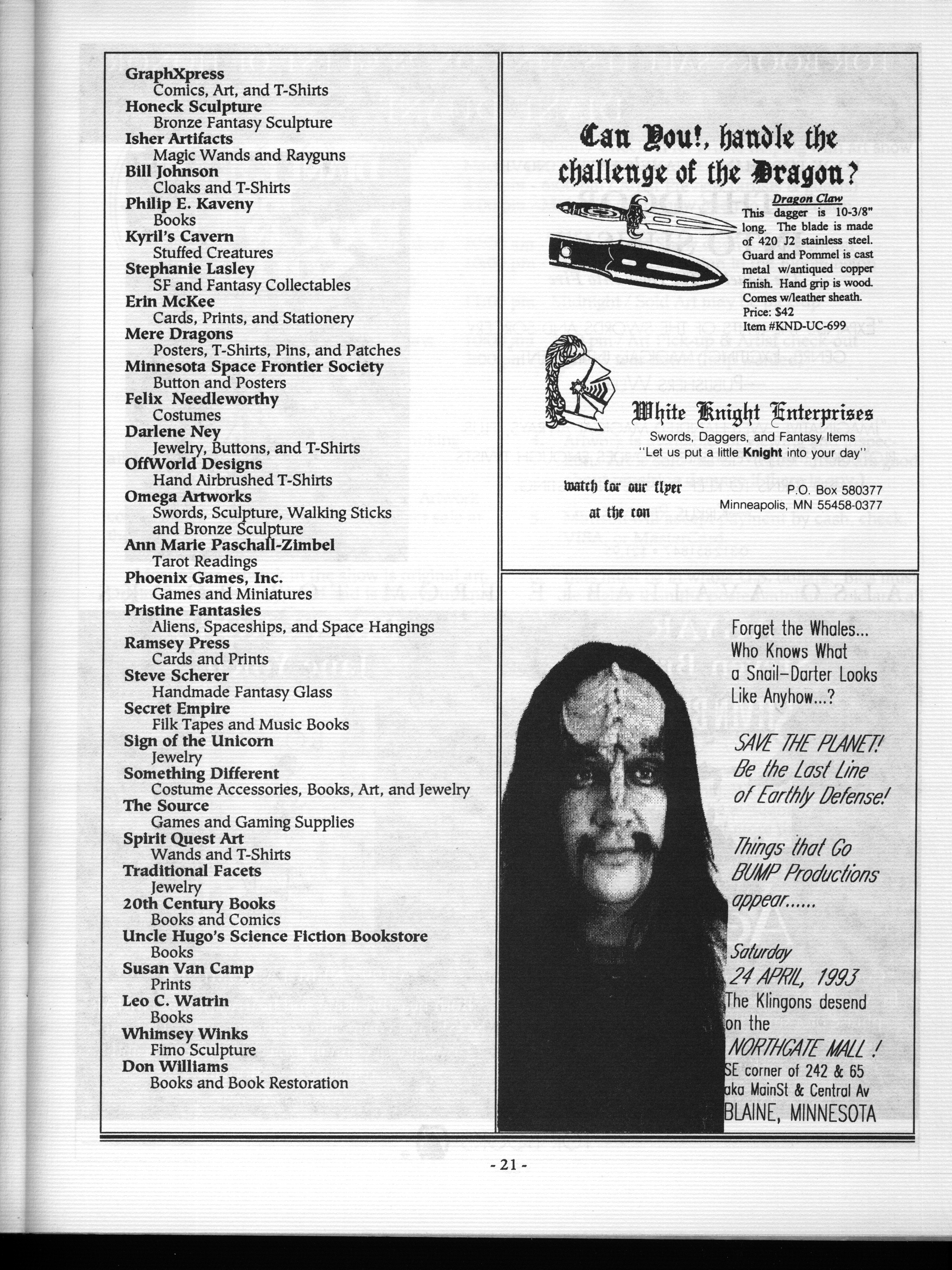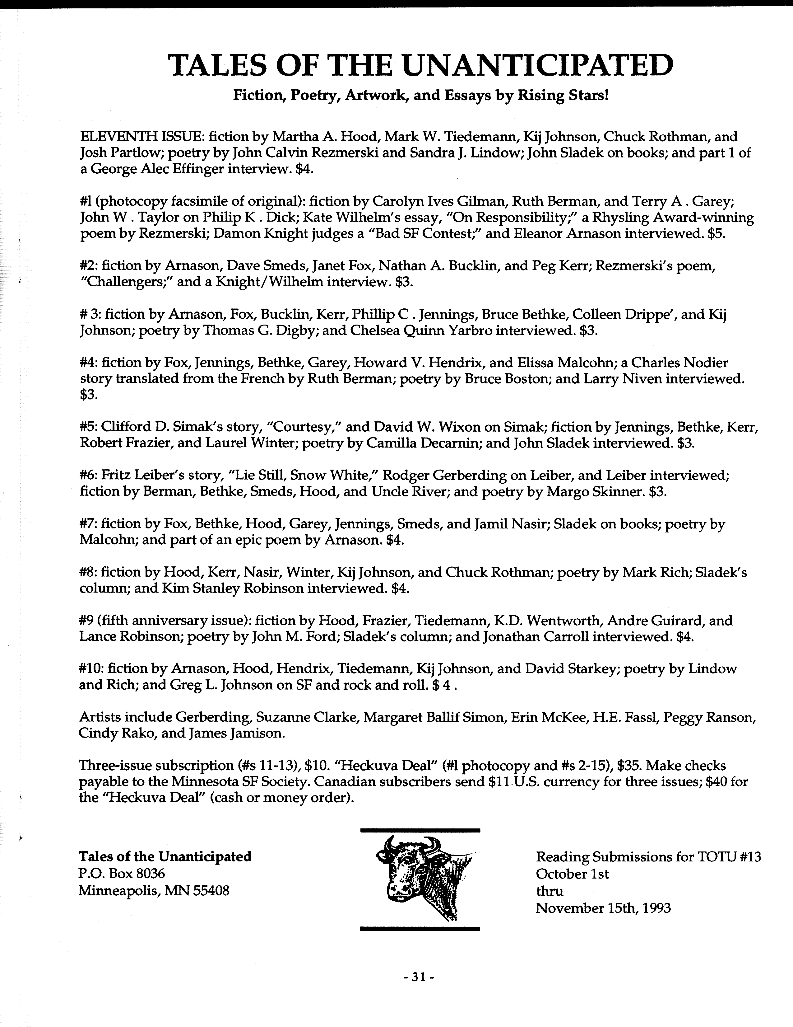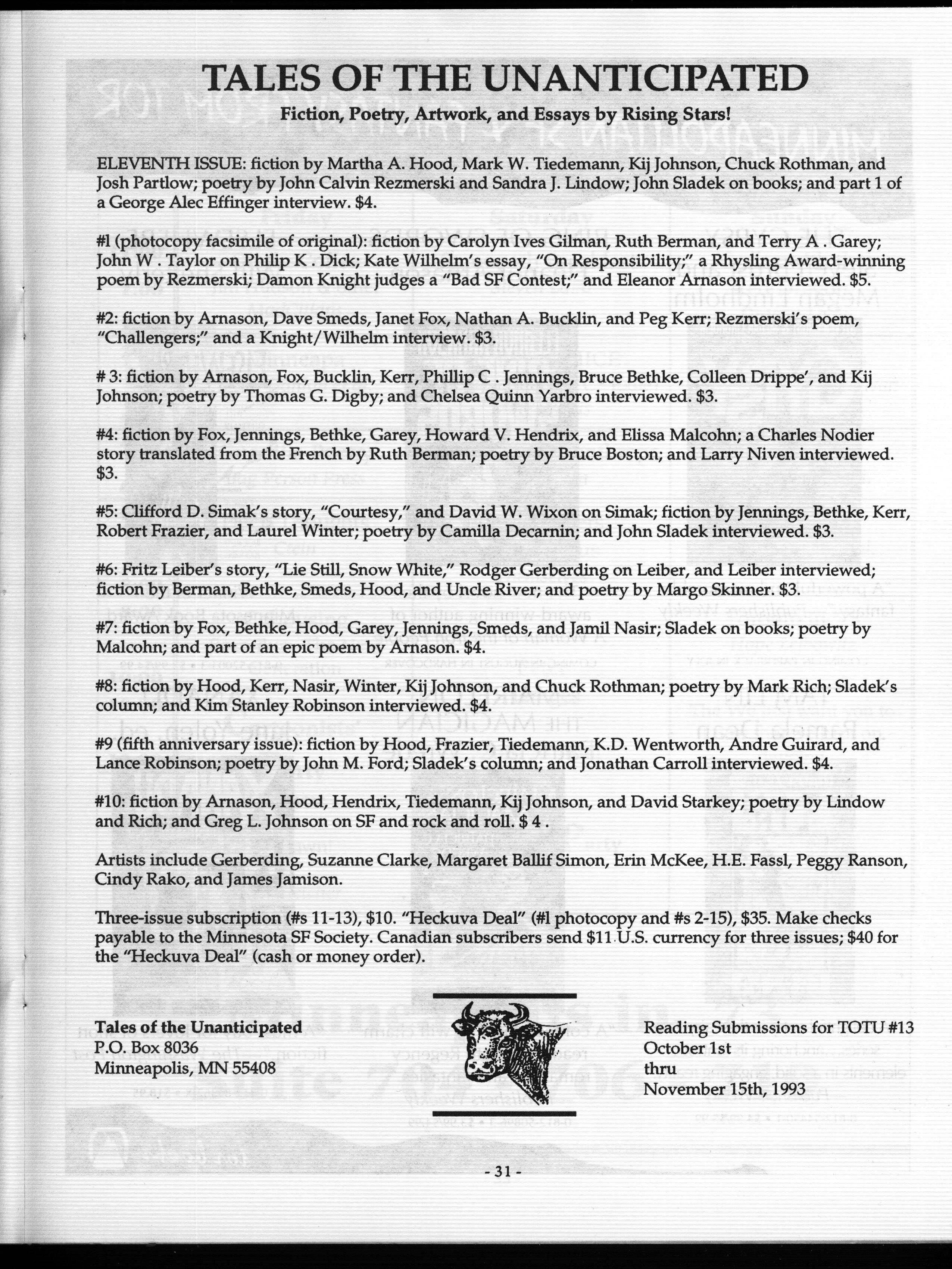 Art by Mary Hanson-Roberts, Cathy Buburuz, Chris Schneider, John Gabarron, Denise Boie, and Peggy Ranson is assumed to ok to reproduce here. The program book has an ambiguous copyright statement and we don't know how to contact them, or have received no reply to our inquries. Take it to be © each of them, all rights reserved.