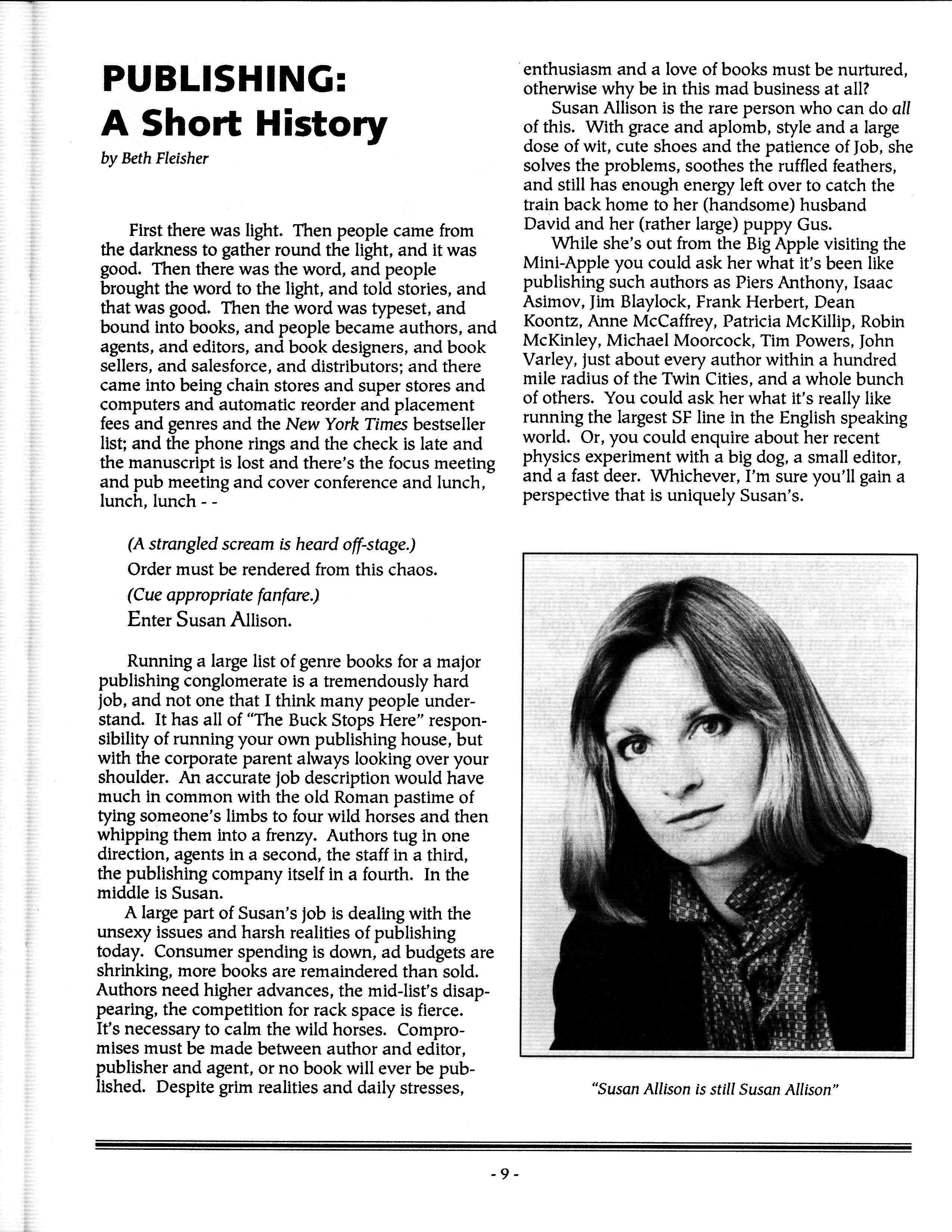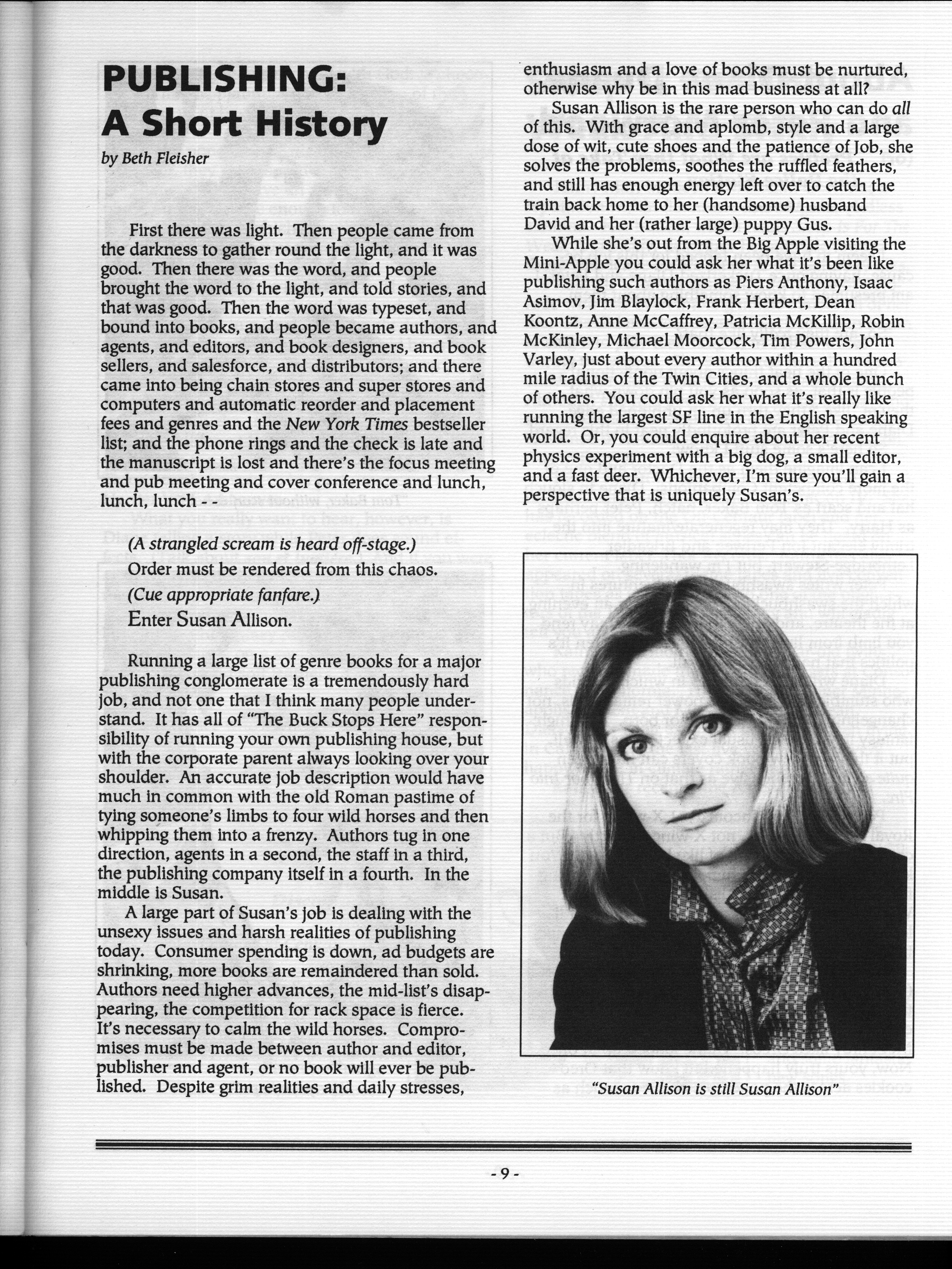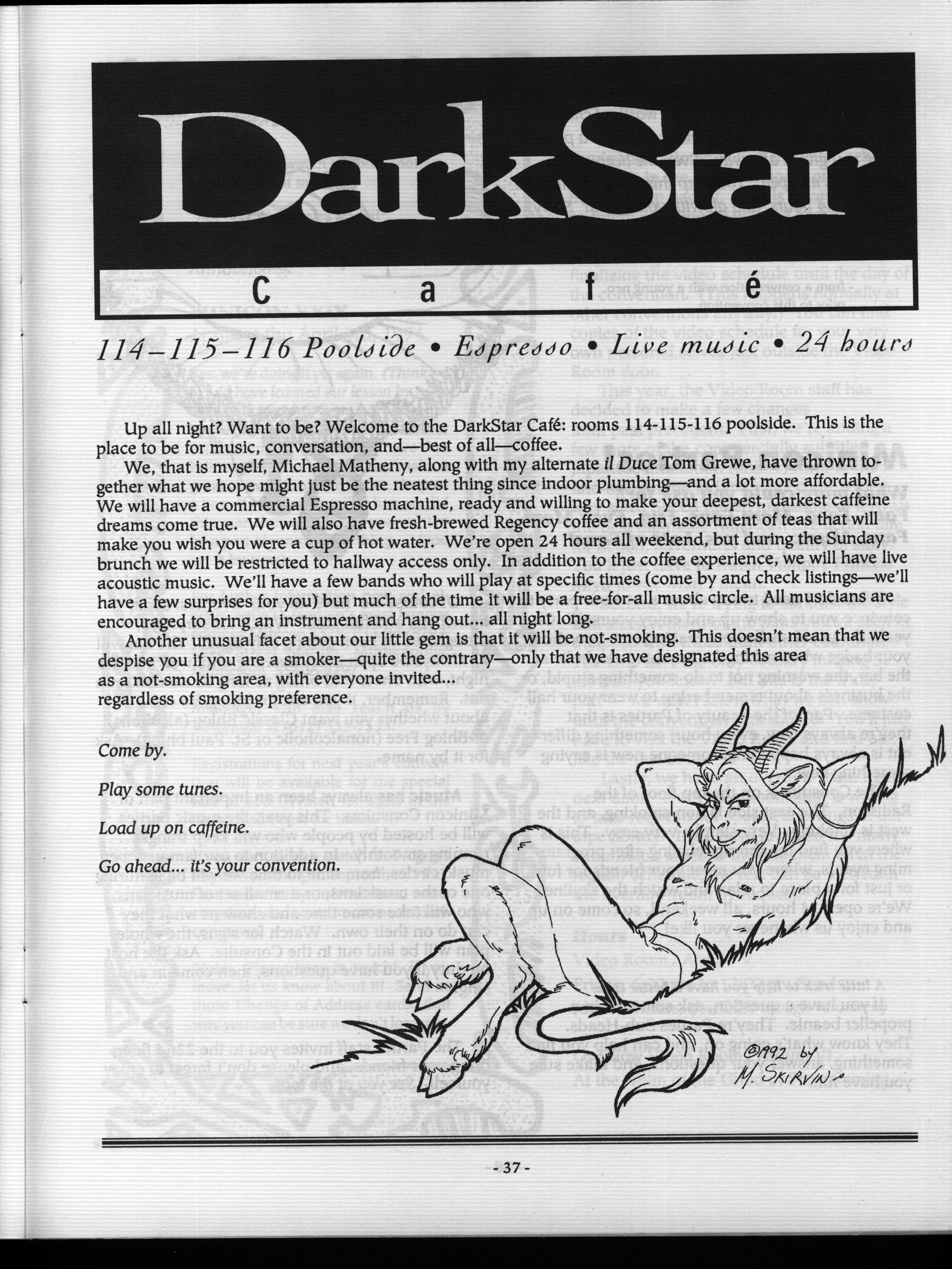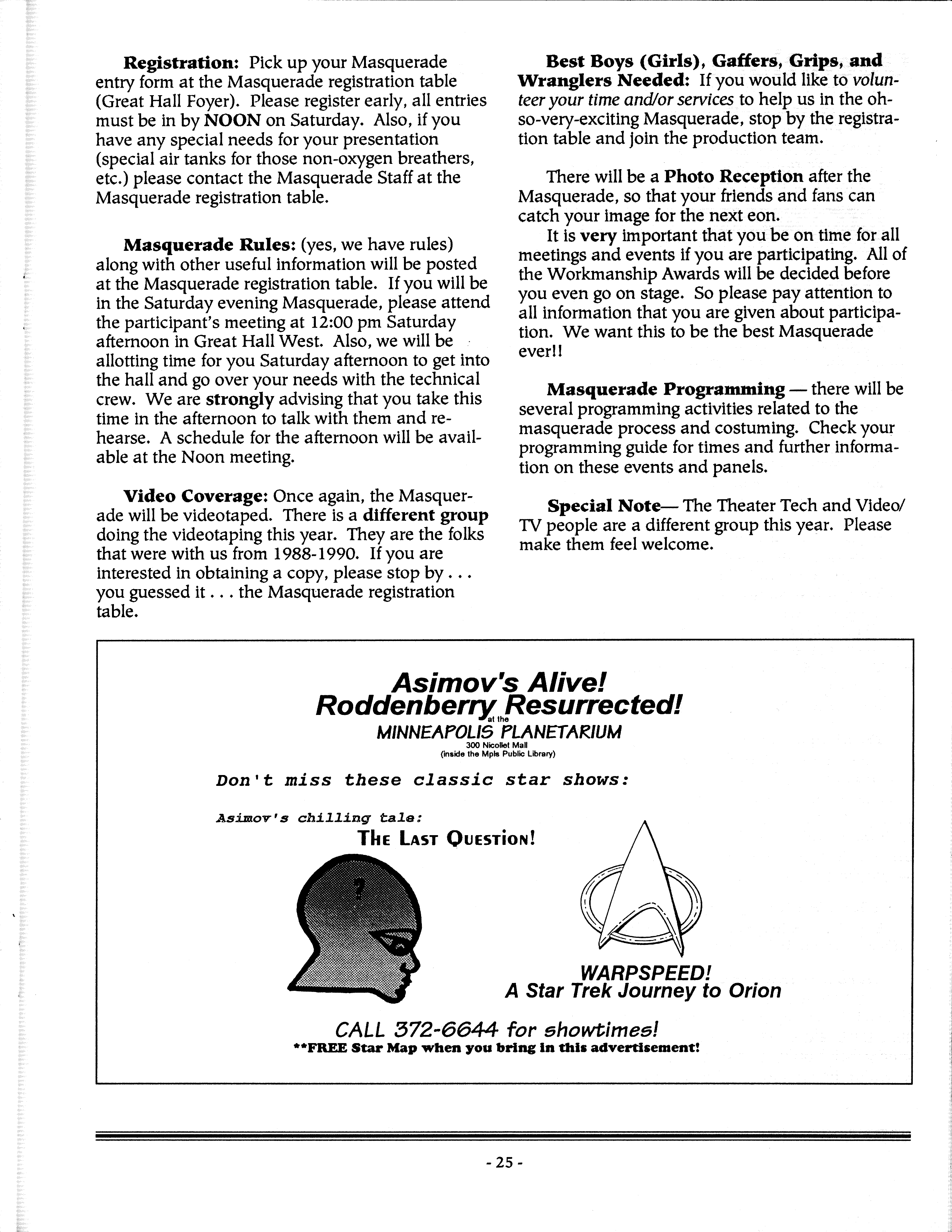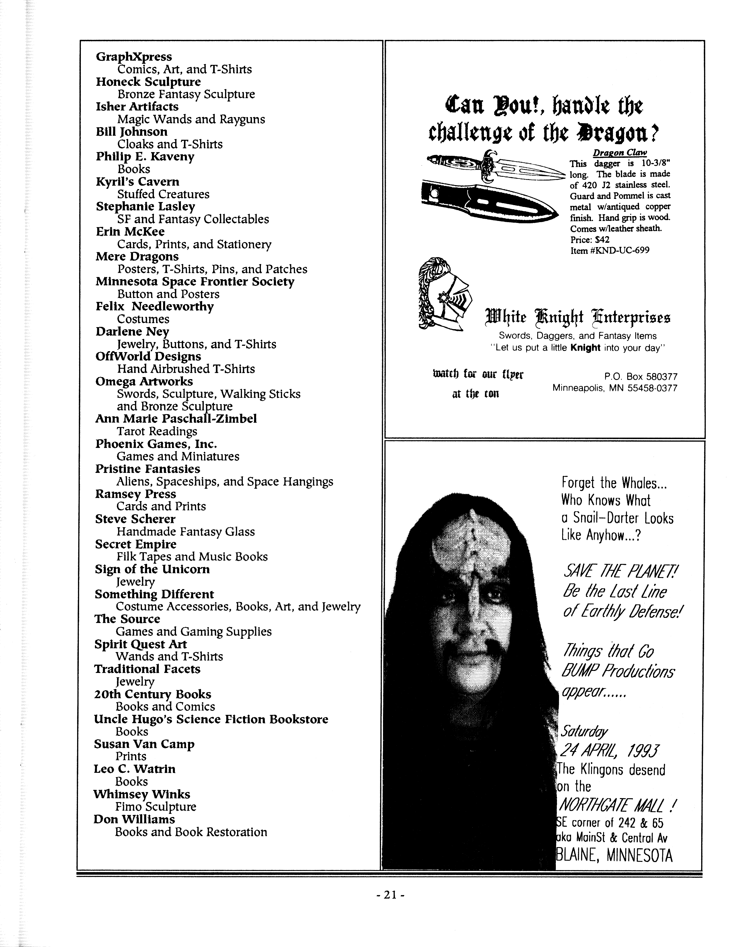 Art by Mary Hanson-Roberts, Cathy Buburuz, Chris Schneider, John Gabarron, Denise Boie, and Peggy Ranson is assumed to ok to reproduce here. The program book has an ambiguous copyright statement and we don't know how to contact them, or have received no reply to our inquries. Take it to be © each of them, all rights reserved.