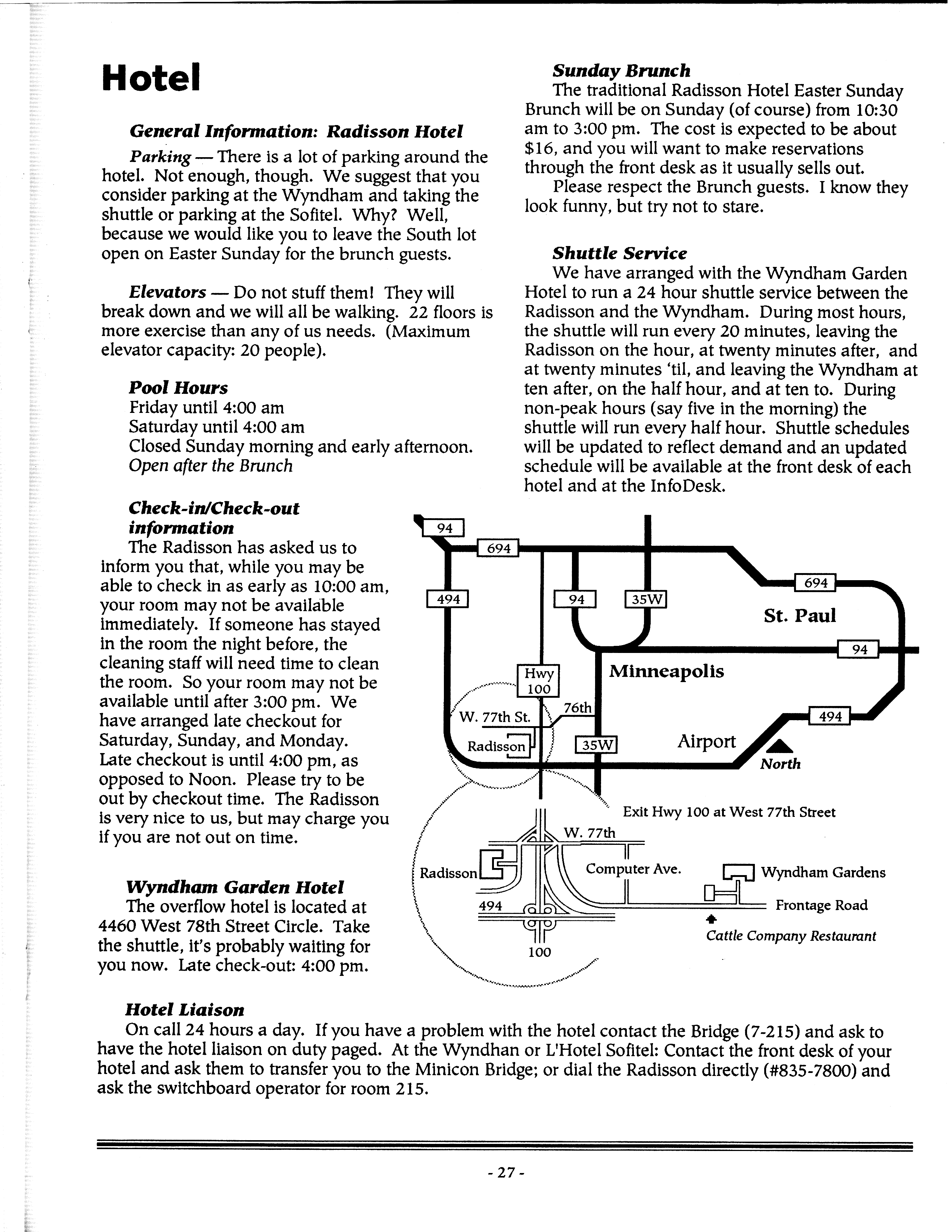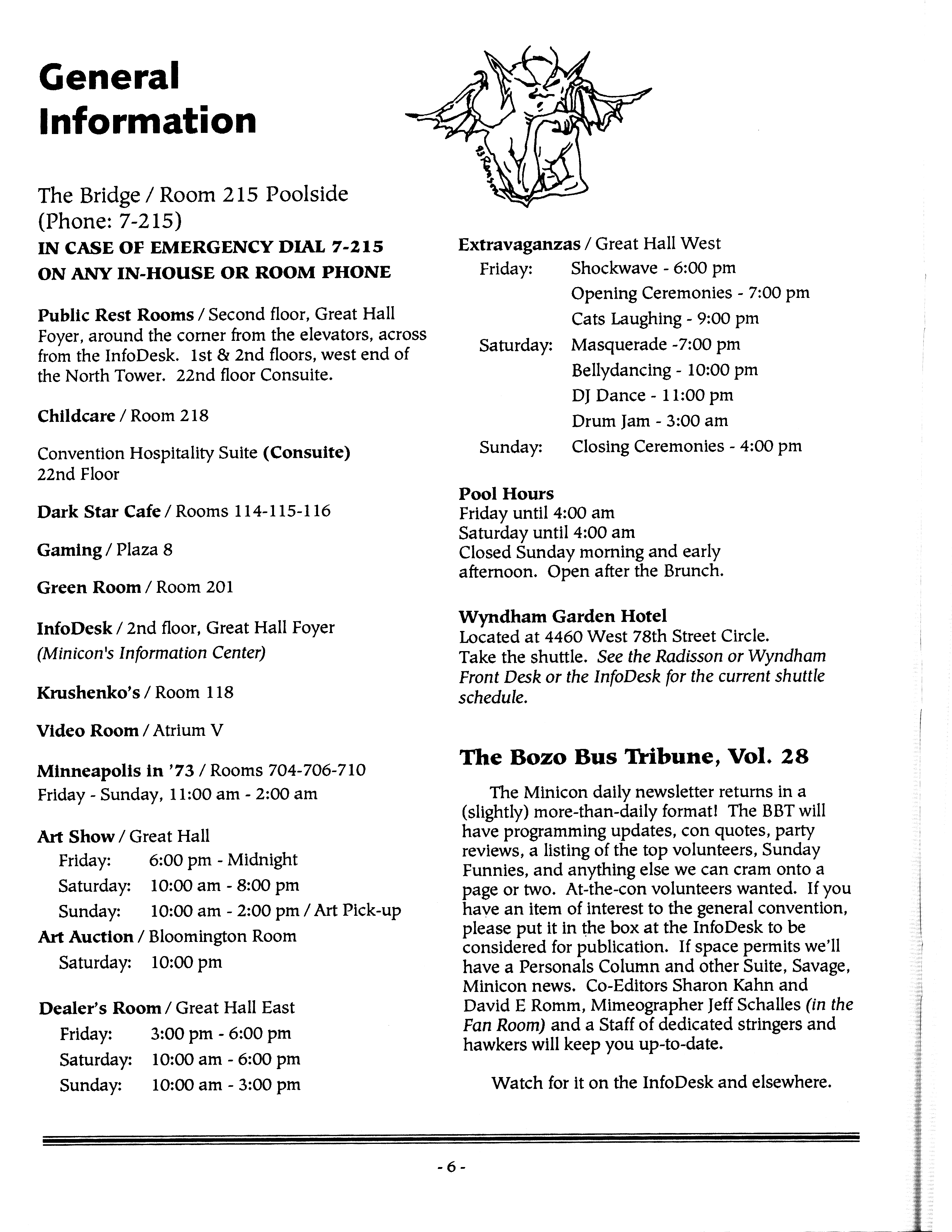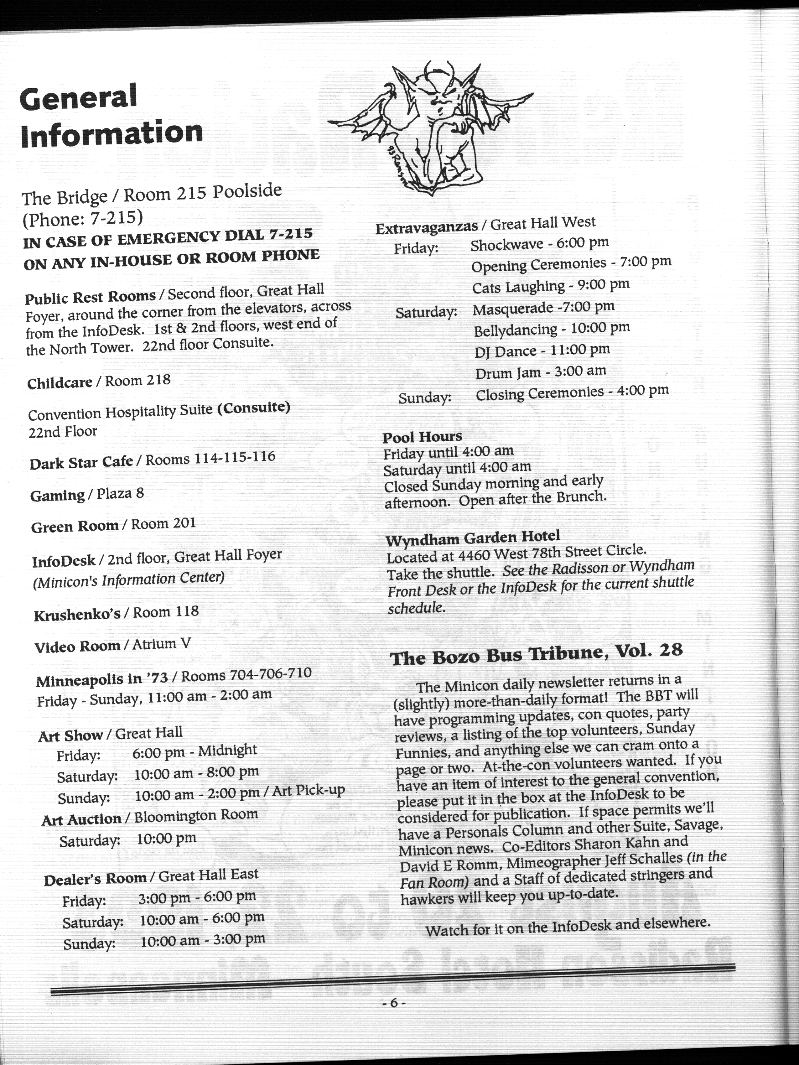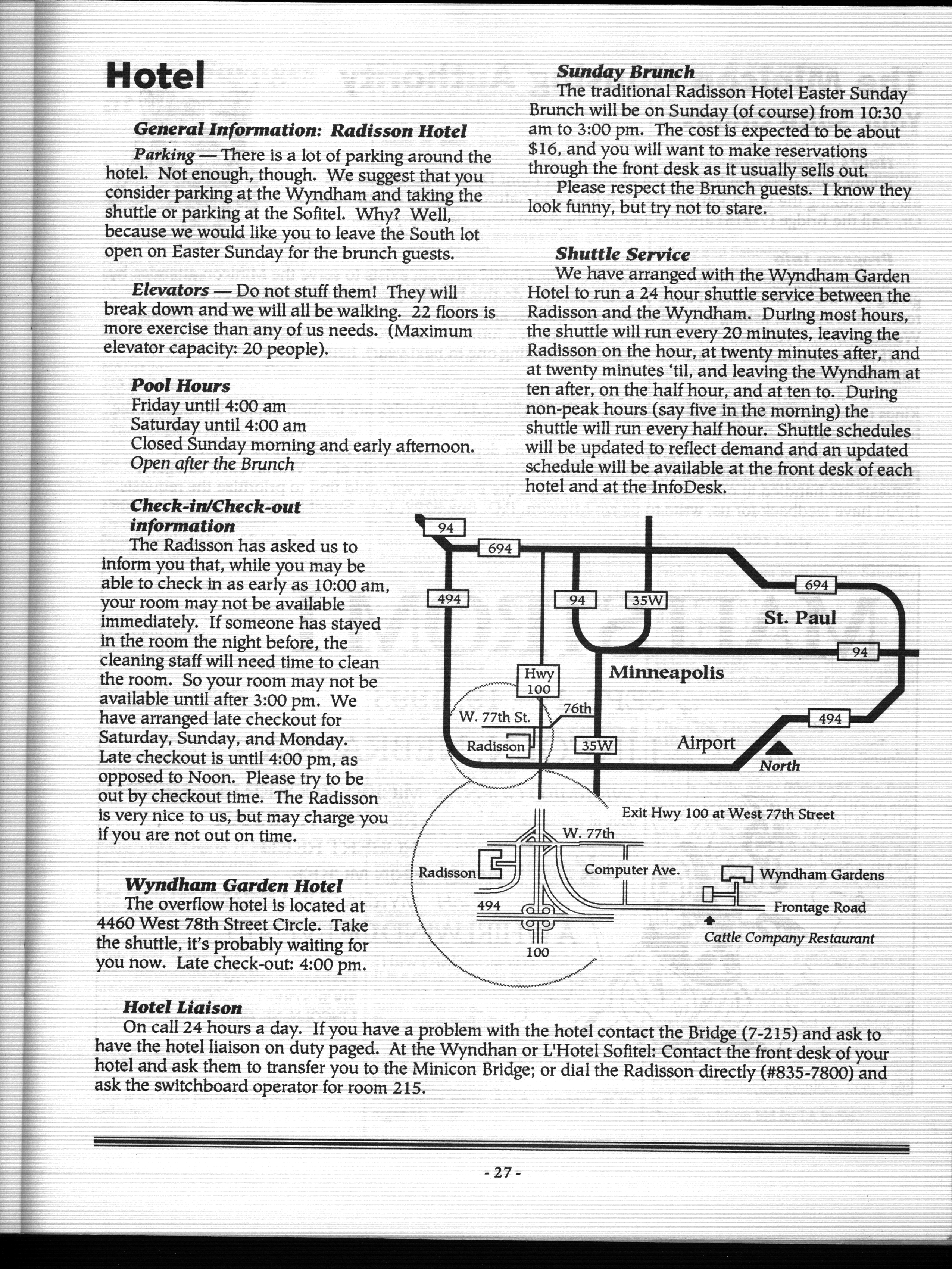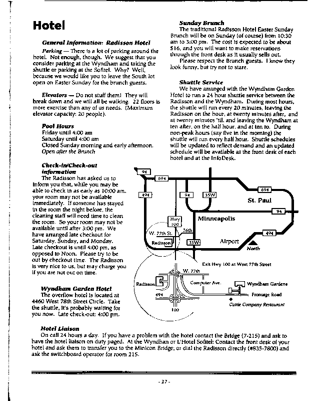 Minicon 28 was held primarily in the Radisson South. The Wyndham Garden Hotel was an overflow hotel. For unknown reasons, this was not listed on our big list of Minicons for many years, but this has now been corrected.