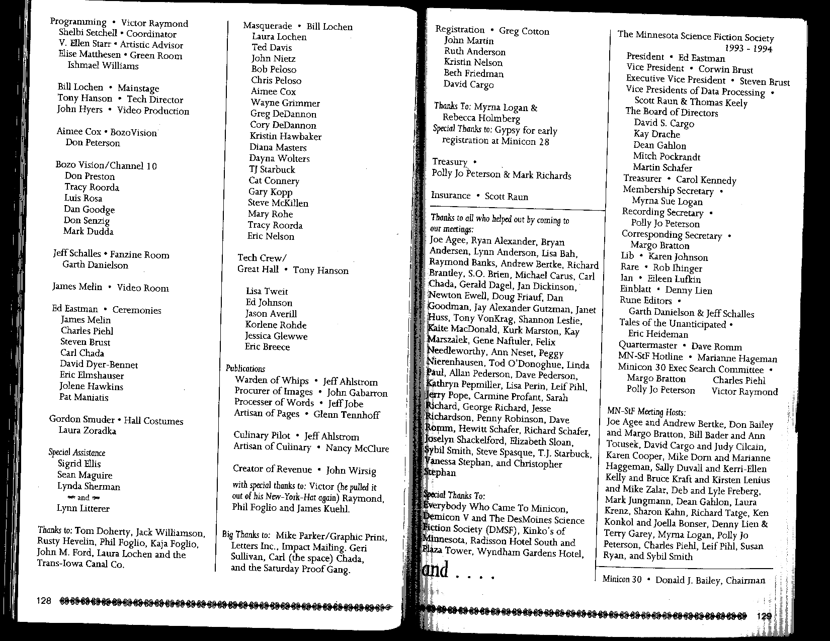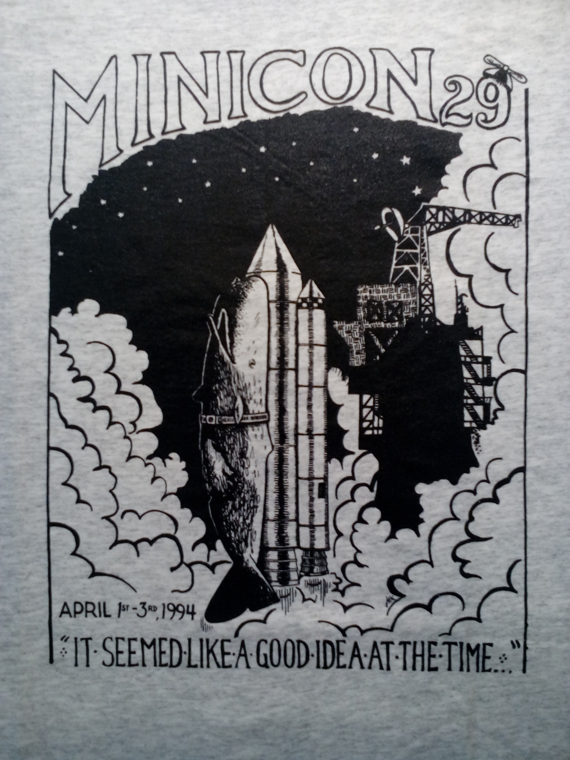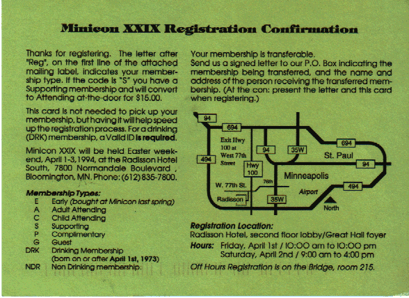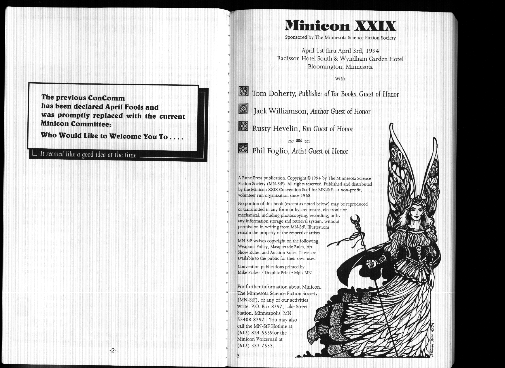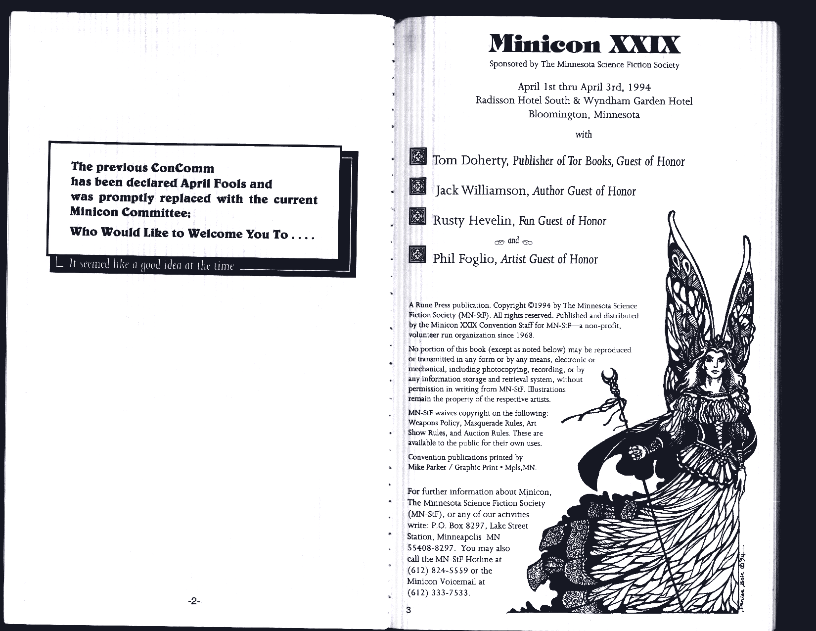 Minicon 29 was held 1–3 April 1994 at the Radisson Hotel South and Wyndham Garden Hotel (Bloomington). Guests of honor were Tom Doherty (publisher), Jack Williamson (author), Rusty Hevelin (fan), and Phil Foglio (artist). The membership was about 3300. Charles E. Piehl chaired it.