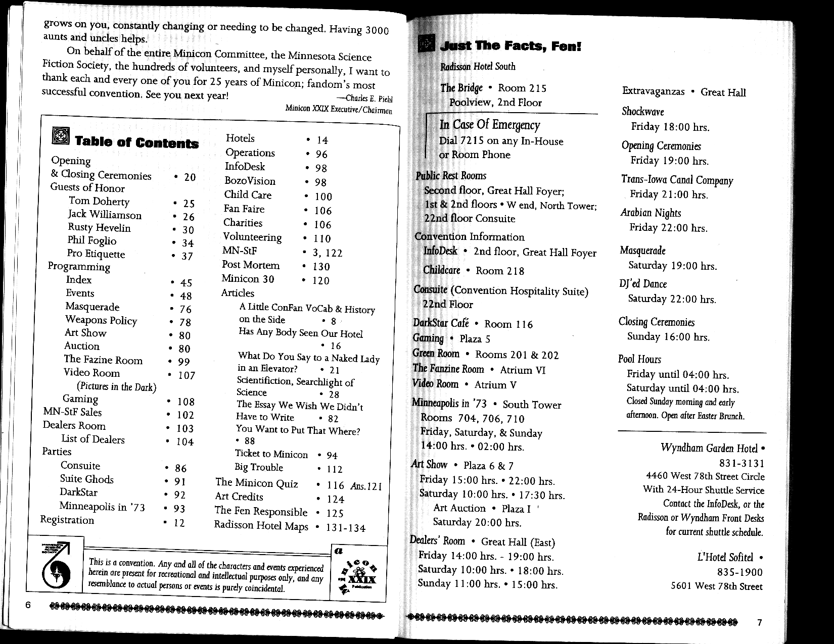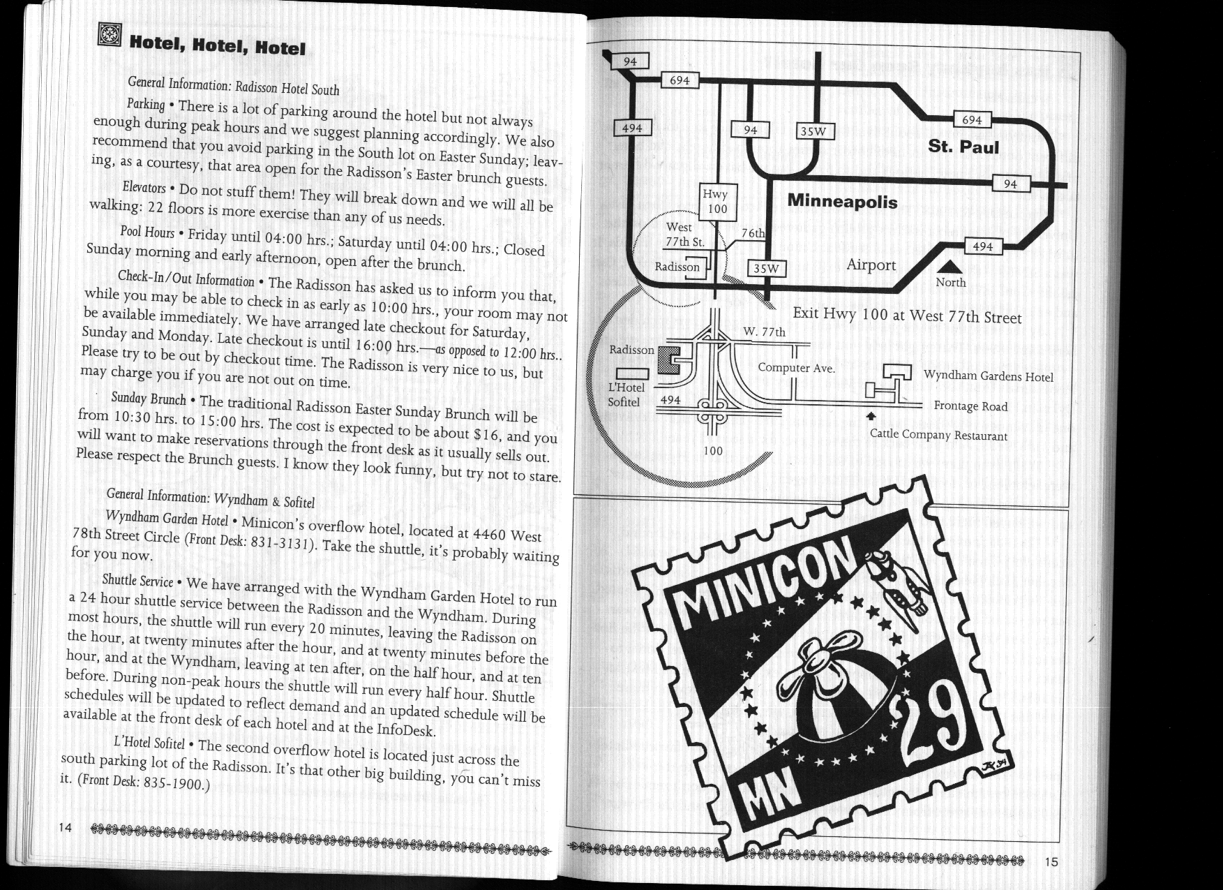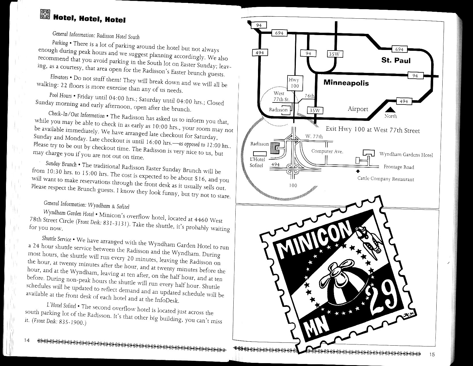 Minicon 29 was held primarily in the Radisson South (afterwards known as a Sheraton, then a DoubleTree and called by fans the "RadishTree"). The program book title page says that it was also in the Wyndham Garden Hotel, and because of this, presumably, our table of all Minicons listed those two. (I think this because it was copied from the Minicon 28 program book.) Page 14, however, lets on that L'Hotel Sofitel was a second overflow hotel. Indeed, no official events are listed except at the Radisson South, so I see no reason not to list both overflow hotels equally.