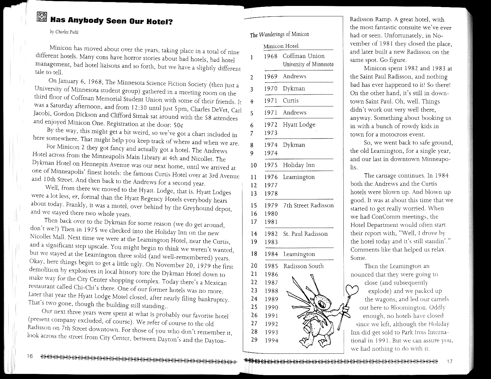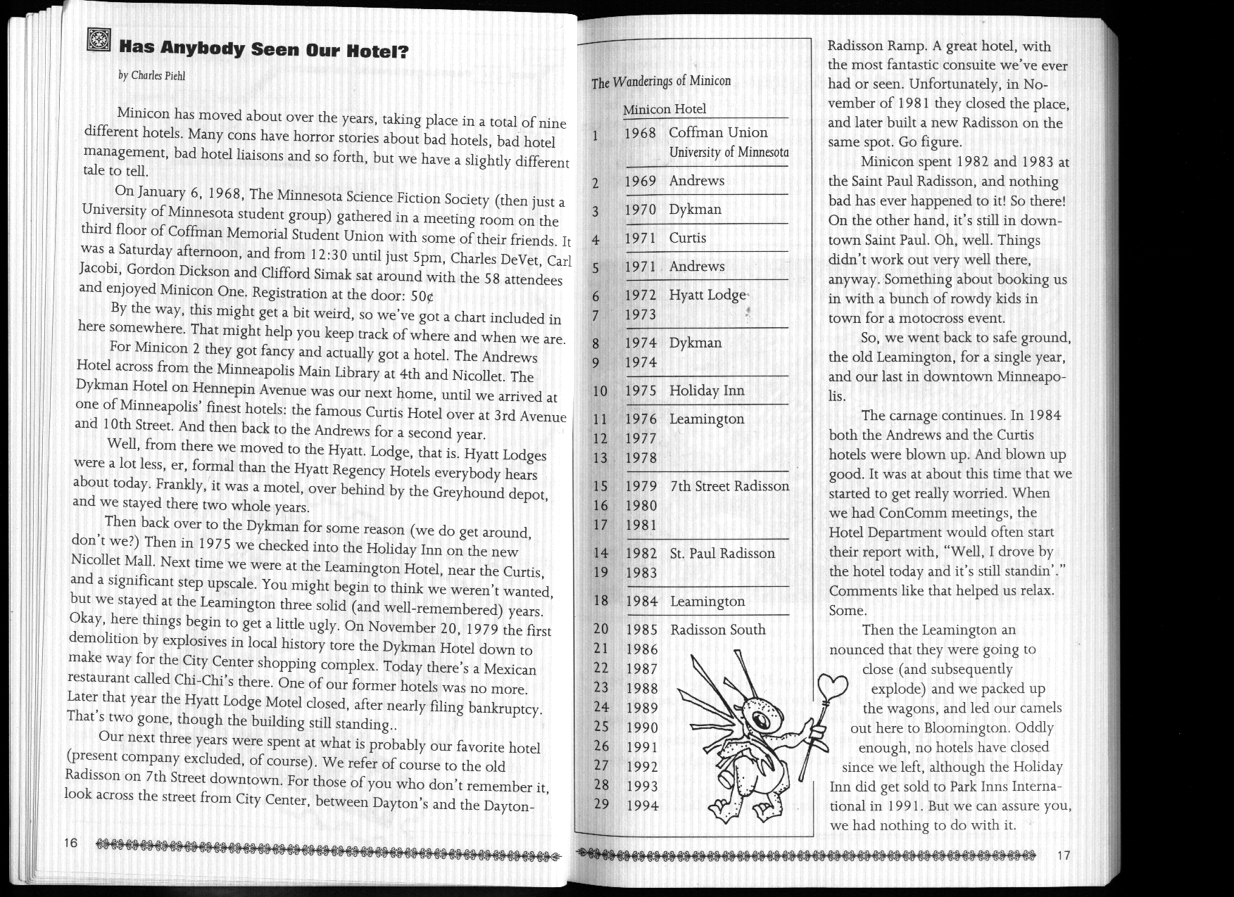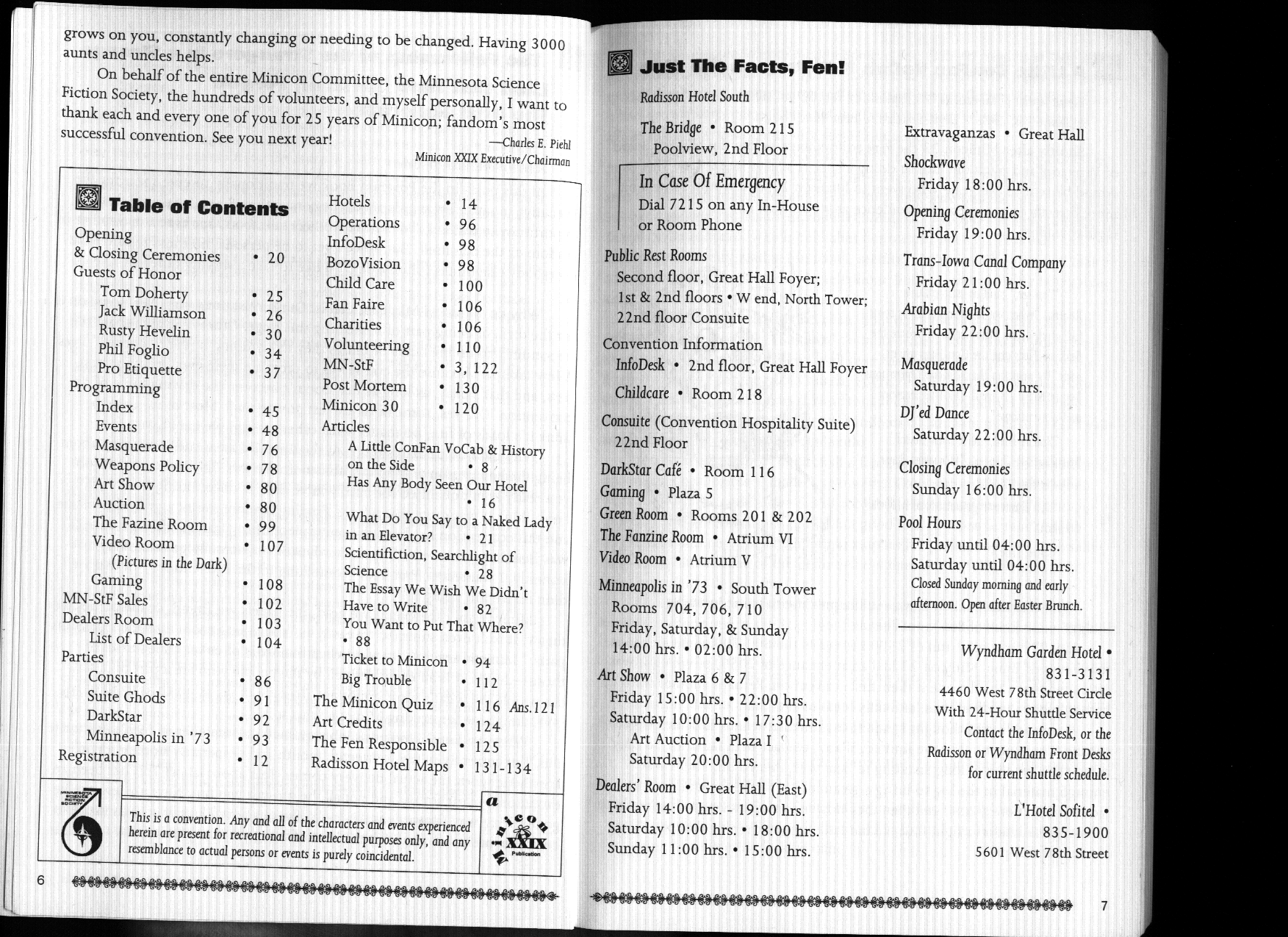 Minicon 29 was held primarily in the Radisson South (afterwards known as a Sheraton, then a DoubleTree and called by fans the "RadishTree"). The program book title page says that it was also in the Wyndham Garden Hotel, and because of this, presumably, our table of all Minicons listed those two. (I think this because it was copied from the Minicon 28 program book.) Page 14, however, lets on that L'Hotel Sofitel was a second overflow hotel. Indeed, no official events are listed except at the Radisson South, so I see no reason not to list both overflow hotels equally.