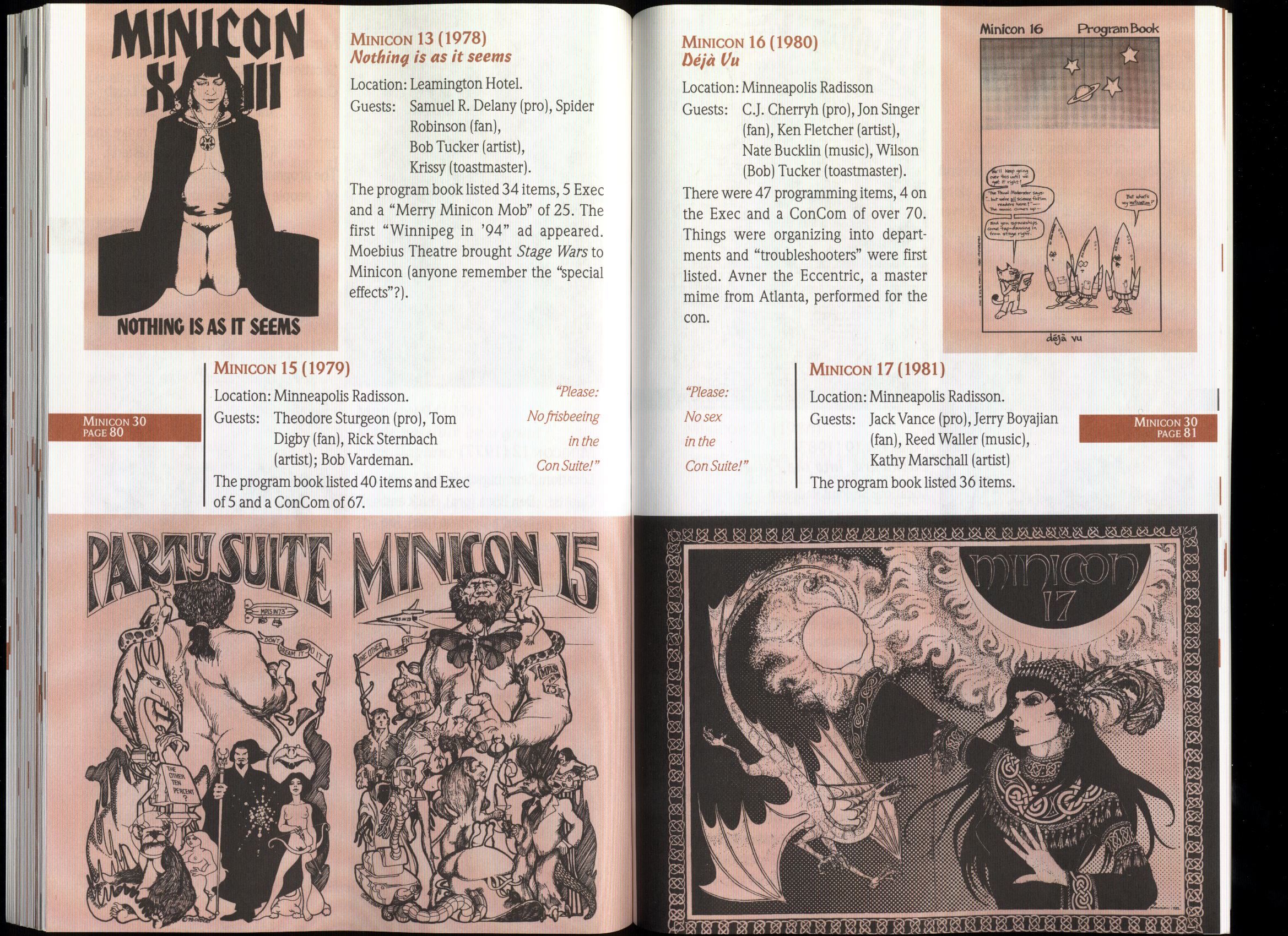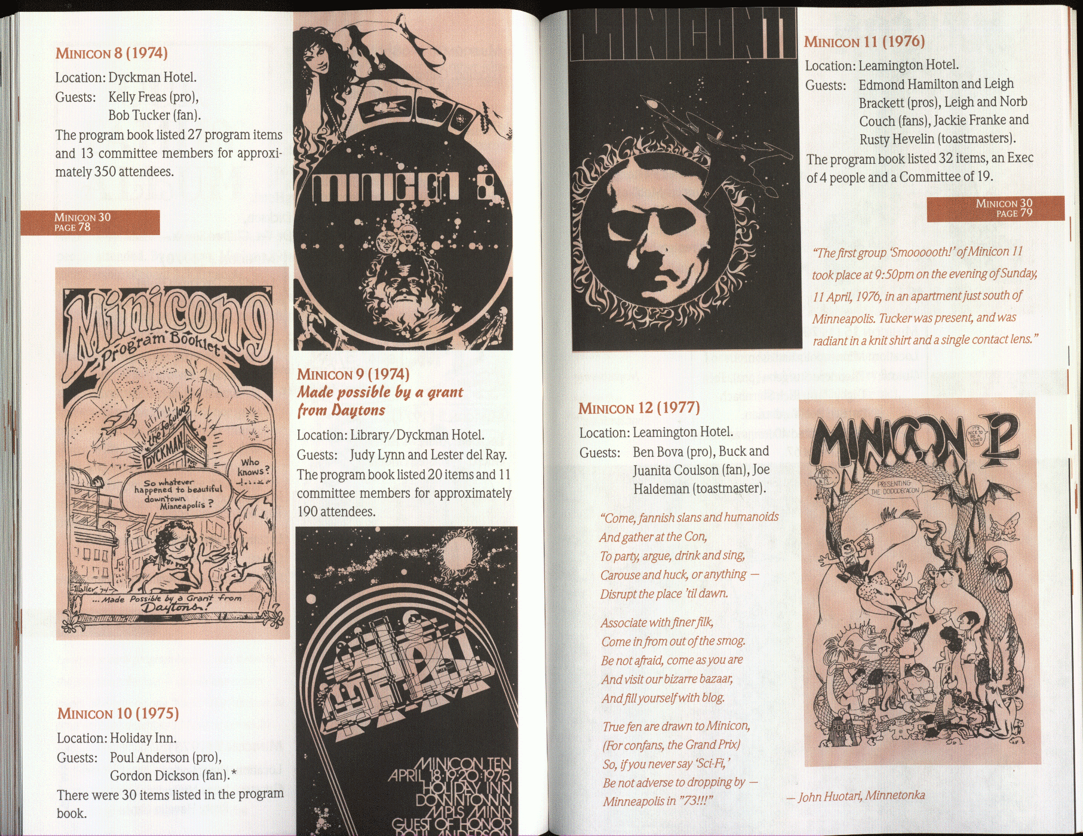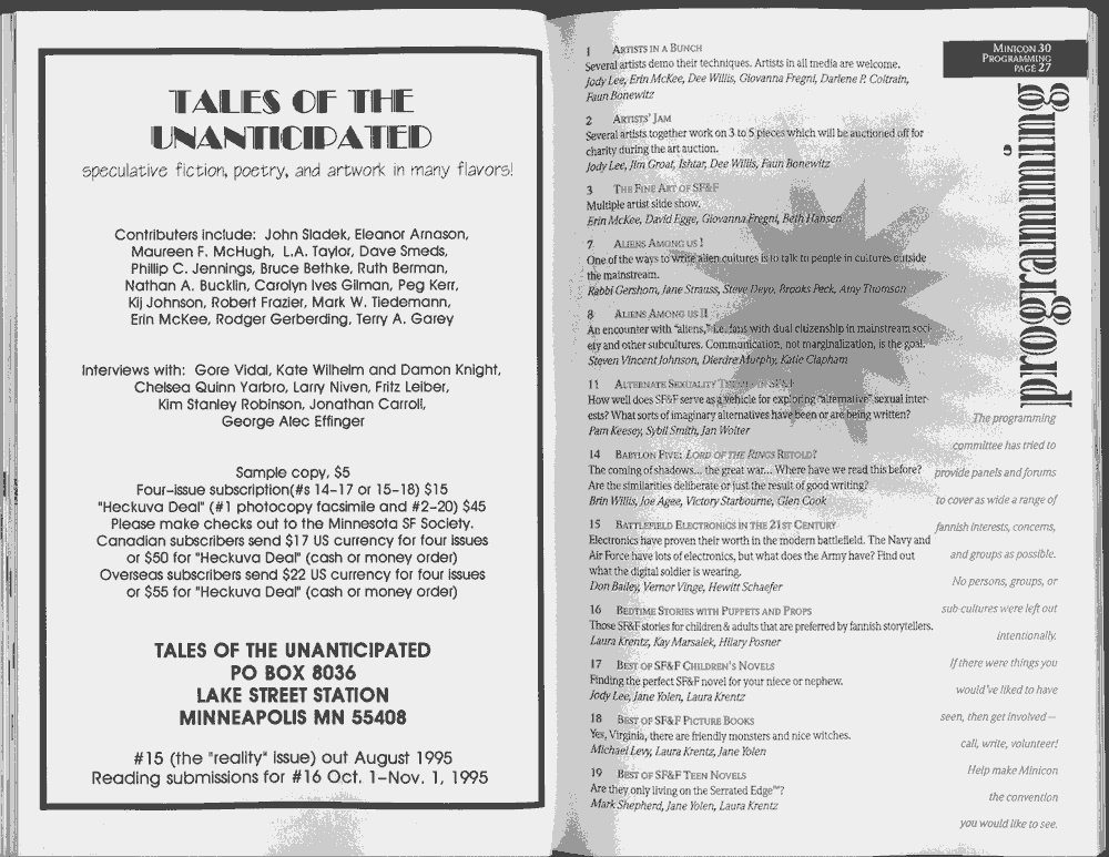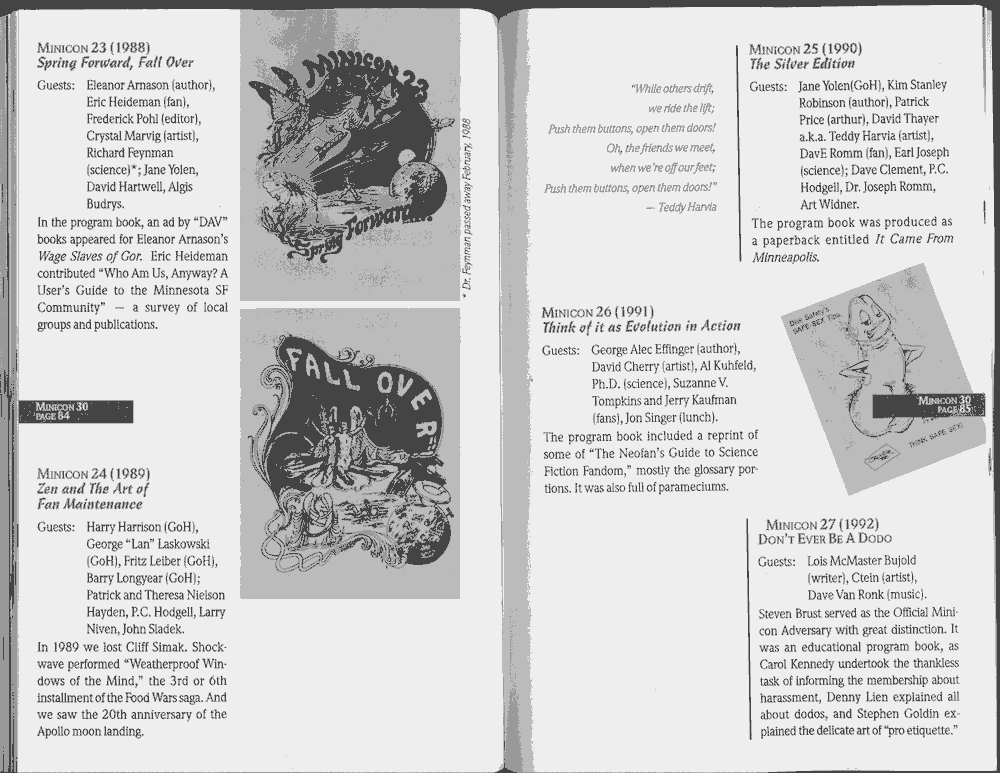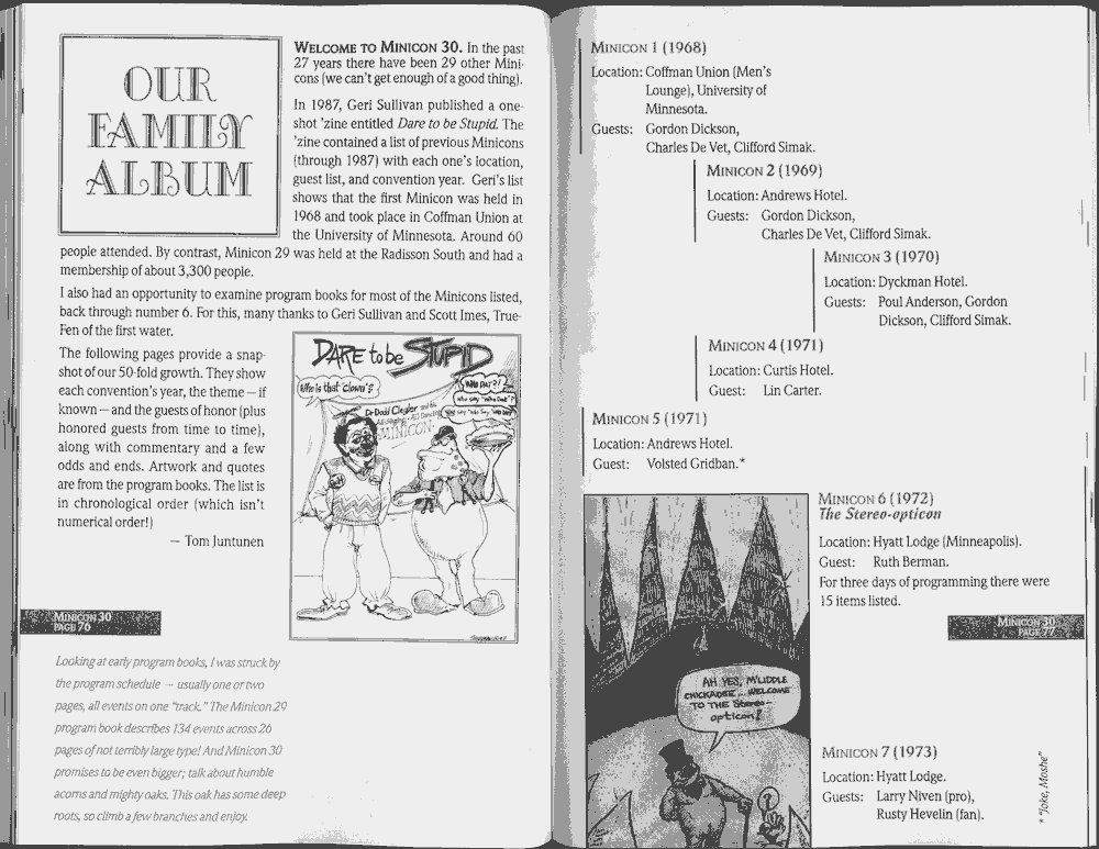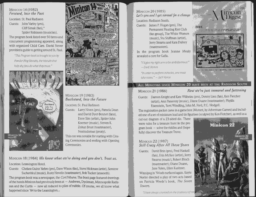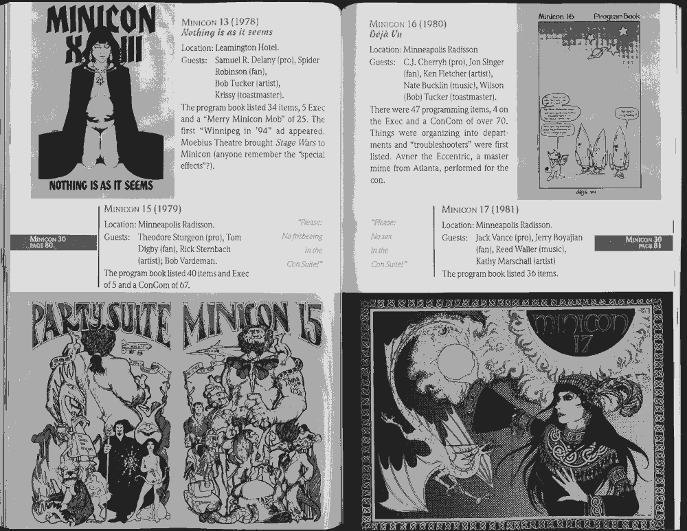 Art by Jody Lee is © Jody Lee and reproduced here by permission. T-shirt art by James A. Kuehl is © James A. Kuehl and reproduced here by permission. Minicon 17 program book cover art by Kathy Marschall is © Kathy Grantham and is reproduced here by permission. Minicon 12, 13, and 15 program book cover art by Jim Odbert is © nybor mystical art 2009 and reproduced here by permission. Art by Derrick Dasenbrock, TL, and Larry Becker are © each of them. Advertisements remain property of the advertisers.