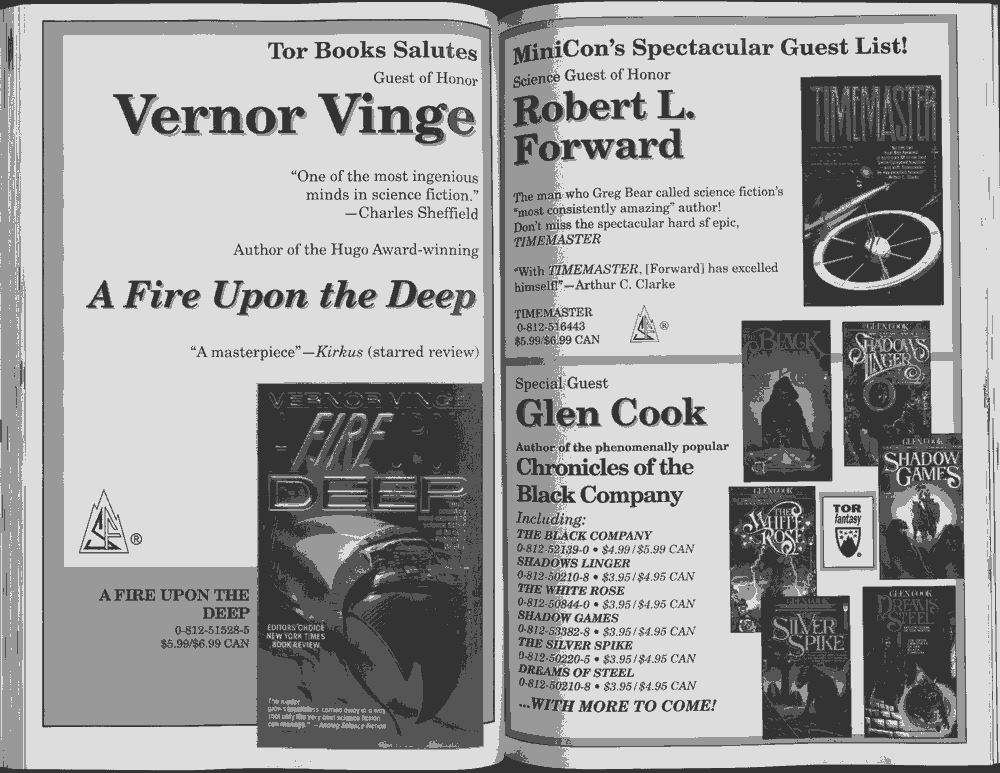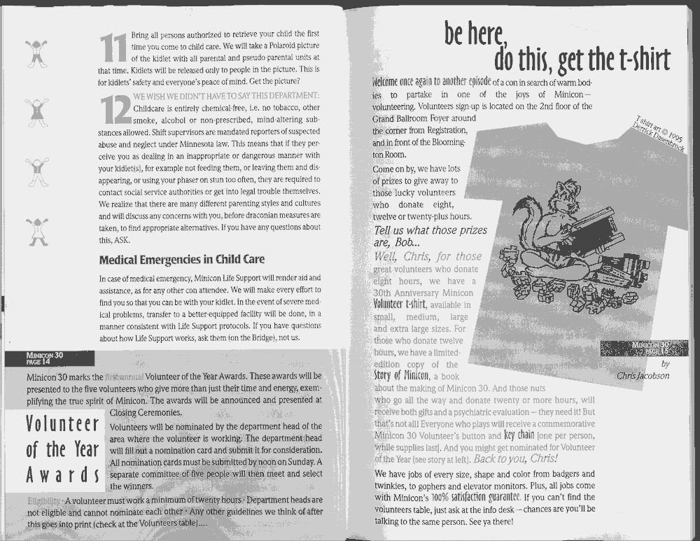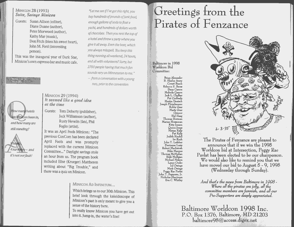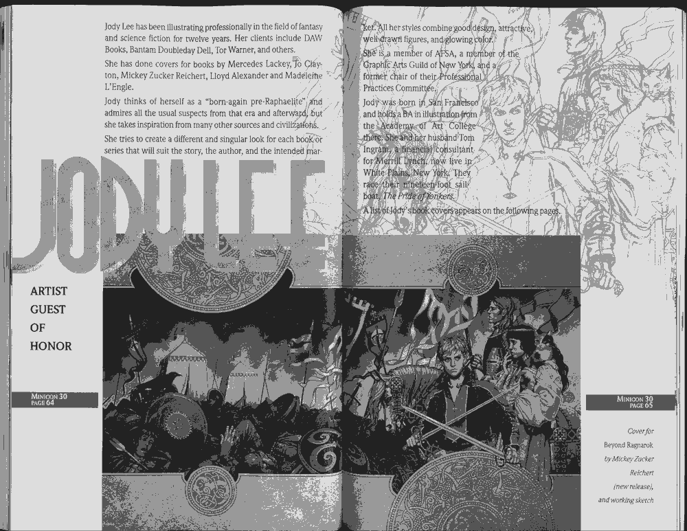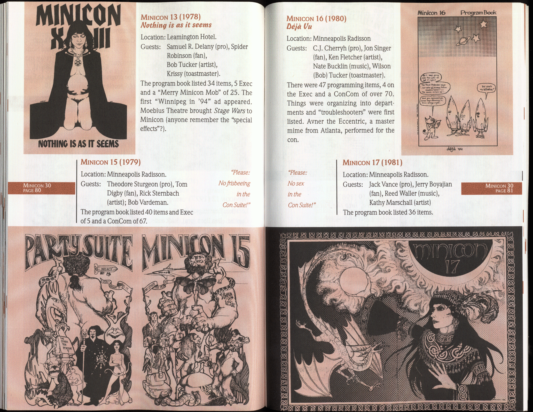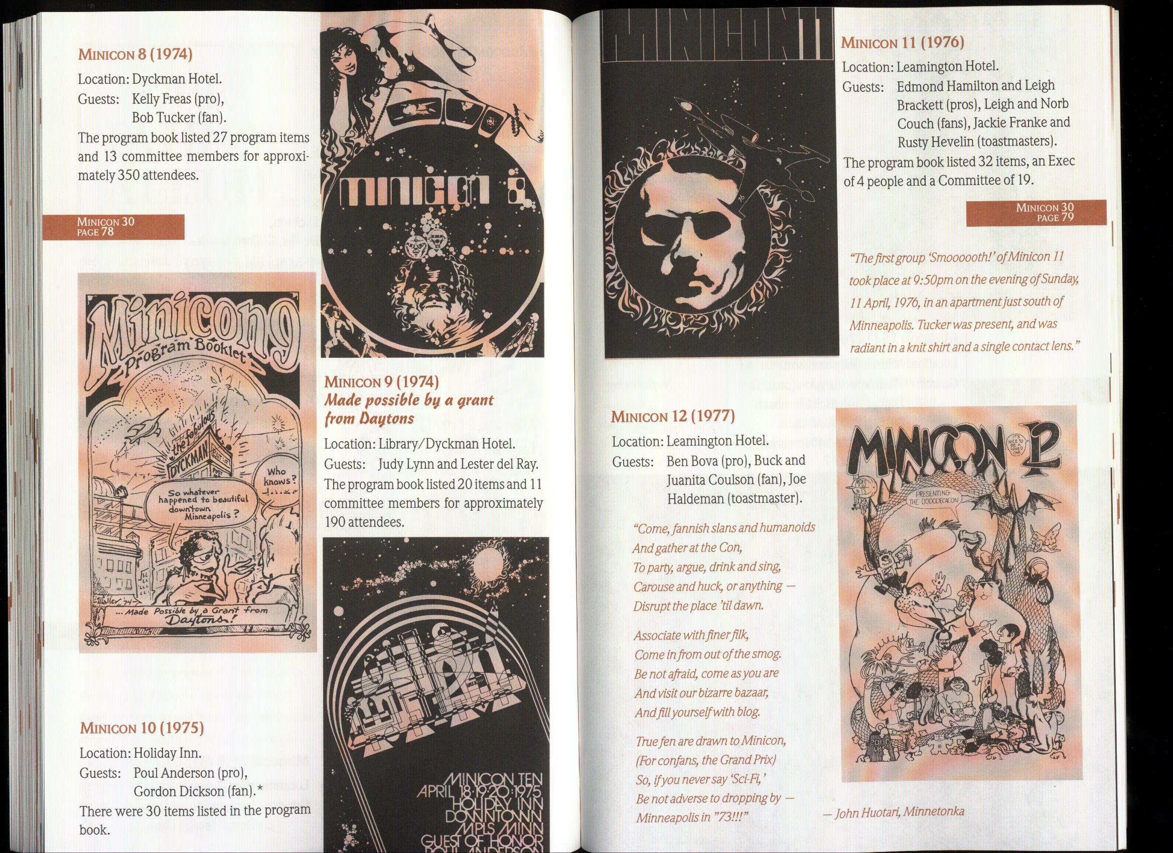 Art by Jody Lee is © Jody Lee and reproduced here by permission. T-shirt art by James A. Kuehl is © James A. Kuehl and reproduced here by permission. Minicon 17 program book cover art by Kathy Marschall is © Kathy Grantham and is reproduced here by permission. Minicon 12, 13, and 15 program book cover art by Jim Odbert is © nybor mystical art 2009 and reproduced here by permission. Art by Derrick Dasenbrock, TL, and Larry Becker are © each of them. Advertisements remain property of the advertisers.