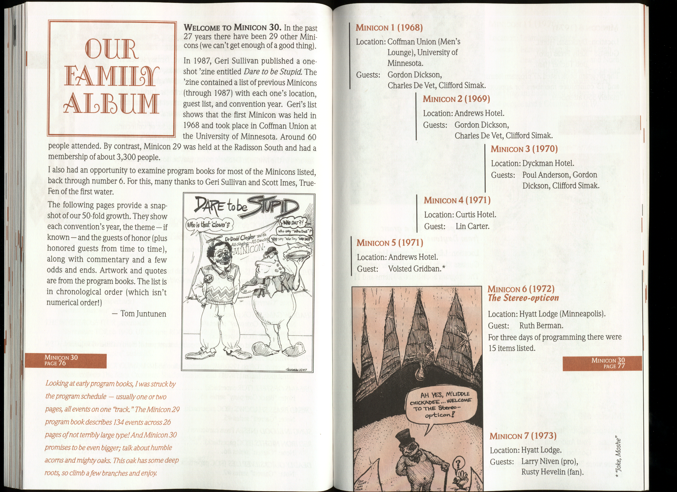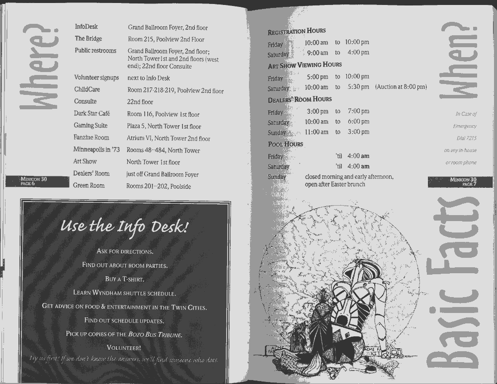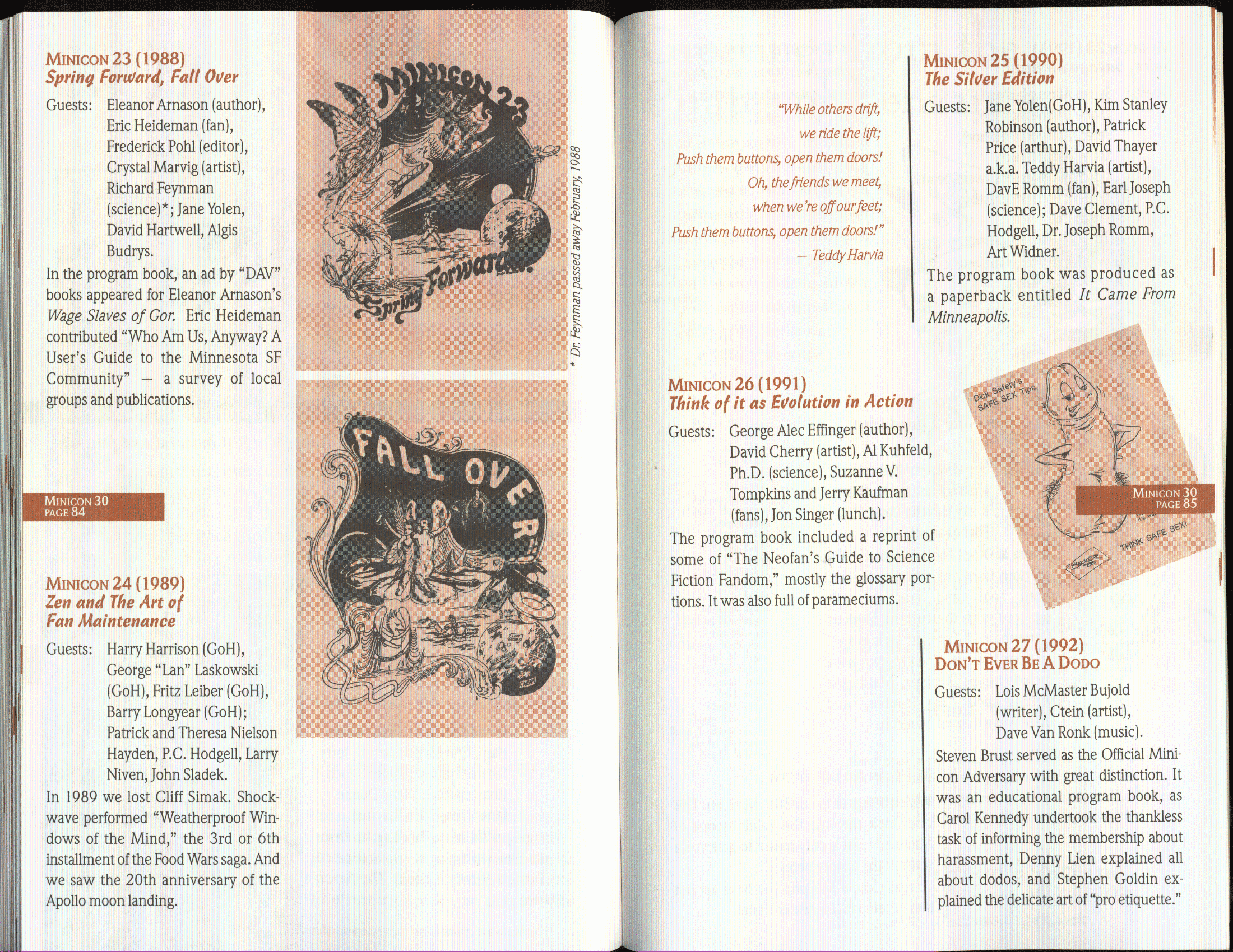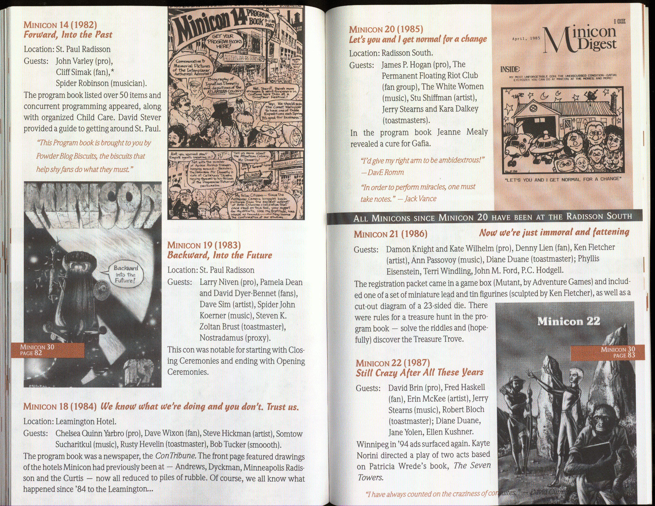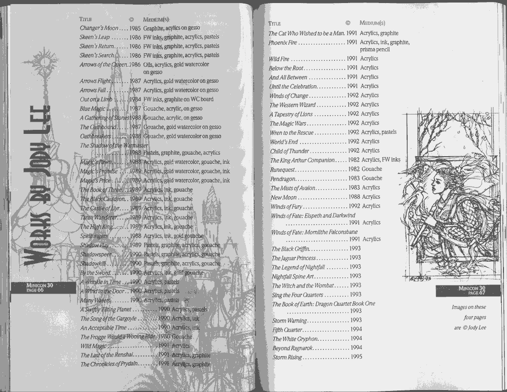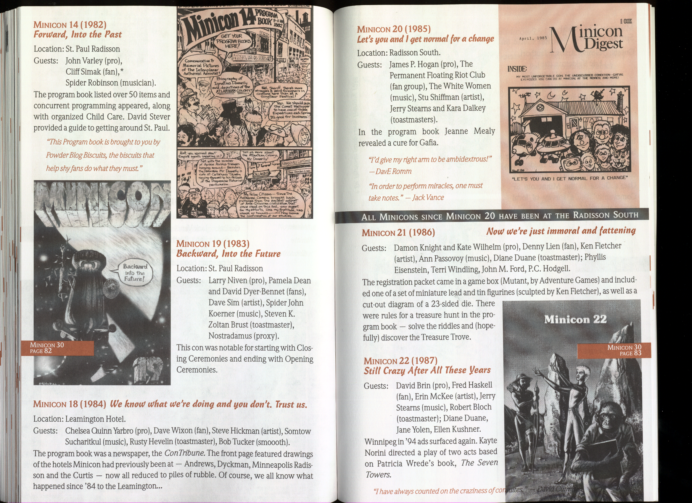 Art by Jody Lee is © Jody Lee and reproduced here by permission. T-shirt art by James A. Kuehl is © James A. Kuehl and reproduced here by permission. Minicon 17 program book cover art by Kathy Marschall is © Kathy Grantham and is reproduced here by permission. Minicon 12, 13, and 15 program book cover art by Jim Odbert is © nybor mystical art 2009 and reproduced here by permission. Art by Derrick Dasenbrock, TL, and Larry Becker are © each of them. Advertisements remain property of the advertisers.