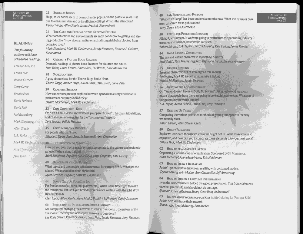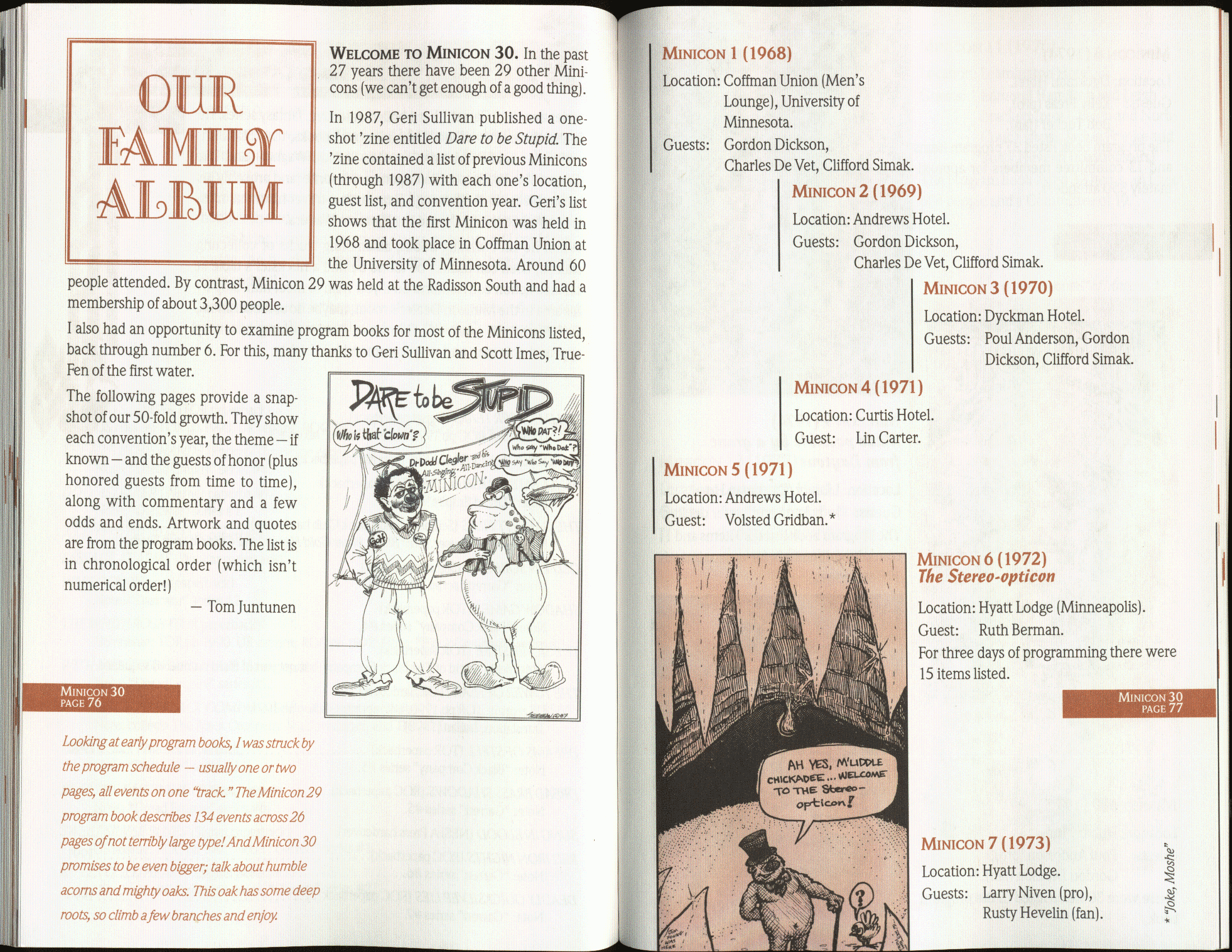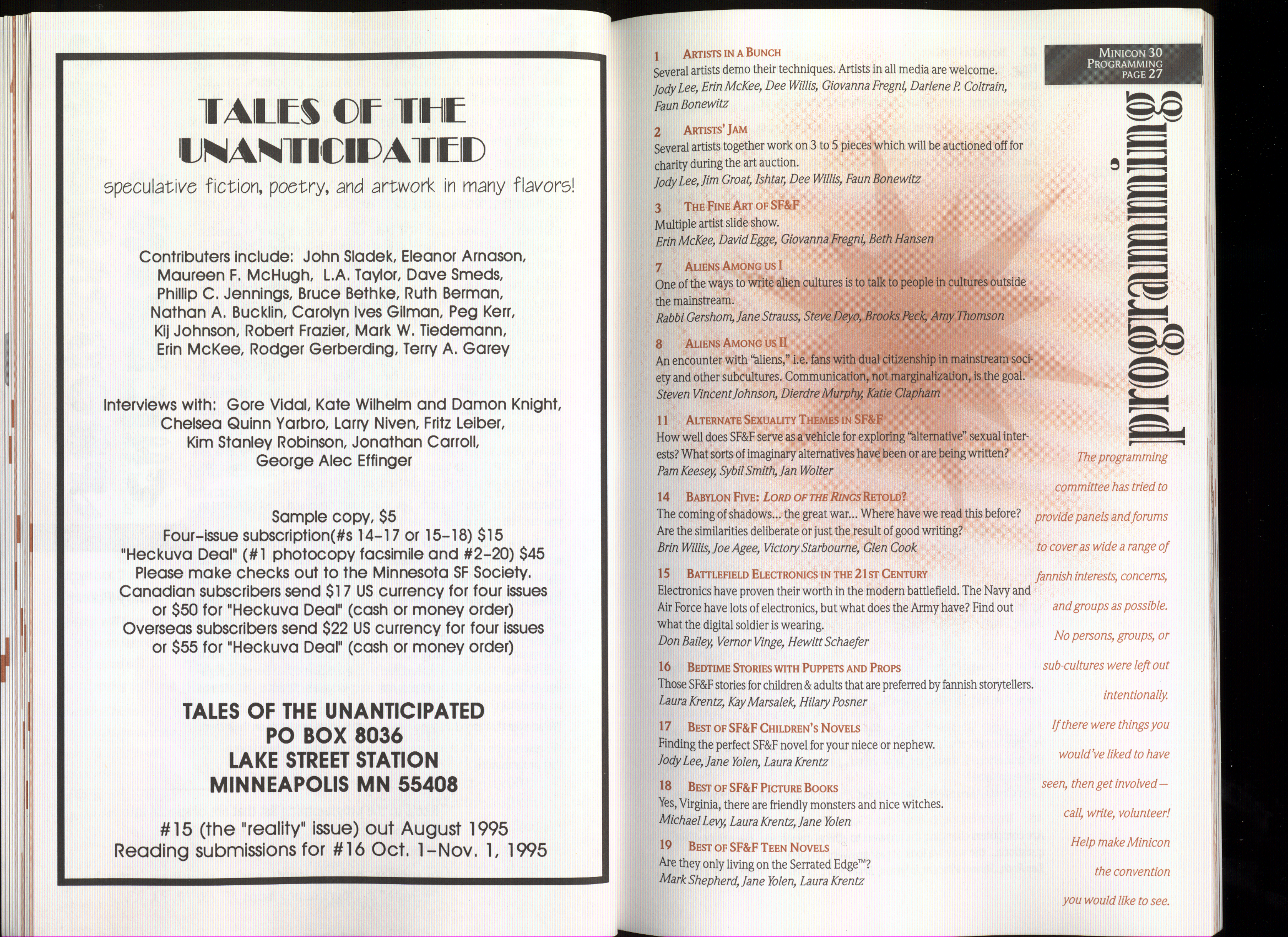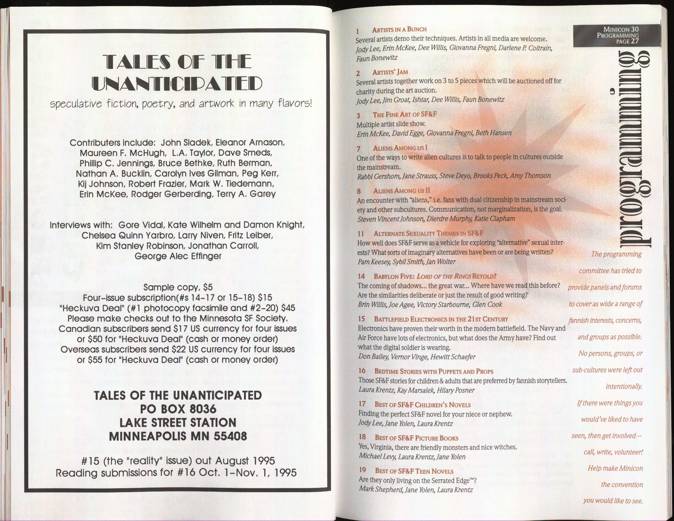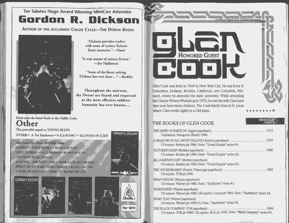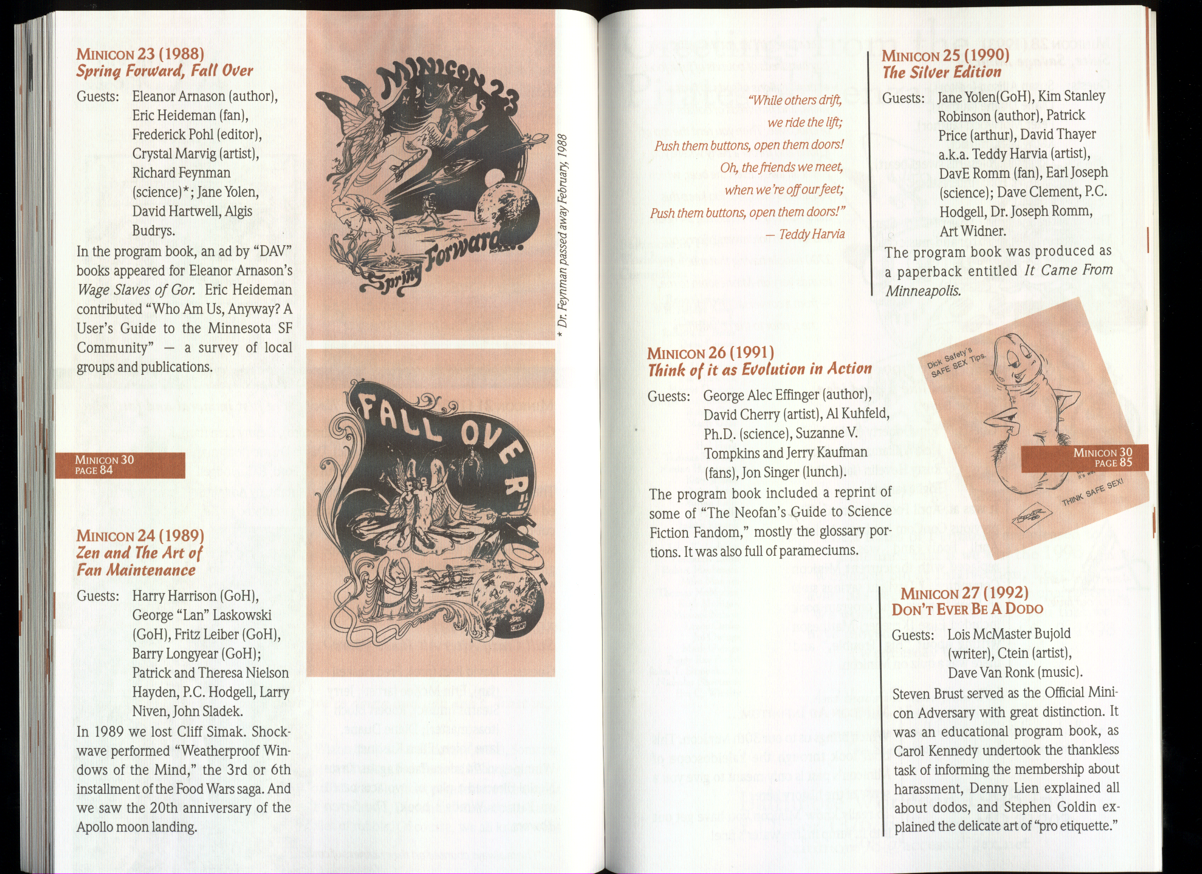 Art by Jody Lee is © Jody Lee and reproduced here by permission. T-shirt art by James A. Kuehl is © James A. Kuehl and reproduced here by permission. Minicon 17 program book cover art by Kathy Marschall is © Kathy Grantham and is reproduced here by permission. Minicon 12, 13, and 15 program book cover art by Jim Odbert is © nybor mystical art 2009 and reproduced here by permission. Art by Derrick Dasenbrock, TL, and Larry Becker are © each of them. Advertisements remain property of the advertisers.