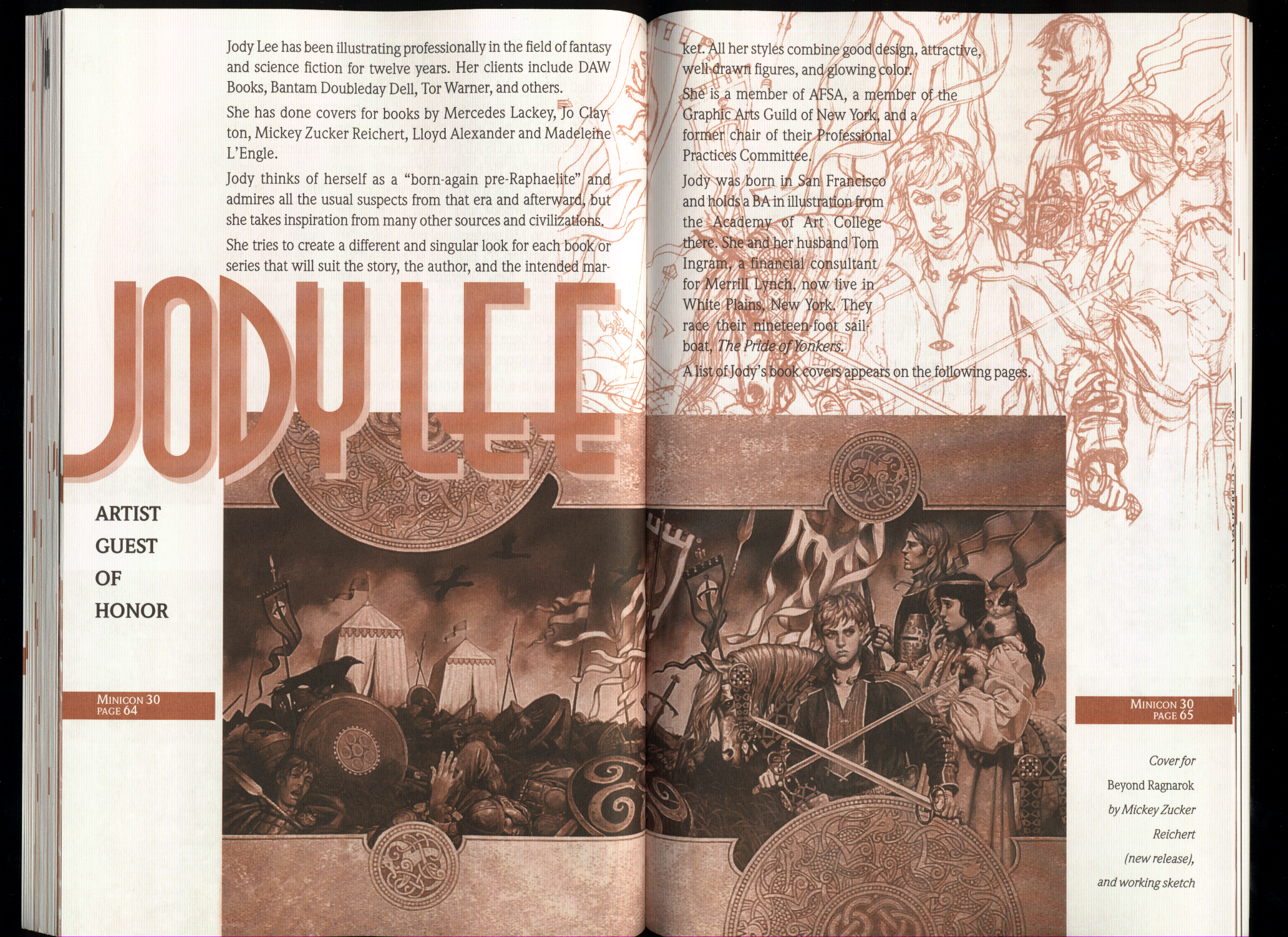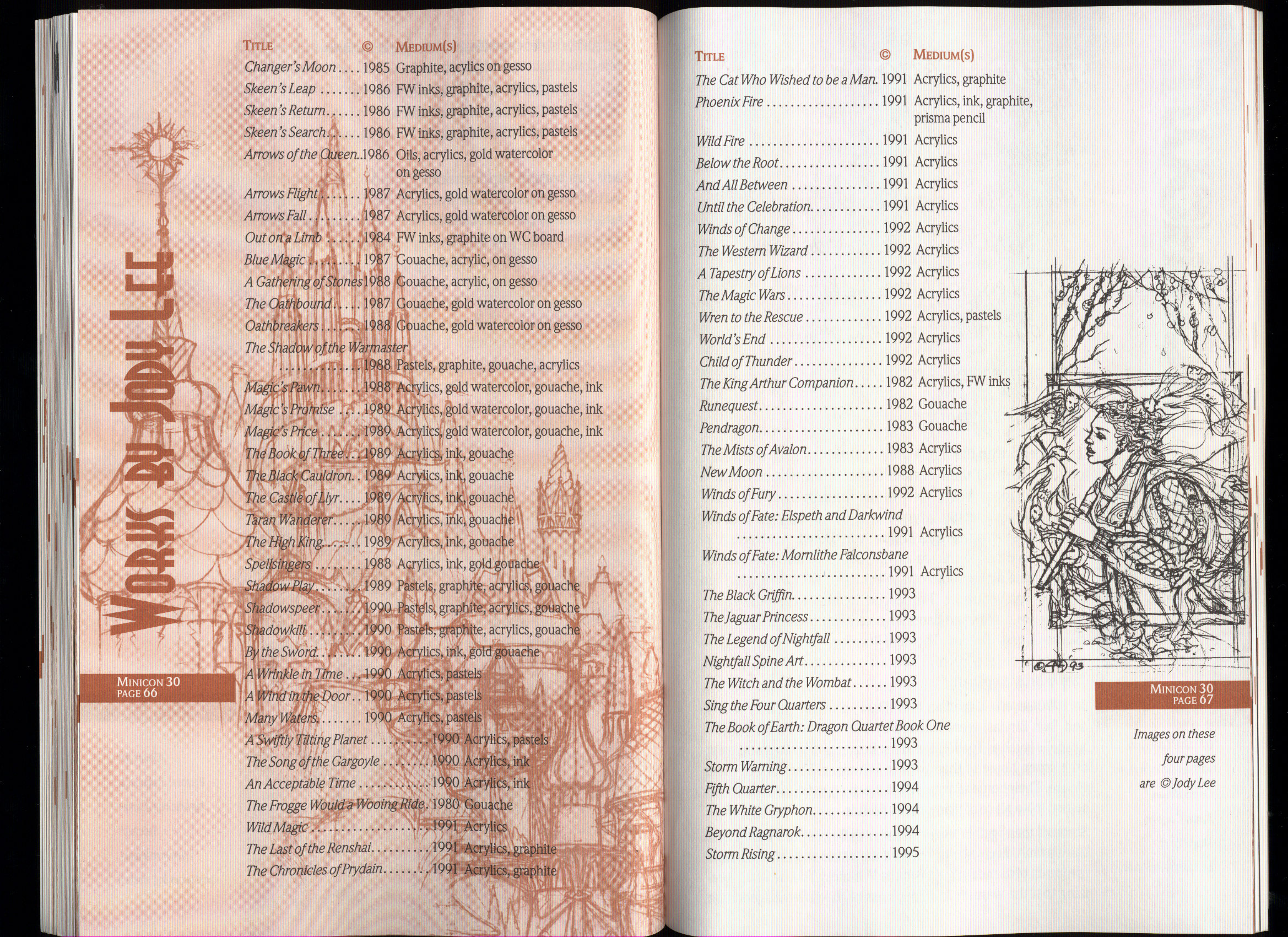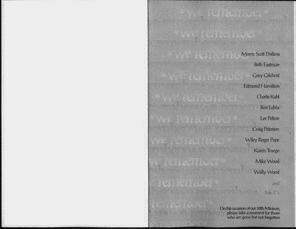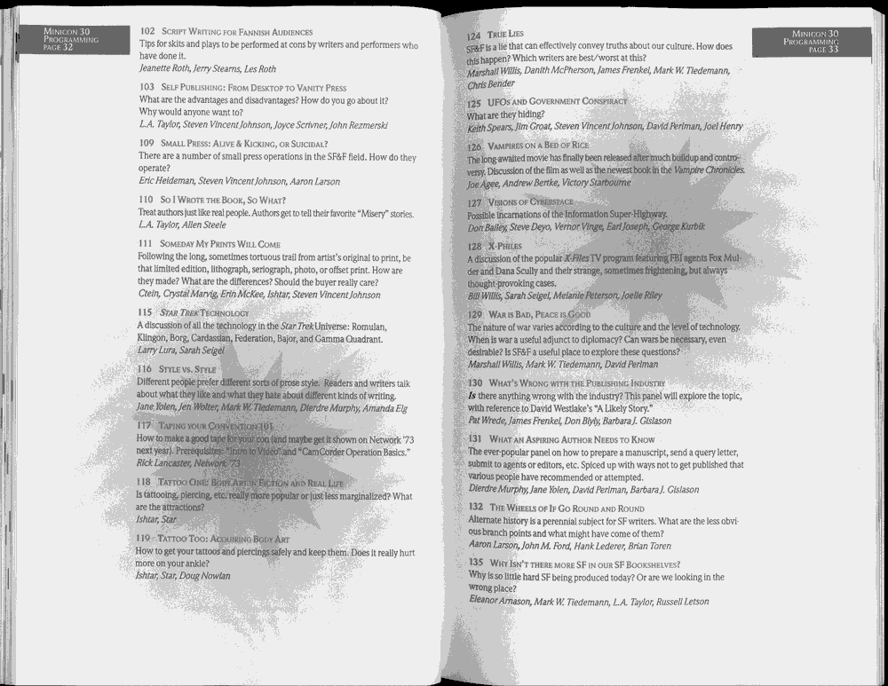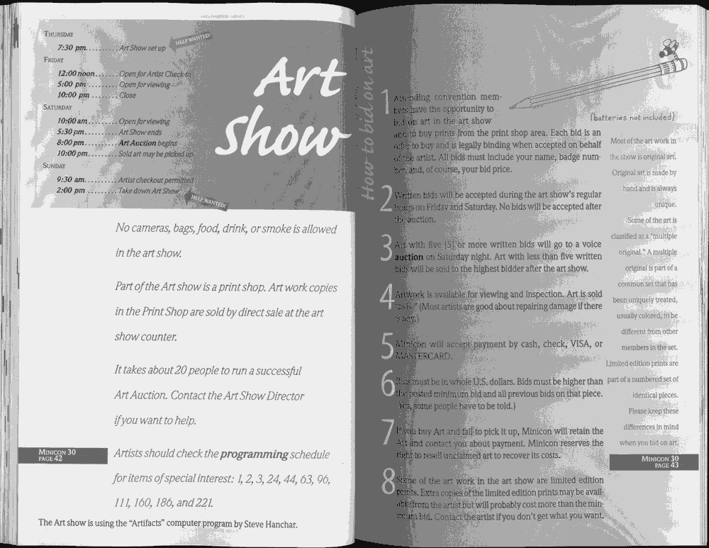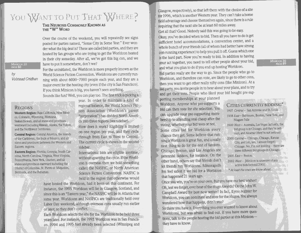 Art by Jody Lee is © Jody Lee and reproduced here by permission. T-shirt art by James A. Kuehl is © James A. Kuehl and reproduced here by permission. Minicon 17 program book cover art by Kathy Marschall is © Kathy Grantham and is reproduced here by permission. Minicon 12, 13, and 15 program book cover art by Jim Odbert is © nybor mystical art 2009 and reproduced here by permission. Art by Derrick Dasenbrock, TL, and Larry Becker are © each of them. Advertisements remain property of the advertisers.