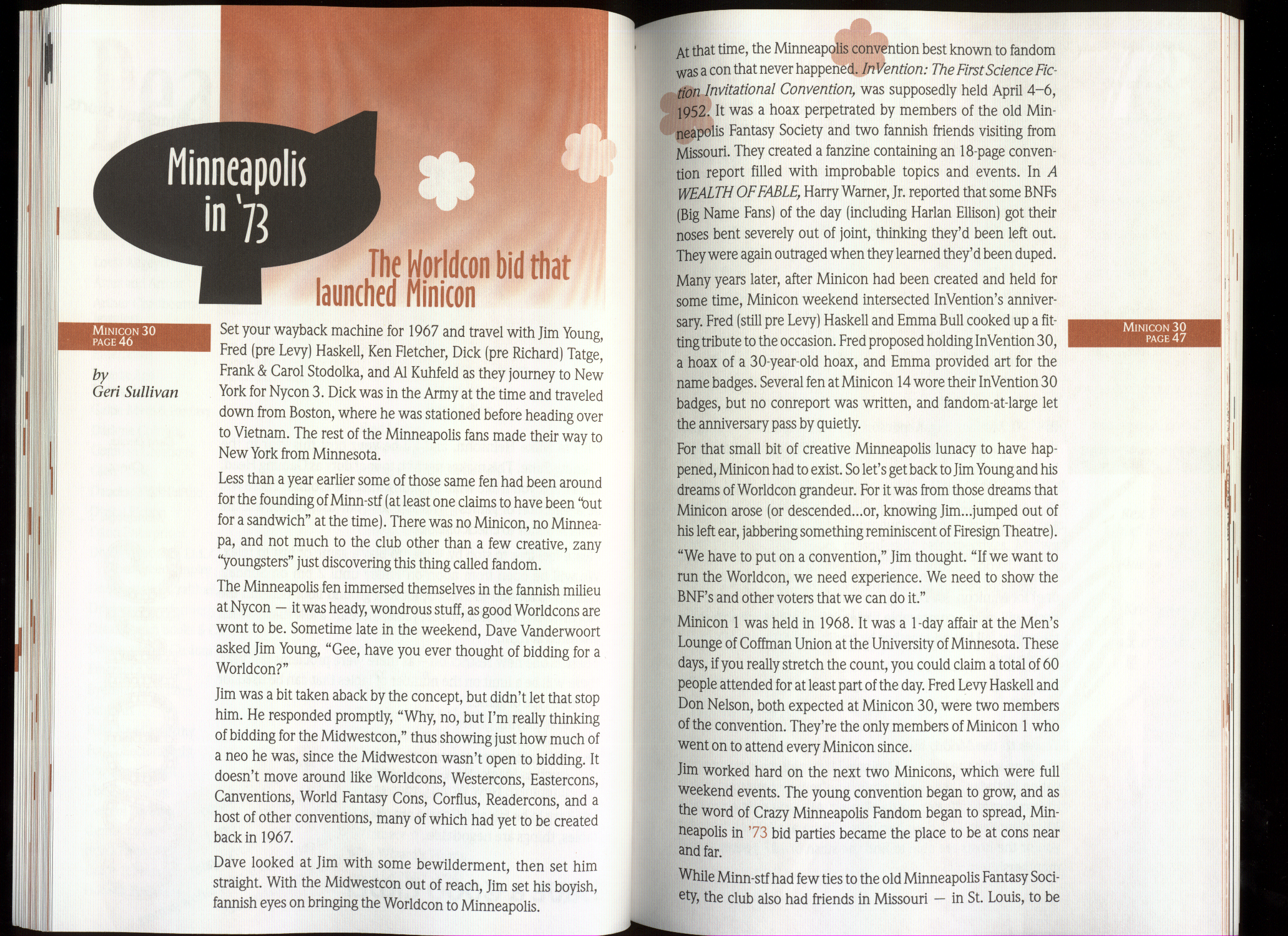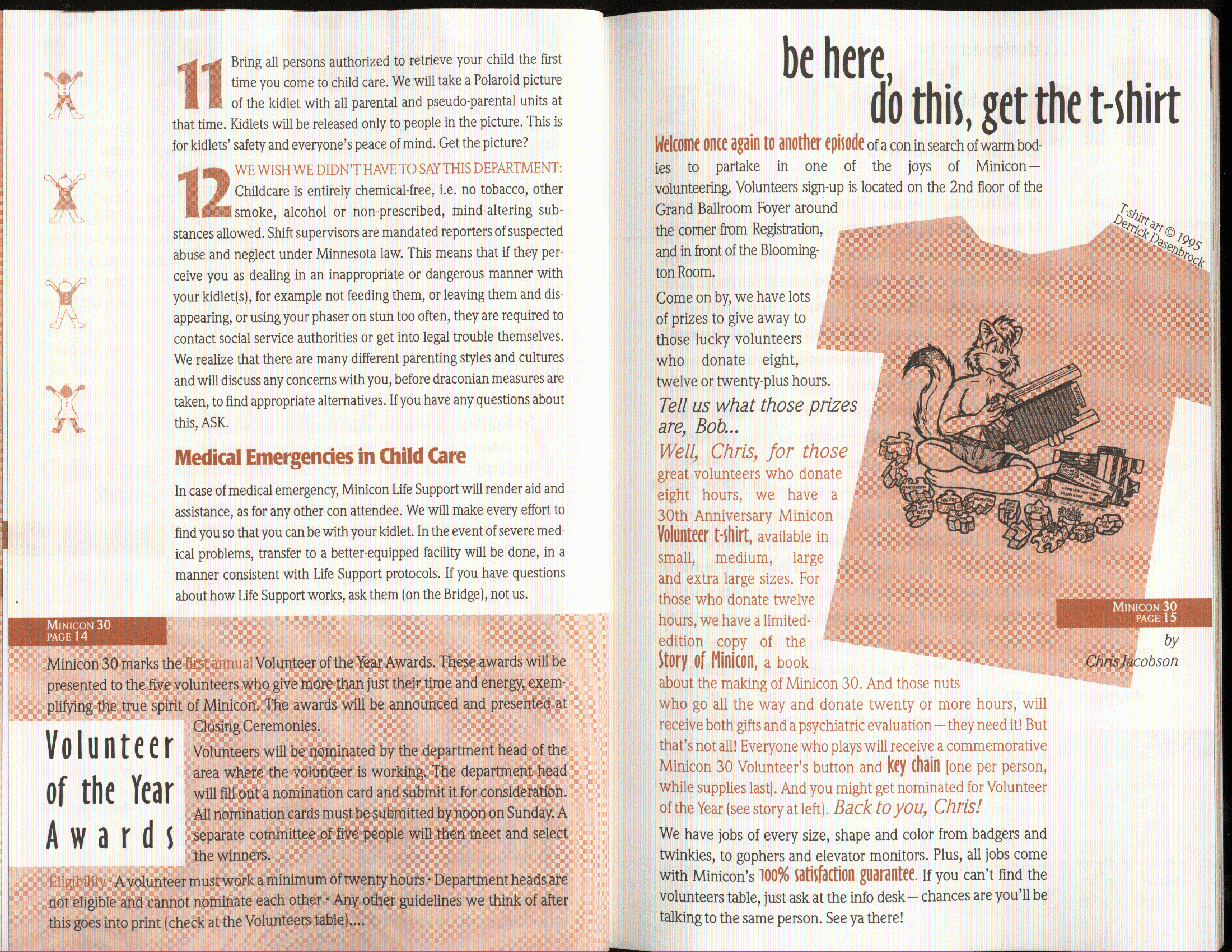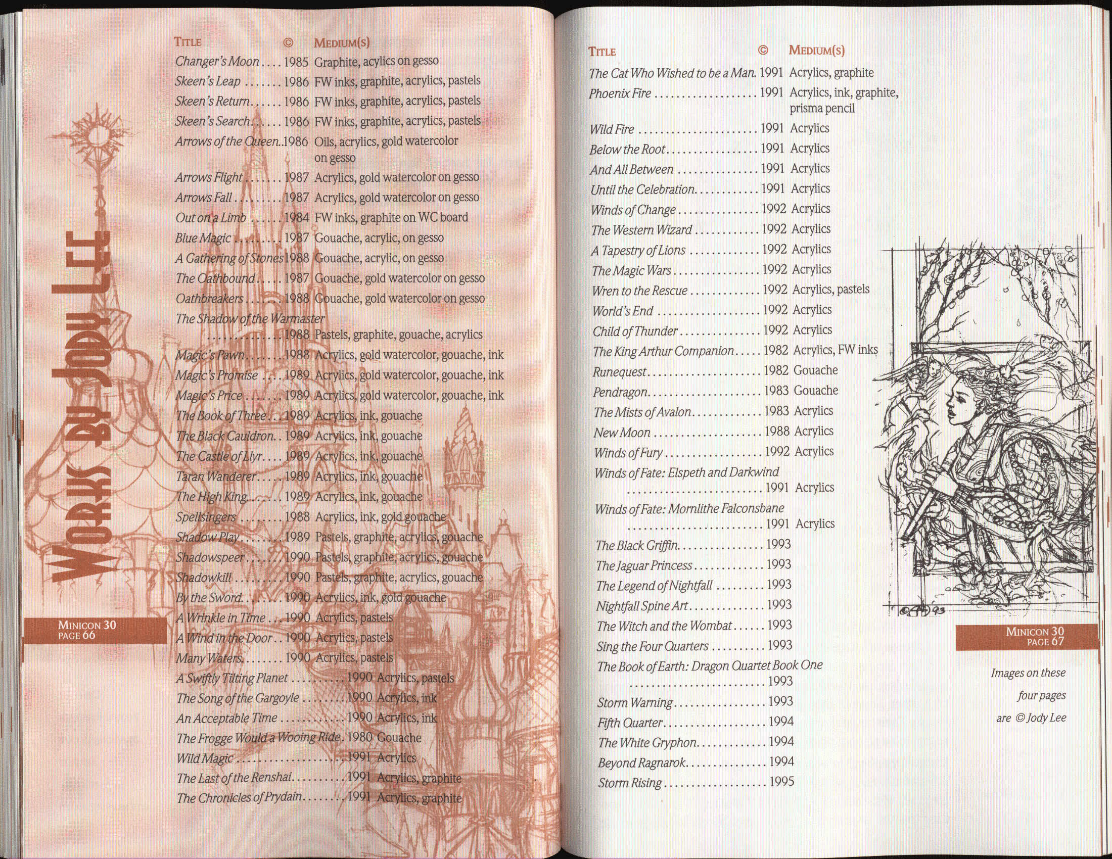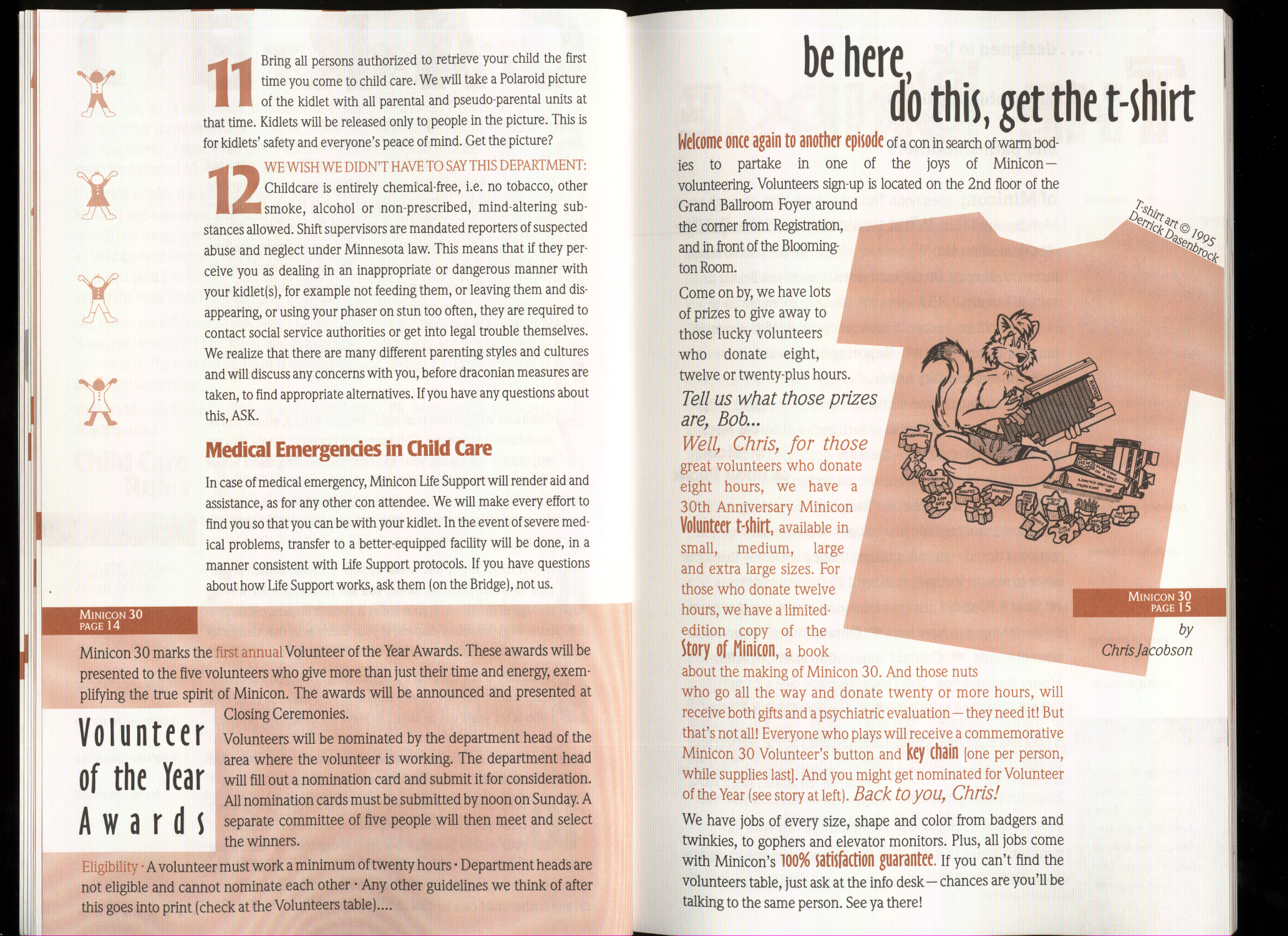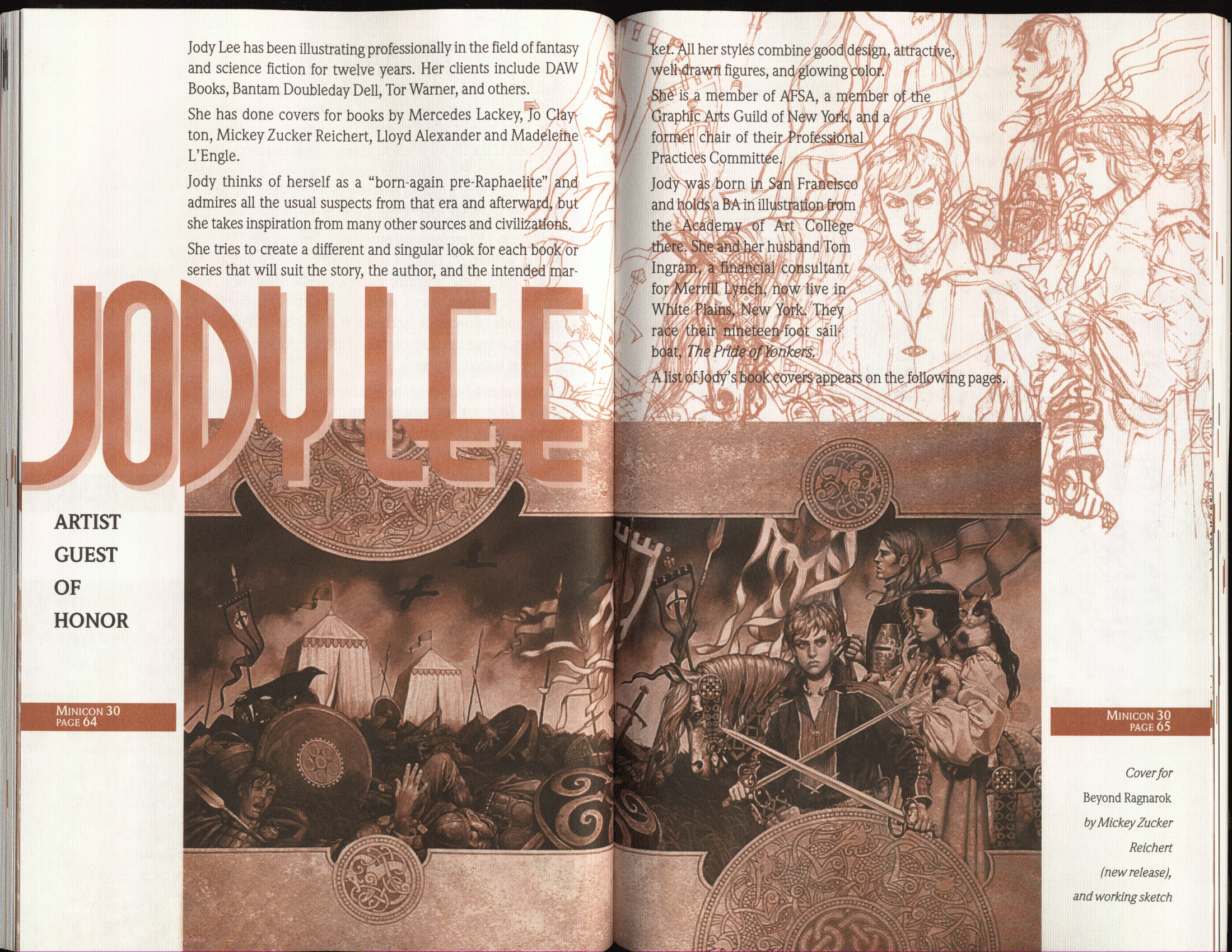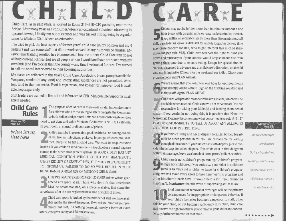 Art by Jody Lee is © Jody Lee and reproduced here by permission. T-shirt art by James A. Kuehl is © James A. Kuehl and reproduced here by permission. Minicon 17 program book cover art by Kathy Marschall is © Kathy Grantham and is reproduced here by permission. Minicon 12, 13, and 15 program book cover art by Jim Odbert is © nybor mystical art 2009 and reproduced here by permission. Art by Derrick Dasenbrock, TL, and Larry Becker are © each of them. Advertisements remain property of the advertisers.