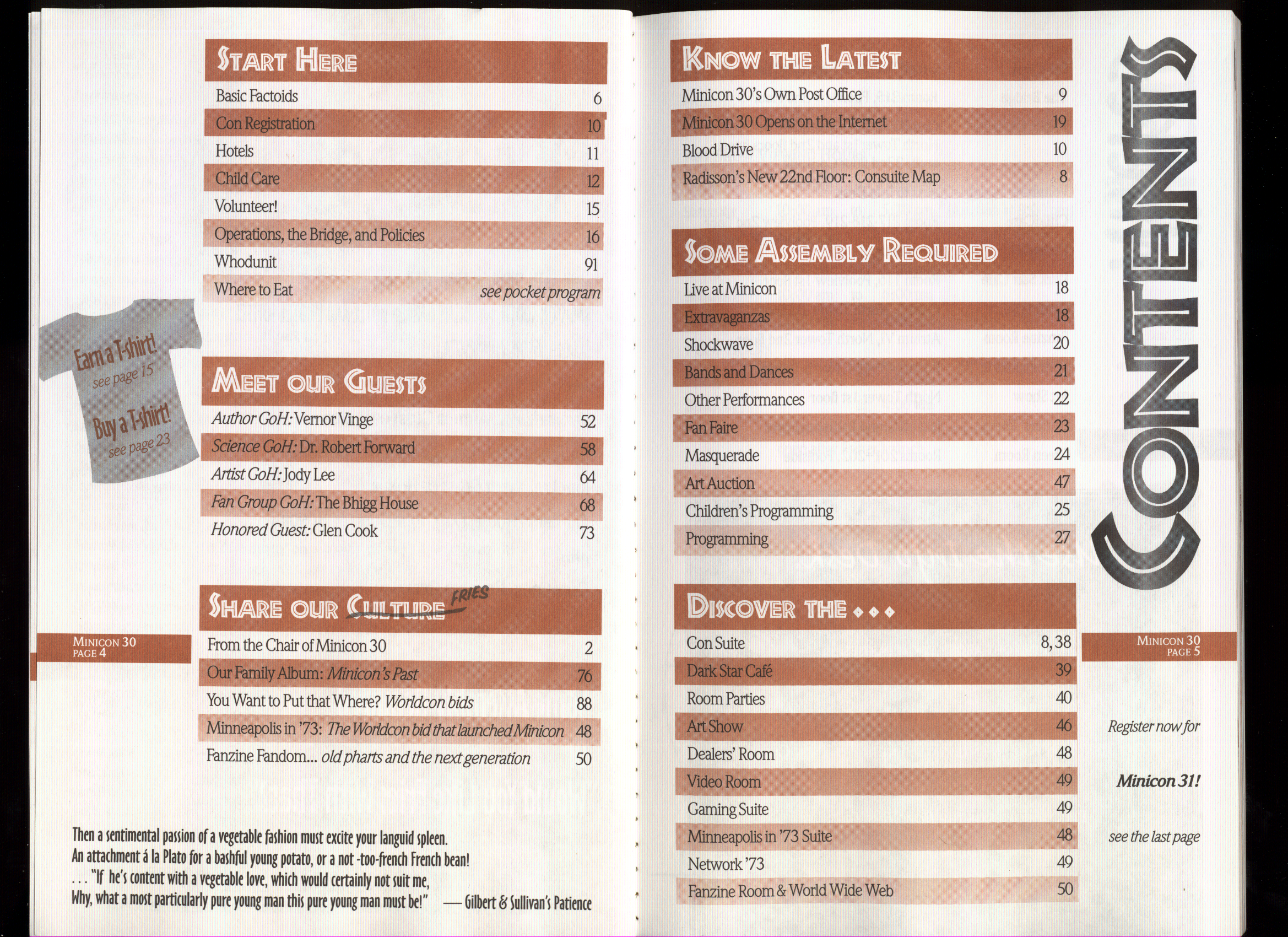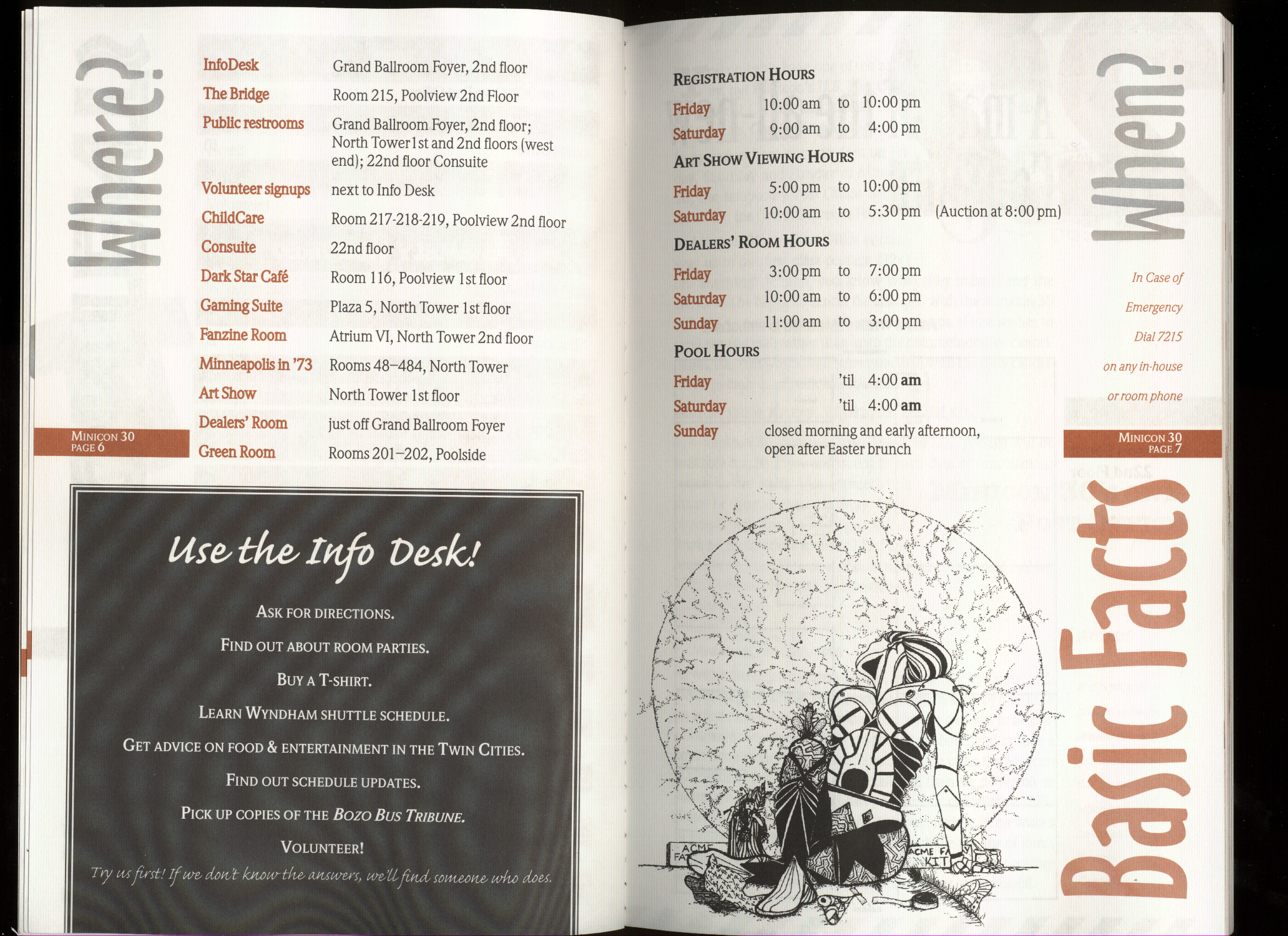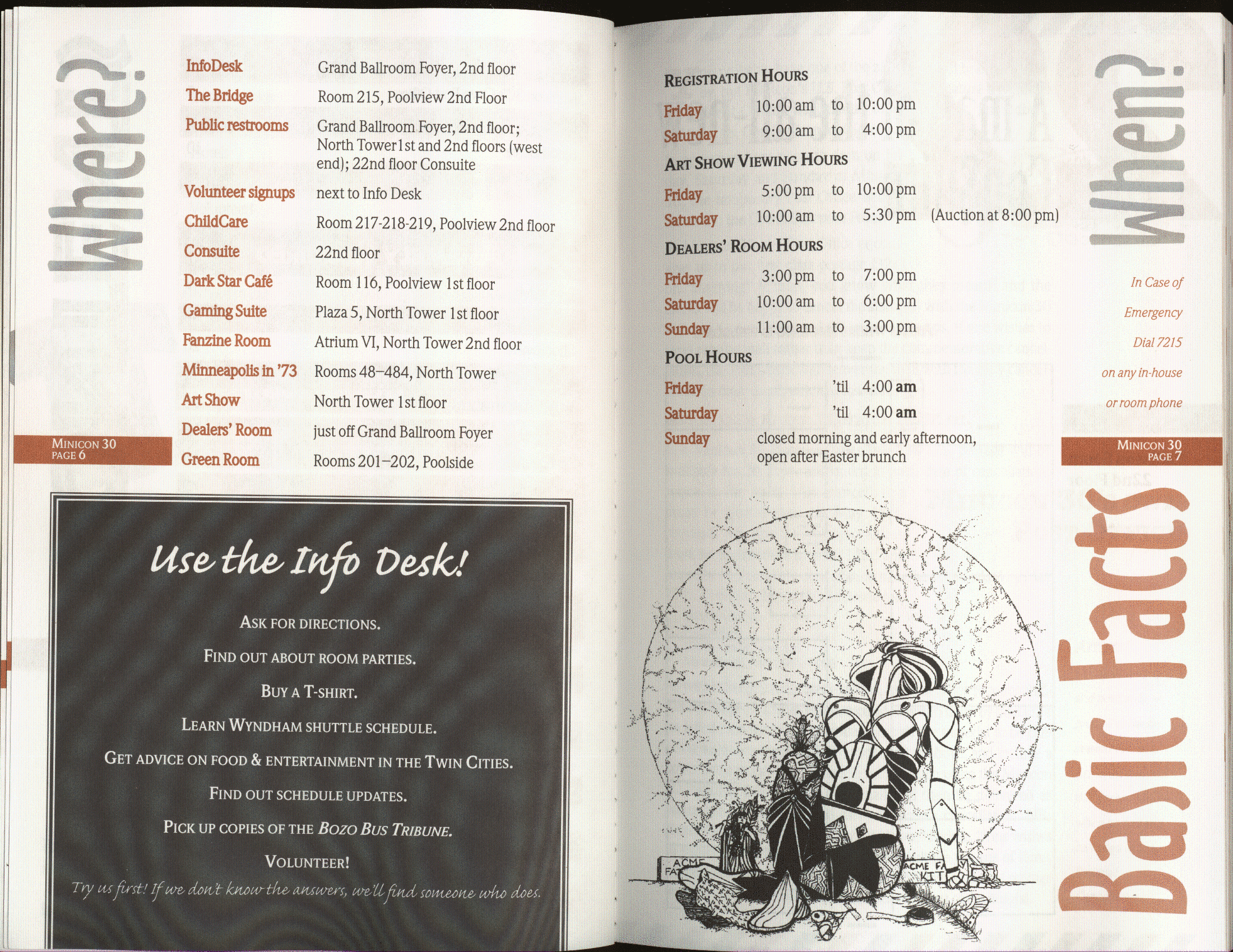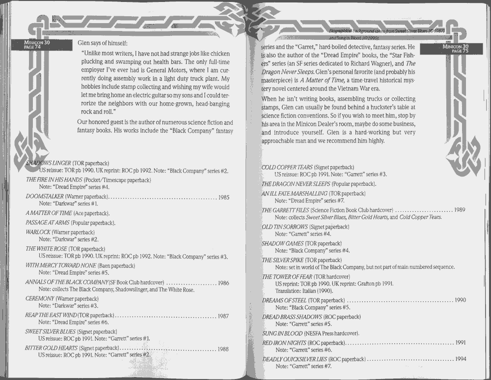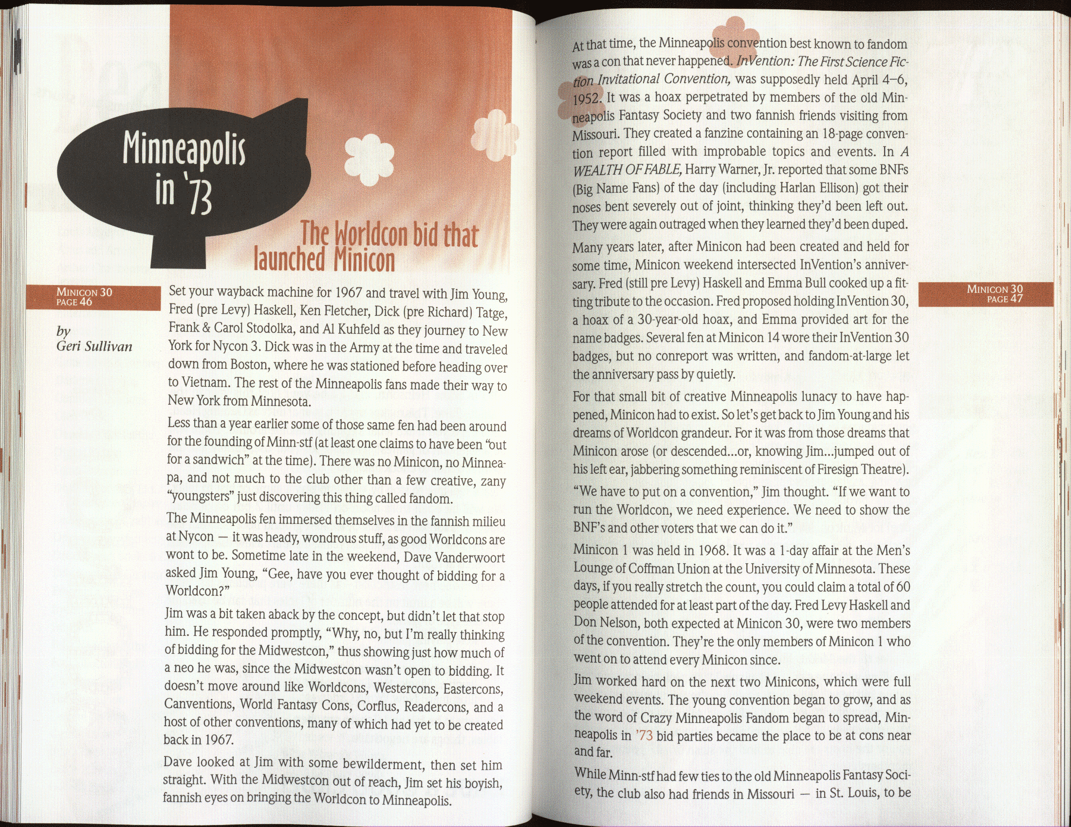Art by Jody Lee is © Jody Lee and reproduced here by permission. T-shirt art by James A. Kuehl is © James A. Kuehl and reproduced here by permission. Minicon 17 program book cover art by Kathy Marschall is © Kathy Grantham and is reproduced here by permission. Minicon 12, 13, and 15 program book cover art by Jim Odbert is © nybor mystical art 2009 and reproduced here by permission. Art by Derrick Dasenbrock, TL, and Larry Becker are © each of them. Advertisements remain property of the advertisers.