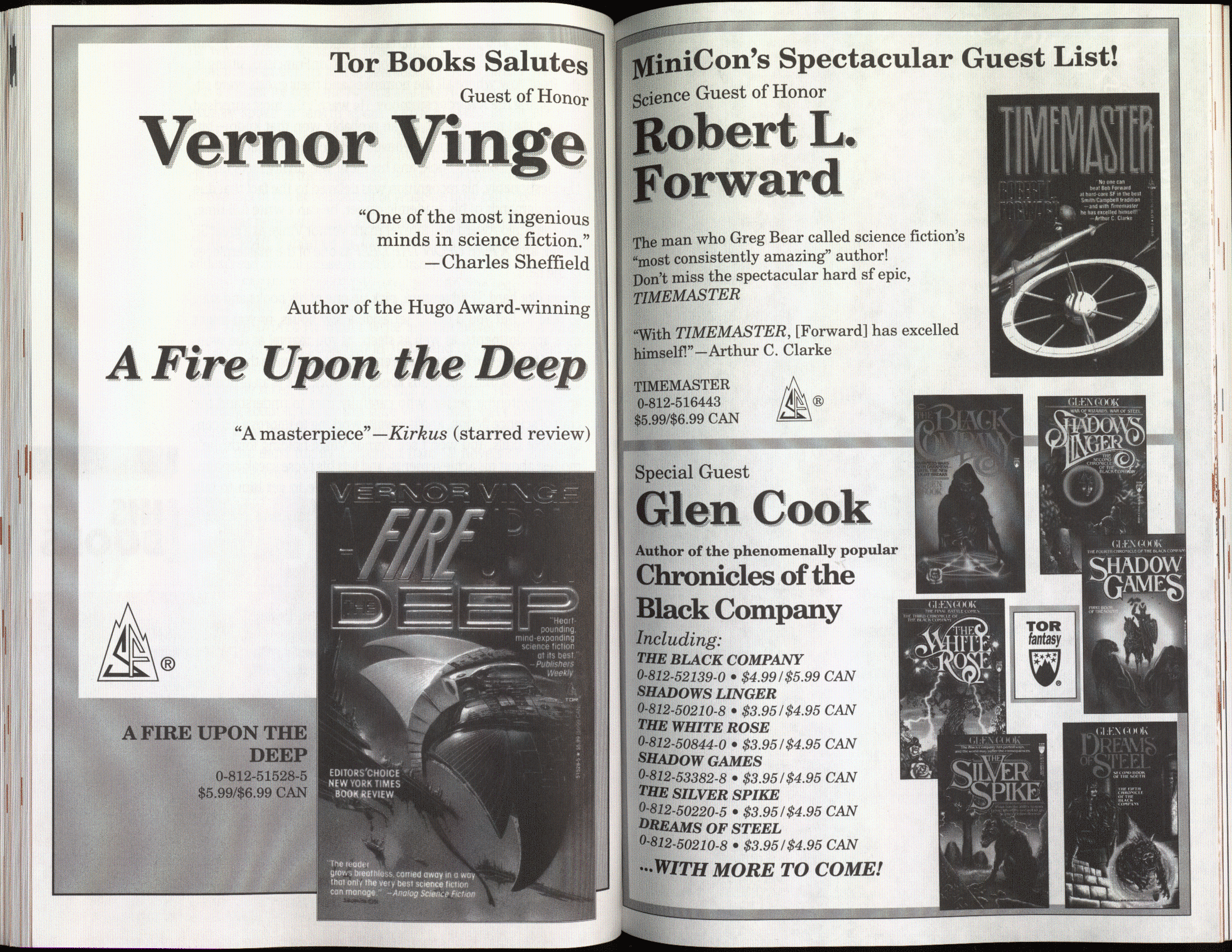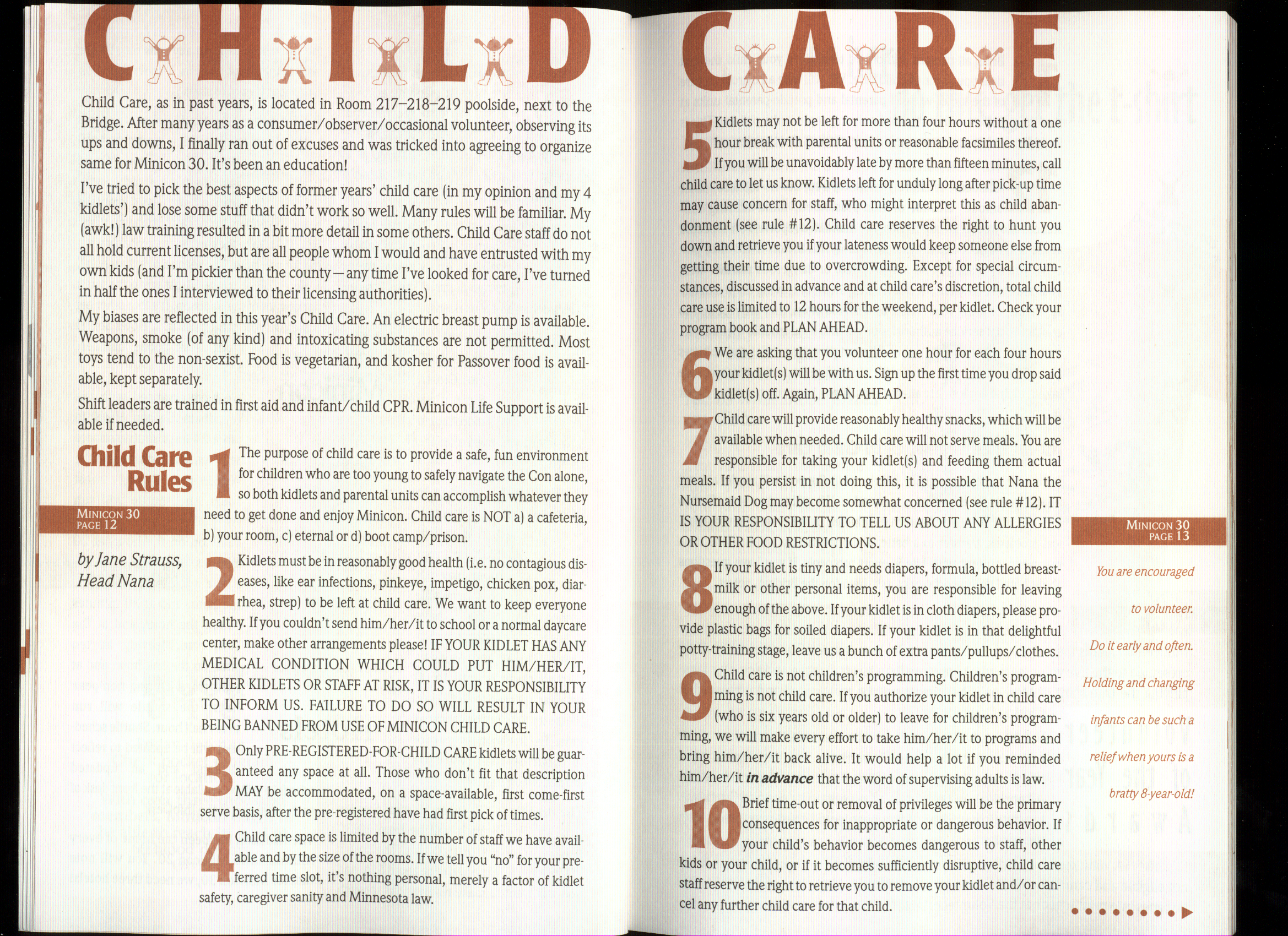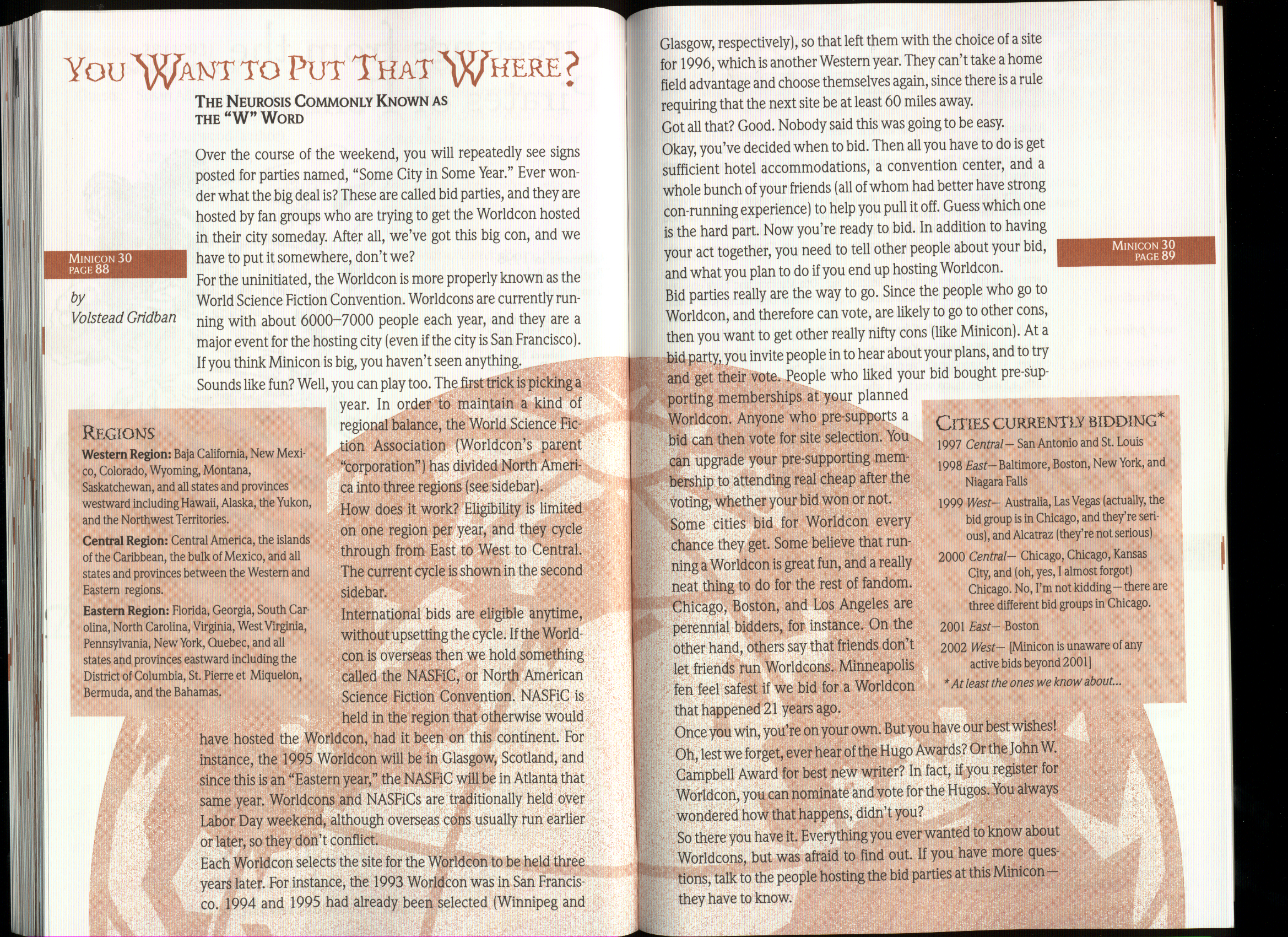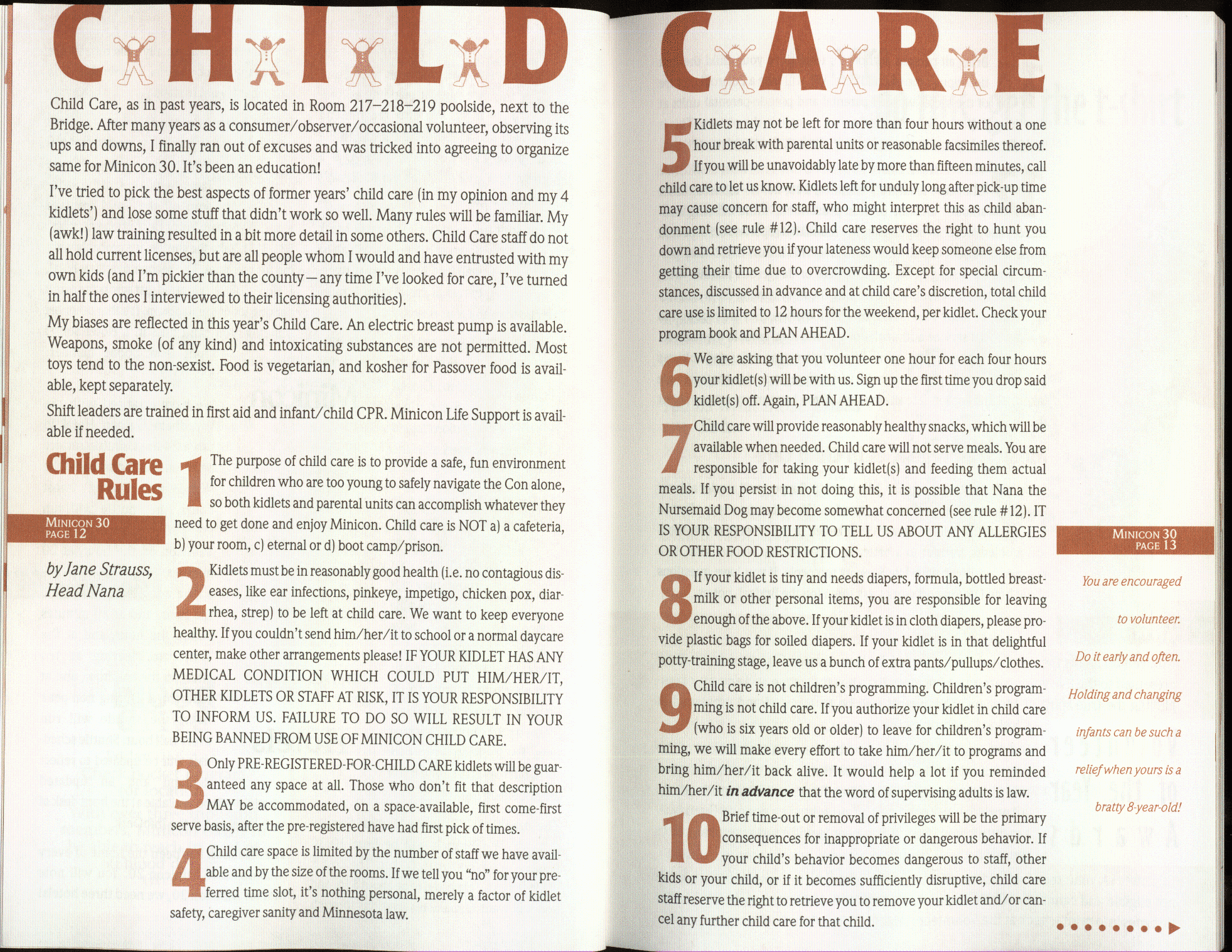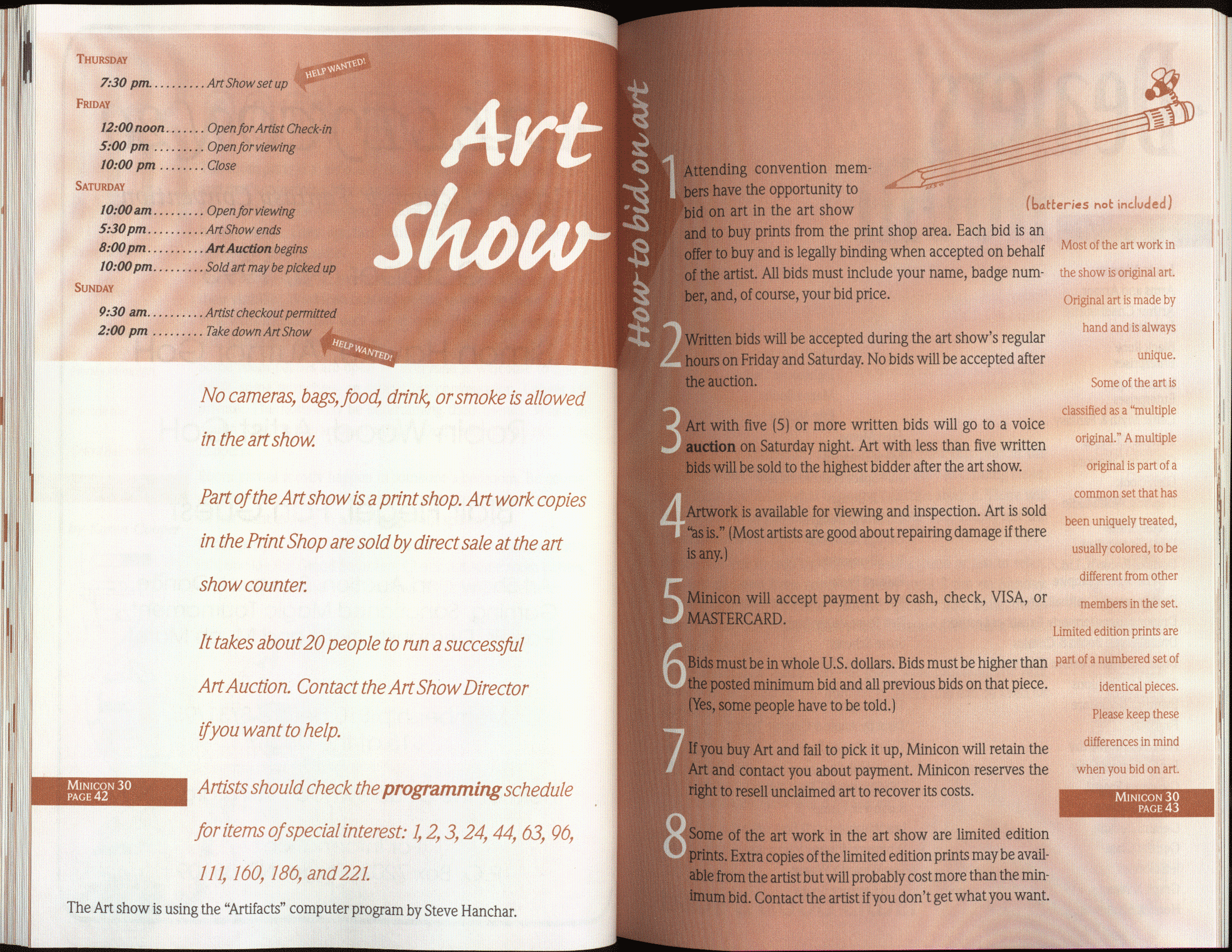 Art by Jody Lee is © Jody Lee and reproduced here by permission. T-shirt art by James A. Kuehl is © James A. Kuehl and reproduced here by permission. Minicon 17 program book cover art by Kathy Marschall is © Kathy Grantham and is reproduced here by permission. Minicon 12, 13, and 15 program book cover art by Jim Odbert is © nybor mystical art 2009 and reproduced here by permission. Art by Derrick Dasenbrock, TL, and Larry Becker are © each of them. Advertisements remain property of the advertisers.