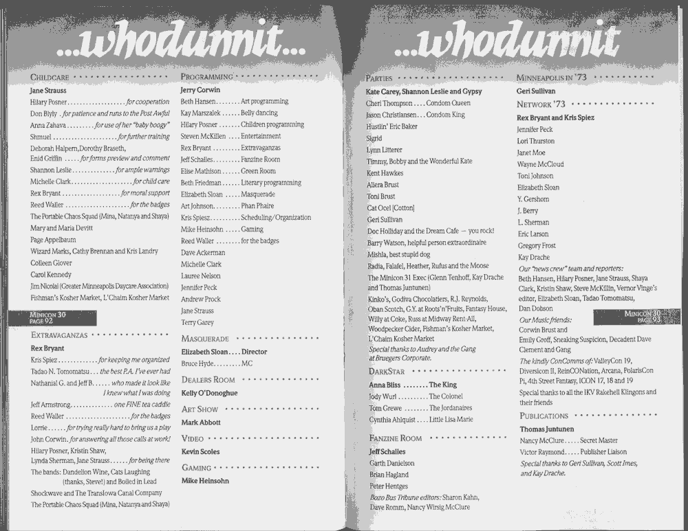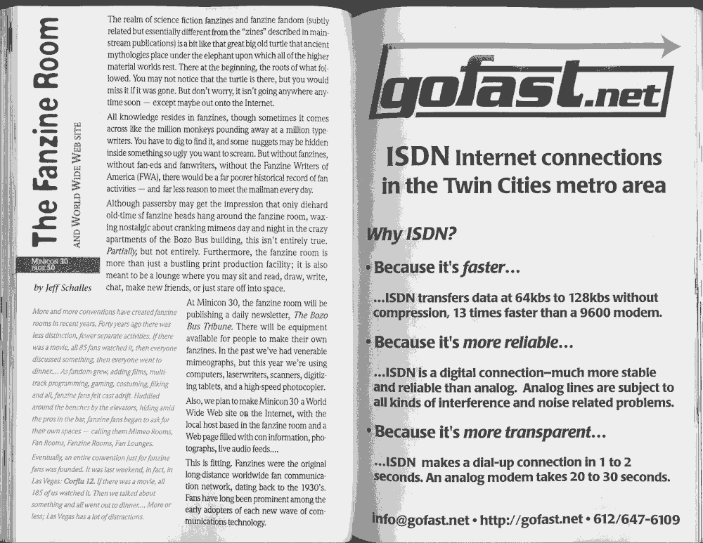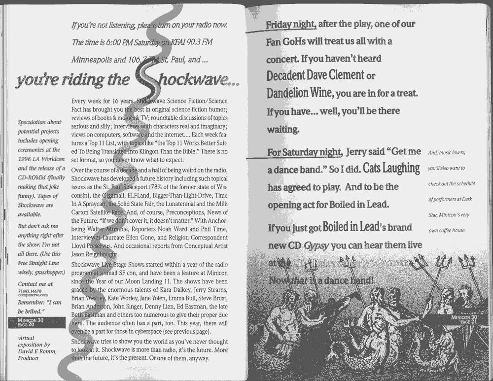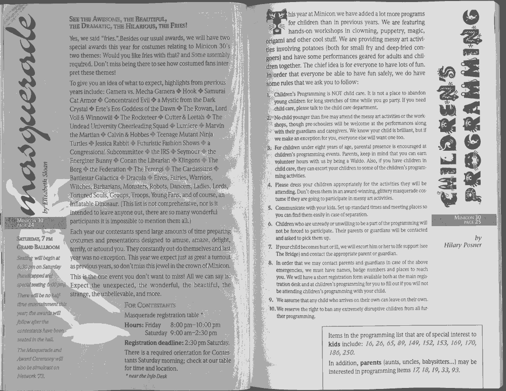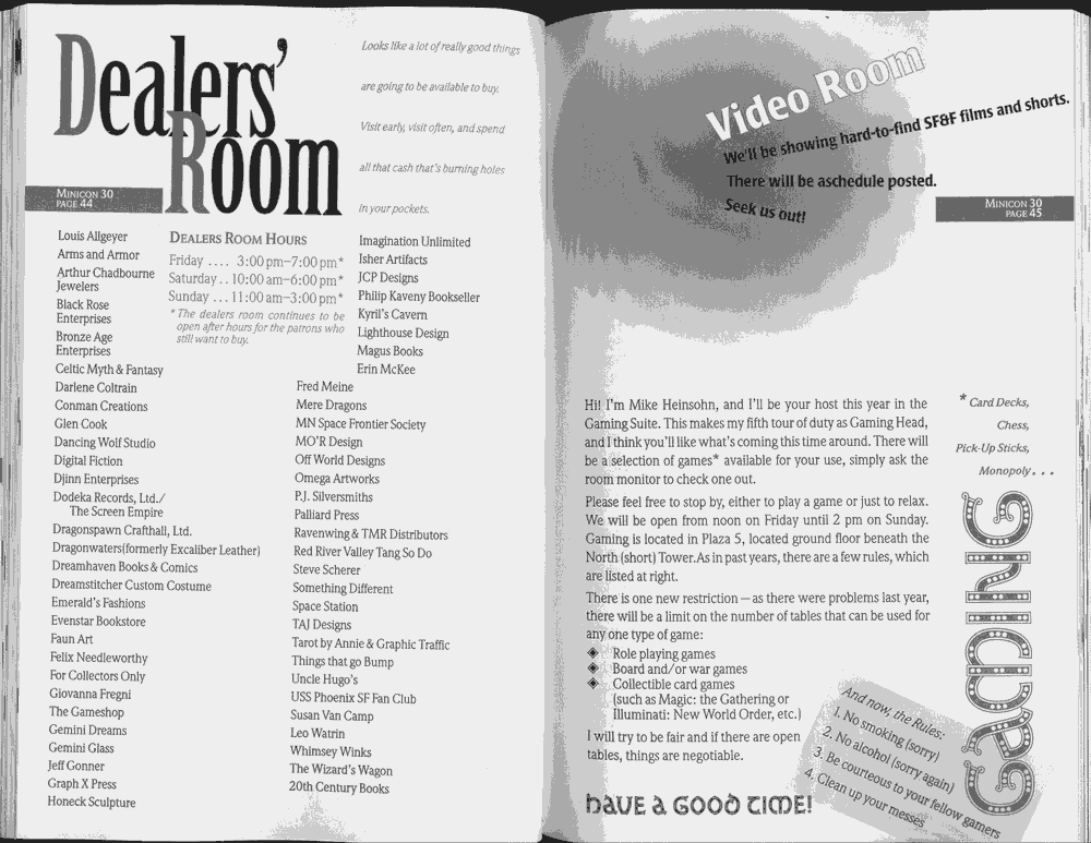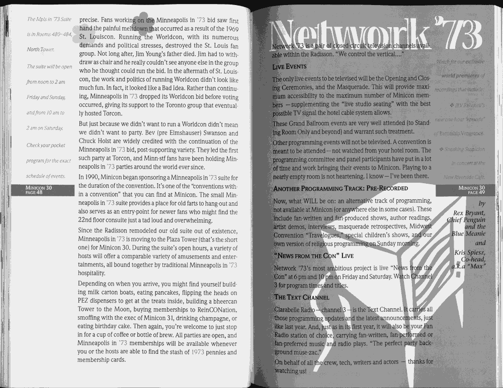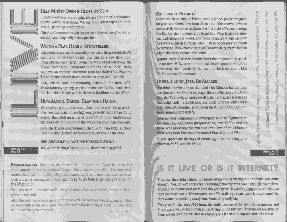 Minicon 30 was held in the very early days of the World Wide Web and featured webpages served from a computer in the convention hotel, which were developed and maintained during the convention.