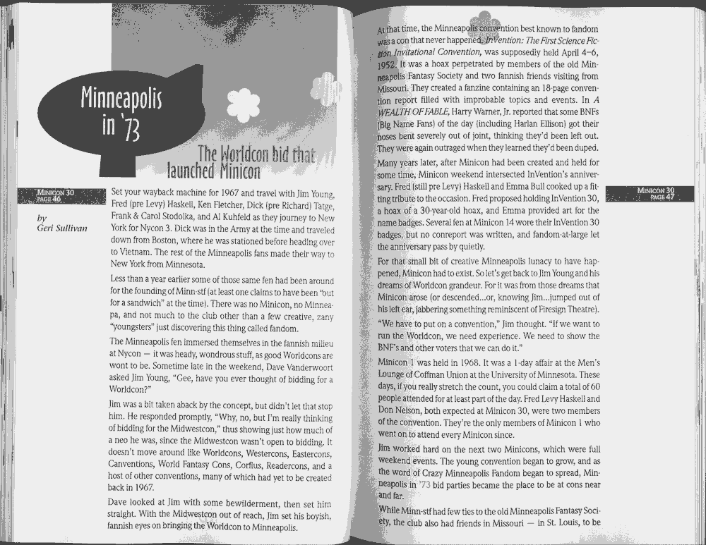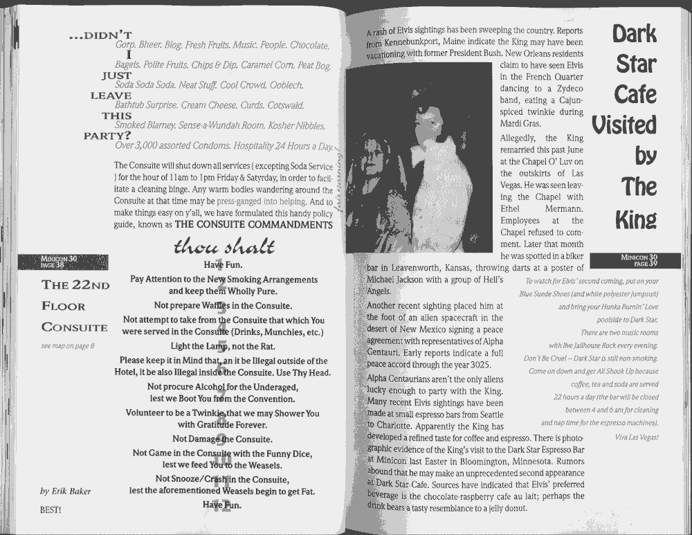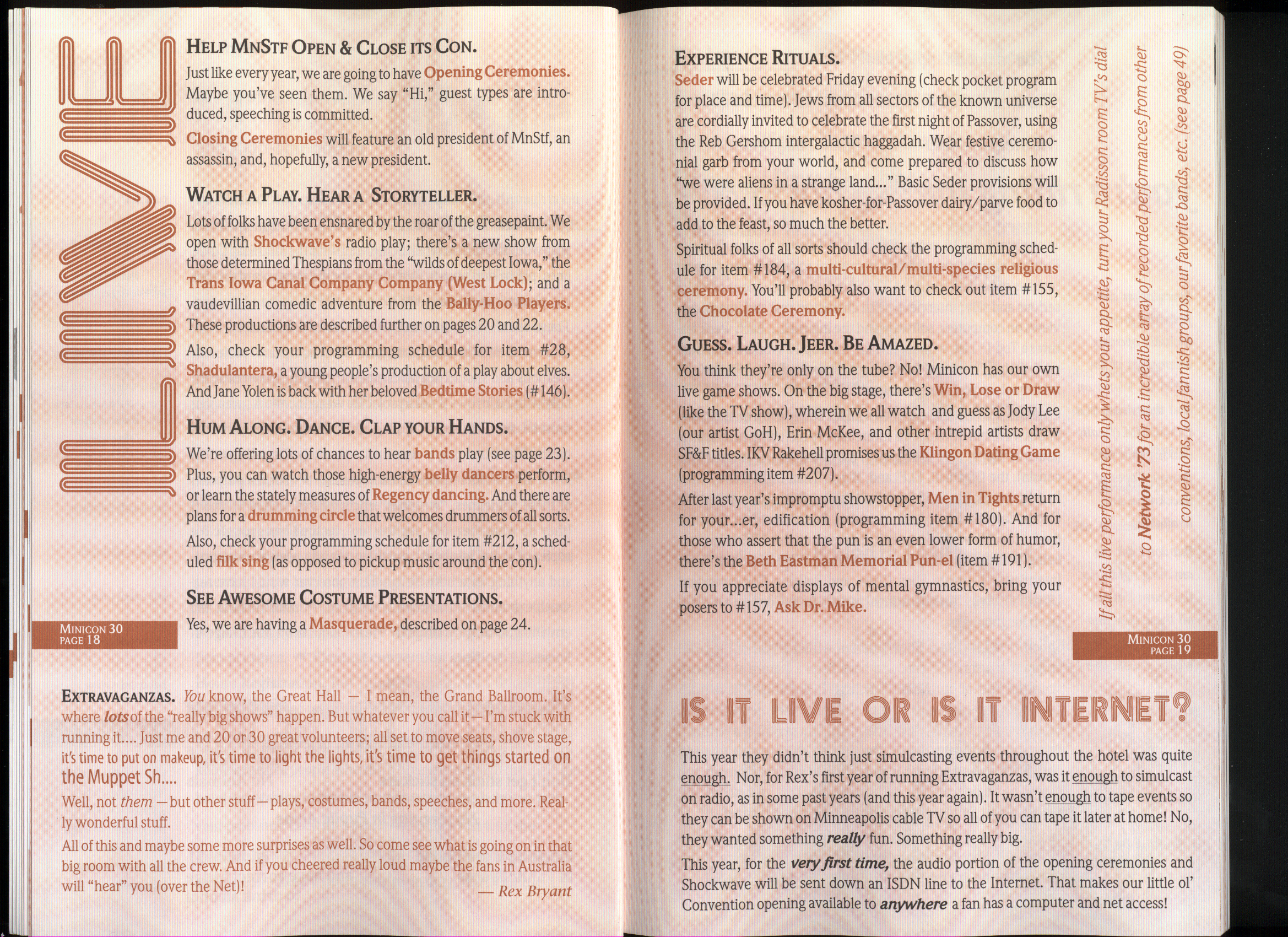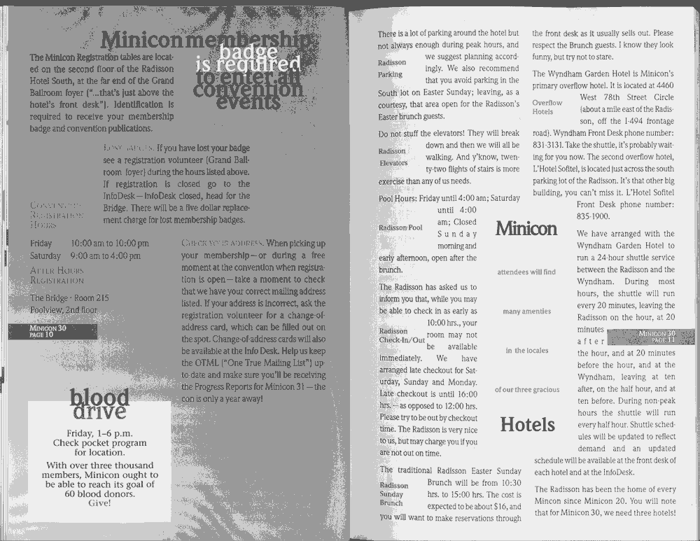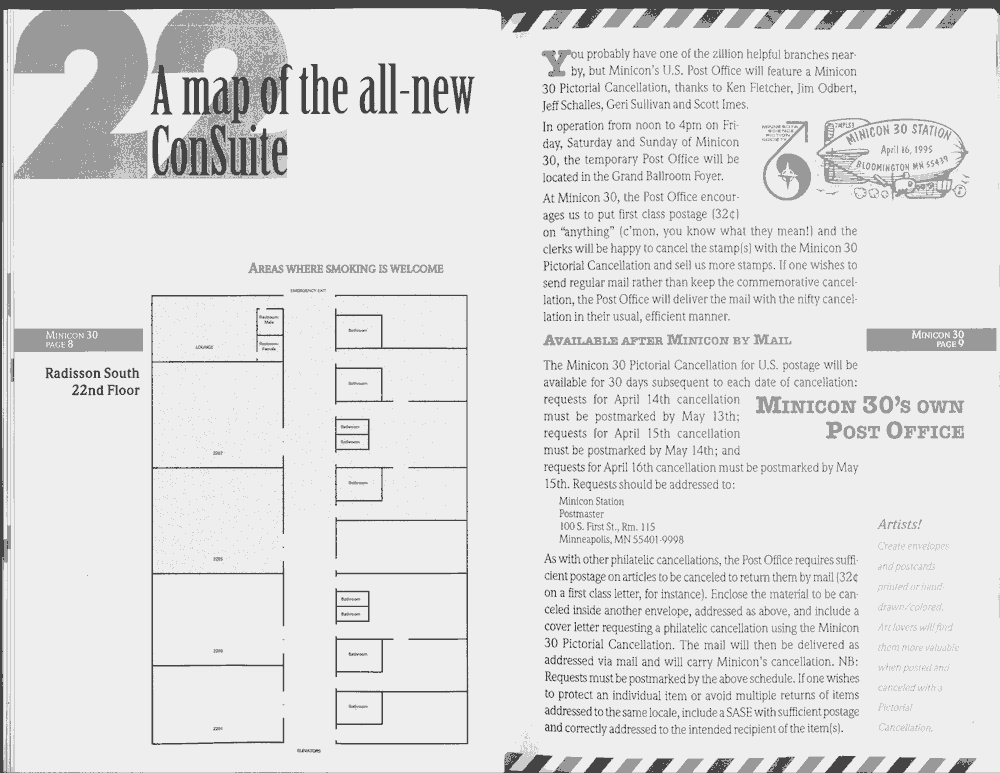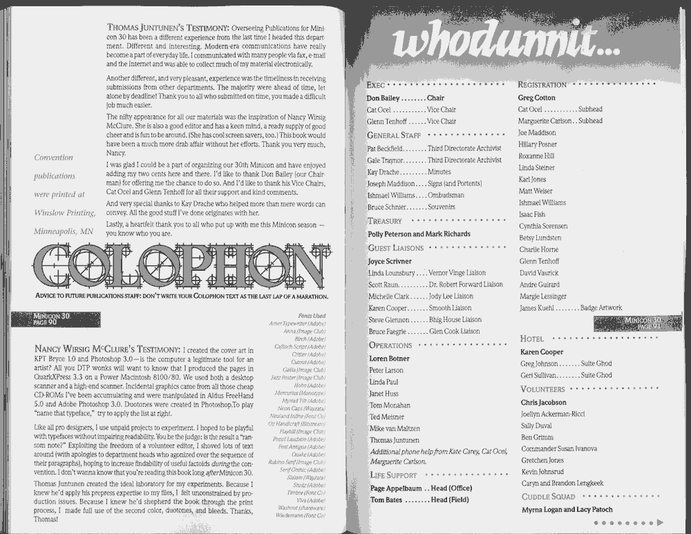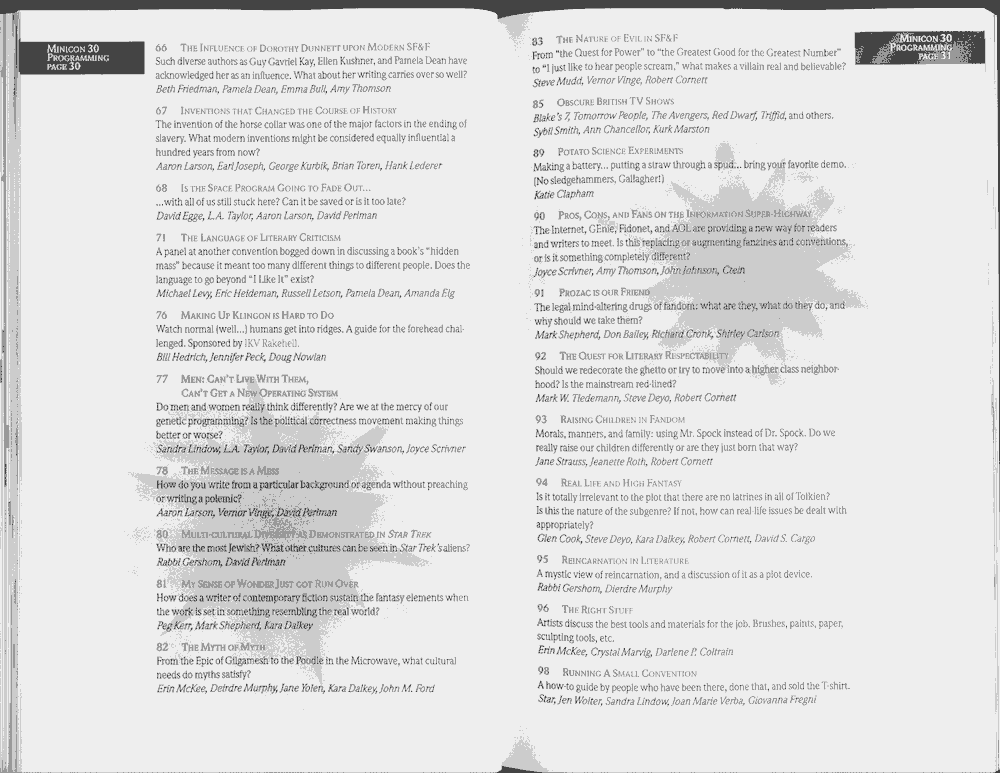 Minicon 30 was held in the very early days of the World Wide Web and featured webpages served from a computer in the convention hotel, which were developed and maintained during the convention.