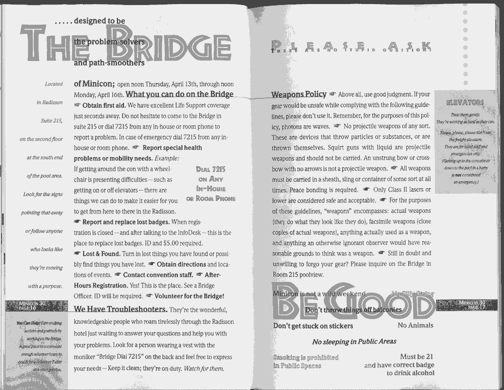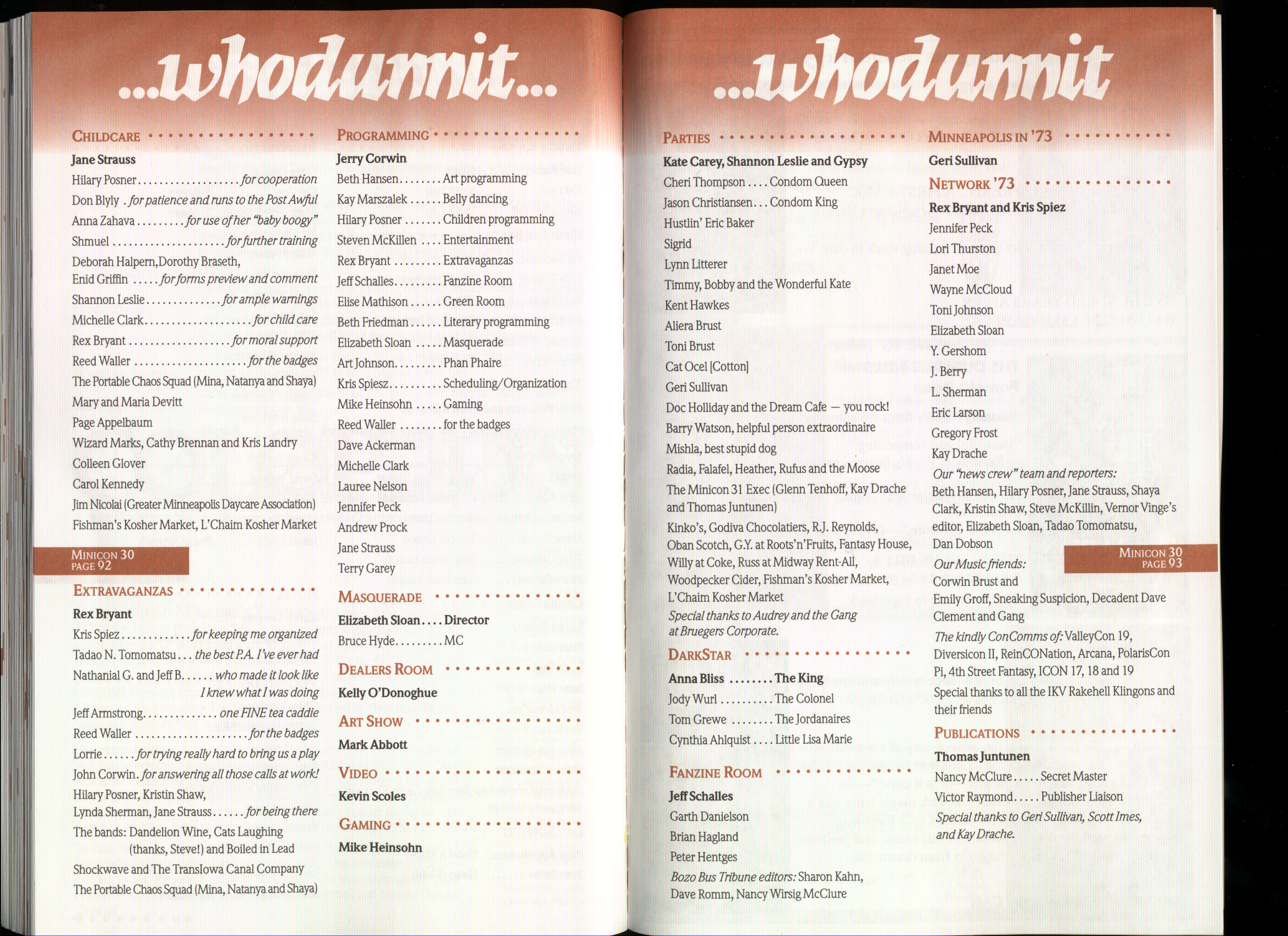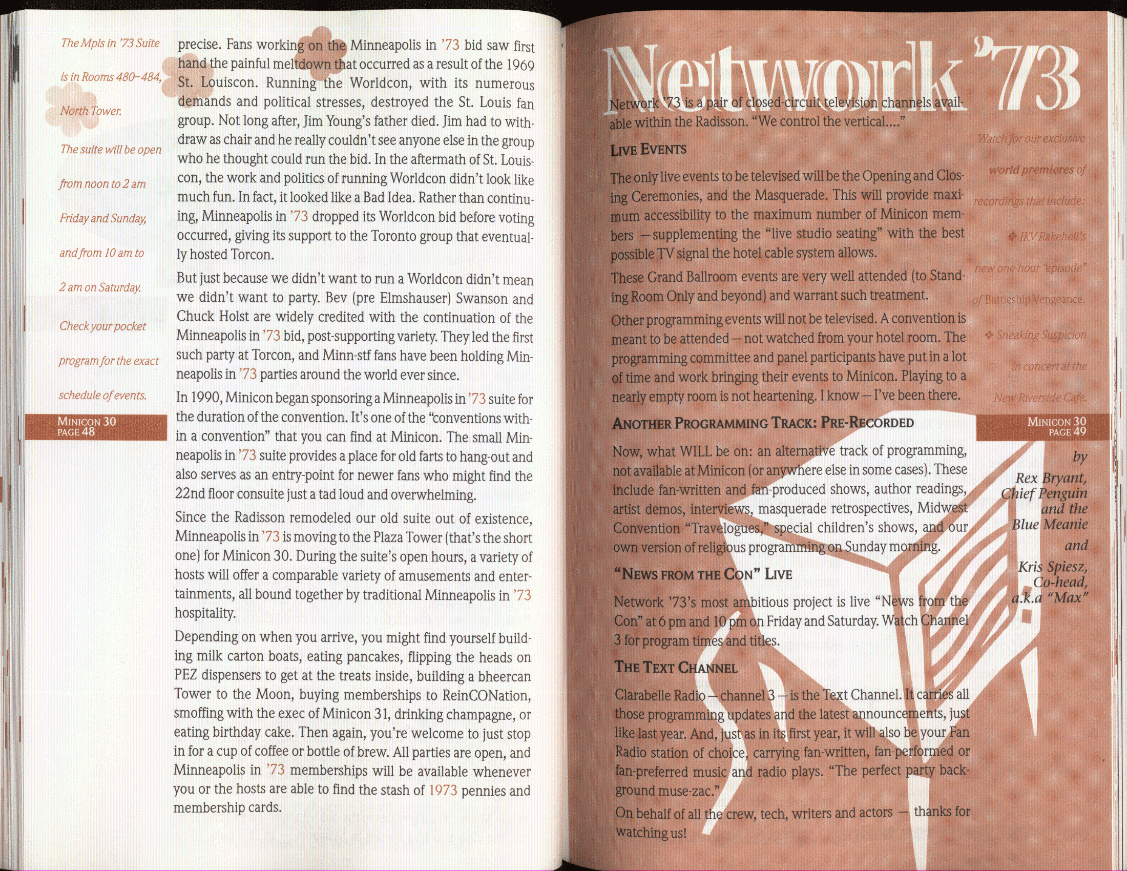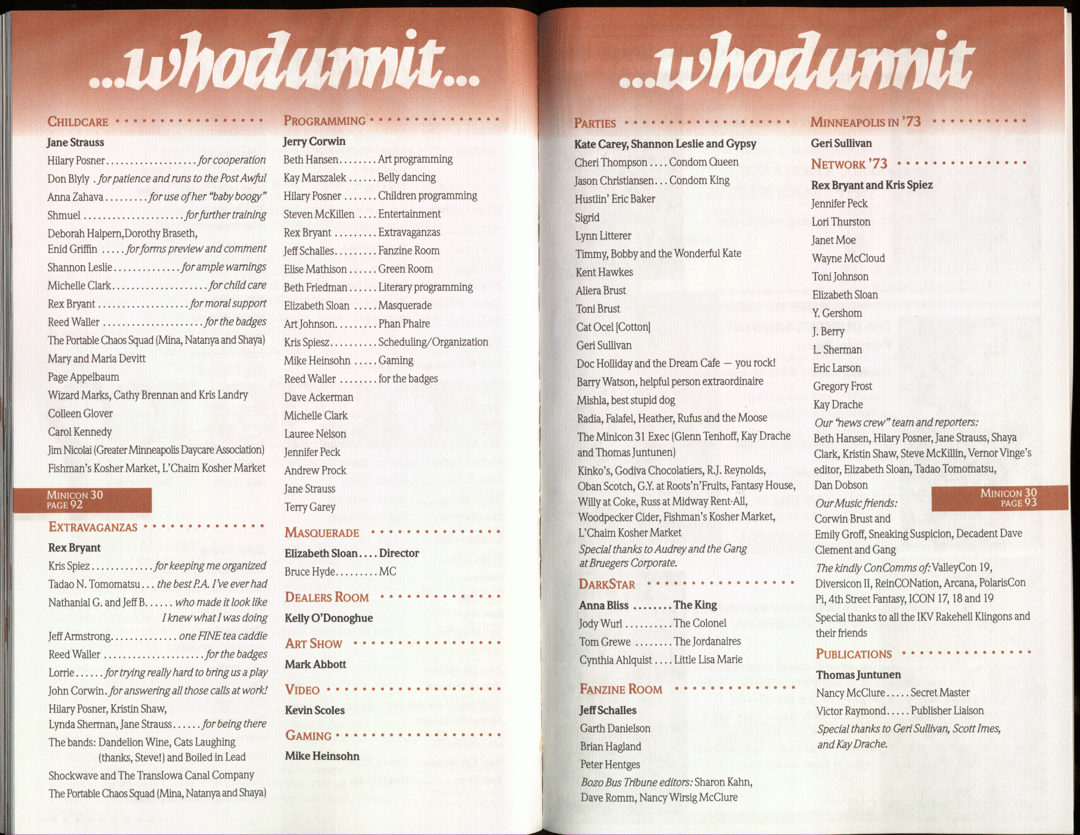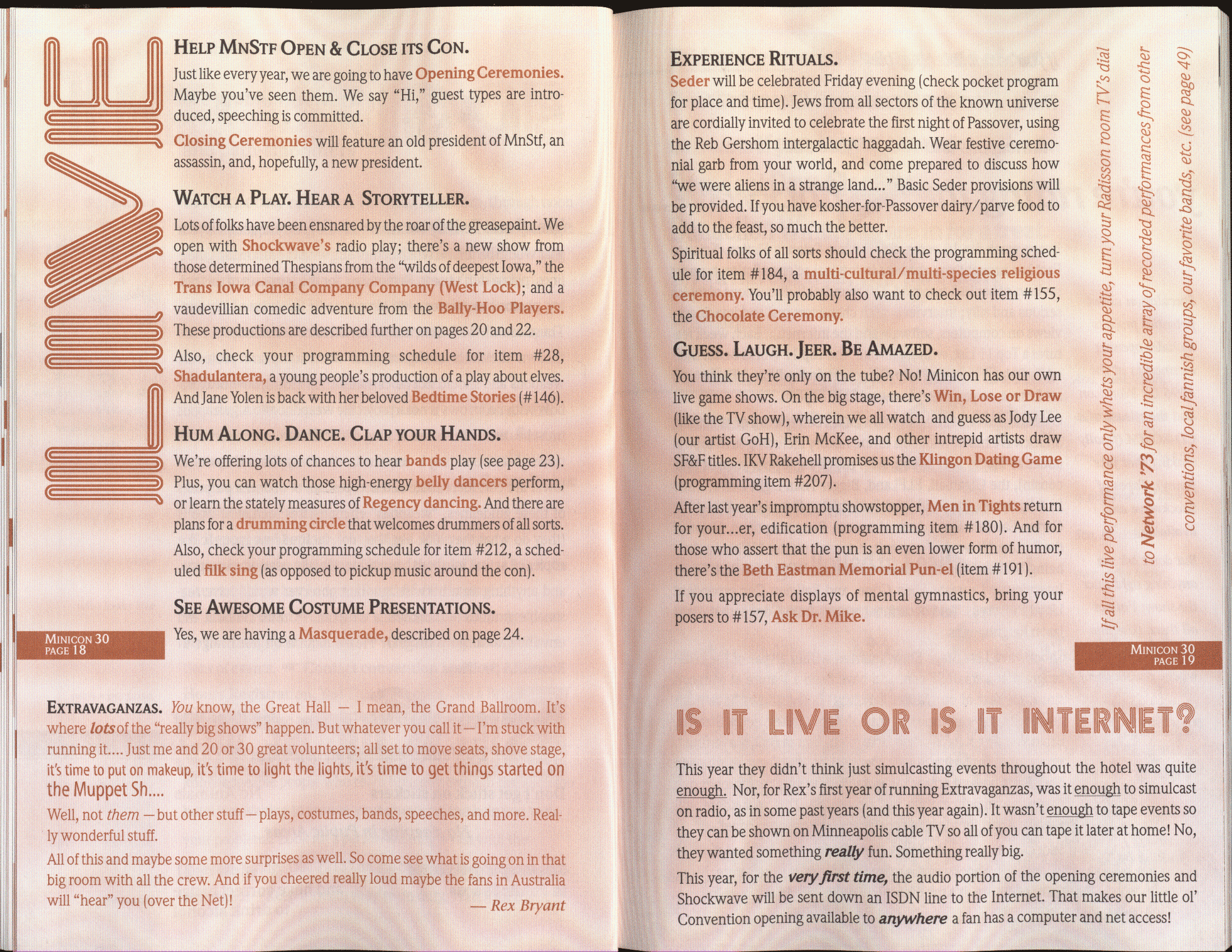 Minicon 30 was held in the very early days of the World Wide Web and featured webpages served from a computer in the convention hotel, which were developed and maintained during the convention.