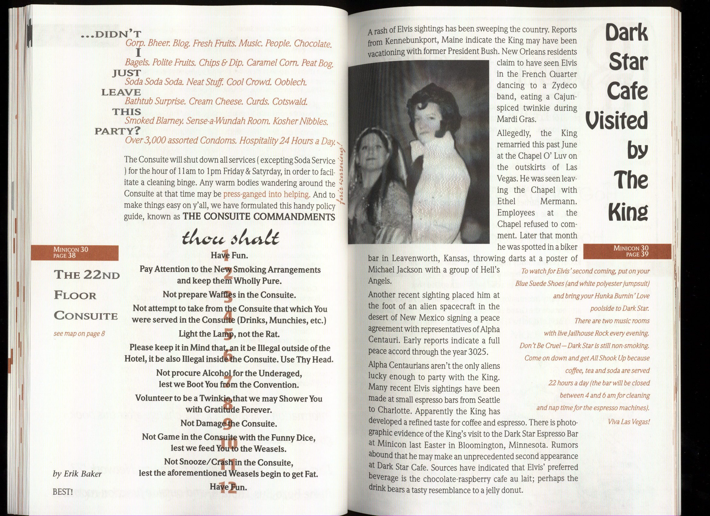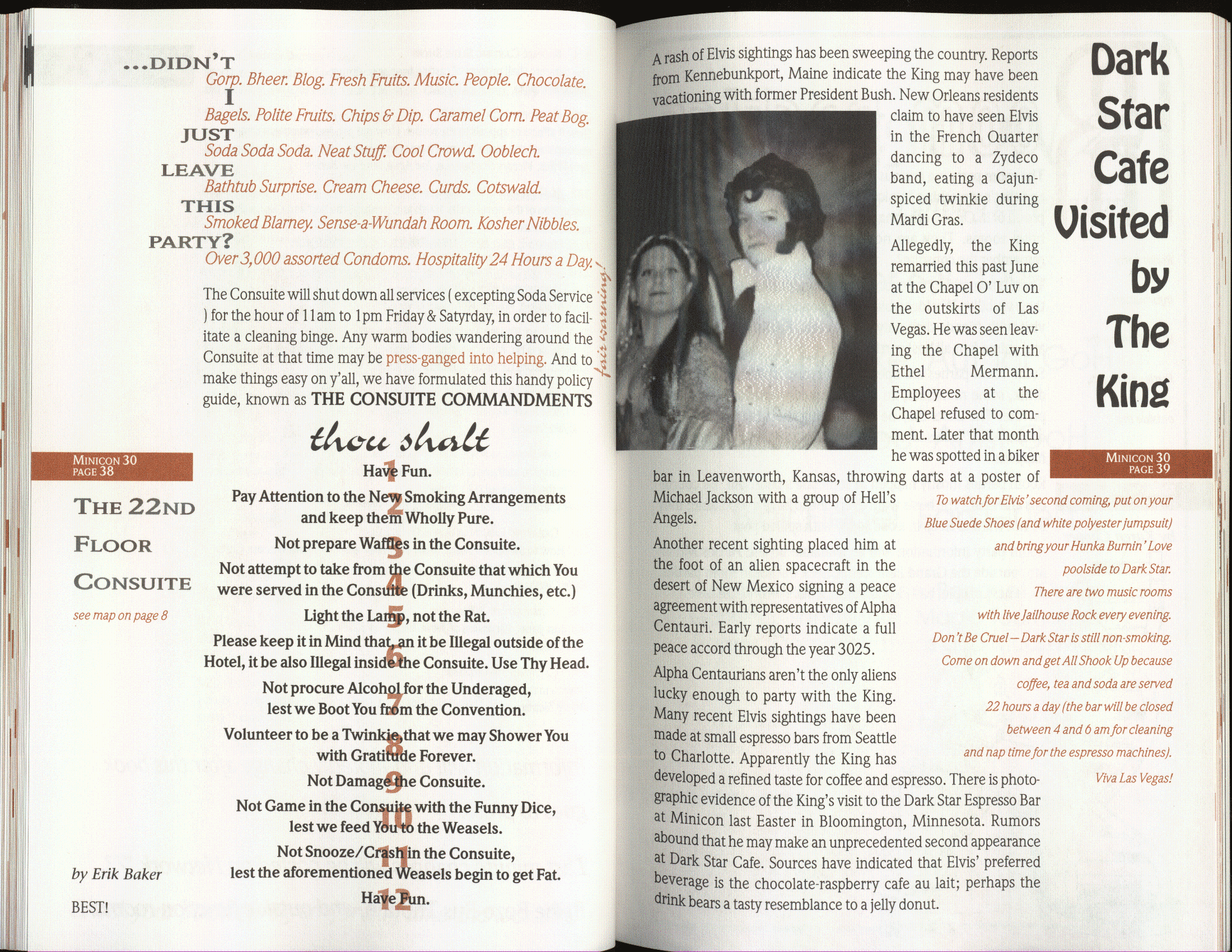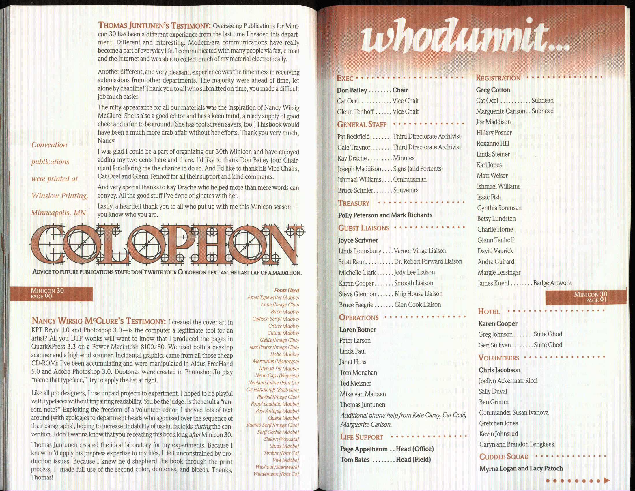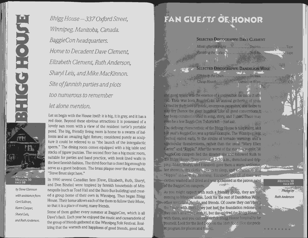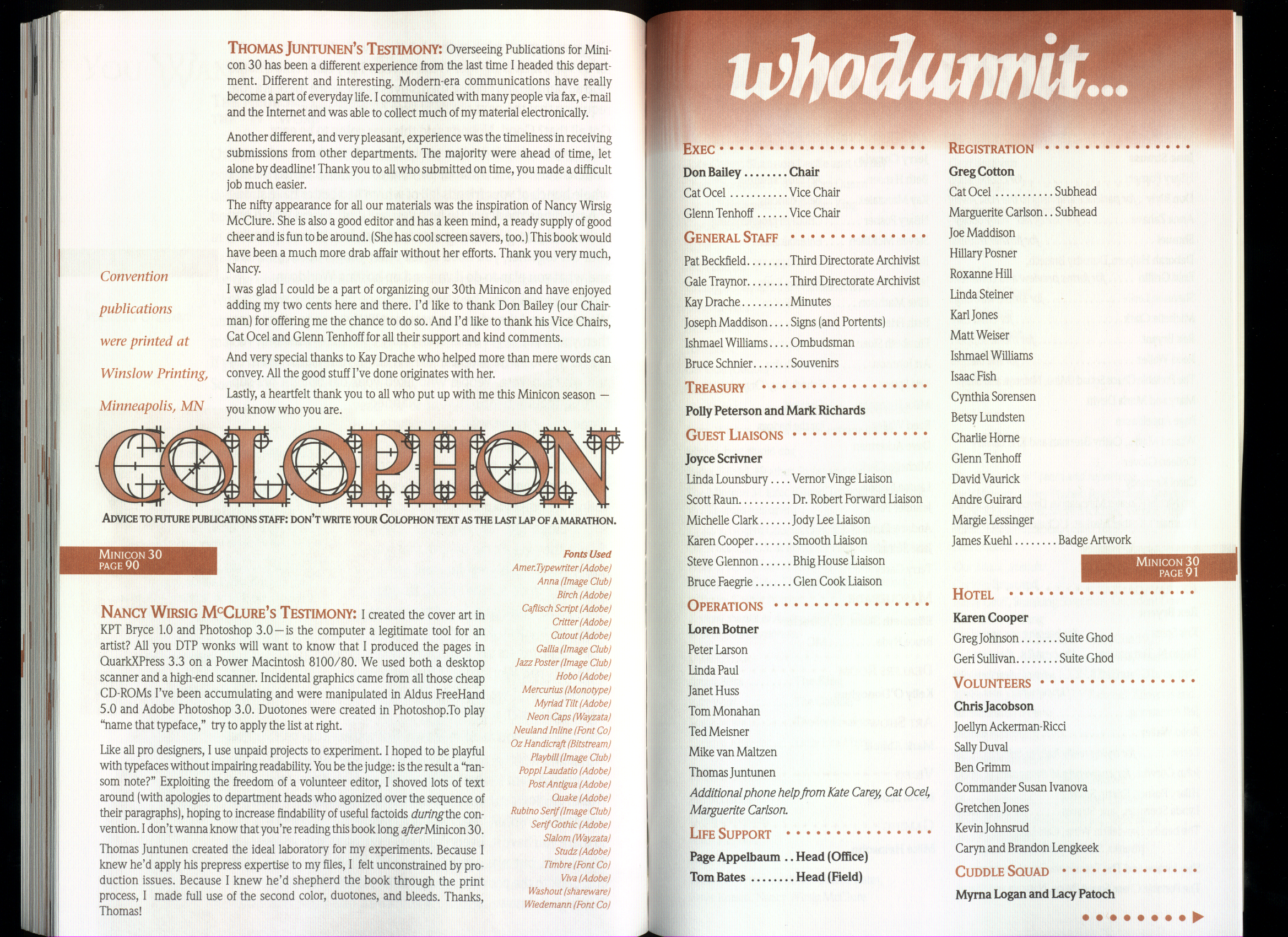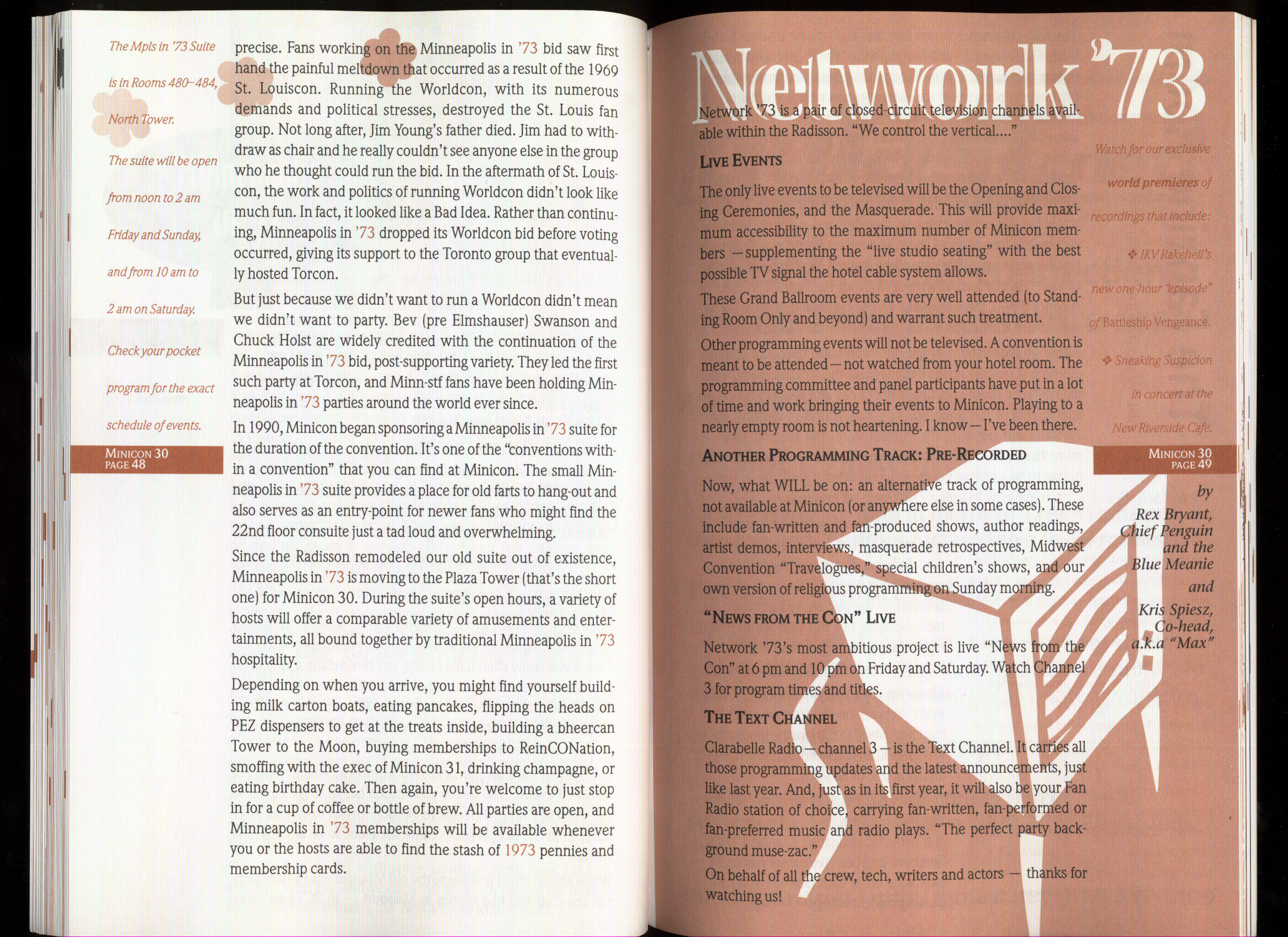 Minicon 30 was held in the very early days of the World Wide Web and featured webpages served from a computer in the convention hotel, which were developed and maintained during the convention.