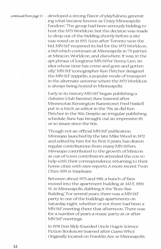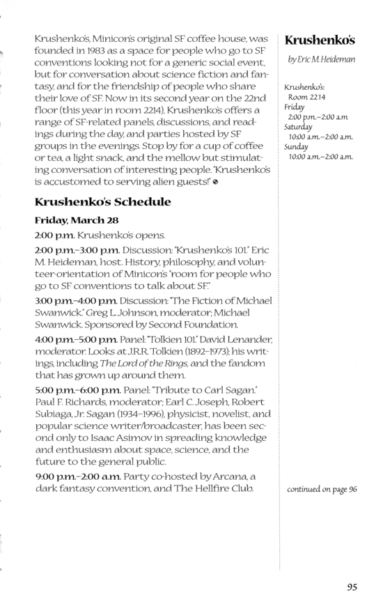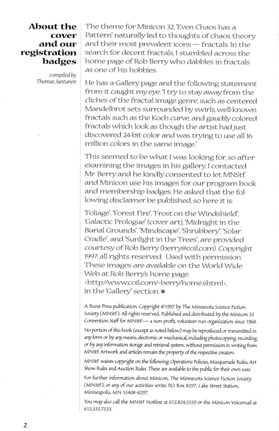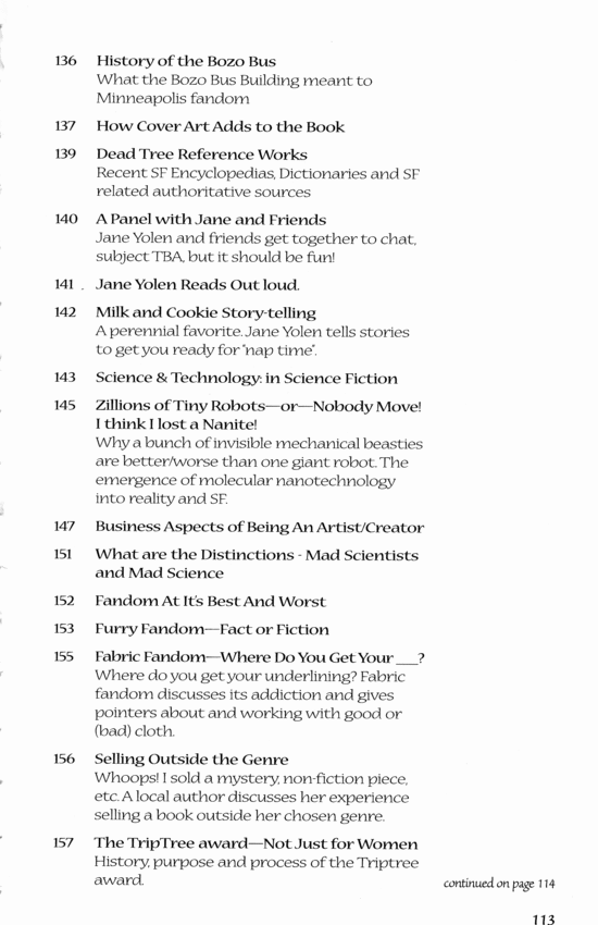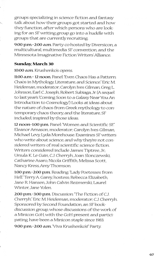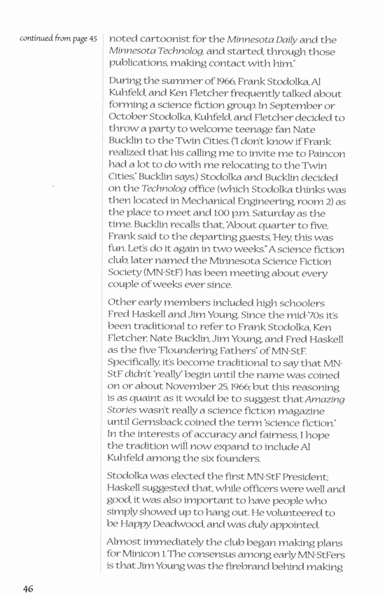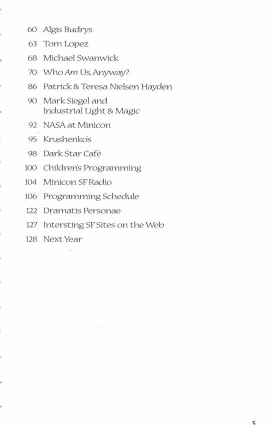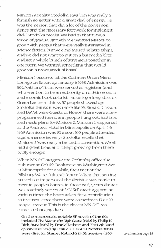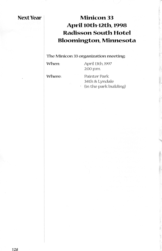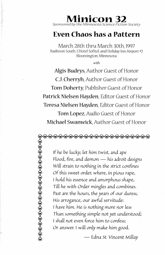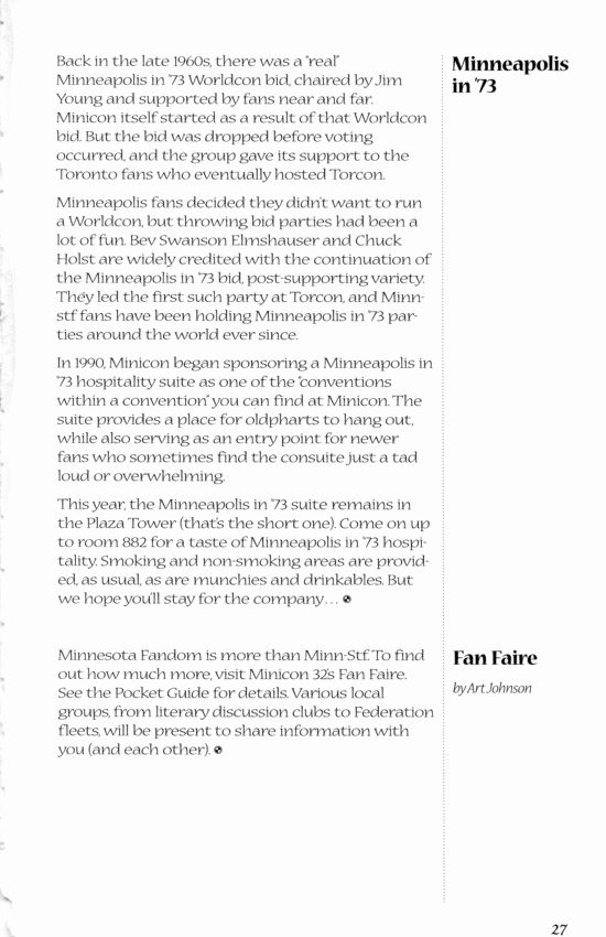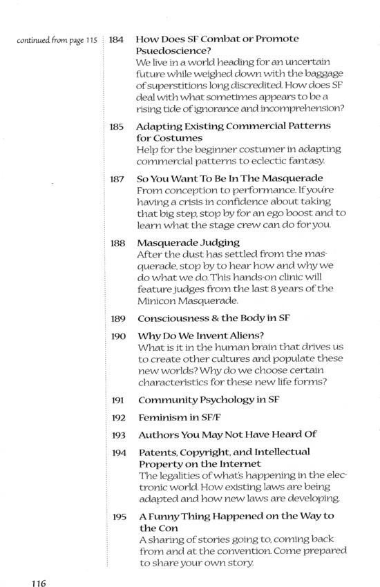 This page is part of an archive and is available for historical reference only; for information on recent and upcoming Minicons, please visit www.mnstf.org/minicon/ Information on these pages may not reflect current Minicon and Minn-StF policies, functions, contact info, etc. For information about the Minnesota Science Fiction Society, the organization that has been putting on Minicon since 1968, please visit www.mnstf.org. |