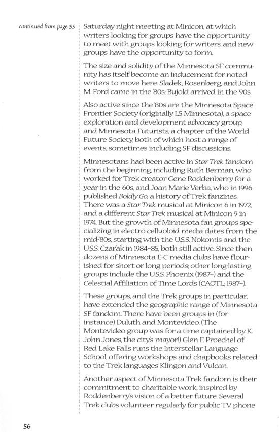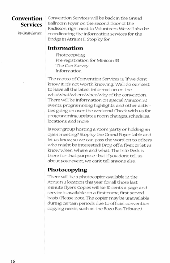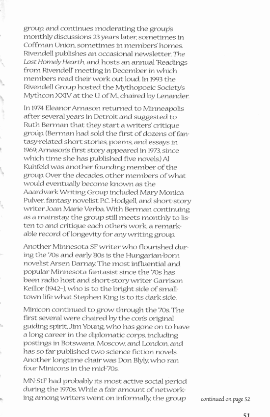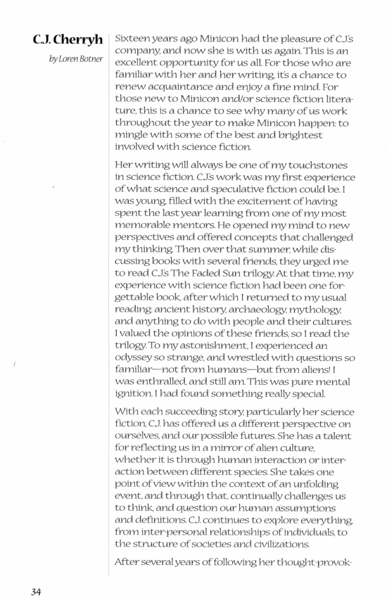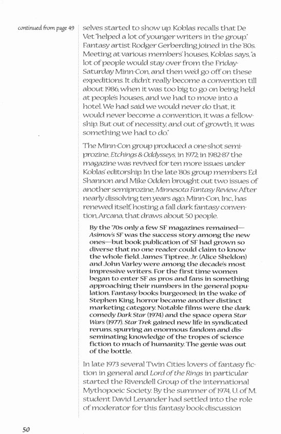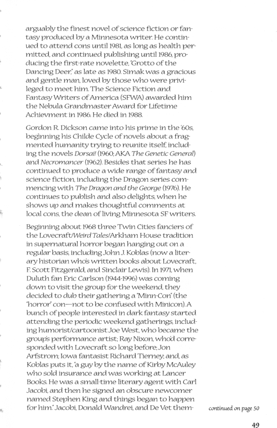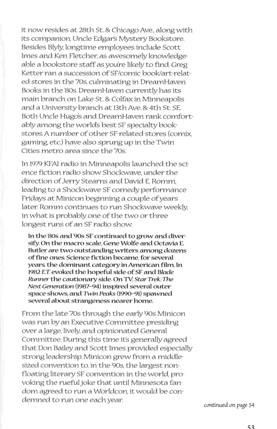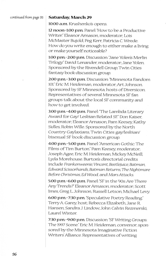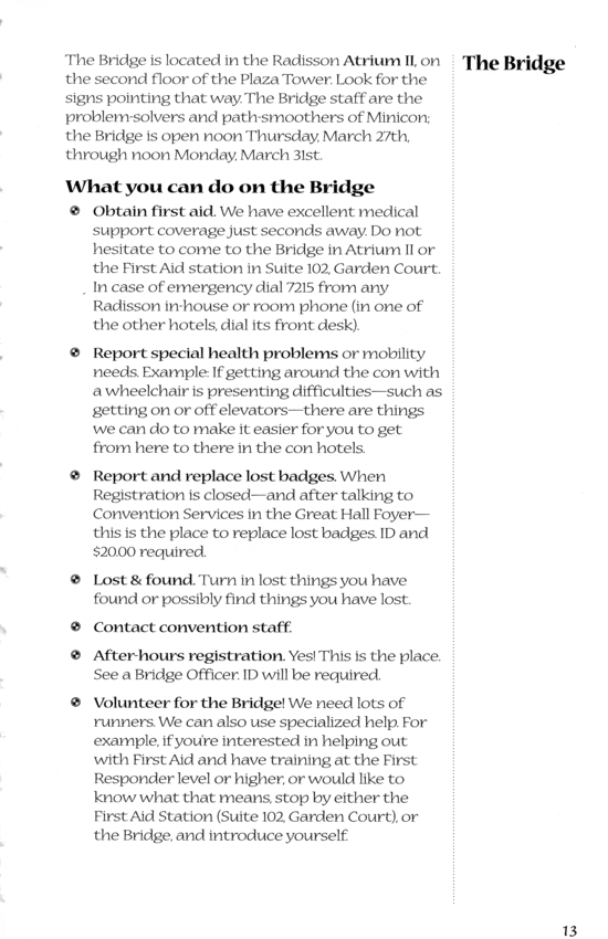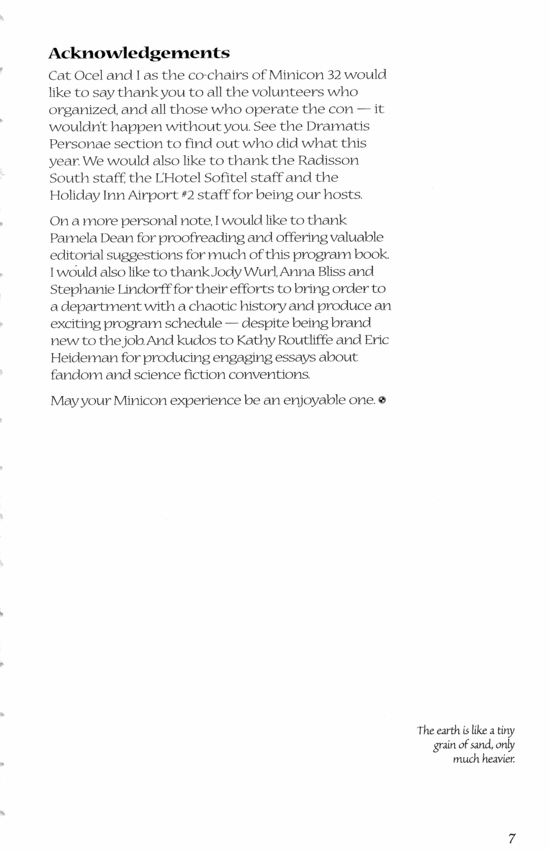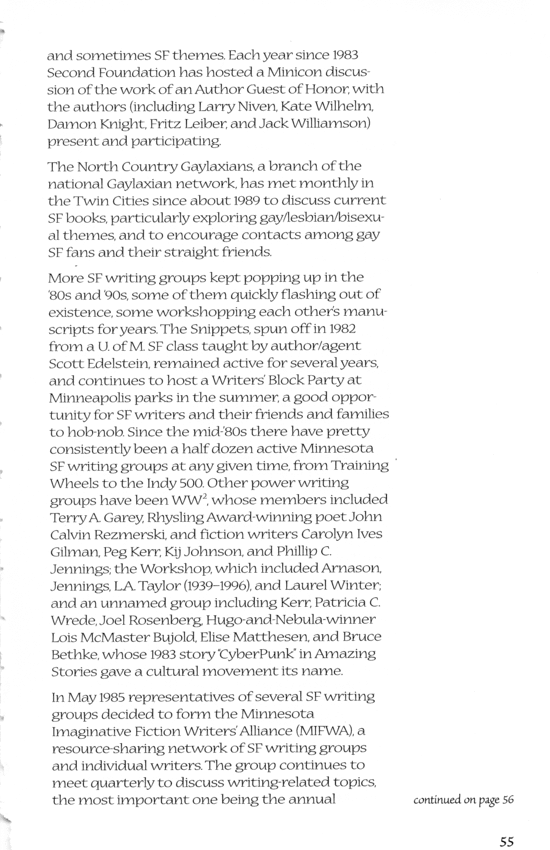 This page is part of an archive and is available for historical reference only; for information on recent and upcoming Minicons, please visit www.mnstf.org/minicon/ Information on these pages may not reflect current Minicon and Minn-StF policies, functions, contact info, etc. For information about the Minnesota Science Fiction Society, the organization that has been putting on Minicon since 1968, please visit www.mnstf.org. |