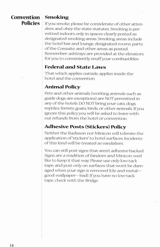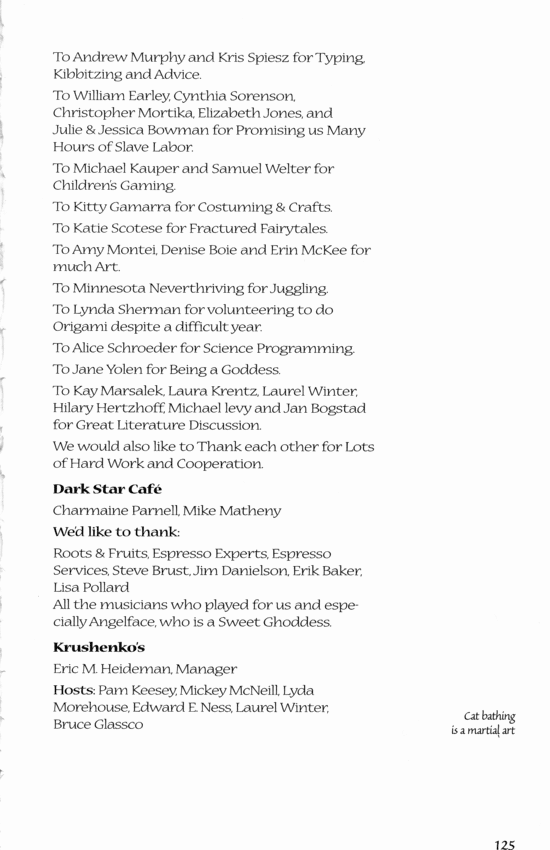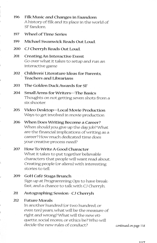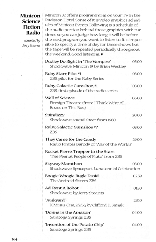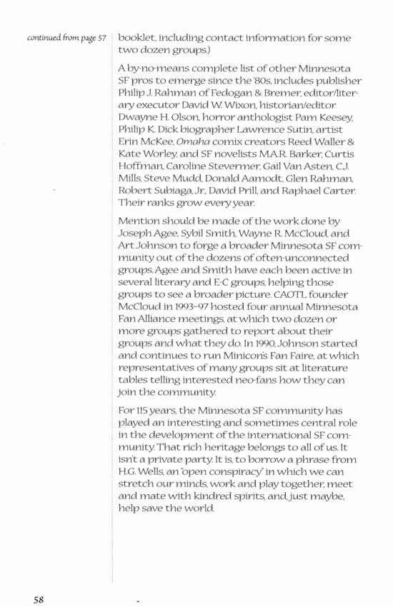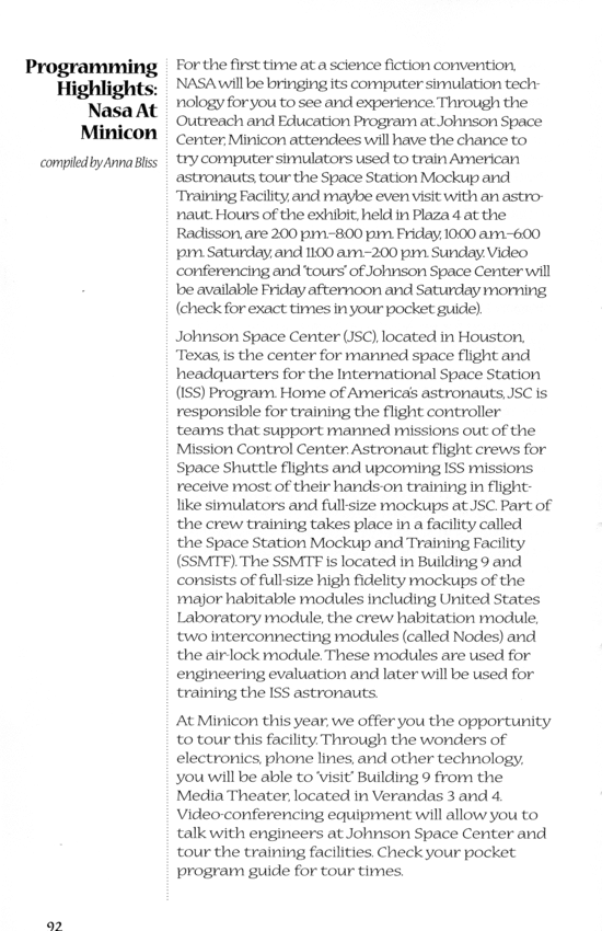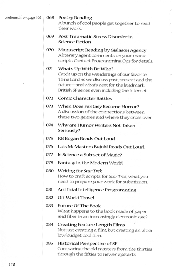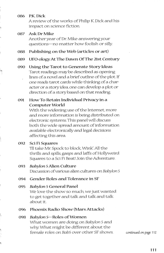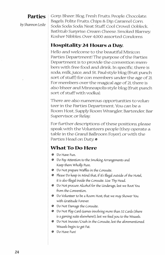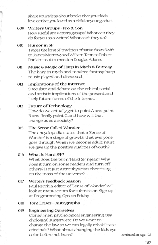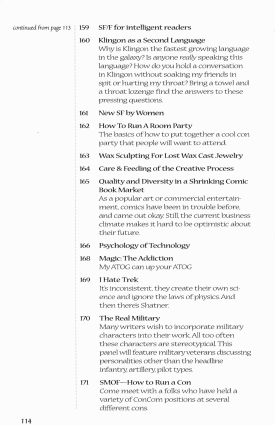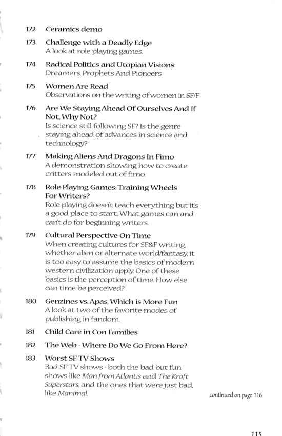 This page is part of an archive and is available for historical reference only; for information on recent and upcoming Minicons, please visit www.mnstf.org/minicon/ Information on these pages may not reflect current Minicon and Minn-StF policies, functions, contact info, etc. For information about the Minnesota Science Fiction Society, the organization that has been putting on Minicon since 1968, please visit www.mnstf.org. |
