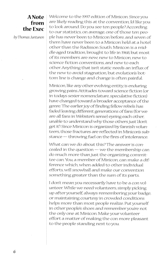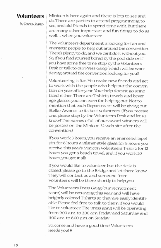 Nearly all the work on Minicon is done by volunteers (we hire a very few people for very special positions, such as security guards who spend the night guarding the art show and the dealers' room).