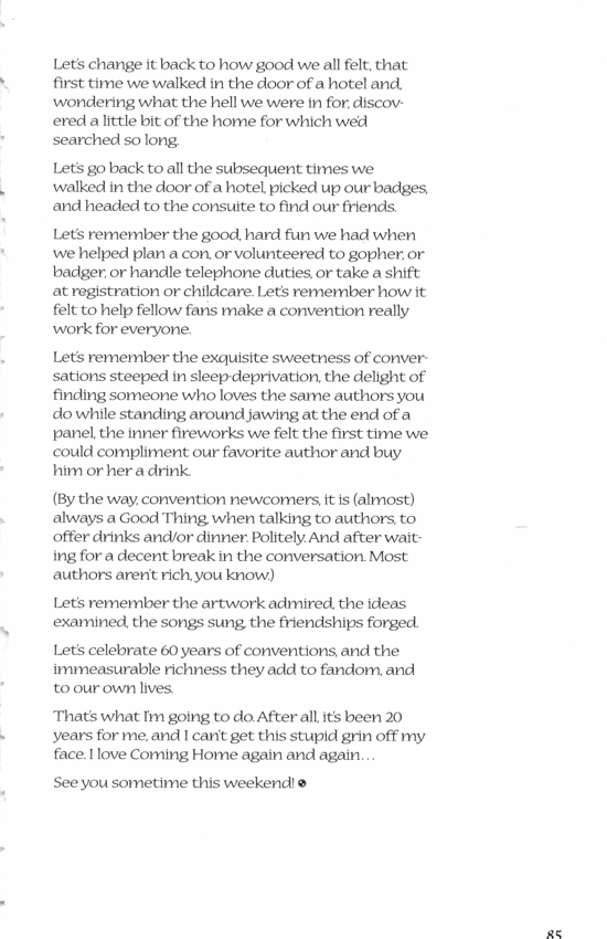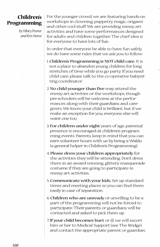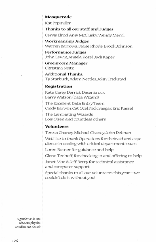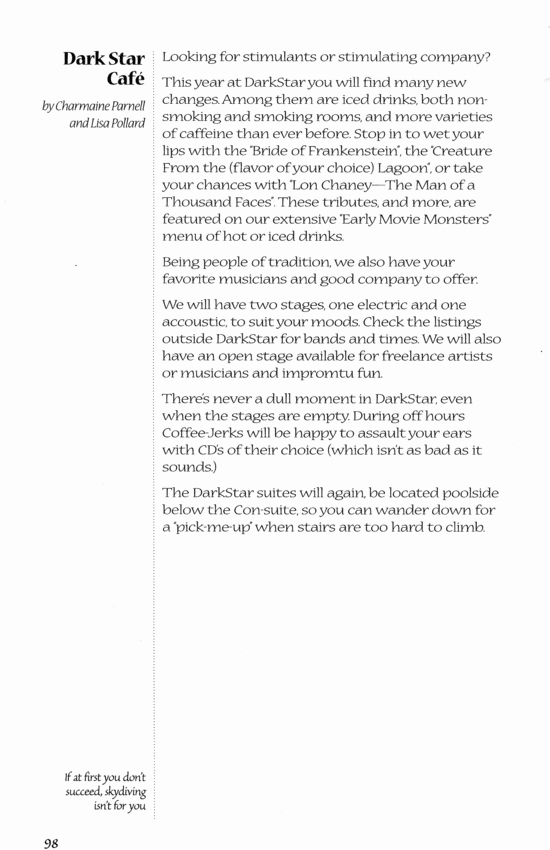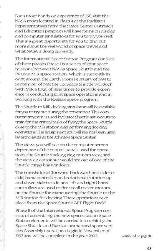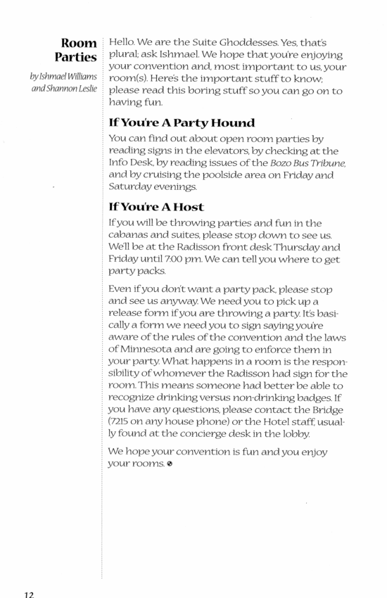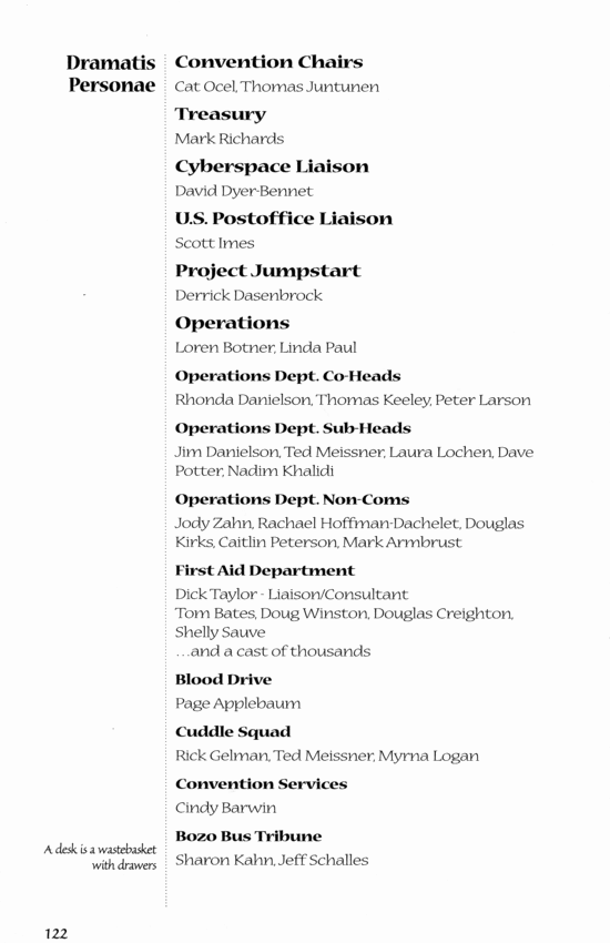 We'd really appreciate it if you'd examine, fill out, and return the volunteer form included in the forms packet mailed out in June 1996. Or volunteer at the con. Or, if you see something that needs doing, just do it. It's possible to get involved before the con, too, see the section on public meetings.