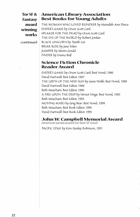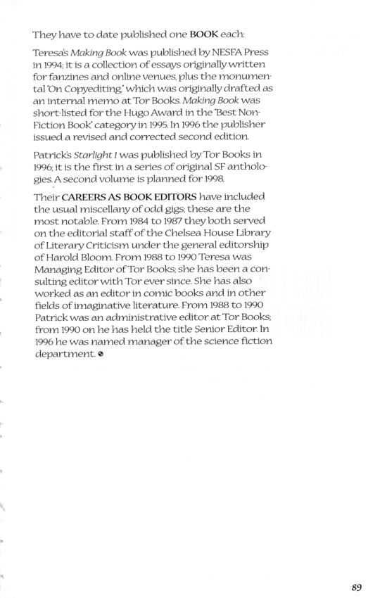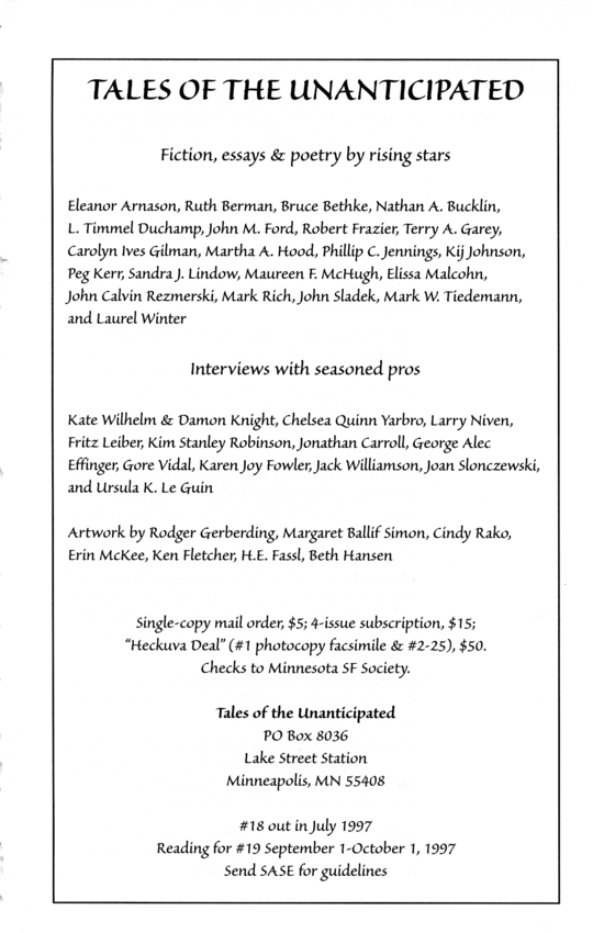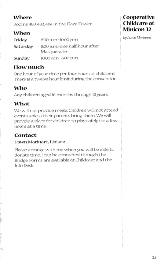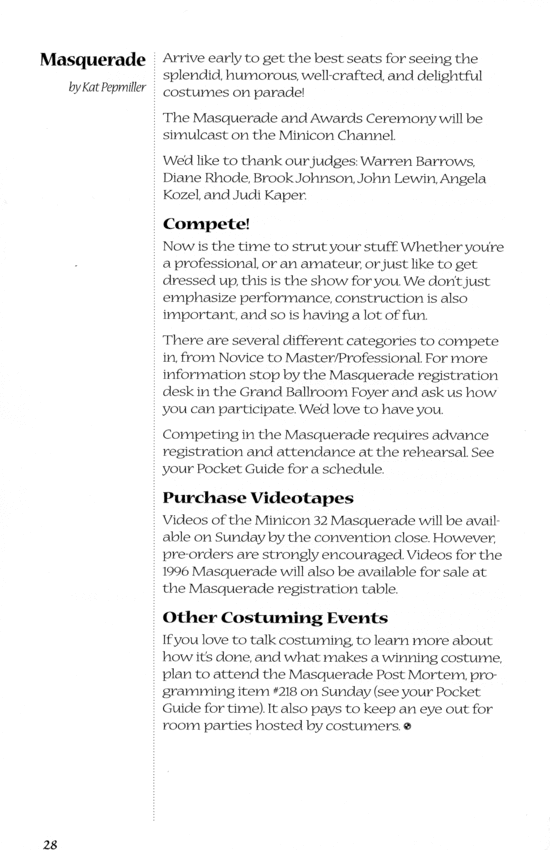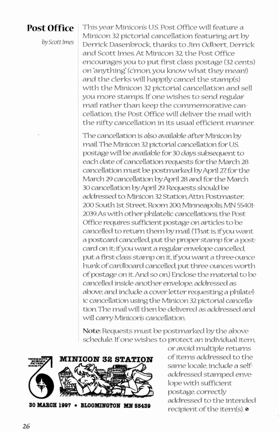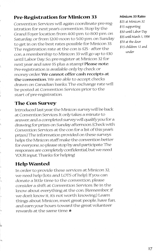 In addition to all the other reasons to pre-register, this year only one mailing is going to the entire mailing list (it went out in June). All subsequent mailings will go only to registered members of Minicon 32. (14-Feb-97: As it turns out, we changed our minds and sent a "winter progress report" to everybody.)