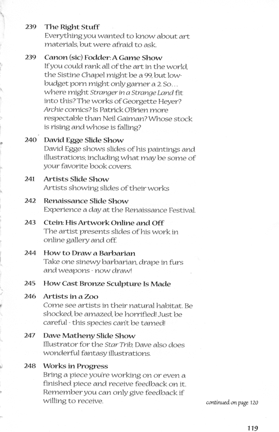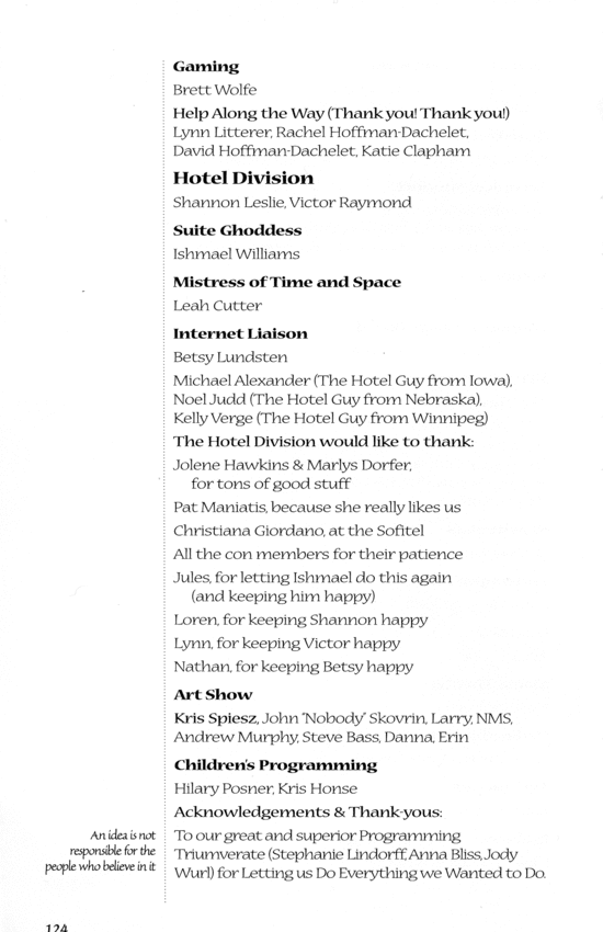 A few departments have some information about what they're doing now, before the con, online. Some of this won't make any sense to people not already involved with that department; well, if it looks interesting, you can always write and ask.