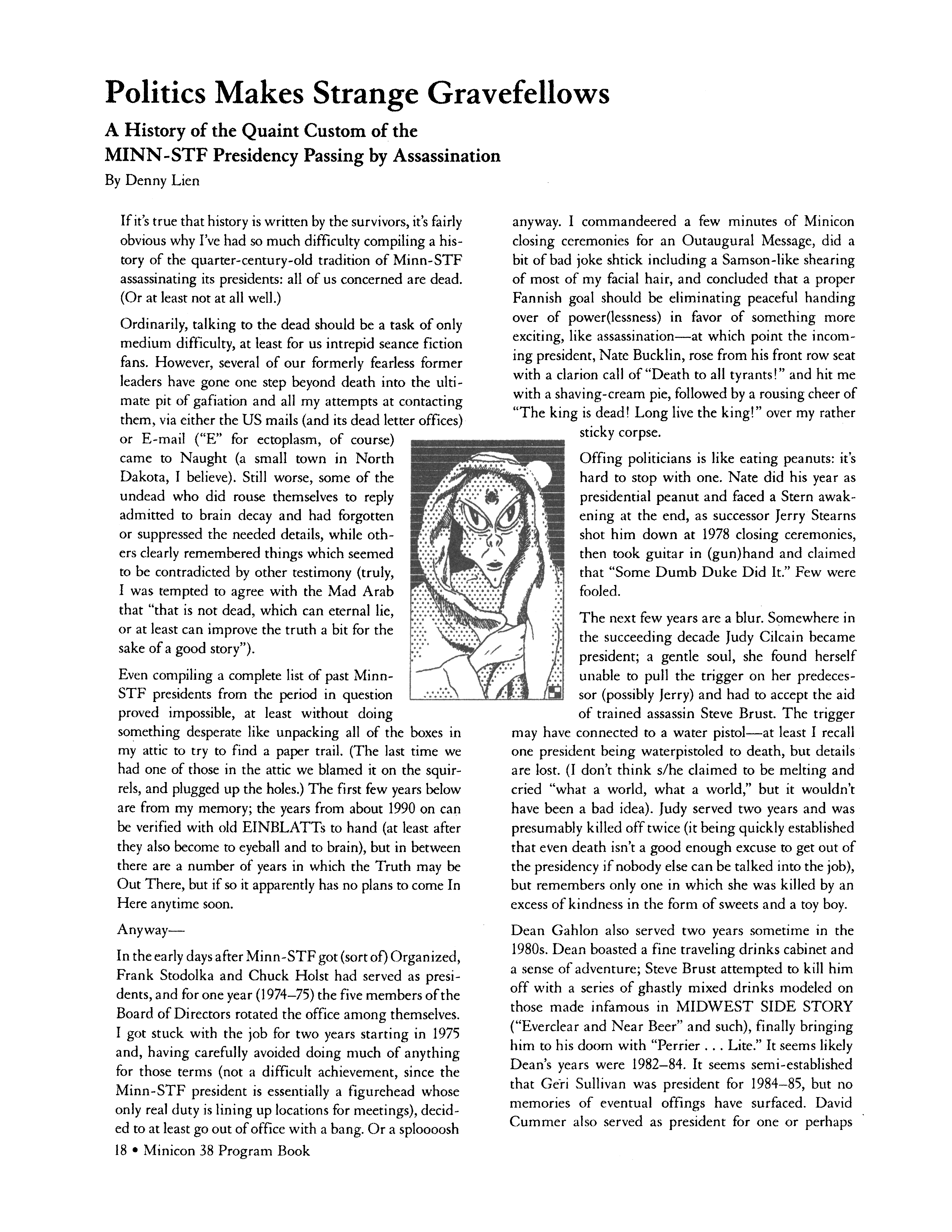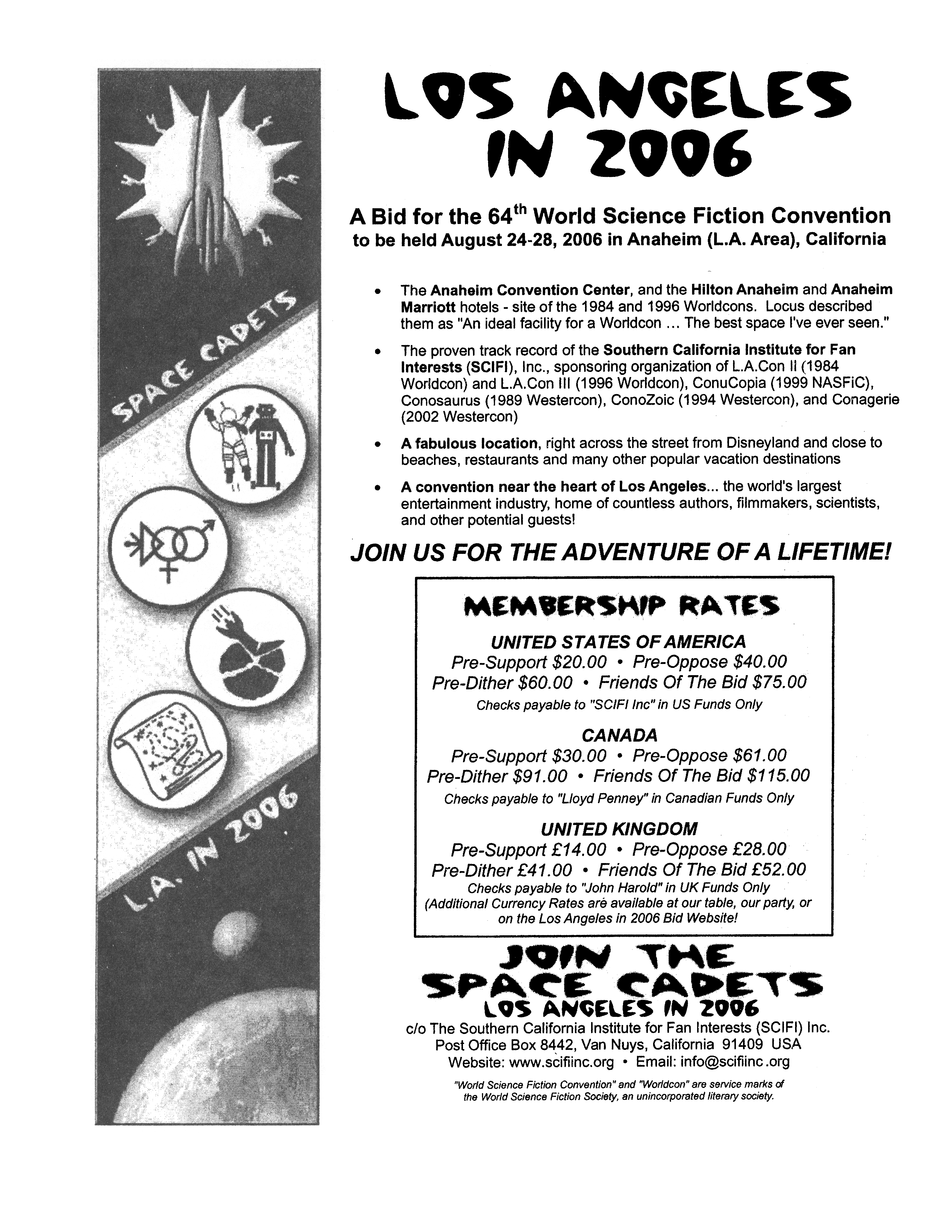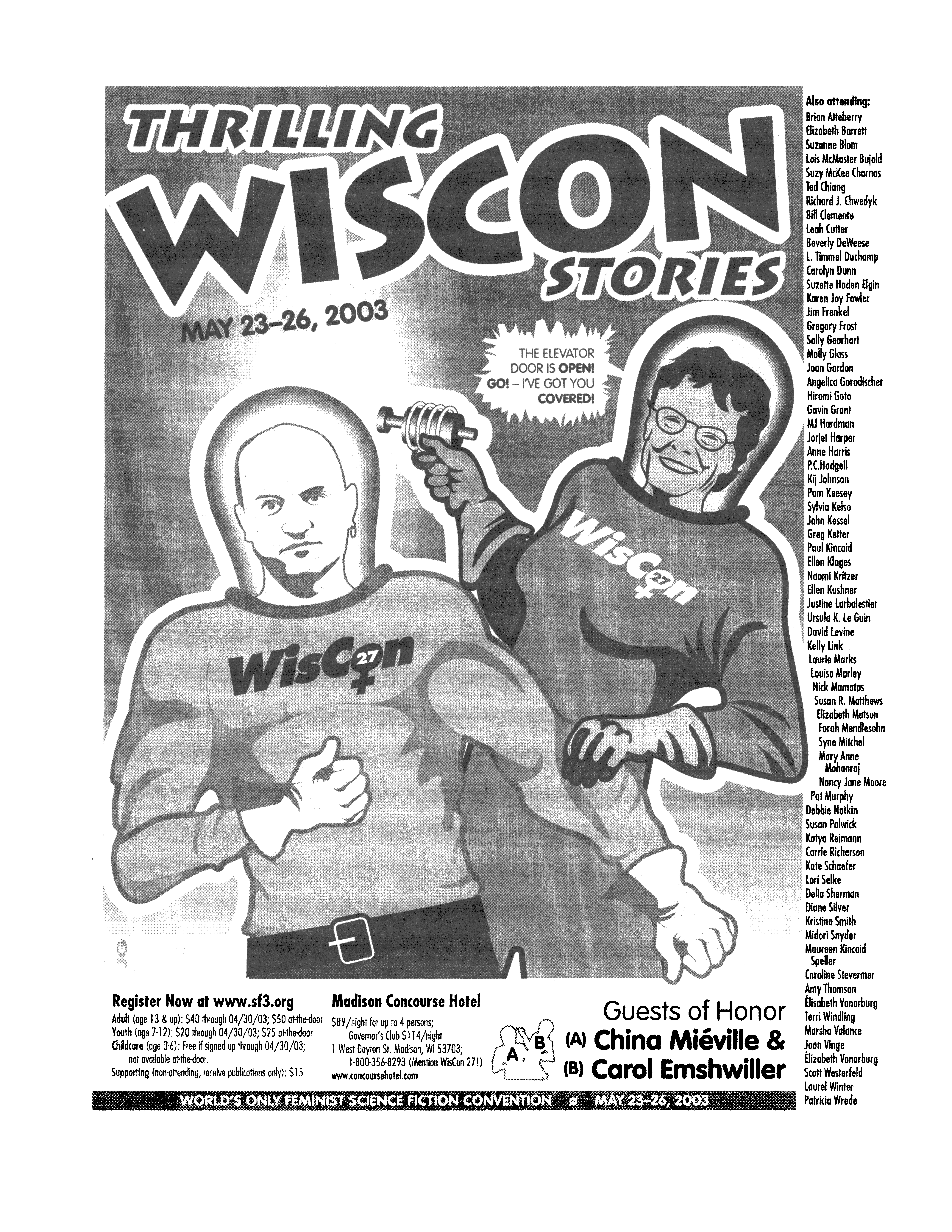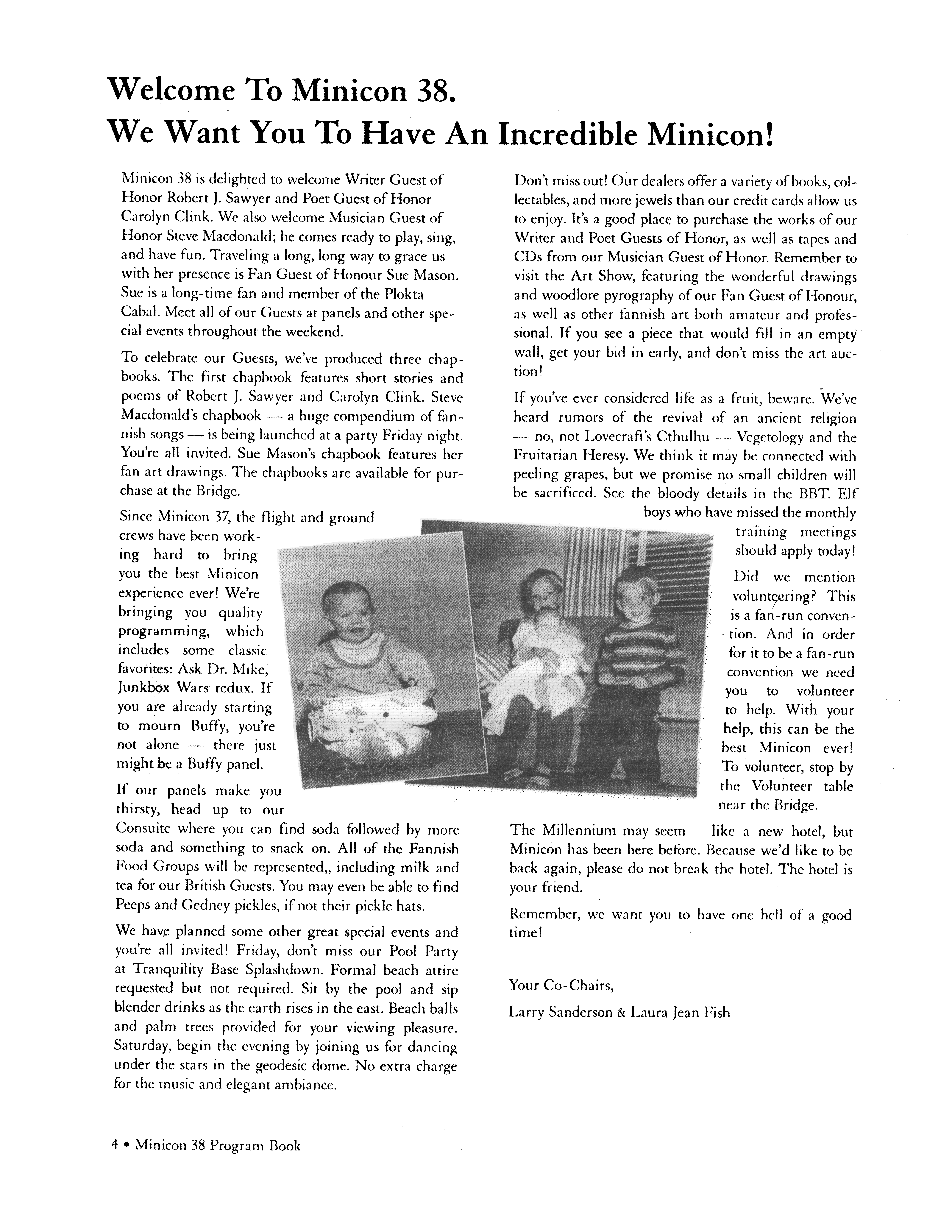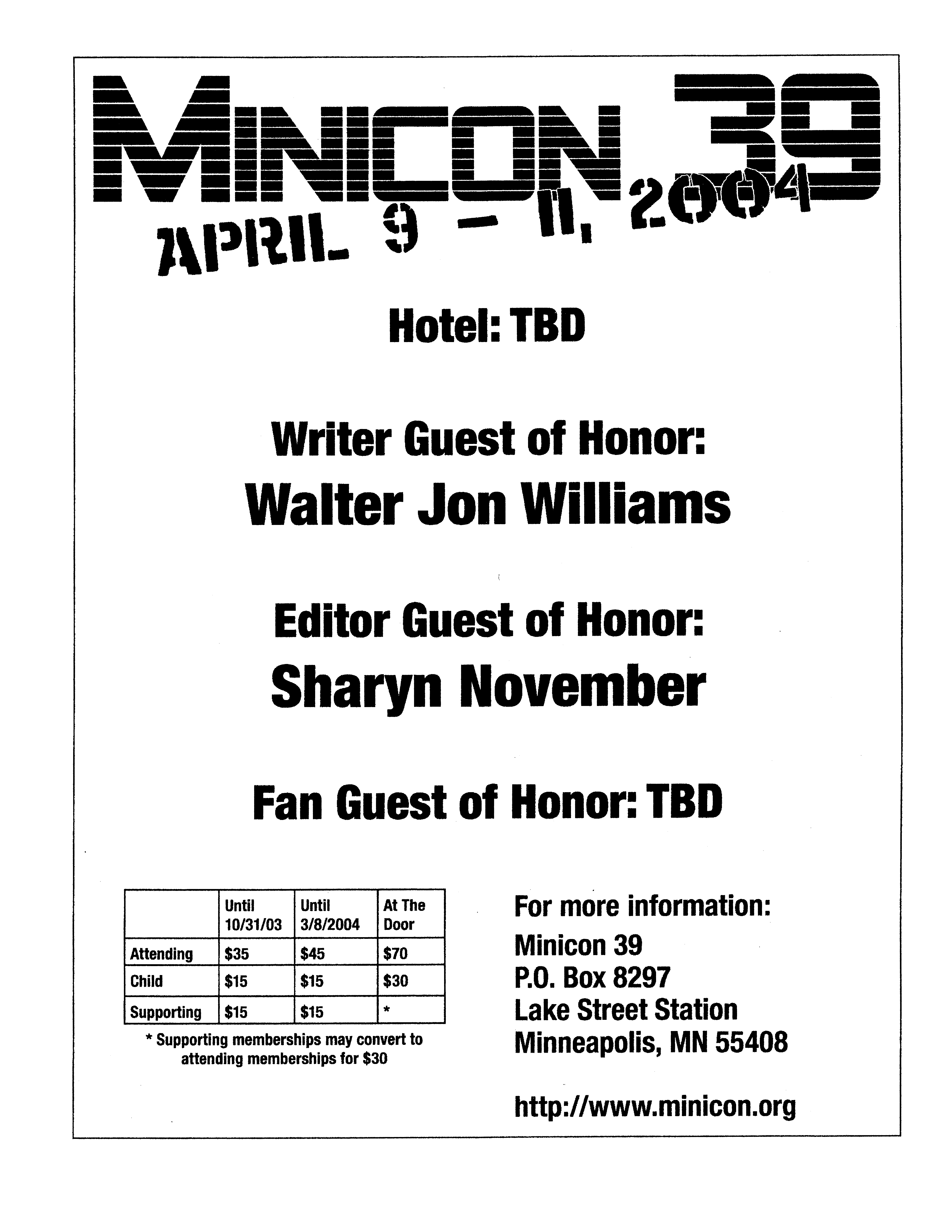 Thanks to everyone who showed up to the Minneapolis in '73 parties at CONvergence, Diversicon, ConJose, Loscon and MarsCon. We had fun and hope that you did as well. Special thanks to everyone who helped out, with an extra special thanks to CONvergence party hosts Sharon Kahn and Richard Tatge, Diversicon party host Larry Sanderson, ConJose party hosts: Doug Friauf, David Schroth, Laura Jean Fish and Larry Sanderson, Loscon party hosts Geri Sullivan and Don Fitch and MarsCon party host Peter Hentges.
