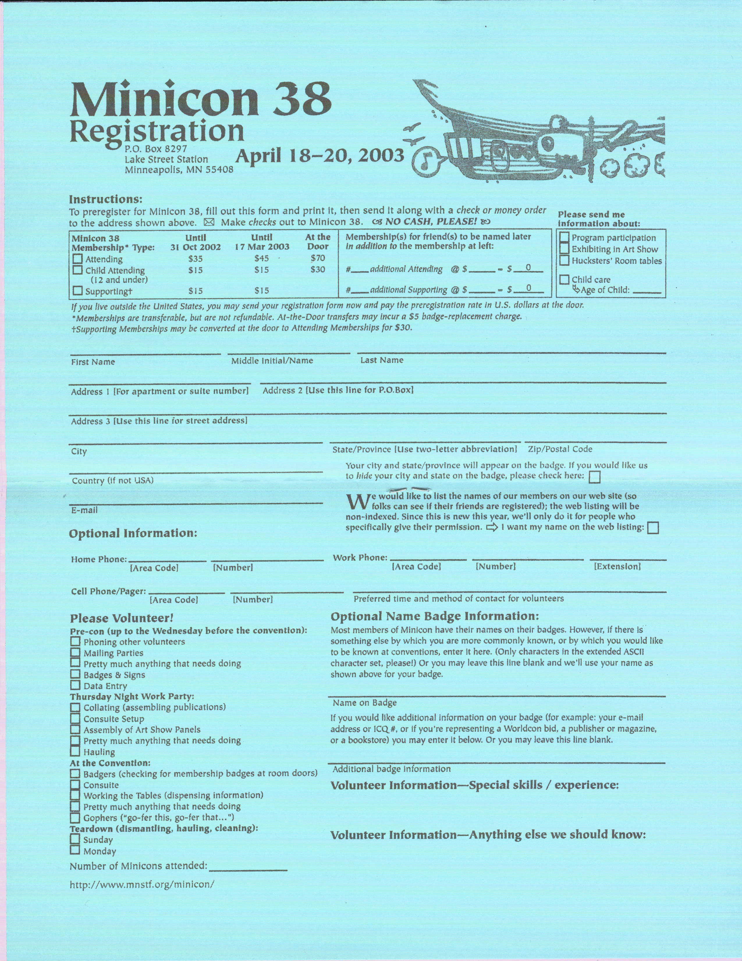 This year we're offering our members the opportunity to be included on our Web page listing of those planning to attend. Along with your name, we can include a link to your home page. Be sure to let us know if you want to be included, so your friends will know you'll be at Minicon 38!